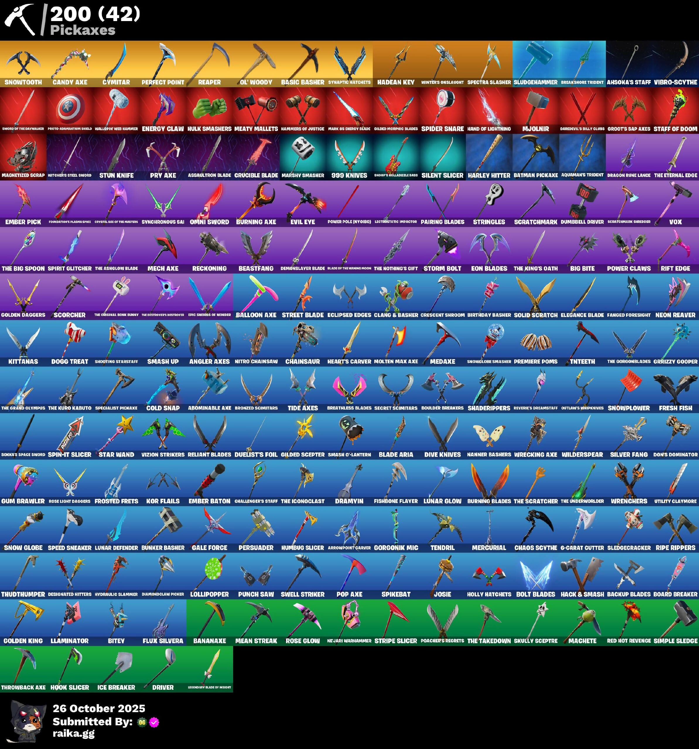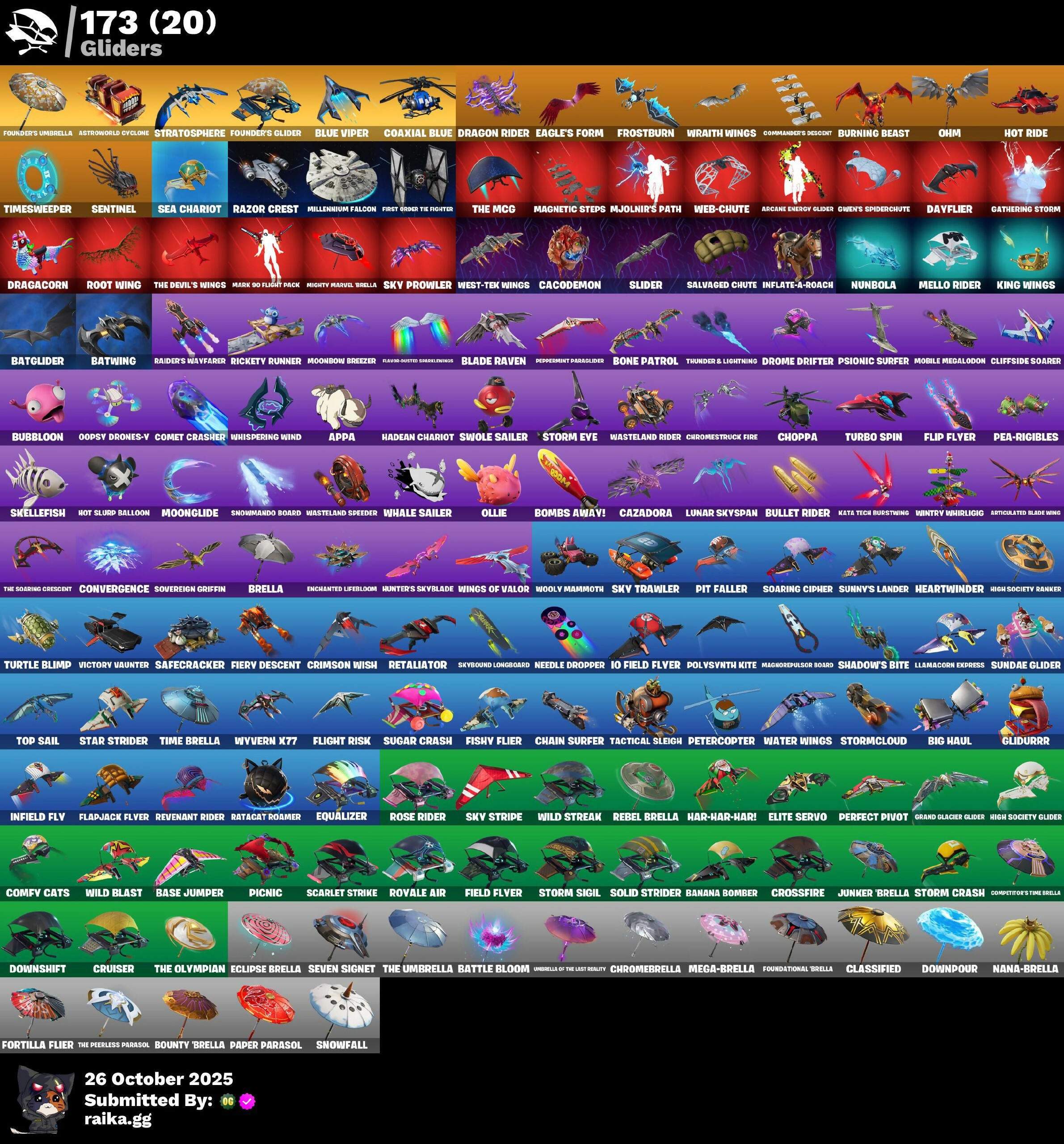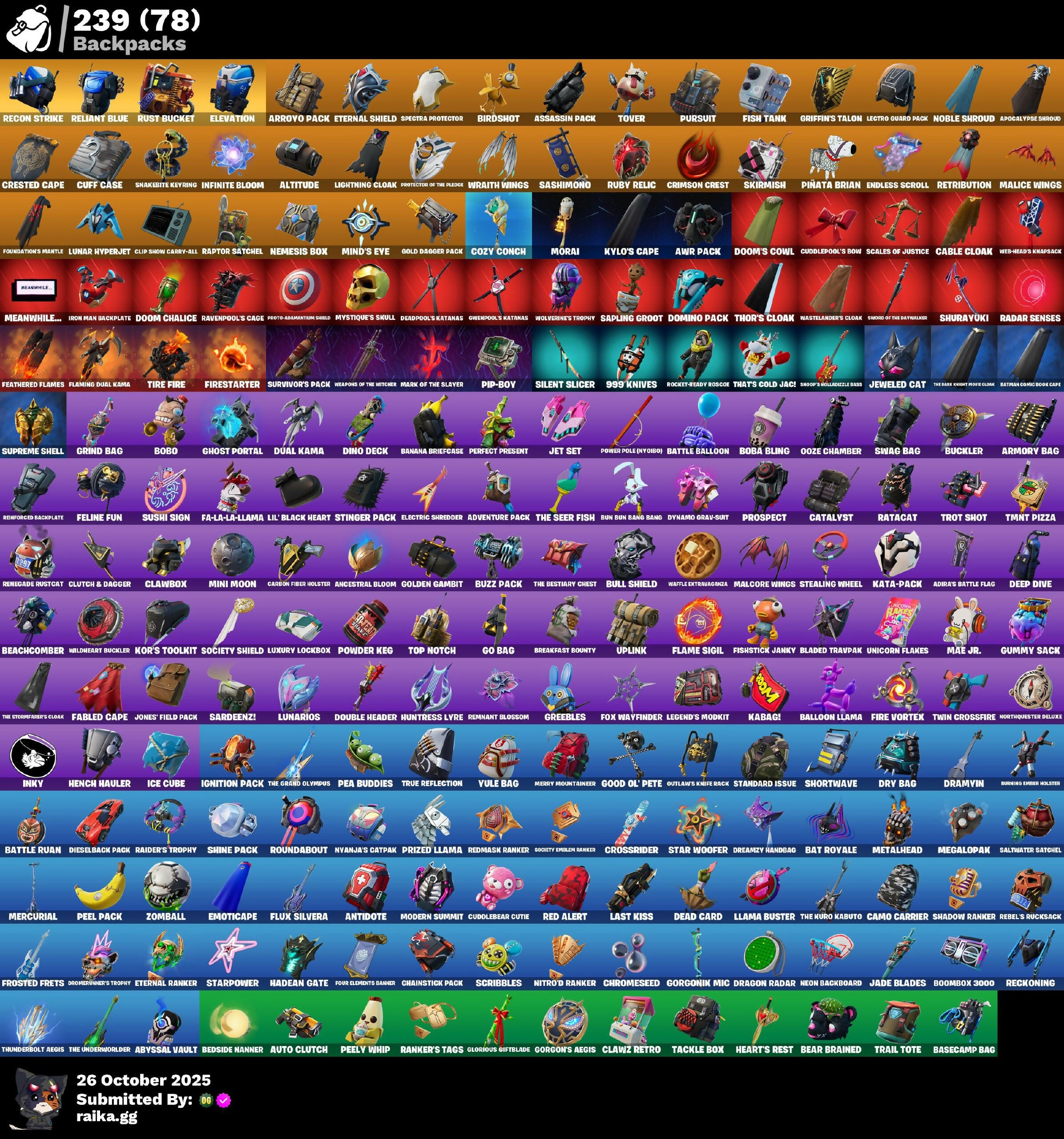2.0's Revenge, 999 Knives, Abominable Axe, Abyssal Vault, Acolyte's Curse, Adira, Adira's Armor, Adira’s Battle Flag, Adventure Pack, Afterparty, Agent Jones, Agent Peely, Ahsoka Tano, Ahsoka's Staff, Air Shredder, Altitude, Amber, Ancestral Bloom, Angler Axes, Antidote, Antonia, Aphrodite, Apocalypse Shroud, Appa, Aquaman, Aquaman's Trident, Arcane Energy Glider, Arcane Steel, Arctic Adeline, Arctic Camo, Arctica, Armory Bag, Arrowpoint Carver, Arroyo Pack, Artemis, Articulated Blade Wing, Assassin Pack, Assaultron Blade, Astro Jack, Astroworld Cyclone, Aura, Auto Clutch, Awr Pack, Axo, B.R.U.T.E. Gunner, Backup Blades, Balance Board, Balloon Axe, Balloon Llama, Banana Bomber, Banana Briefcase, Bananaxe, Bandolier, Base Jumper, Basecamp Bag, Basic Basher, Bat Royale, Bat Signal, Batglider, Batman Comic Book Cape, Batman Comic Book Outfit, Batman Pickaxe, Battle Balloon, Battle Bloom, Battle Hound, Battle Ruan, Battlehawk, Batwing, Beachcomber, Bear Brained, Beastfang, Beatz Bunny, Bedside Nanner, Beep Beep, Beerus, Behold!, Big Bite, Big Haul, Billy Bounce, Birdie, Birdshot, Birthday Basher, Bitev, Black Ooze, Blade, Blade Aria, Blade Raven, Blade of the Waning Moon, Bladed Travpak, Blasted, Blaze, Blowin' Up, Blue Viper, Board Breaker, Boba Bling, Boba Snack, Bobo, Bolt, Bolt Blades, Bombs Away!, Bone Patrol, Boogie Down, Boombox 3000, Boomin', Boulder Breakers, Bounty Brella, Brawler, Breakfast Bounty, Breaking Point, Breakshore Trident, Breathless Blades, Brella, Brite Moves, Brite Raider, Bronzed Scimitars, Bruteball, Bryce 3000, Bubloon, Buckle Up, Buckler, Bull Shield, Bullet Rider, Bullseye, Bun Bun Bang Bang, Bunker Basher, Bunker Jonesy, Burial Threat, Burning Axe, Burning Beast, Burning Blades, Burning Ember Holster, Burning Glyph, Bushie Bright, Butter Buddy, Buttoned Up, Buzz Pack, Bytes, Cable, Cable Cloak, Cacodemon, Calamity, Calico, Call Me, Called Shot, Cameo, Camo Carrier, Candy Axe, Candy Cane, Caper, Captain America, Captain Comic Book Outfit, Carbide, Carbon & Gold, Carbon Fiber Holster, Card Drop, Cardistry, Cat Flip, Catalyst, Cazadora, Cerberus, Cerberus Bite, Chain Surfer, Chainsaur, Chainstick Pack, Challenger's Staff, Champion Kyra, Chaos Agent, Chaos Directive, Chaos Scythe, Charlotte, Checks And Scratches, Chicken, Chimichanga! Arachrobatics, Choice Knit, Choppa, Chord Kahele, Chrome Marked, Chrome Punk, Chromebrella, Chromeseed, Chromestruck Fire, Chromium, Clang & Basher, Classified, Clawbox, Clawz Retro, Clean Sweep, Cliffside Soarer, Clip Show Carry-All, Cloud Striker, Cloudburst, Clubs, Cluck Strut, Clutch & Dagger, Coaxial Blue, Cobalt, Cobalt Overdrive, Coin Flip, Cold Snap, Comet Crasher, Comfy Cats, Commander's Descent, Competitor's Time Brella, Conch Call, Constructor, Contour Camo, Convergence, Coral Crush, Corrosive Stripe, Count It!, Cozy Conch, Crabby, Crack It, Crackshot, Crazyboy, Crescent Shroom, Crested Cape, Crimson Crest, Crimson Wish, Crossfire, Crossrider, Crowning Achievement, Crucible Blade, Cruiser, Crypt Crosser, Crystal, Crystal Axe of the Masters, CuddleBear Cutie, Cuddlepool, Cuddlepool’s Bow, Cuff Case, Curling Iron, Cursed, Cyberdyne Salute, Cyclo Curl, Cymitar, DJ Yonder, Daisies, Daredevil, Daredevil's Billy Clubs, Dark Side, Dayflier, Daywalker's Kata, Dead Card, Deadpool, Deadpool’s Katanas, Decaying Dribbler, Deep Dive, Demi, Demonslayer Blade, Denim Destinv, Designated Hitters, Diamond Diva, Diamond Throne, Diamondclaw Picker, Diamonds, Dice Roll, Diecast, Dieselback Pack, Dino Deck, Dirtbike Challenge, Dive Knives, Do The Split, Doctor Doom, Dogg Treat, Dominator, Dominion, Domino, Domino Pack, Don's Dominator, Doom Chalice, Doom Slayer, Doombringer's Trophy, Doom’s Cowl, Double Header, Downpour, Downshift, Doze Dab, Dragacorn, Dragon Radar, Dragon Rider, Dragon Rune Lance, Dramvin, Dramyin, Dreamzy Handbag, Drift, Driver, Drome Drifter, Droop, Dry Bag, Dual Kama, Duelist's Foil, Dumbbell Driver, Durrr Burger, Dusty, Dynamo Grav-Suit, Eagle's Form, Echo, Eclipse Brella, Eclipsed Edges, Electric Shredder, Electrostatic Impactor, Elegance Blade, Elevation, Eleven, Elite Servo, Elysium, Ember Baton, Ember Pick, Emoticape, Enchanted Lifebloom, Endless Scroll, Energy Claw, Eon Blades, Epic Swords of Wonder, Equalizer, Eternal Hunt, Eternal Knight, Eternal Ranker, Eternal Shield, Evasive Maneuvers, Evie, Evil Eye, Evil Plan, Exile's Emblem, Explorer Emilie, Fa-La-La-llama, Fabio Sparklemane, Fabled Cape, Face Palm, Fade, Fanged Foresight, Fatal Finisher, Feathered Flames, Feline Fun, Feral Finisher, Ferocious, Festive Paper, Field Flver, Fiery Descent, Final Eclipse, Final Harbinger, Fire Show, Fire Vortex, Firestarter, First Order Tie Fighter, Fish Tank, Fish Thicc, Fishbone Flayer, Fishstick, Fishstick Janky, Fishy Flier, Fixer, Flaky Feast, Flame Sigil, Flaming Dual Kama, Flapjack Flver, Flare-Hosted Sparklelings, Flash Of Lightning, Flashback Breakdown, Flight Risk, Flip Flyer, Flippin' Away, Flippin' Sexy, Flux Silvera, Focused, Foil Flex, Forever Tuesday, Fortilla Flier, Foundation's Mantle, Foundation's Plasma Spike, Foundational Brella, Founder's Glider, Founder's Umbrella, Four Elements Banner, Fox Wayfinder, Fresh Fish, Freshly Forged, Frostburn, Frosted Frets, Fryangles, Full Tilt, G-Carat Cutter, Gale Force, Gathering Storm, Gear Specialist Maya, Gentleman's Dab, Geralt of Rivia, Get Funky, Get Loose, Ghost Portal, Ghoul Trooper, Giddy-Up, Gila Classic, Gilded Heart, Gilded Morphic Blades, Gilded Scepter, Glidurrr, Glorious Giftblade, Go Bag, Godsworth's Cleanup, Gold Brutus, Gold Dagger Pack, Gold Meowscles, Gold Midas, Golden Daggers, Golden Gambit, Golden King, Golden Scales, Golf Clap, Good Ol’ Pete, Gorgonik Mic, Gorgon’s Aegis, Grand Glacier Glider, Grav-Fusion, Greebles, Greed, Griffin's Talon, Grind Bag, Gringle Gift, Griz, Grizzly Gooper, Groot, Groot's Sap Axes, Ground Pound, Guaco, Gum Brawler, Gumbo, Gummy Sack, Gunnar, Gunnar's Special, Gwen's Spiderchute, Gwenpool’s Katanas, Hack & Smash