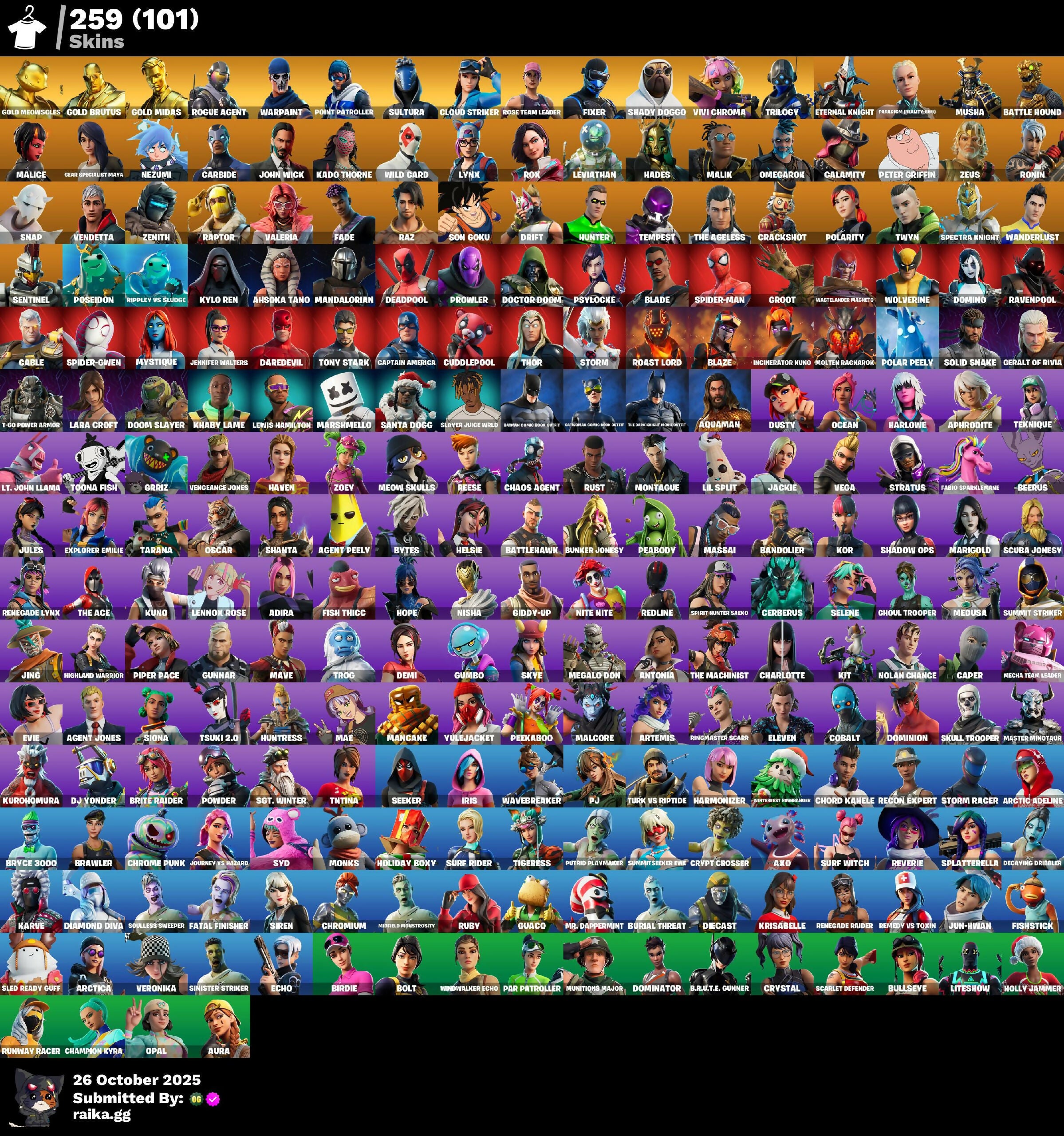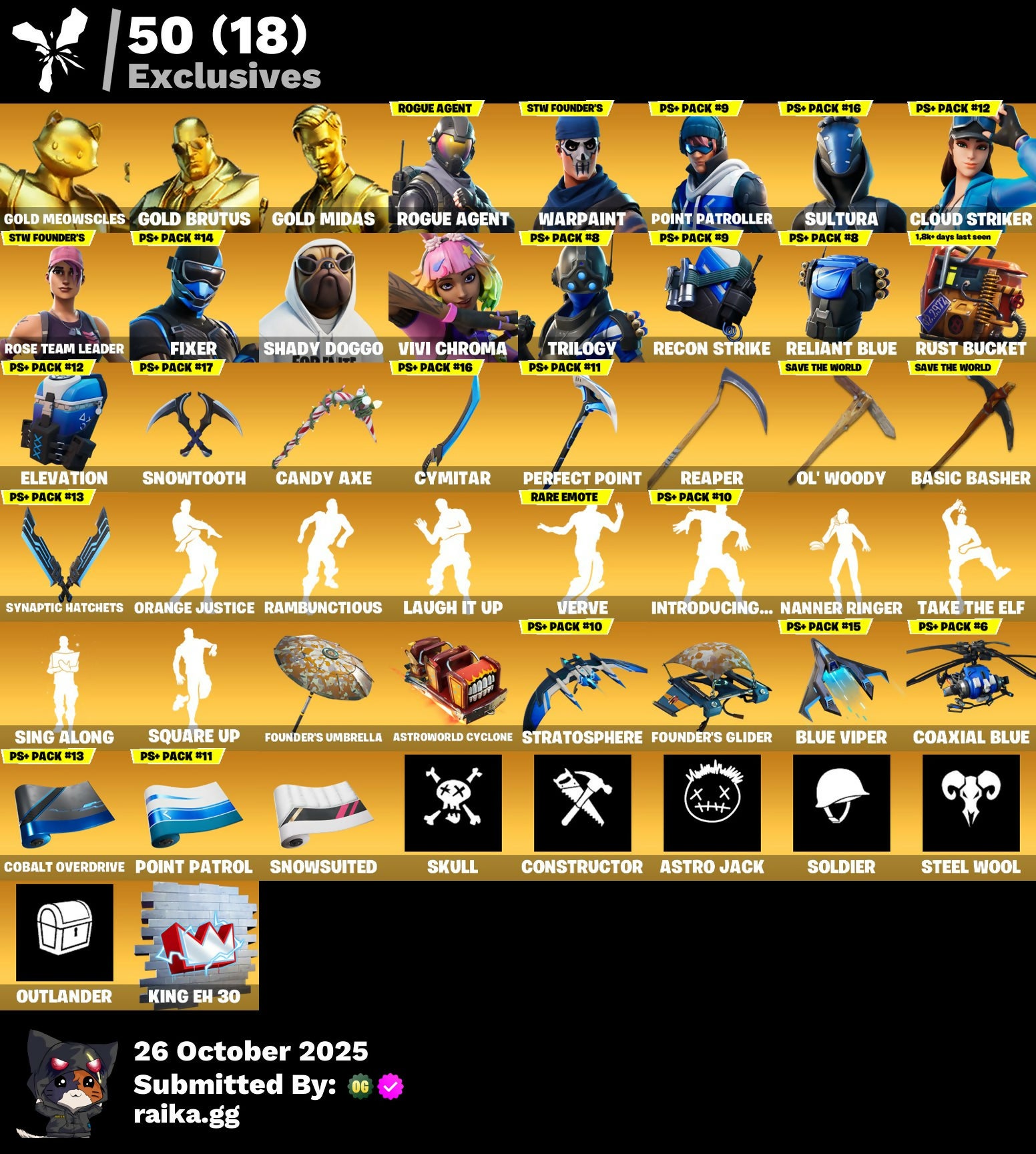 [PC/PSN/XBOX/NITTENDO] 259 skins | OG STW | Renegade Raider | Gold Meowscles | Gold Brutus | Gold Midas | Rogue Agent | Point Patroller | Sultura | Cloud Striker | Fixer | 350 VB