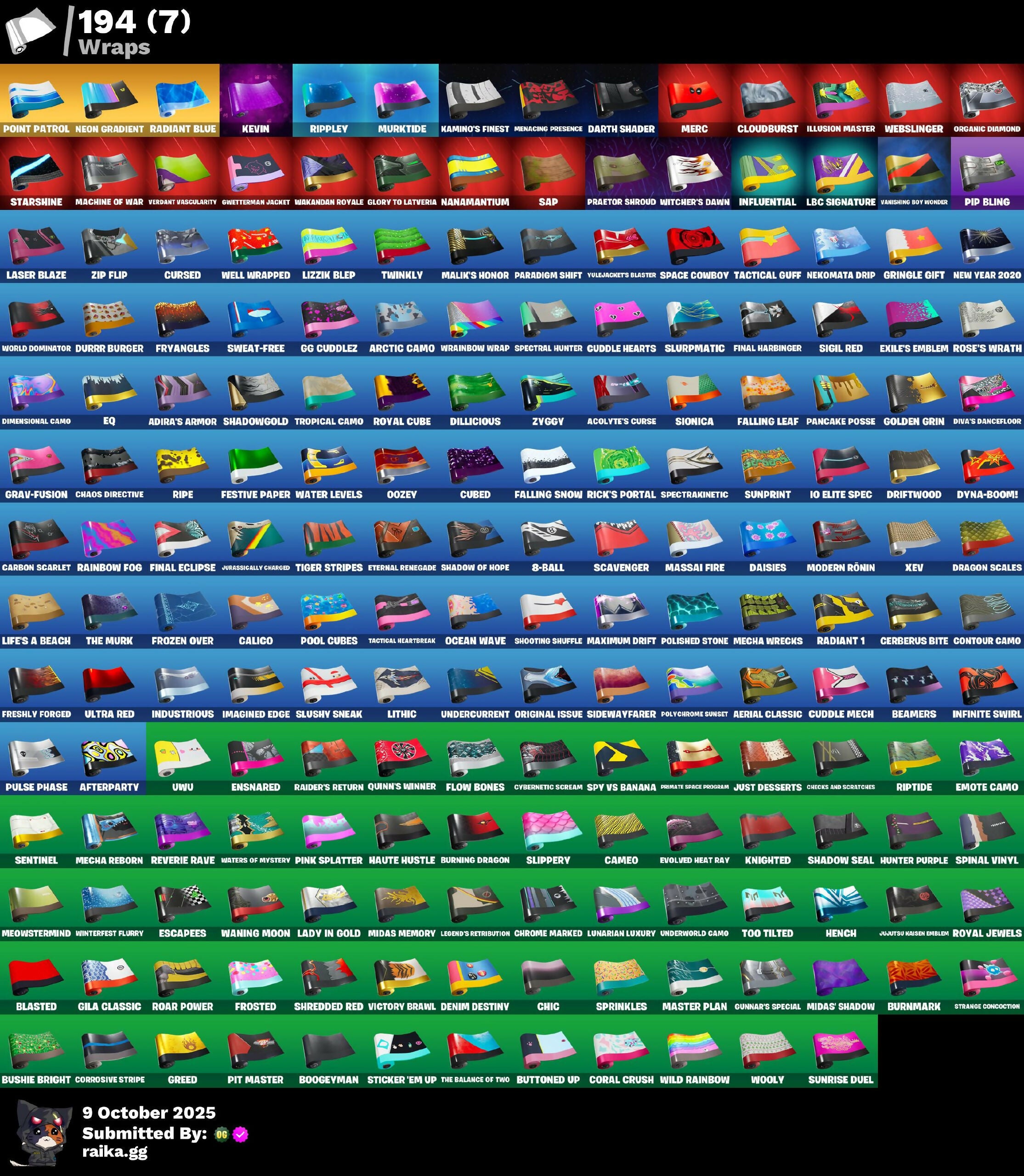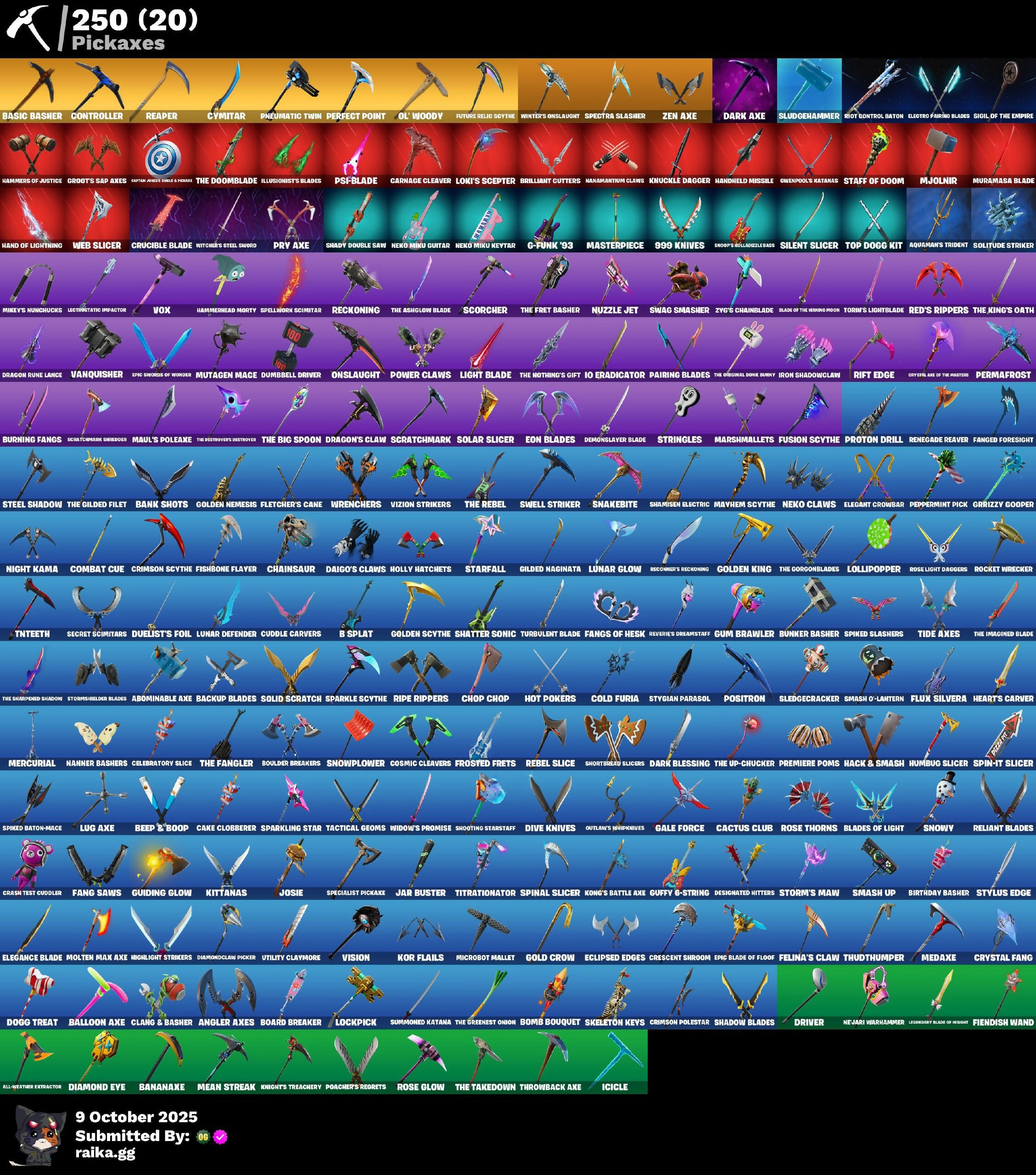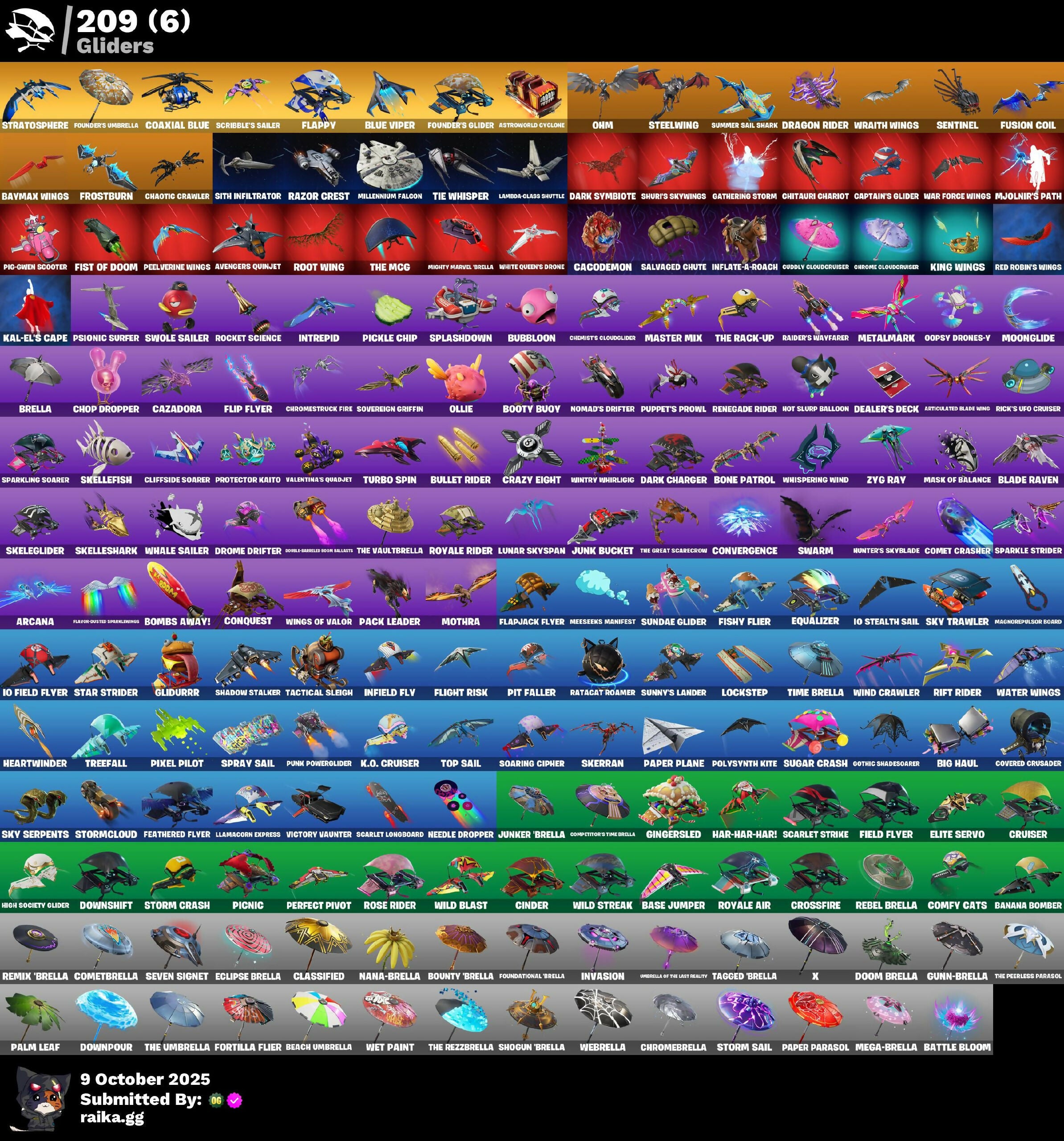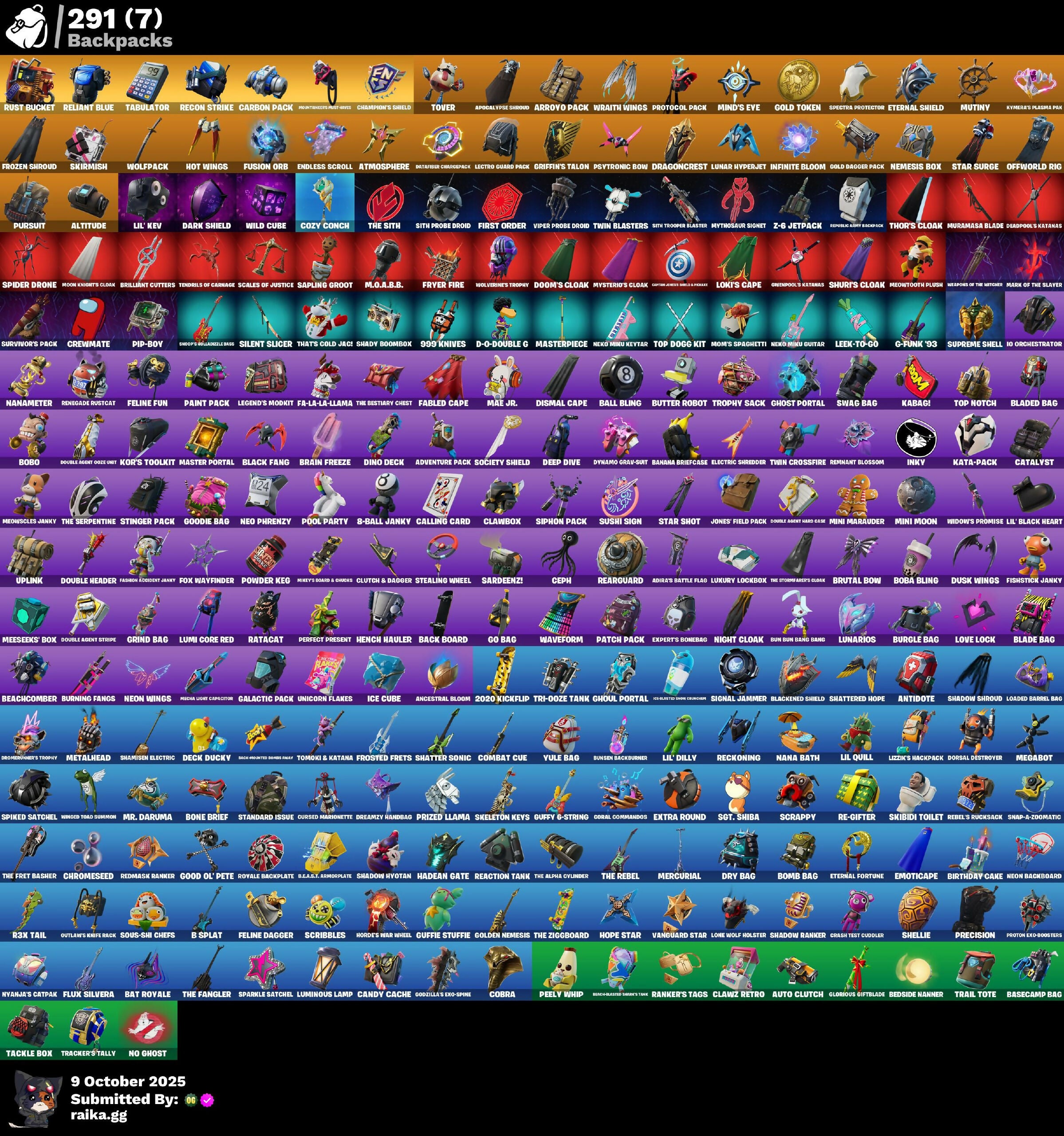 (Snikt!), 1-Ball, 10 Elite Spec, 2020 Kickflip, 8-Ball, 8-Ball Janky, 8-Ball vs Scratch, 999 Knives, Abominable Axe, Acolyte's Curse, Adira, Adira's Armor, Adira's Battle Flag, Adventure Pack, Aerial Assault Bomber, Aerial Classic, Afterparty, Agent Jones, Agent Peely, Air Shredder, All-Weather Extractor, Altitude, Ancestral Bloom, Andy Fangerson, Angler Axes, Antidote, Antonia, Apocalypse Shroud, Aquaman, Aquaman's Trident, Arcana, Arctic Adeline, Arctic Camo, Arrowo Pack, Articulated Blade Wing, Ashoka's Clone Trooper, Assault Trooper, Astro Antidote, Astro Jack, Astroworld Cyclone, Atmosphere, Auto Clutch, Avengers Quinjet, Axo, B Splat, B-Splat, B.E.A.S.T. Armorplate, B.E.A.S.T. Glove, Back Board, Back-Activated Bombs Away, Backup Blades, Balance Board, Ball Bling, Balloon Axe, Banana Bomber, Banana Briefcase, Bananaxe, Bank Shots, Baron's Hoard, Base Jumper, Basecamp Bag, Basic Basher, Bat Royale, Battle Blessing, Battle Bloom, Battlehawk, Baymax Wings, Beach Umbrella, Beachcomber, Beamers, Bear Hug, Beatzbunny, Bedside Nanner, Beep & Boop, Beep Beep, Behold!, Big Dill, Big Haul, Billy Bounce, Binch-Hashed Savers' Tank, Birthday Basher, Birthday Cake, Black Fang, Blackened Shield, Blackheart, Blade Bag, Blade Raven, Blade of the Weeping Moon, Bladed Bag, Blades of Light, Blasted, Blinding Lights, Blizzard Bomber, Blowin' Up, Blowing Bubbles, Blue Viper, Board Breaker, Boba Bling, Boba Fett, Bobo, Boing!, Bomb Bag, Bomb Bouquet, Bombs Away!, Bone Brief, Bone Patrol, Boogeyman, Boogie Down, Boomin', Booty Buoy, Boulder Breakers, Bouncer, Bounty 'Brella, Brain Freeze, Breakdown, Breaking Point, Breakneck, Breakpoint, Brella, Brilliant Cutters, Bring It Around, Brush Your Shoulders, Brutal Bow, Brutus, Bubbloon, Bullet Rider, Bullseye, Bun Bun Bang Bang, Bunker Basher, Bunker Jonesy, Bunsen Backburner, Burgle Bag, Burning Dragon, Burning Fangs, Burnmark, Bushie Bright, Butter Robot, Buttoned Up, Bye Bye Bye, Bytes, Cacodemon, Cactus Club, Cake Clobberer, Calamity, Calculated, Calico, Call Me, Calling Card, Cameo, Cameo vs Chic, Candy Cache, Cap Kick, Captain America's Shield & Pan, Captain Ilamerica, Captain Jones, Captain Jones's Smile & Paclove, Captain's Glider, Carbide, Carbon Commando, Carbon Pack, Carbon Scarlet, Cardistry, Carnage, Carnage Cleaver, Cassidy Quinn, Catalyst, Catflip, Cauldron Chill, Cazadora, Celebratory Slice, Ceph, Cerberus Bite, Chainsaur, Champion's Shield, Chaos Directive, Chaos Director, Chaos Double Agent, Chaos Origins, Chaotic Crawler, Charlotte, Checks and Scratches, Chemist's Cloudglider, Chic, Chimichanga!, Chitauri Chariot, Choice Knit, Chop Chop, Chop Dropper, Chrome Cloudcruiser, Chrome Marked, Chrome Punk, Chromebrella, Chromeseed, Chromestruck Fire, Cinder, City Girl Axe of the Masters, Clang & Basher, Clark Kent, Classified, Clawbox, Clawz Retro, Clean Sweep, Cliffside Soarer, Clone Trooper, Cloudburst, Cluck Strut, Clutch & Dagger, Coaxial Blue, Cobra, Coin Flip, Cold Furia, Combat Cue, Comet Crasher, Cometbrella, Comfy Cats, Competitor's Time Brella, Conga, Conquest, Constructor, Contour Camo, Contract Giller, Controller, Convergence, Coral Commandos, Coral Crush, Corrosive Stripe, Coruscant Guard, Cosmic Cleavers, Count It!, Covered Crusader, Cozy Conch, Crabby, Crack It, Crash Test Codler, Crash Test Cuddler, Crazy Eight, Crescent Shroom, Crewmate, Crimson Polestar, Crimson Scythe, Crossfire, Crowning Achievement, Crucible Blade, Cruiser, Crystal Fang, Cubed, Cuddle Carvers, Cuddle Hearts, Cuddle Mech, Cuddly Cloudcruiser, Cursed, Cursed Marionette, Cybernetic Scream, Cyclo Curl, Cymitar, D'Ark, D-O-Double G, DJ Yonder, Dabstand, Dagger Dance, Daigo, Daigo's Claws, Daisies, Dance Off, Dance Therapy, Dark Axe, Dark Blessing, Dark Charger, Dark Doggo, Dark Jonesy, Dark Red Knight, Dark Shield, Dark Symbiote, Dark Wild Card, Darth Maul, Darth Shader, Darth Vader, Datafuser Chargepack, Deadpool, Deadpool's Katanas, Dealer's Deck, Deck Ducky, Deep Dive, Demonslayer Blade, Denim Destinv, Designated Hitters, Diamond Eye, Diamondclaw Picker, Dice Roll, Dillicious, Dimensional Camo, Dino Deck, Dip, Dire, Disco Fever, Dismal Cape, Distraction Dance, Diva Fever, Diva's Dancefloor, Dive Knives, Dizzie, Do The Split, Doctor Slone, Dogg Treat, Doom, Doom Brella, Doom Slayer, Doom's Cloak, Dorsal Destroyer, Double Agent Hard Case, Double Agent Hush, Double Agent Ooze Unit, Double Agent Stripe, Double Agent Wildcard, Double Header, Double-Barreled Boom Ballista, Downpour, Downshift, Doze Dab, Dragon Rider, Dragon Rune Lance, Dragon Scales, Dragon Stance, Dragon's Claw, Dragoncrest, Dreamzy Handbag, Drift, Driftwood, Driver, Drome Drifter, Dromomer's Trophy, Droop, Drum Major, Dry Bag, Duelist's Card Trick, Duelist's Foil, Dumbbell Driver, Durrr Burger, Durrr Taisho, Dusk, Dusk Knight, Dusk Wings, Dusty, Dyna-Boom!, Dynamo Grav-Suit, Dynamo Tntina, EQ, Eagle, Eclipse Brella, Eclipsed Edges, Electric Shredder, Electro Pairing Blades, Electro Swing, Elegance Blade, Elegant Crowbar, Elite Servo, Ember, Emma Frost, Emote Camo, Emoticape, Endless Scroll, Ensnared, Eon Blades, Epic Blade of Floof, Epic Swords of Wonder, Equalizer, Escapees, Eternal Fortune, Eternal Knight, Eternal Renegade, Eternal Shield, Eternal Voyager, Evasive Maneuvers, Evie, Evolved Heat Ray, Exile's Emblem, Expert's Bombbag, Extra Round, Extraterrestrial, Fa-La-La-Llama, Fabio Sparklemane, Fable, Fabled Cape, Face Palm, Fade, Falling Leaf, Falling Snow, Fancy Feet, Fang Saws, Fanged Foresight, Fangs of Hesk, Fashion Accident Janky, Feathered Flyer, Featherweight, Felina, Felina's Claw, Feline Dagger, Feline Fun, Fennec Shand, Festive Paper, Field Flyer, Fiendish Wand, Final Eclipse, Final Harbinger, Finger Guns, First Order, Fish Thicc, Fishbone Flayer, Fishstick Janky, Fishy Flier, Fist Bump, Fist Pump, Fist of Doom, Fixer, Flair-for-Dusted Sparklewings, Flaky Feast, Flamenco, Flapjack Flyer, Flappy, Flashback Breakdown, Fletcher Kane, Fletcher's Cane, Flight Risk, Flip Flyer, Flippin' Away,