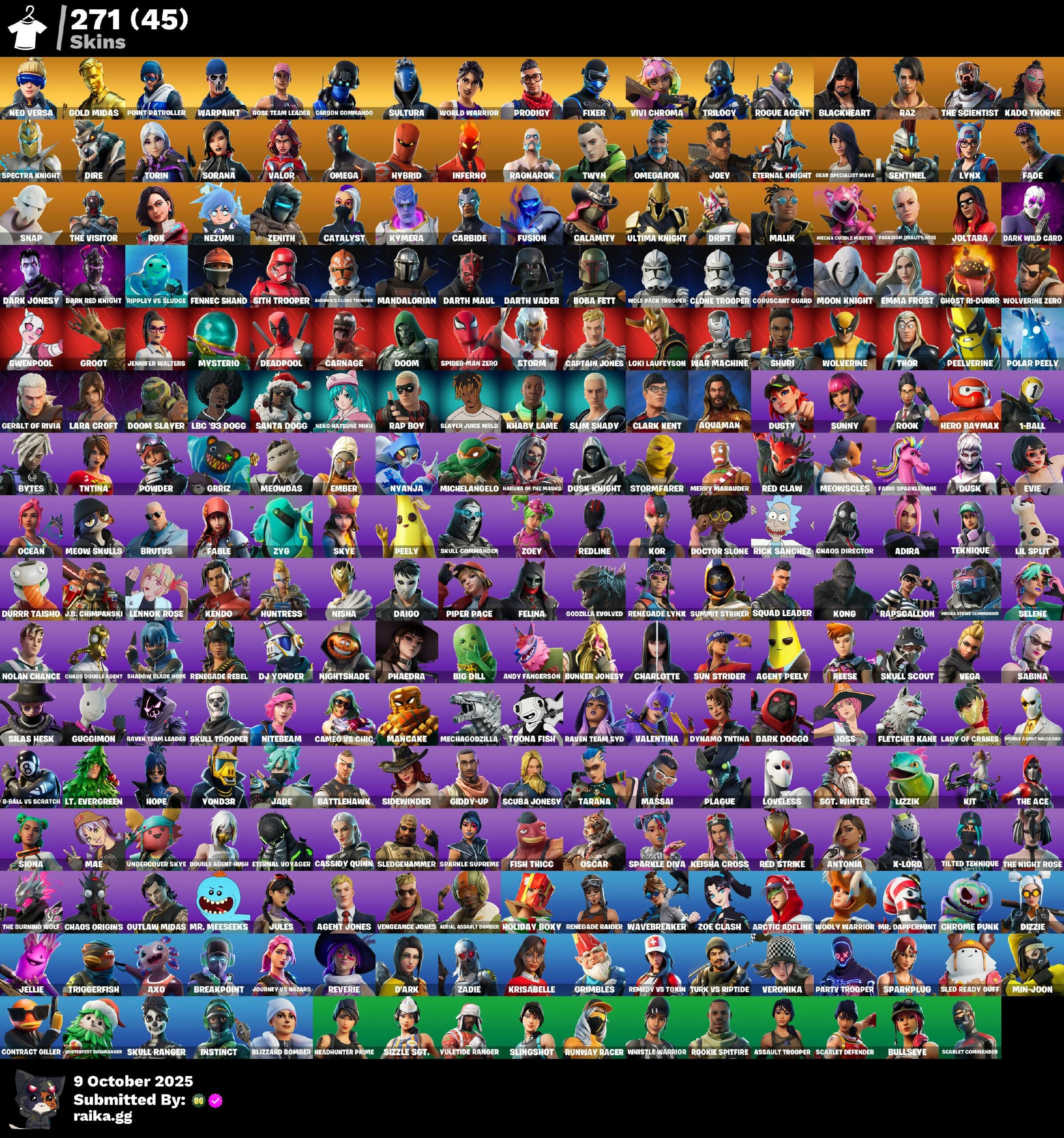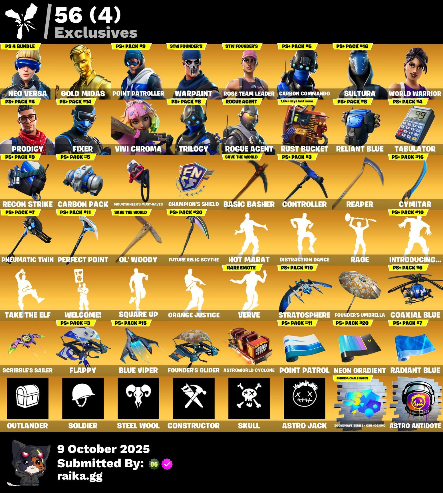 [PC/PSN/XBOX/NITTENDO] 271 skins | OG STW | Renegade Raider | Neo Versa | Gold Midas | Point Patroller | Carbon Commando | Sultura | World Warrior | Prodigy | Fixer | 700 VB