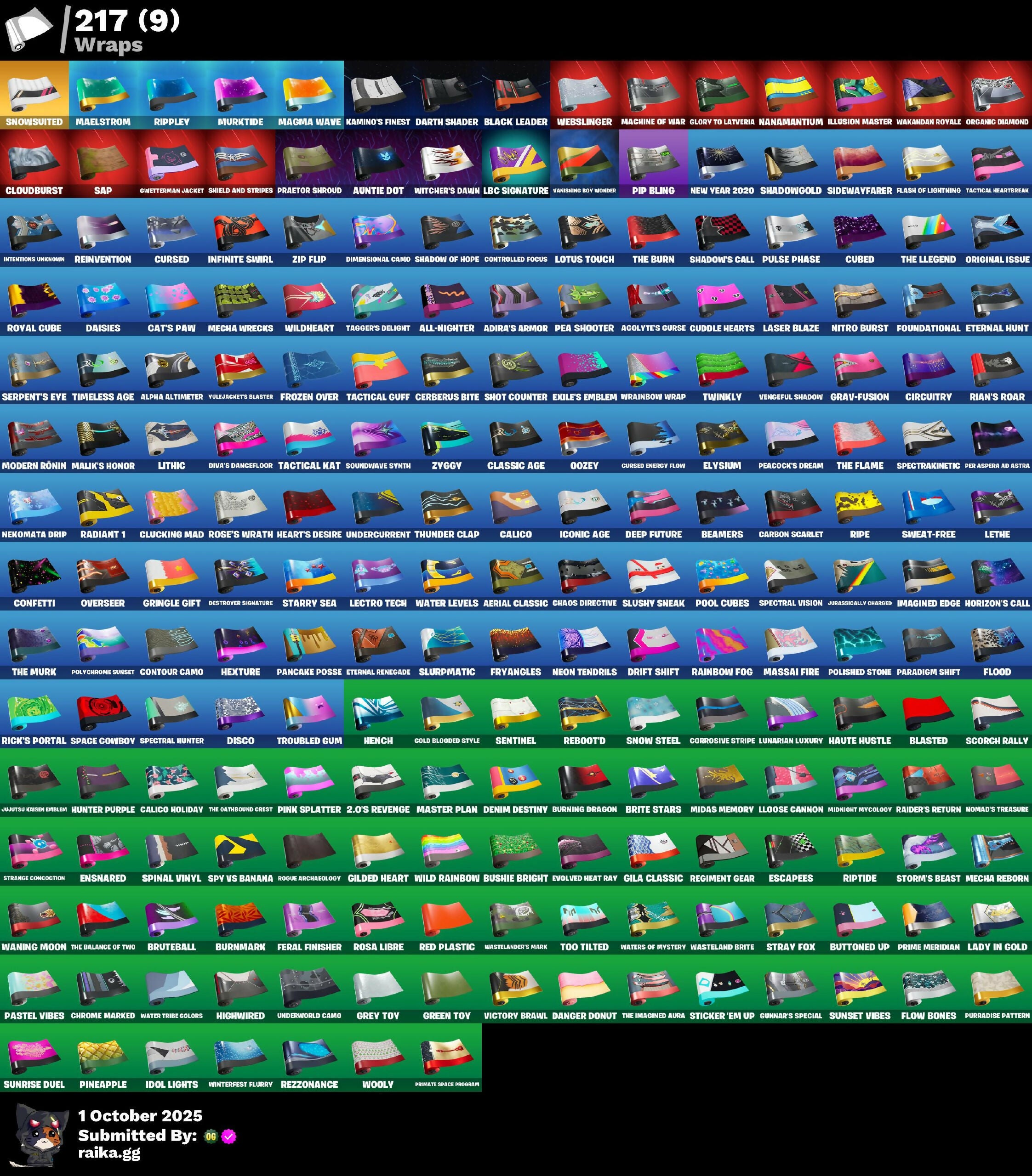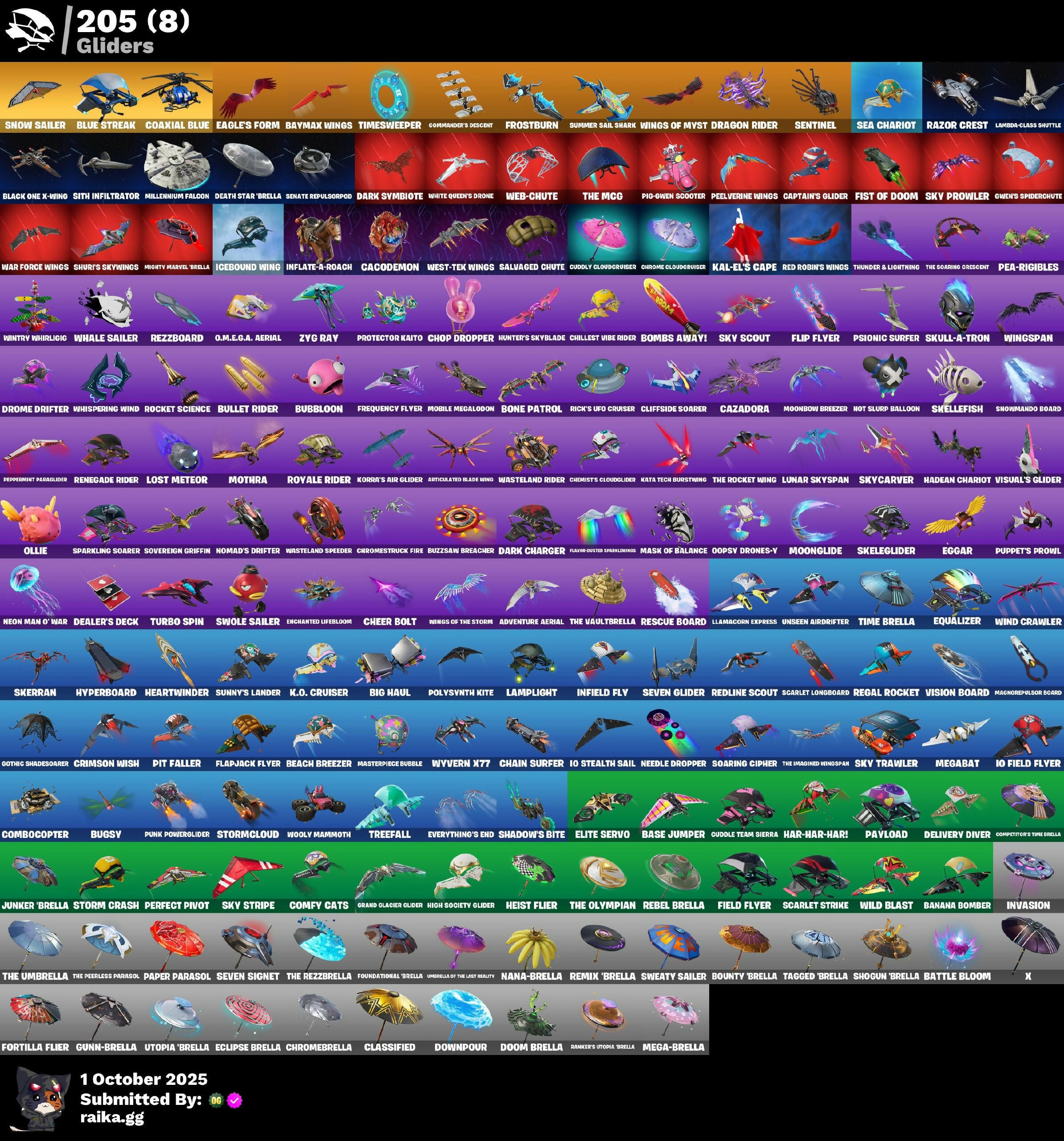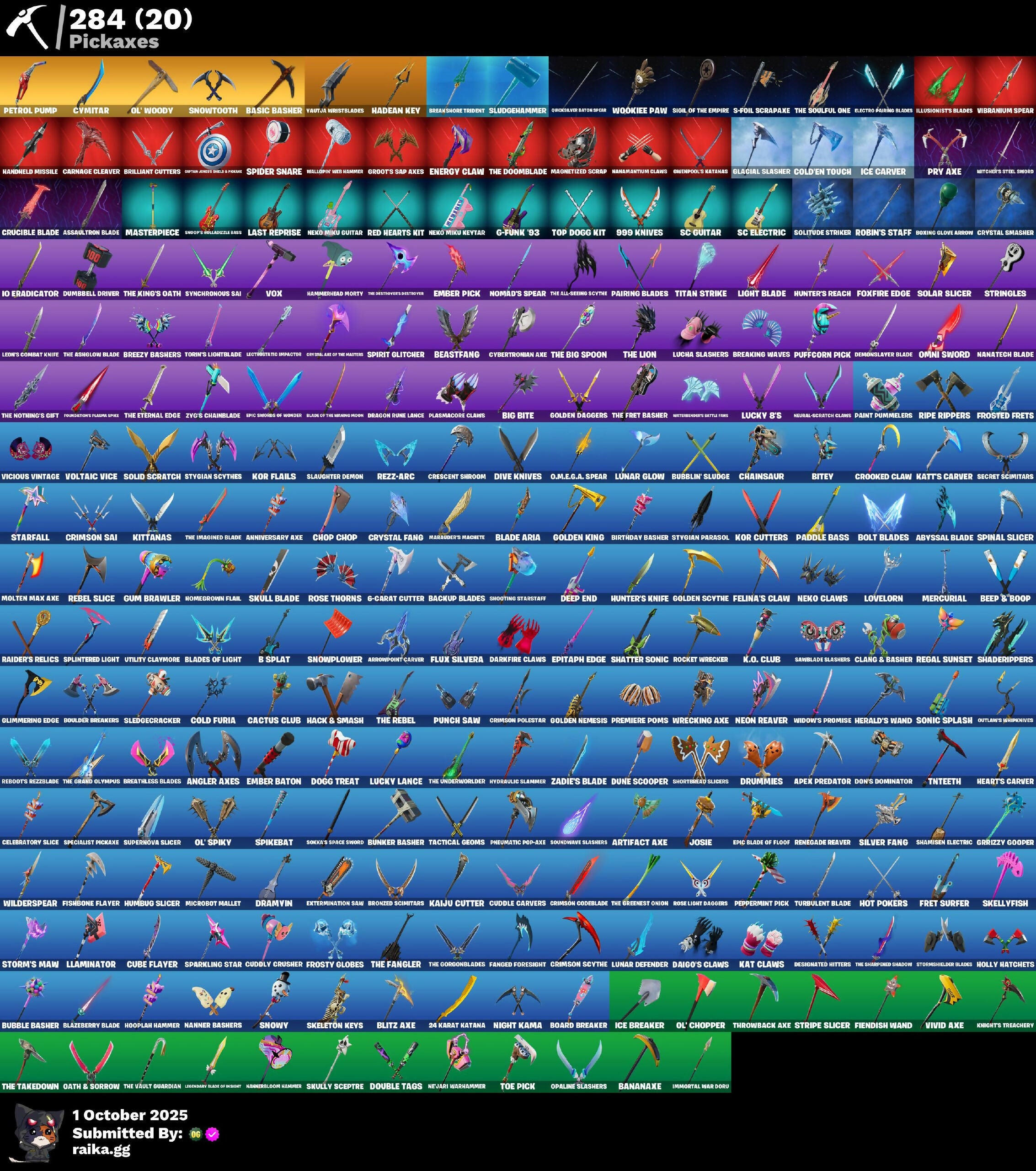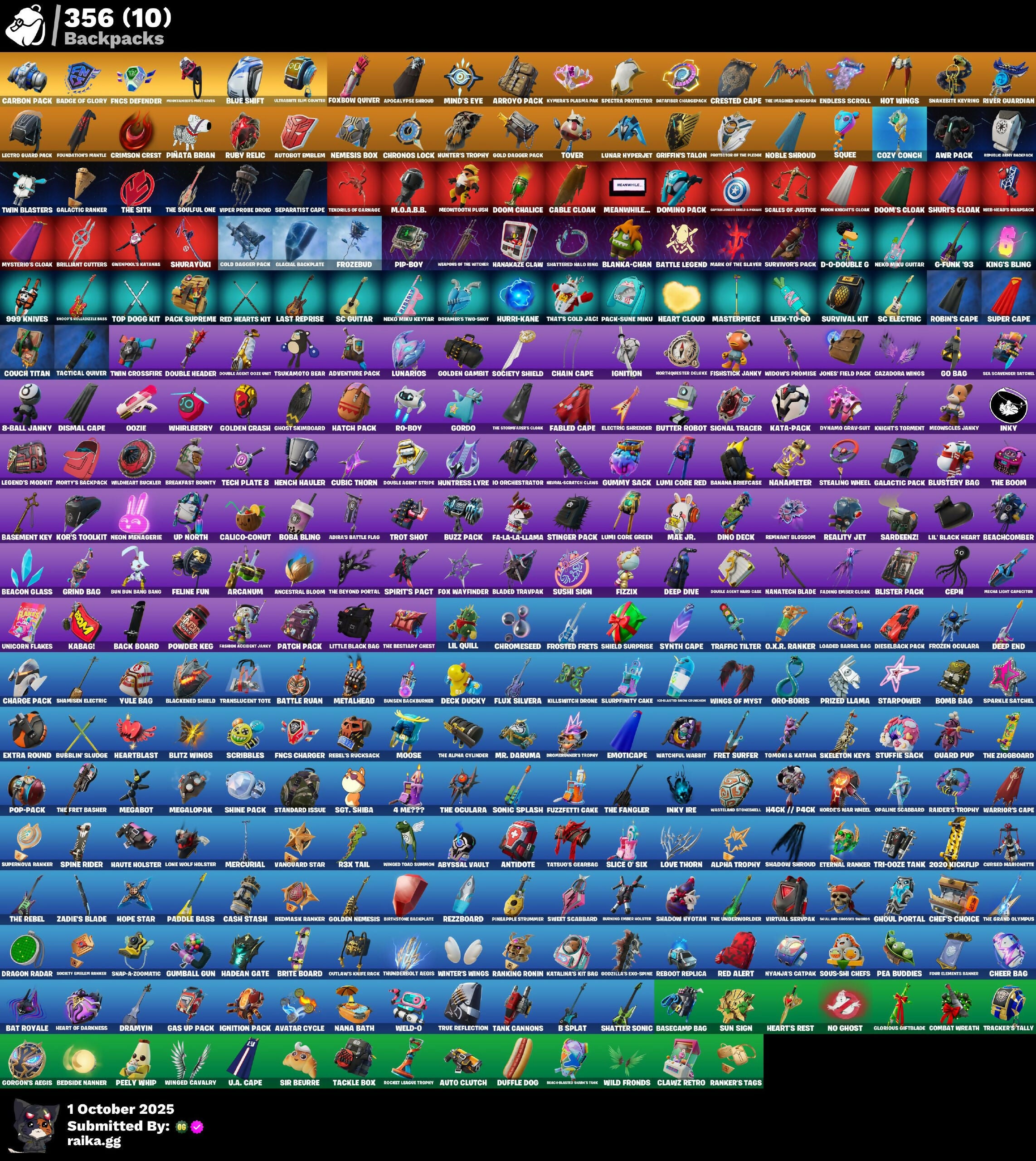 (Snikt!), 2.0's Revenge, 2020 Kickflip, 24 Karat Katana, 4 Me???, 8-Ball Janky, 999 Knives, AWR Pack, Absenz, Abyssal Blade, Abyssal Vault, Acolyte's Curse, Adira, Adira's Armor, Adventure Aerial, Adventure Pack, Aerial Assault Bomber, Aerial Classic, Agent Jones, Agent Peel V, All-Nighter, Alli, Alpha Altimeter, Alpha Trophy, Ancestral Bloom, Angler Axes, Anniversary Axe, Antidote, Apex Predator, Aphrodite, Arachrobatics, Arcane Research, Arcanum, Arctic Adeline, Ardio's Battle Flag, Ares, Arrowpoint Carver, Arroyo Pack, Artemis, Articulated Blade Wing, Artifact Axe, Assaultron Blade, Athleisure Assassin, Auntie Dot, Aura, Auto Clutch, Autobot Emblem, Avatar Cycle, Avatar's Flourish, Aw, Shucks., Ayla Winn, B Splat, Back Board, Backup Blades, Badge Of Glory, Balance Board, Banana Bomber, Banana Briefcase, Bananaxe, Baron's Hoard, Base Jumper, Basecamp Bag, Basement Key, Basic Basher, Bat Royale, Battle Bloom, Battle Hound, Battle Legend, Battle Ruan, Baymax Wings, Beach Bomber, Beach Breezer, Beachcomber, Beacon Glass, Beak-Bulldok's Shore's Tusk, Beamers, Bear Hug, Beast Boy, Beastfang, Bedside Manner, Beep & Boop, Beep Beep, Big Bite, Big Haul, Bike To Go, Birdarang Flourish, Birthday Basher, Birthstone Backplate, Bitey, Black Leader, Black One X-Wing, Blackened Shield, Blade Aria, Blade Of The Warning Room, Bladed Travpak, Blades Of Light, Blanka, Blanka-Chan, Blasted, Blazeberry Blade, Blister Pack, Blitz Axe, Blitz Wings, Blizzard Bomber, Blowin' Up, Blue Shift, Blue Streak, Blue Striker, Blue Team Leader, Blustery Bag, Board Breaker, Boardwalk Ruby, Boba Bling, Boba Snack, Bolt Blades, Bomb Bag, Bombs Away!, Bone Patrol, Bones, Boogie Down, Boomin', Boosting Ki, Boots N' Cats, Boulder Breakers, Bouncer, Bounty 'Brella, Bow Go, Boxing Glove Arrow, Breakfast Bounty, Breaking Waves, Breakshore Trident, Breathless Blades, Breezy Bashers, Brilliant Cutters, Brilliant Guitars, Brite Board, Brite Moves, Brite Raider, Brite Stars, Brite Storm Bomber, Bronzed Scimitars, Bruteball, Brutus, Bubble Basher, Bubblin' Sludge, Bubbloon, Buckets, Bugsy, Bullet Rider, Bun Bun Bang Bang, Bunker Basher, Bunker Jonesy, Bunsen Backburner, Burning Dragon, Burning Ember Holster, Burnmark, Bushie Bright, Butter Robot, Buttoned Up, Buzz Pack, Buzzsaw Breacher, Bytes, CR2-8, Cable, Cable Cloak, Cacodemon, Cactus Club, Calico, Calico Holiday, Calico-Conut, Call Me, Called Shot, Cap Kick, Captain America, Captain Jones, Captain's Glider, Carbon Commando, Carbon Pack, Carbon Scarlet, Cardistry, Carnage, Carnage Cleaver, Cash Stash, Cassidy Quinn, Cat's Paw, Cauldron Chill, Cazadora, Cazadora Wings, Celebratory Slice, Ceph, Cerberus, Cerberus Bite, Chain Cape, Chain Surfer, Chainsaur, Chaos Directive, Chaos Double Agent, Charge Pack, Charlotte, Cheer Bag, Cheer Bolt, Chef's Choice, Chef's Special, Chemist's Cloudglider, Chigusa, Chillest Vibe Rider, Choice Knit, Chop Chop, Chop Dropper, Chrome Cloudcruiser, Chrome Marked, Chrome Punk, Chromebrella, Chromeseed, Chromestruck Fire, Chronos Lock, Circuitry, Clang & Basher, Classic Age, Classified, Clawz Retro, Clean Sweep, Cliffside Soarer, Clone Trooper, Cloudburst, Cluck, Cluck Strut, Clucking Mad, Coaxial Blue, Coin Flip, Cold Blooded Style, Cold Dagger Pack, Cold Furia, Combat Wreath, Combocopter, Comfy Cats, Commander's Descent, Competition Time Brella, Conch Call, Confetti, Contour Camo, Controlled Focus, Corrosive Stripe, Cosmonetric Cleanup, Couch Titan, Count It!, Cozy Conch, Crescent Shroom, Crested Cape, Crimson Codeblade, Crimson Crest, Crimson Polestar, Crimson Sai, Crimson Scythe, Crimson Wish, Crooked Claw, Crowning Achievement, Crucible Blade, Crystal, Crystal Axe Of The Makers, Crystal Fang, Crystal Smasher, Cube Flayer, Cubed, Cubic Thorn, Cuddle Carvers, Cuddle Hearts, Cuddle Team Sierra, Cuddly Cloudcruiser, Cuddly Crusher, Cupid Team Specialist, Curling Iron, Cursed, Cursed Energy, Cursed Energy Flow, Cursed Marionette, Cvmtiar, Cybertronian Axe, Cyclo Curl, D-O-Double G, Daigo, Daigo's Claws, Daisies, Dali, Danger Donut, Dark Charger, Dark Symbiote, Darkfire Claws, Darth Shader, Darth Vader, Datafier Chargpack, Deadpool, Dealer's Deck, Death Star 'Brella, Deck Ducky, Deep Dive, Deep End, Deep Future, Delivery Diver, Demonslayer Blade, Denim Destiny, Desdemona, Designated Hitters, Destroyer Signature, Diamond Diva, Die With A Smile, Die With A Smile Bruno, Dieselback Pack, Dimensional Camo, Dino Deck, Dirtbike Challenge, Disco, Dismal Cape, Diva Fever, Diva's Dancefloor, Dive Knives, Dizzie, Doctor Slone, Dogg Treat, Domino, Domino Pack, Don's Dominator, Don't Stare Now, Doom, Doom Brella, Doom Chalice, Doom Slayer, Doom's Cloak, Doom's Domain, Double Agent Hard Case, Double Agent Hush, Double Agent Ooze Unit, Double Agent Stripe, Double Agent Wildcard, Double Header, Double Tags, Downpour, Doze Dab, Dragon Radar, Dragon Rider, Dragon Rune Lance, Dramatic Flares, Dramvin, Dreamer's Two-Shot, Drift Shift, Drippin' Flavor, Drome Drifter, Droomewner's Trophy, Droop, Drummies, Duffle Dog, Dumbbell Driver, Dune Scooper, Durrr Taisho, Dusk Knight, Dusty, Dynamo Grav-Suit, Eagle, Eagles Form, Echo, Eclipse Brella, Egg Drop Scoop, Eggar, Electric Shredder, Electro Auring Blades, Elite Servo, Elysium, Ember Baton, Ember Pick, Emma Frost, Emoticape, Empress Fan Dance, Enchanted Lifebloom, Endless Scroll, Energy Claw, Ensnared, Epic Blade Of Floof, Epic Swords Of Wonder, Epitaph Edge, Equalizer, Era, Eren Jaeger, Escapees, Eternal Hunt, Eternal Ranker, Eternal Renegade, Evasive Maneuvers, Everything’s End, Evie, Evolved Heat Ray, Exile's Emblem, Expressionism, Extermination Saw, Extra Round, FNCS Charger, FNCS Defender, Fabio Sparklemane, Fabled Cape, Face Palm, Fading Ember Cloak, Fai-La-Llama, Fang Dance, Fanged Foresight, Fashion Accident Janky, Felina, Felina's Claw, Feline Fun, Feral Finisher, Field Flyer, Fiendish Wand, Fire Show, Fireworks Salvo, Fishbone Flayer, Fishstick Janky, Fist Bump, Fist of Doom, Fizzix, Flapjack Flyer, Flare, Flash of Li