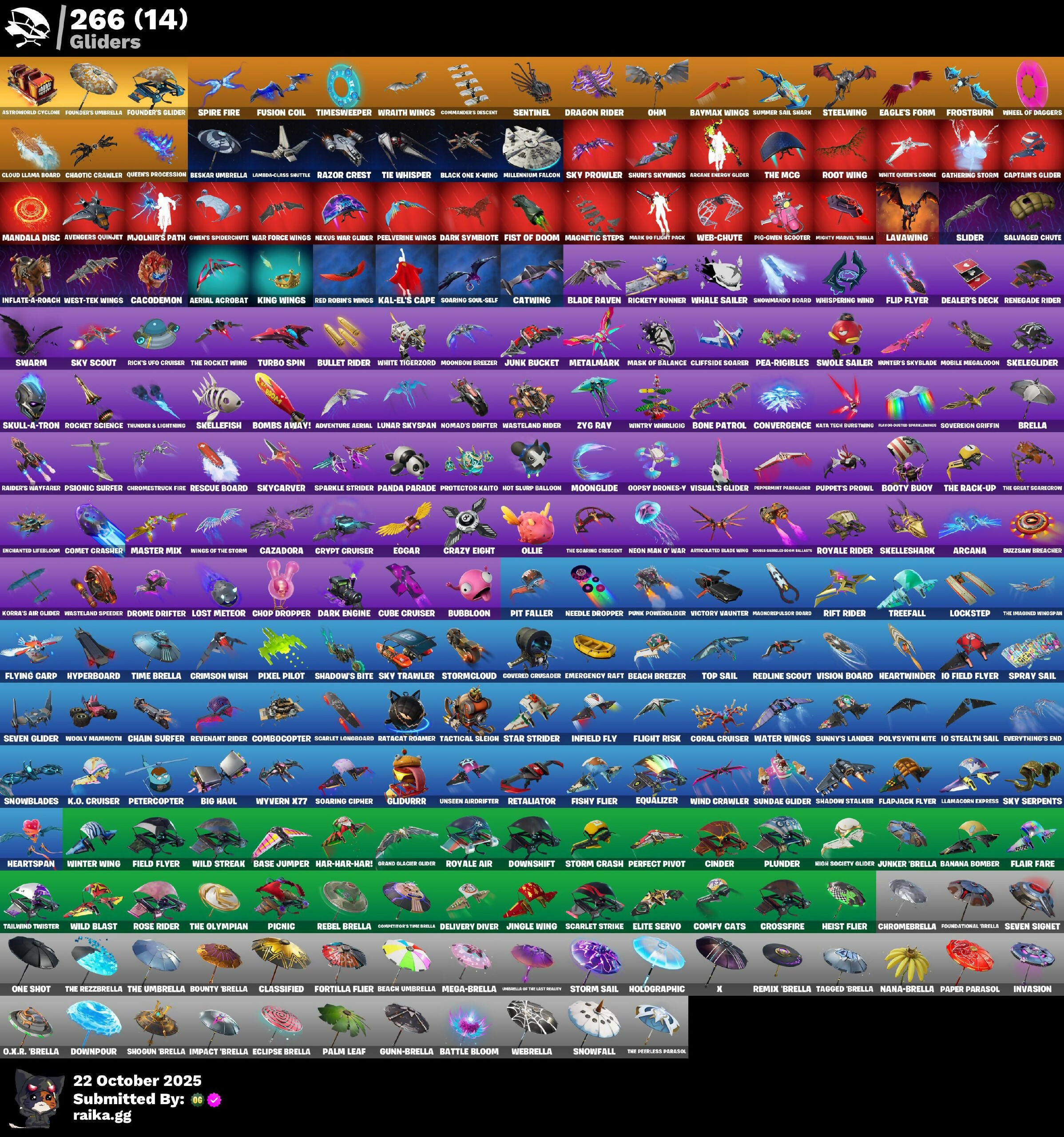 (Snikt!), 1-60 Power Armor, 1-Ball, 10 Field Flyer, 10 Stealth Sail, 2.0's Revenge, 2020 Kickflip, 6-Carat Cutter, 8-Ball, 8-Ball Janky, 8-Ball Vs Scratch, 999 Knives, A Warrior Prepares, A.I.E Shredder, A.I.M., Abominable Axe, Acolyte’s Curse, Adira, Adira's Battle Flag, Adira’s Armor, Adventure Aerial, Adventure Pack, Aerial Acrobat, Aerial Assault Bomber, Aerial Classic, Afterparty, Agent Jones, Agent Peely, Ahsoka’s Staff, All-Nighter, Alpha Trophy, Altitude, Amazing Cube, Ancestral Bloom, Angler Axes, Anniversary Axe, Antidote, Antonia, Apex Predator, Aphrodite, Apocalypse Shroud, Aquaman, Aquaman's Trident, Arachrobatics, Arcana, Arcane Energy Glider, Arcane Steel, Arctic Adeline, Arctic Camo, Ark, Ark Wings, Arrowpoint Carver, Arroyo Pack, Artemis, Articulated Blade Wing, Artifact Axe, Assaultron Blade, Astro Antidote, Astro Jack, Astroworld Cyclone, Atmosphere, Auntie Dot, Aura, Auto Clutch, Autobot Emblem, Avatar's Flourish, Avengers Quinjet, Axe-Tral Form, Azarath Metrion Zinthos!, B Splat, Back Board, Back Front Line Ranker, Back Upcycled Turbo Tuner, Backtracker, Backup Blades, Balance Board, Ball Bling, Bamboo-Tana, Banana Bomber, Banana Briefcase, Bananaxe, Bank Shots, Base Jumper, Basecamp Bag, Basement Key, Basic Basher, Bat Royale, Bat Signal, Battle Blessing, Battle Bloom, Battle Call, Battle Hound, Baymax Wings, Beach Breezer, Beach Umbrella, Beachcomber, Beacon Glass, Beamers, Bean Bag, Beastfang, Beatzbunny, Beep Beep, Beskar Umbrella, Bhangra Boogie, Big Bite, Big Chuggus, Big Haul, Bike To Go, Billy Bounce, Birthday Basher, Birthday Cake, Birthday Slice, Bitev, Black Leader, Black One X-Wing, Blackheart, Blade Bag, Blade Raven, Blade of the Walking Dead, Bladed Trapvar, Blades of Light, Blasted, Blitz Axe, Blowin' Up, Blowing Bubbles, Blustery Bag, Board Breaker, Boba Bling, Boba Snack, Bobo, Boing!, Bolt Blades, Bomb Bag, Bomb Bouquet, Bombs Away!, Bone Patrol, Boneless, Boogeyman, Boogie Down, Book of Cagliostro, Boomin', Bootsin' Cats, Bootstraps, Booty Buoy, Boulder Breakers, Bounty Brella, Boxing Glove Arrow, Brain Freeze, Breakfast Bounty, Breaking Waves, Breakneck, Breakpoint, Breakshore Trident, Breathless Blades, Brella, Brilliant Cutters, Bring It, Brite Moves, Brite Raider, Bronzed Scimitars, Bruteball, Bubbloon, Bullet Rider, Bullseye, Bun Bun Bang Bang, Bunker Basher, Bunker Jonesy, Bunsen Backburner, Burning Dragon, Bushie Bright, Bushy's Bulb, Busy, Butcher's Tools, Butcher’s Knife, Butter Robot, Buttoned Up, Buzz Pack, Buzzsaw Breacher, Bytes, C353 Contender I, C384 Contender I, C3S2 Contender II, C4S1 Contender I, Cacodemon, Cake!, Cakey, Calamity, Calculated, Calico, Calico Holiday, Calico-Coconut, Call Me, Called Shot, Cameo, Cameo Vs Chic, Cap K.O., Cap Kick, Captain America’s Shield & Pickaxe, Captain Jones, Captain Jones's Shield & Flames, Captain Llamerica, Captain's Glider, Carbon & Gold, Carbon Fiber Holster, Carbon Scarlet, Card Drop, Cardistry, Carnage, Carnage Cleaver, Carver, Cash Stash, Cassidy Quinn, Cat Flip, Catalyst, Catwing, Cauldron Chill, Cazadora, Cazadora Wings, Celebratory Slice, Centurion, Centurion Edge, Cerberus, Cerberus Bite, Chain Surfer, Chainsaur, Challenger’s Staff, Chaos Directive, Chaos Director, Chaos Scythe, Chaotic Crawler, Charge Pack, Charlotte, Chef's Special, Chic, Chica Was Here, Choice Knit, Chop Chop, Chop Dropper, Chrome Marked, Chrome Punk, Chromebrella, Chromeseed, Chromestruck Fire, Chronos Lock, Chuck Pack, Cinder, Clang & Basher, Clark Kent, Classic Age, Classified, Clawbox, Clawz Retro, Clean Sweep, Cliffside Soarer, Cloud Llama Board, Cloudburst, Cluck, Cluck Strut, Clucking Mad, Clutch & Dagger, Clutch Victory, Cobalt, Cobra, Codsworth, The Clannpd, Coin Flip, Cold Blooded Style, Cold Furia, Combat Cue, Combat Knife, Combat Wreath, Combocopter, Comet Crasher, Comfy Cats, Commander's Descent, Competitor's Time Brella, Conch Call, Confetti, Conga, Conjure Weapon, Constructor, Contour Camo, Controlled Focus, Convergence, Copper Wasp, Coral Cruiser, Coral Crush, Corrosive Stripe, Cosmic Cleavers, Cosmic Lumacorn, Count It!, Covered Crusader, Cozy Conch, Crack It, Crazy Eight, Crescent Shroom, Crested Cape, Crimson Crest, Crimson Wish, Crossfire, Crowbar, Crowning Achievement, Crucible Blade, Crypt Cruiser, Crystal Axe of the Titans, Cube Aether, Cube Cruiser, Cubed, Cubic Scepter, Cubic Vortex, Cuddle Hearts, Curling Iron, Cursed, Cursed Marionette, Cyberdyne Salute, Cybertronian Axe, Cyclo Curl, DJ Yonder, Dabstand, Dagger Dance, Daigo, Daigo’s Claws, Daisies, Dark Axe, Dark Bag, Dark Bomber, Dark Engine, Dark Jonesy, Dark Red Knight, Dark Shield, Dark Symbiote, Dark Wild Card, Darth Shader, Darth Vader, Datafiber Charged Pack, Deadpool, Deadpool's Katanas, Dealer's Deck, Death Star Smasher, Deck Ducky, Deep Dive, Deep End, Deep Future, Delivery Diver, Demi, Demon Skull, Demonslayer Blade, Denim Destiny, Designed Hitters, Destroyer Signature, Diamond Diva, Diamond Throne, Diamondclaw Picker, Dice Roll, Dieselback Pack, Dimensional Camo, Dimensional Gate, Dino Deck, Dire, Dirtbike Challenge, Disco, Dive Knives, Dizzie, Do The Split, Doctor Doom, Doctor Slone, Doctor Strange, Dogg Treat, Don's Dominator, Doom, Doom Chalice, Doom Slayer, Doom's Cloak, Doom's Cowl, Doomfinger's Trophy, Double Header, Double Tags, Double-Shelled Boom Ballista, Downpour, Downshift, Doze Dab, Dragon Rider, Dragon Rune Lance, Dragon Scales, Dragon Stance, Dragoncrest, Dragon’s Claw, Dramatic Flares, Dread, Dreamer's Two-Shot, Driftwood, Drive Shaft, Driver, Drome Drifter, Droop, Drummies, Dual Katanas, Duelist's Card Trick, Duelist’s Foil, Dumbbell Driver, Dummy, Dune Scooper, Dunk On 'Em, Durrr Burger, Dusk, Dusk Wings, Dusty, Dying Light, Dyna-Boom!, Dynamo Grav-Suit, Dynamo Tntina, E.L.L.M., EQ, Eagle's Form, Eclipse Brella, Eclipsed Edges, Eggar, Electric Shredder, Electro Flaring Blades, Electro Shuffle, Electro-Pincers, Elegance Blade, Elite Servo, Elysium, Ember, Ember Pick, Emergency Raft, Emma Fro