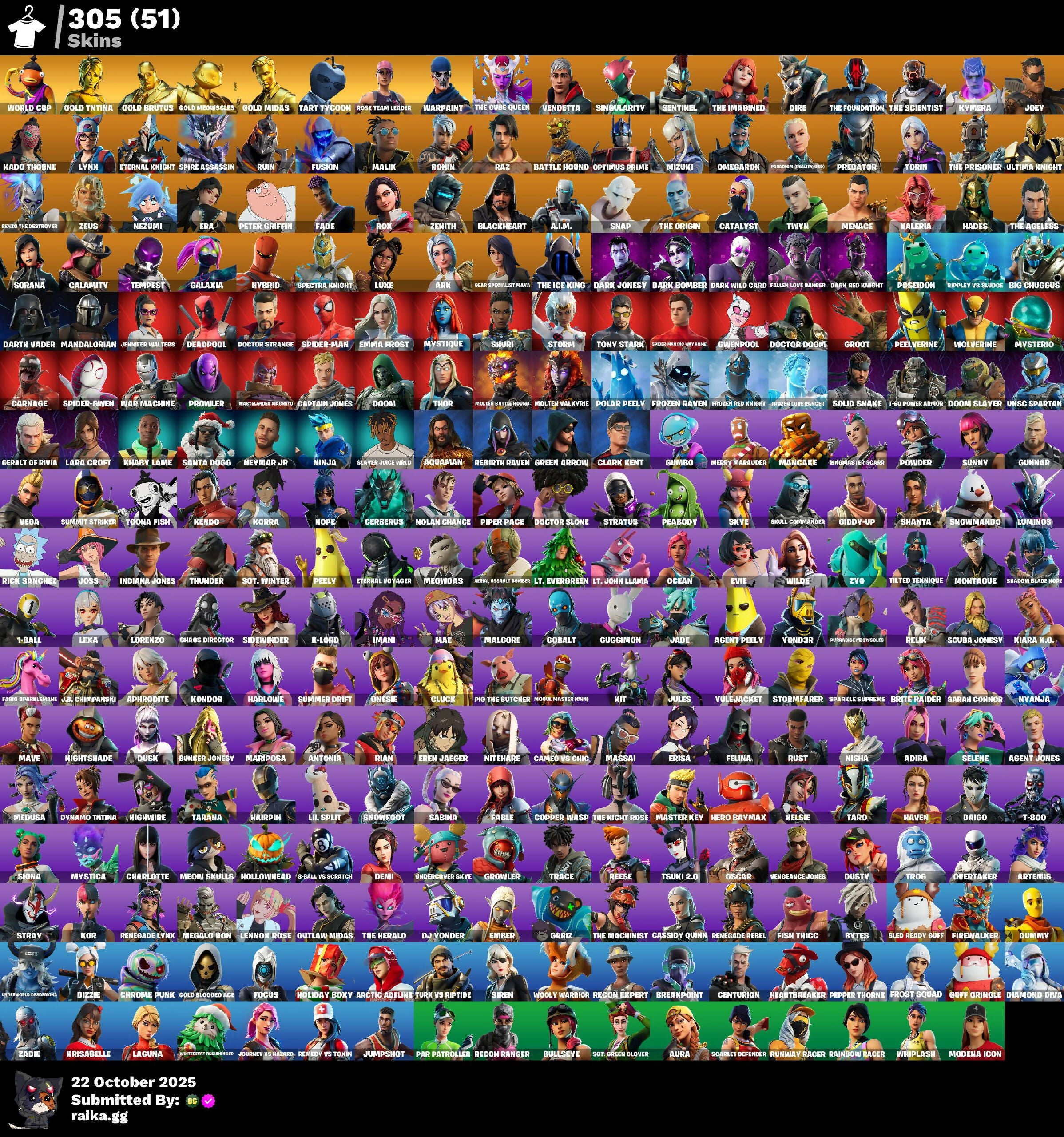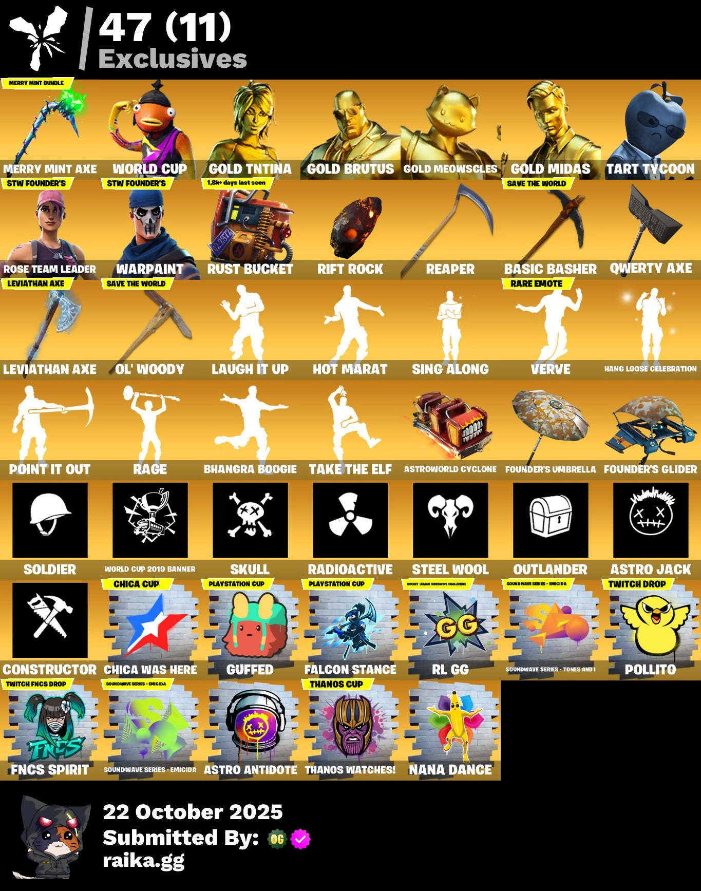 [PC/PSN/XBOX/NITTENDO] 305 skins | OG STW | Merry Mint Axe | Leviathan Axe | WORLD CUP | Gold TNTina | Gold Brutus | Gold Meowscles | Gold Midas | Tart Tycoon | The Cube Queen | Vendetta | Singularity | 1150 VB