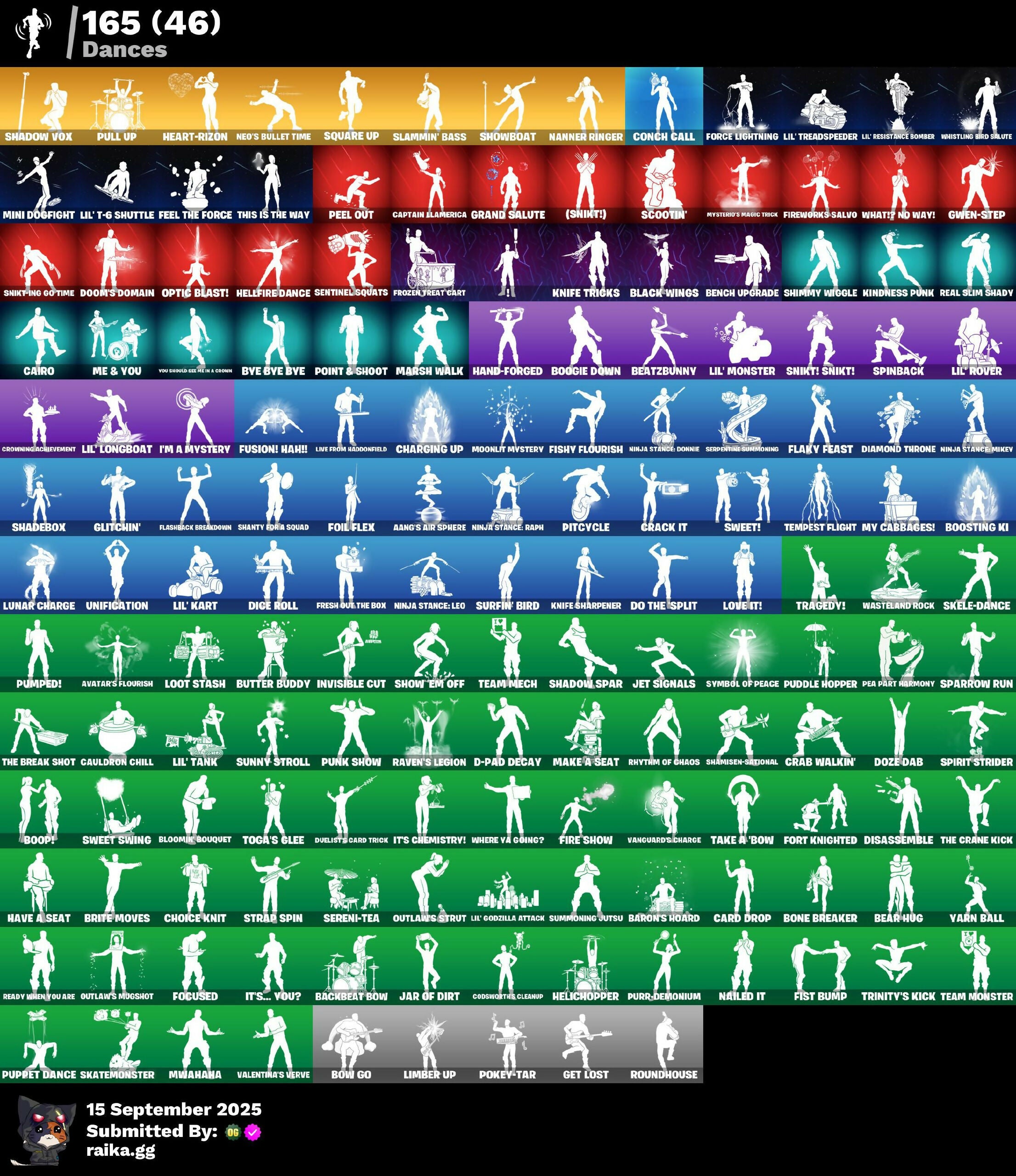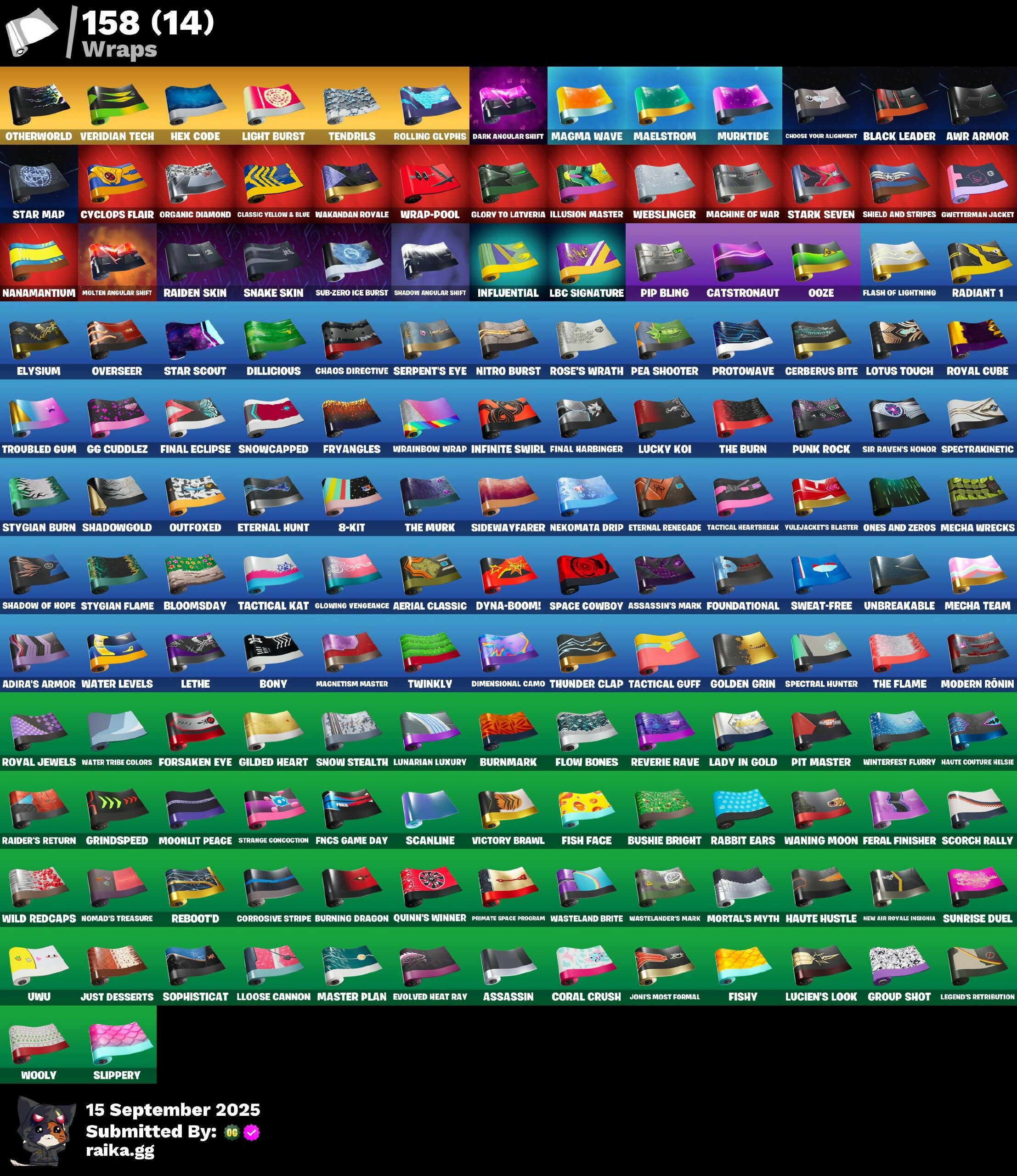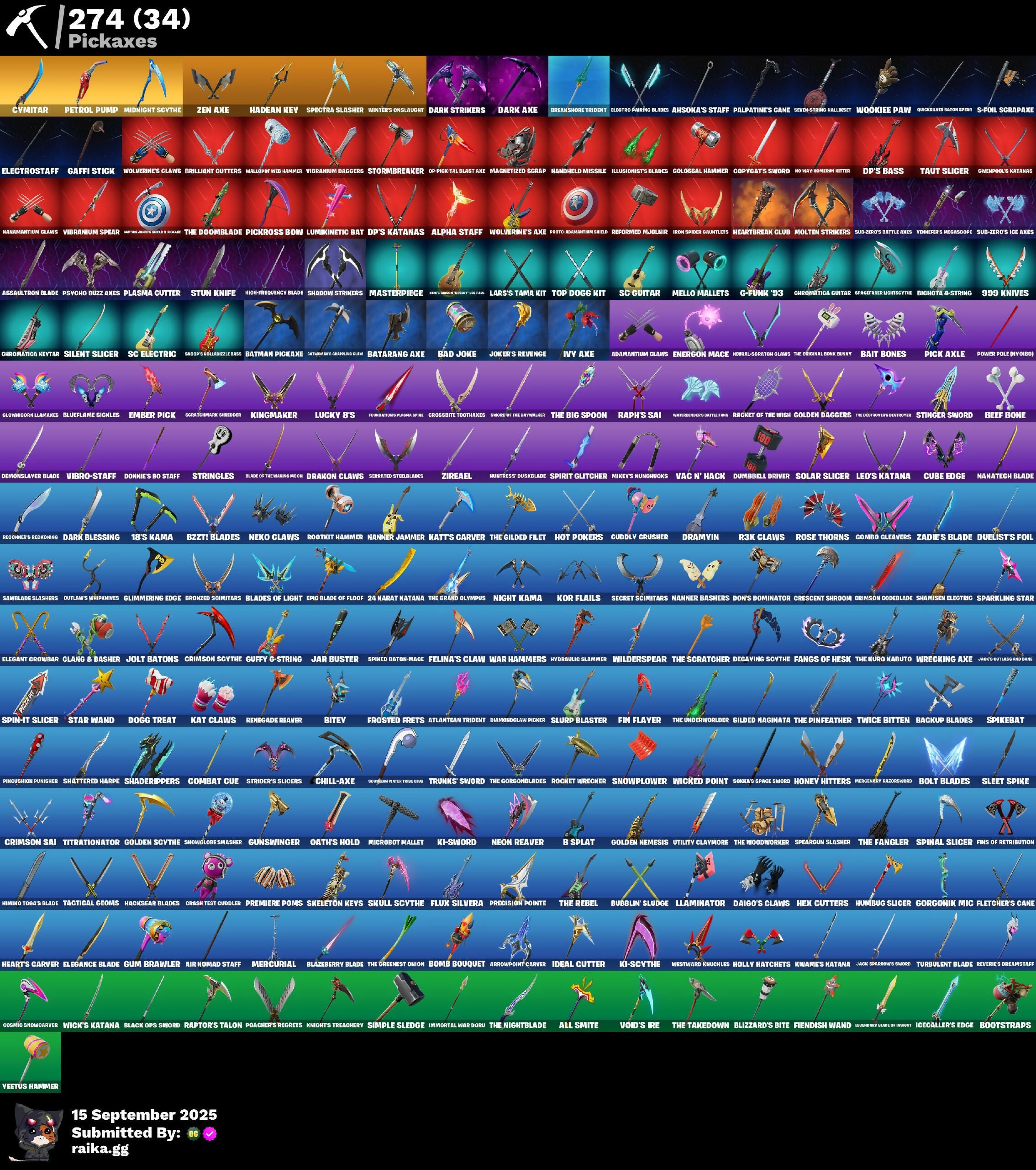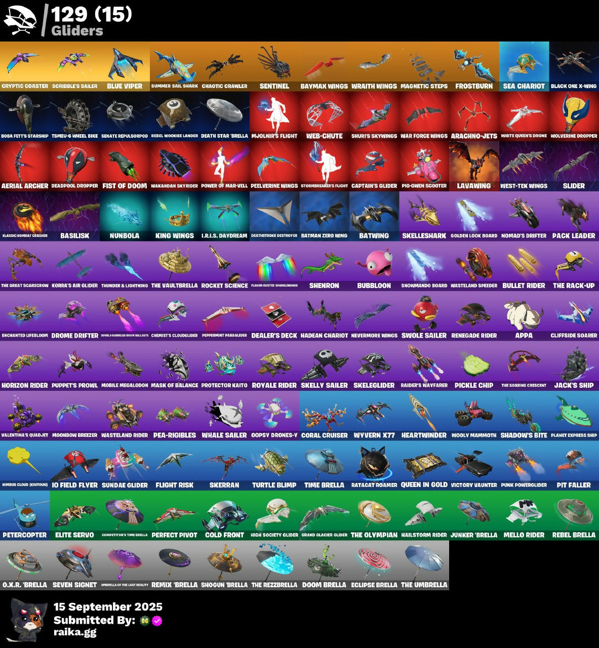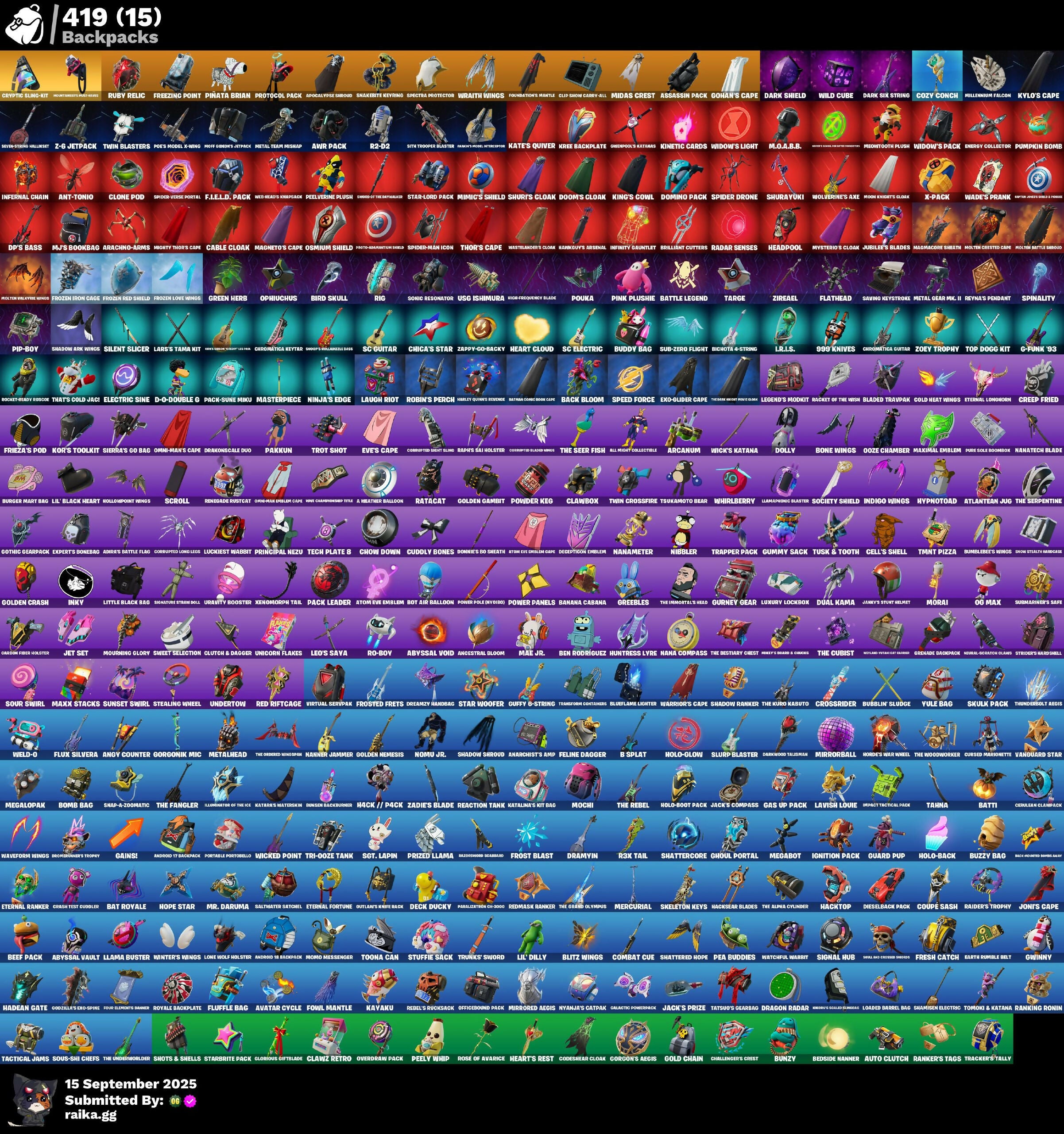 (Snikt!), 1-Ball, 18’s Kama, 24 Karat Katana, 8-Kit, 999 Knives, A Weather Balloon, AWIR Pack, AWR Armor, AWR Trooper, Aang, Aang's Air Sphere, Abyssal Vault, Abyssal Void, Adamantium Claws, Adira's Armor, Adrien's Battle Flag, Adventure Peely, Aerial Archer, Aerial Assault Bomber, Aerial Assault Trooper, Aerial Classic, Ahsoka Tano, Ahsoka's Staff, Air Nomad Staff, Airie, Airphorian, All Might, All Might Collectible, All Smite, Alpha Staff, Anarchist's Amp, Ancestral Bloom, Android 17, Android 17 Backpack, Android 18, Android 18 Backpack, Andy Fangerson, Angry Counter, Ant-Man, Ant-Tonio, Antonia, Aphrodite, Apocalypse Shroud, Appa, Apprentice Evie, Arachno-Arms, Arachno-Jets, Arcanum, Ares, Armored Batman Zero, Arrowpoint Carver, Artemis, Assassin, Assassin Pack, Assassin's Mark, Assaultron Blade, Atlantean Jug, Atlantean Trident, Atom Eve, Atom Eve Civilian Cape, Atom Eve Emblem, Auto Clutch, Avatar Cycle, Avatar State Aang, Avatar's Flourish, B Splat, Bachi, Back Bloom, Backbeat Bow, Backup Blades, Bad Joke, Bait Bones, Banana Cabana, Baron's Hoard, Basilisk, Bat Royale, Batarang Axe, Batman Comic Book, Batman Comic Book Cape, Batman Pickaxe, Batman Zero Wing, Batti, Battle Legend, Battlebus, Batwing, Baymax Wings, Bear Hug, Beatzbunny, Bedside Nanner, Beef Bone, Beef Pack, Beerus, Ben Rodriguez, Bench Upgrade, Bichota 4-String, Big Dill, Birch, Bird Skull, Bitey, Black Leader, Black One X-Wing, Black Ops Sword, Black Panther, Black Widow Outfit, Black Wings, Blacklight, Blade, Blade of the Missing Moon, Bladed Travpak, Blades of Light, Blazeberry Blade, Blitz Brigade, Blitz Wings, Blizzabelle, Blizzard Bomber, Blizzard’s Bite, Bloomin' Bouquet, Bloomsday, Blue Viper, Blueflame Lighter, Blueflame Sickles, Boba Fett, Boba Fett's Starship, Bolt Blades, Bomb Bag, Bomb Bouquet, Bone Boss, Bone Breaker, Bone Ravage, Bone Wings, Bony, Boogie Down, Boop!, Boosting Ki, Bootstraps, Bot Air Balloon, Bow Go, Breakshore Trident, Brilliant Cutters, Brite Agent, Brite Bomber, Brite Hunter, Brite Moves, Brite Raider, Bronzed Scimitars, Bubblin Sludge, Bubblin’ Sludge, Bubloon, Buddy Bag, Bugha, Bullet Rider, Bulma, Bumblebee, Bumblebee's Wings, Bundles, Bunzy, Burger Mart Bag, Burning Dragon, Burnmark, Bushie Bright, Bushranger, Butter Buddy, Buzzy Bag, Bye Bye Bye, Bzzt! Blades, CR2-8, Cable, Cable Cloak, Cairo, Captain America, Captain America's Shield & Honrak, Captain Jones, Captain Marvel, Captain Phasma, Captain Quake’s "Dreamy" Lure, Captain's Glider, Carbon Fiber Holster, Card Drop, Carmine Rosso, Cassidy Quinn, Catrina, Catstronaut, Catwoman Zero, Catwoman’s Grappling Claw, Cauldron Chill, Cell, Cell's Shell, Cerberus, Cerberus Bite, Cerulean Calamari Pack, Challenge's Crest, Champion Kuno, Champion Kyra, Champion Siren, Chaos Agent, Chaos Directive, Chaos Director, Chaotic Crawler, Charging Up, Charlotte, Chemist's Cloudglider, Chewbacca, Chica, Chica's Star, Chief Hopper, Chigusa, Chill-Axe, Chloe Kim, Choice Knit, Choose Your Alignment, Chow Down, Chris Redfield, Chromatica Guitar, Chromatica Keytar, Ciri, Clang & Basher, Clara, Classic Yellow & Blue, Clawbox, Clawz Retro, Cliffside Soarer, Clint Barton, Clip Snow Candy-411, Clone Pod, Clutch & Dagger, Codeshear Cloak, Codsworth's Cleanup, Cold Front, Cold Heat Wings, Colossal Hammer, Colossus, Combat Cue, Combat Tech Wales, Combo Cleavers, Commander Razzle, Competitor's Time Brella, Conch Call, Consulter Calamity, Copycat's Sword, Coral Cruiser, Coral Crush, Corrosive Stripe, Corrupted Arcane, Corrupted Bladed Wings, Corrupted Insight, Corrupted Long Legs, Corrupted Shotgun, Corrupted Skirt Sling, Cosmic Snowcarver, Countess Daraku, Coupé Sash, Cozy Conch, Crack It, Crash Test Cuddler, Creep Fried, Crescent Shroom, Crimson Godblade, Crimson Sai, Crimson Scythe, Crossbite Toothaxes, Crossheart, Crossrider, Cryptic Coaster, Cryptic Sling-Kit, Cube Assassin, Cube Edge, Cuddly Bones, Cuddly Crusher, Cursed Marionette, Cyclops, Cyclops Flair, Cymitar, D'Ark, D-O-Double G, D-Pad Decay, DP's Bass, DP’s Katanas, Dabi, Daigo, Daigo’s Claws, Dali, Dara, Daredevil, Dark Angular Shift, Dark Axe, Dark Blessing, Dark Jonesy, Dark Power Choco, Dark Red Knight, Dark Shield, Dark Six String, Dark Strikers, Dark Wild Card, Darkwood Talisman, Deadpool (Pen & Ink), Deadpool Dropper, Dealer's Deck, Death Star 'Brella, Deathstroke Destroyer, Decaving Scythe, Decepticon Emblem, Deck Ducky, Demogorgon, Demonslayer Blade, Diamond Hanz, Diamond Throne, Diamondclaw Picker, Dice Roll, Dieselback Pack, Dillicious, Dimensional Camo, Disassemble, Disco Tek Manic, Do The Split, Dogfathers Trophy, Dogg Treat, Doggo, Dolly, Domino, Domino Pack, Donatello, Donnie's Bo Sheath, Donnie’s Bo Staff, Don’s Dominator, Doom, Doom Brella, Doom's Cloak, Doom's Domain, Double-Barrelled Boom Ballasts, Doze Dab, Dragon Radar, Dragon Steel Hybrid, Drakon Claws, Drakonscale Duo, Dramyin, Dreamzy Bandana, Drome Drifter, Dual Kama, Duelist's Card Trick, Duelist’s Foil, Dumbbell Driver, Dunson Backburner, Durrr Taisho, Dyna-Boom!, Dynamo TNTina, Earth Rum Belt, Eclipse, Eclipse Brella, El Chapulin Colorado, Electric Sine, Electro Daring Blades, Electrochemical Dagger, Electrostaff, Elegance Blade, Elegant Crowbar, Elite Servo, Ellen Ripley, Elysium, Ember Pick, Emma Frost, Enchanted Lifebloom, Energon Mace, Energy Collector, Enigmatic Gacha, Epic Blade of Flood, Errant, Eternal Fortune, Eternal Hunt, Eternal Longhorn, Eternal Ranker, Eternal Renegade, Eve's Cape, Evolved Heat Ray, Exo Stranger, Exo-Glider Cape, Expert's Bonebag, Explorer Emilie, F.L.E.L.D. Pack, FNCS Game Day, Fangs of Hesh, Fario Sparklerine, Feel The Force, Felina, Felina’s Claw, Feline Dagger, Feral Finisher, Field Surgeon, Fiendish Wand, Fin Flayer, Final Eclipse, Final Harbinger, Fins of Retribution, Fire Show, Fireworks Salvo, Fish Face, Fish Thicc, Fishdrift, Fishskull, Fishstick, Fishy, Fishy Flourish, Fist Bump, Fist Of Doom, Flaky Feast, Flash Of Lightning, Flashback Breakdown, Flathead, 