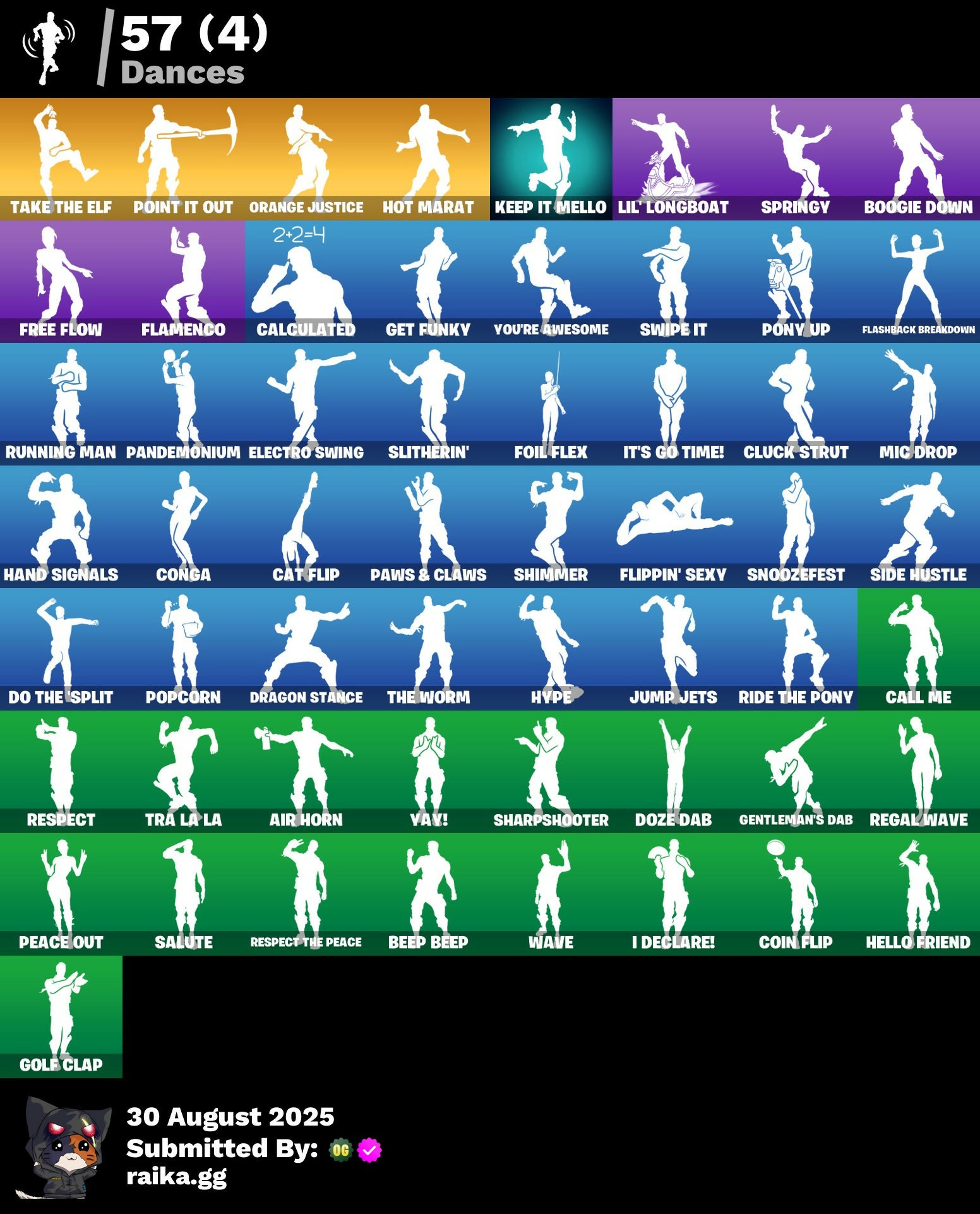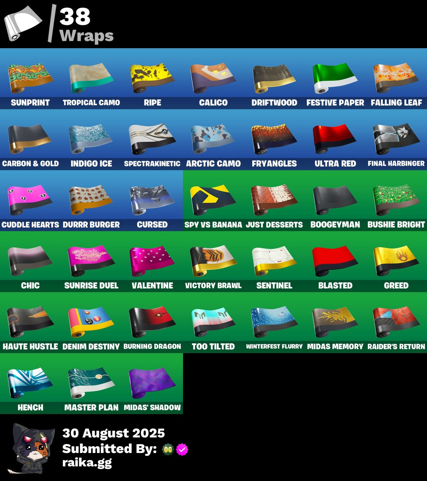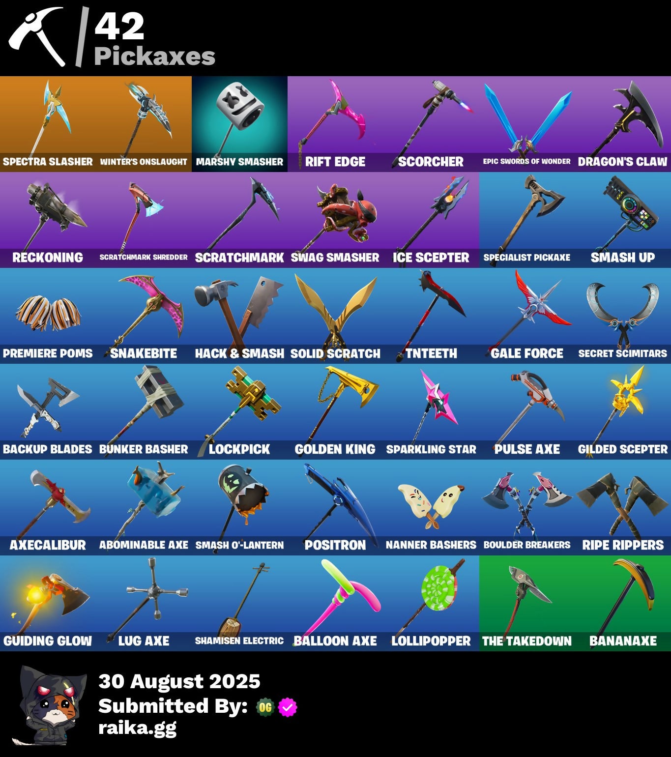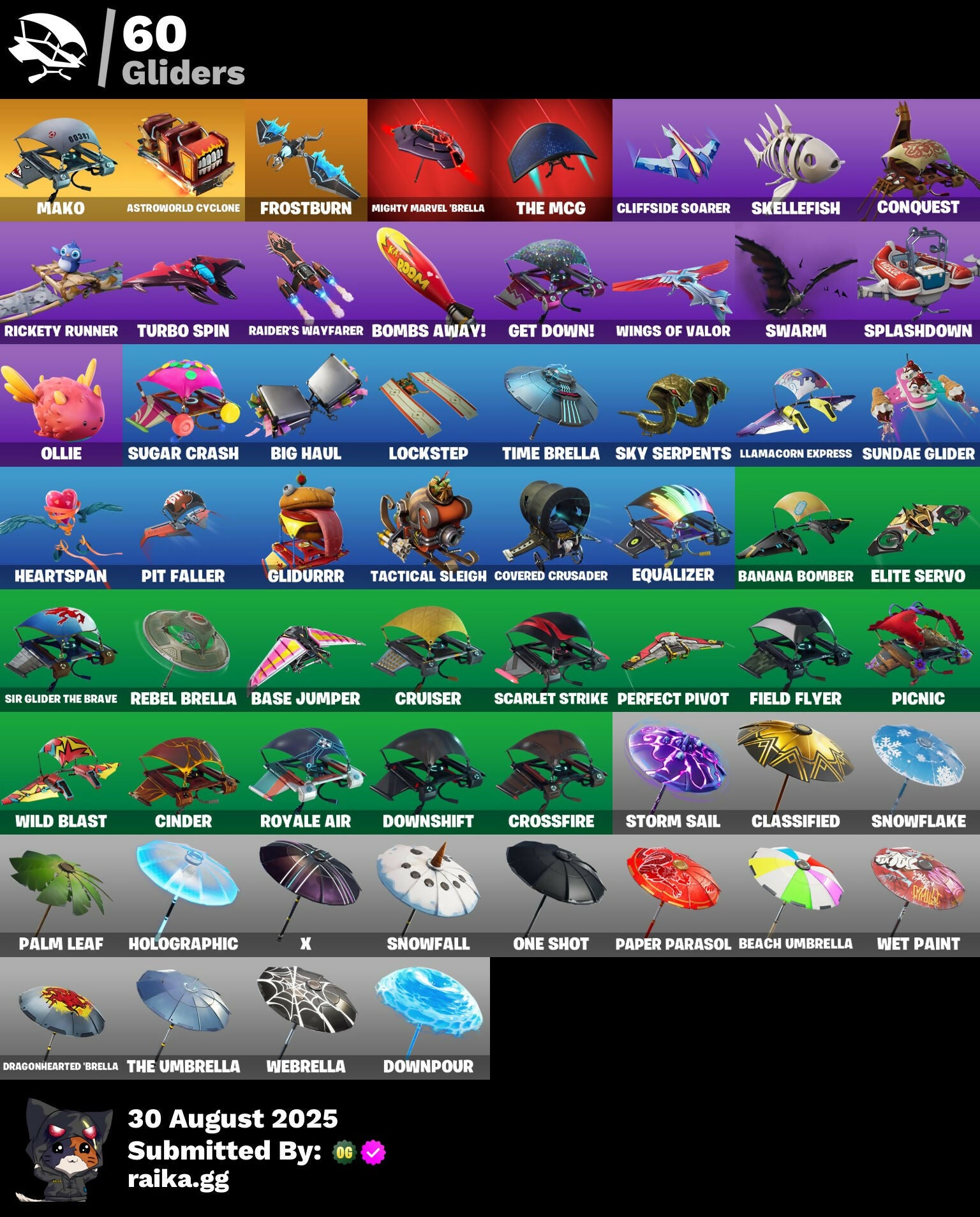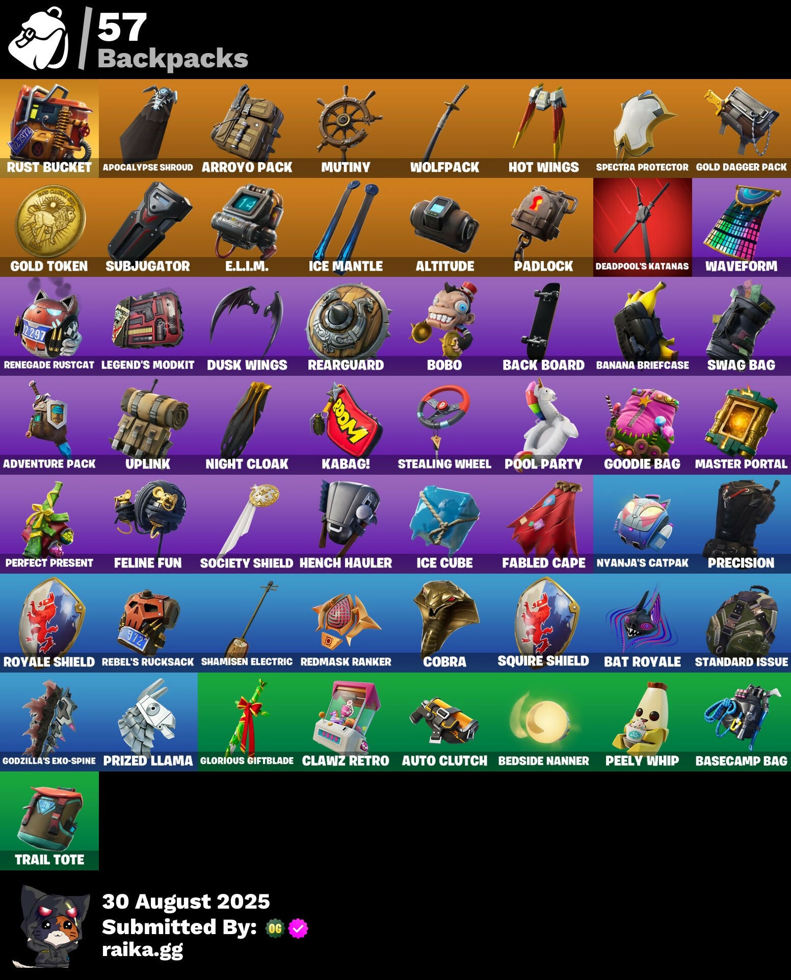 A.I.M., Abominable Axe, Adventure Pack, Agent Peely, Air Horn, Altitude, Apocalypse Shroud, Arctic Camo, Arroyo Pack, Astroworld Cyclone, Auto Clutch, Axecalibur, Back Board, Backup Blades, Balloon Axe, Banana Bomber, Banana Briefcase, Bananaxe, Base Jumper, Basecamp Bag, Bat Royale, Battlehawk, Beach Umbrella, Bedside Nanner, Beep Beep, Big Haul, Blackheart, Blasted, Blue Squire, Bobo, Bombs Away!, Boogeyman, Boogie Down, Boulder Breakers, Brutus, Bunker Basher, Bunker Jonesy, Burning Dragon, Bushie Bright, Calamity, Calculated, Calico, Call Me, Carbide, Carbon & Gold, Cat Flip, Chic, Cinder, Classified, Clawz Retro, Cliffside Soarer, Cluck Strut, Clutch, Cobra, Coin Flip, Conga, Conquest, Covered Crusader, Crossfire, Cruiser, Cuddle Hearts, Cursed, DJ Yonder, Deadpool, Deadpool's Katanas, Denim Destiny, Dire, Do The Split, Downpour, Downshift, Doze Dab, Dragon Stance, Dragon's Claw, Dragonhearted 'Brella, Drift, Driftwood, Durrr Burger, Dusk, Dusk Wings, E.L.I.M., Electro Swing, Elite Servo, Enforcer, Epic Swords of Wonder, Equalizer, Fable, Fabled Cape, Falling Leaf, Feline Fun, Festive Paper, Field Flyer, Final Harbinger, Flamenco, Flashback Breakdown, Flippin' Sexy, Foil Flex, Free Flow, Frostburn, Fryangles, Gale Force, Gear Specialist Maya, Gentleman's Dab, Get Down!, Get Funky, Giddy-Up, Gilded Scepter, Glidurrr, Glorious Giftblade, Godzilla's Exo-Spine, Gold Dagger Pack, Gold Token, Golden King, Golf Clap, Goodie Bag, Greed, Grind, Guiding Glow, Hack & Smash, Hand Signals, Haute Hustle, Heartspan, Hello Friend, Hench, Hench Hauler, Holiday Boxy, Holographic, Hot Marat, Hot Wings, Huntress, Hybrid, Hype, I Declare!, Ice Cube, Ice Mantle, Ice Scepter, Indigo Ice, It's Go Time!, Jump Jets, Just Desserts, Kabag!, Keep It Mello, Legend's Modkit, Lil Split, Lil' Longboat, Llamacorn Express, Lockpick, Lockstep, Lollipopper, Lug Axe, Lynx, Mako, Marshy Smasher, Master Plan, Master Portal, Meowscles, Mic Drop, Midas, Midas Memory, Midas' Shadow, Mighty Marvel 'Brella, Mutiny, Nanner Bashers, Night Cloak, Nightshade, Nyanja's Catpak, Ollie, Omegarok, One Shot, Onesie, Orange Justice, Padlock, Palm Leaf, Pandemonium, Paper Parasol, Paws & Claws, Peace Out, Peely, Peely Whip, Perfect Pivot, Perfect Present, Picnic, Pit Faller, Point It Out, Pony Up, Pool Party, Popcorn, Positron, Powder, Precision, Premiere Poms, Prized Llama, Pulse Axe, Raider's Return, Raider's Wayfarer, Rearguard, Rebel Brella, Rebel's Rucksack, Reckoning, Redline, Redmask Ranker, Regal Wave, Renegade Lynx, Renegade Rustcat, Respect, Respect The Peace, Rickety Runner, Ride The Pony, Rift Edge, Ripe, Ripe Rippers, Rook, Rox, Royale Air, Royale Knight, Royale Shield, Running Man, Rust Bucket, Salute, Scarlet Strike, Scorcher, Scratchmark, Scratchmark Shredder, Secret Scimitars, Sentinel, Sgt. Winter, Shamisen Electric, Sharpshooter, Shimmer, Side Hustle, Sidewinder, Sir Glider The Brave, Skellefish, Sky Serpents, Skye, Sledgehammer, Slitherin', Smash O'-Lantern, Smash Up, Snakebite, Snoozefest, Snowfall, Snowflake, Society Shield, Solid Scratch, Sparkling Star, Specialist Pickaxe, Spectra Knight, Spectra Protector, Spectra Slasher, Spectralkinetic, Splashdown, Springy, Spy Vs Banana, Squire Shield, Standard Issue, Stealing Wheel, Storm Sail, Subjugator, Sugar Crash, Sun Strider, Sundae Glider, Sunprint, Sunrise Duel, Swag Bag, Swag Smasher, Swarm, Swipe It, Tactical Sleigh, Take The Elf, Teknique, The Ace, The Ice King, The McG, The Prisoner, The Takedown, The Umbrella, The Worm, Time Brella, TnTina, Tnteeth, Too Tilted, Tra La La, Trail Tote, Trog, Tropical Camo, Turbo Spin, Ultra Red, Uplink, Valentine, Valor, Victory Brawl, Wave, Waveform, Webrella, Wet Paint, Wild Blast, Wings Of Valor, Winter's Onslaught, Winterfest Bushranger, Winterfest Flurry, Wolfpack, X, Yay!, You're Awesome, Zenith, Zoey