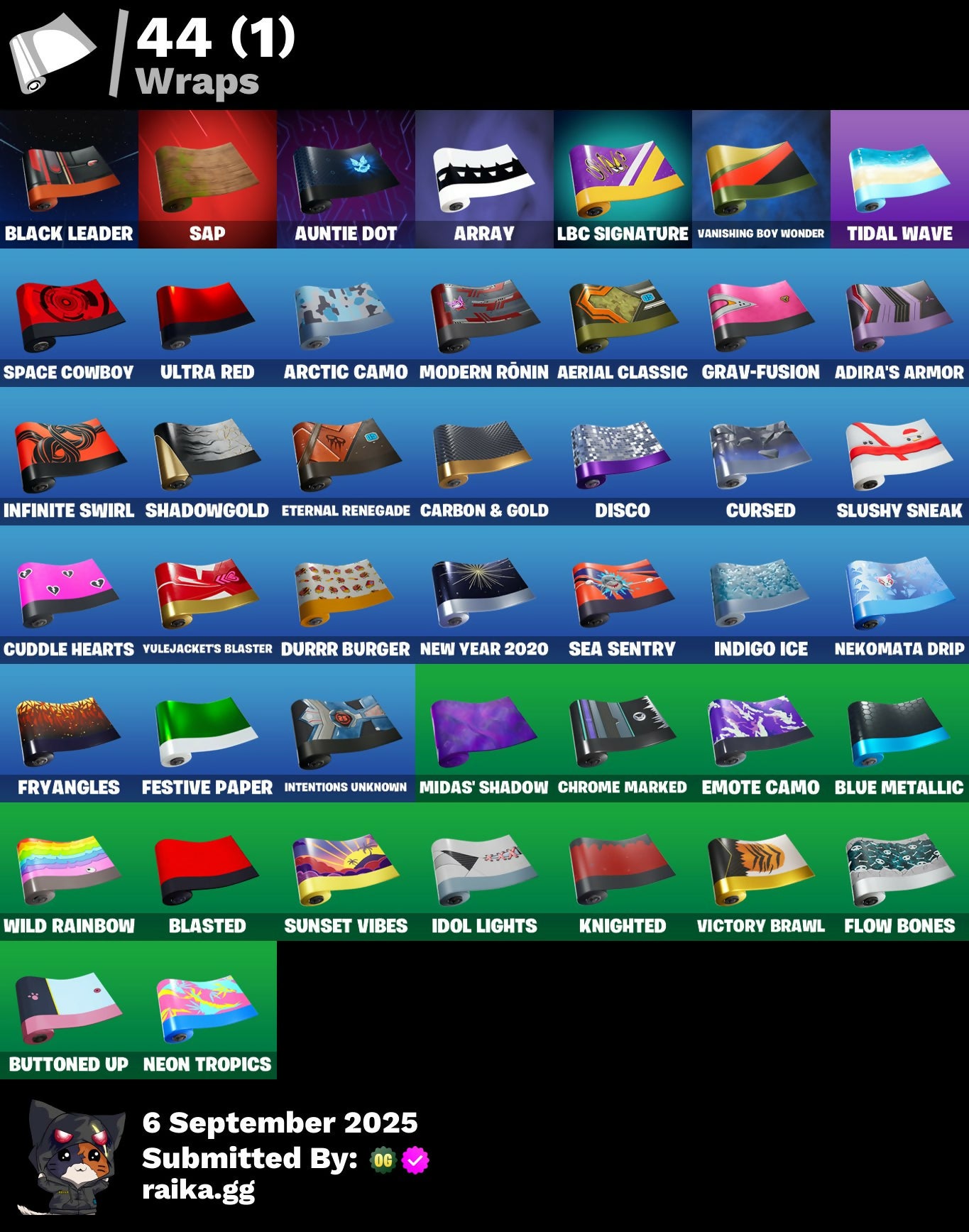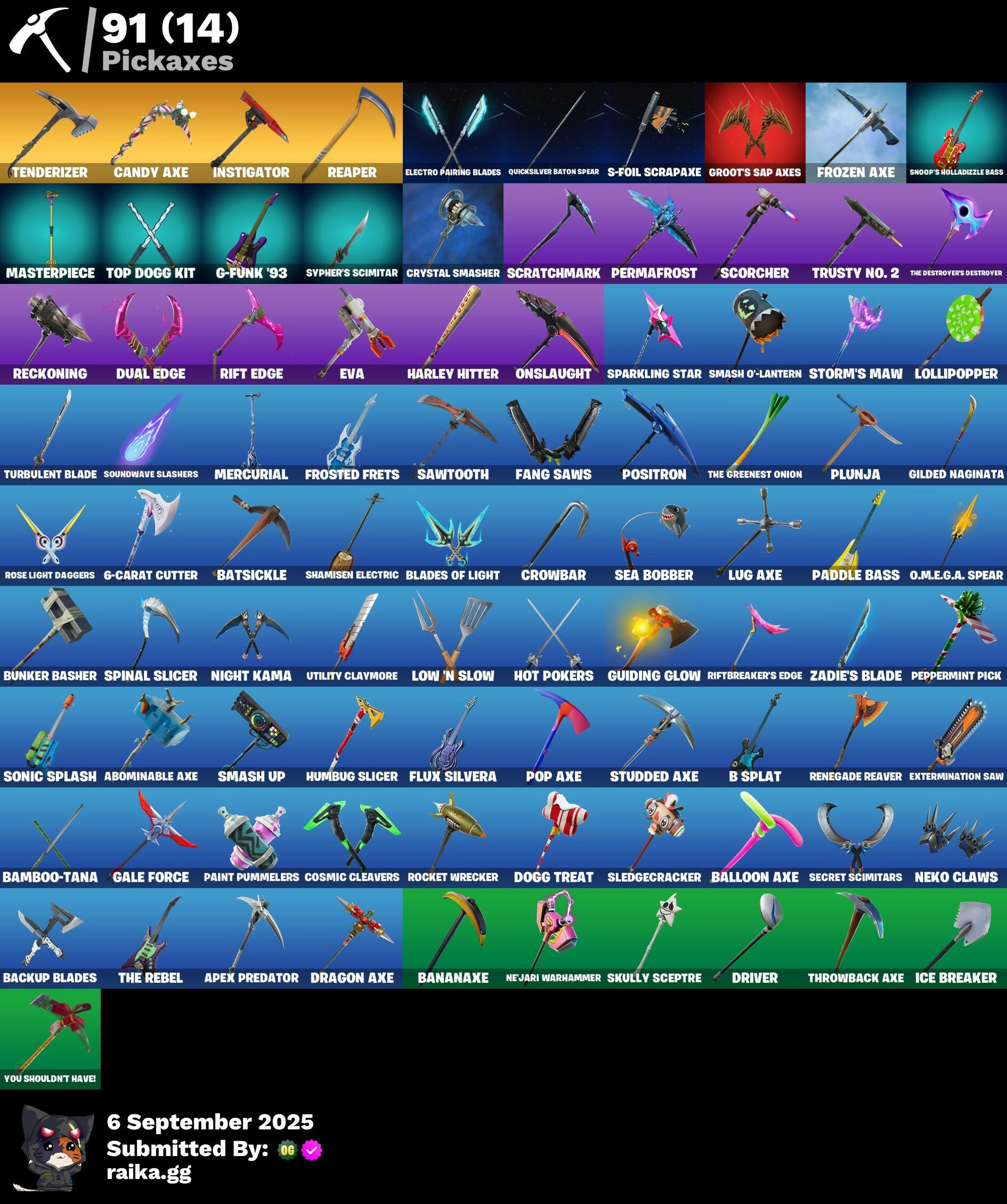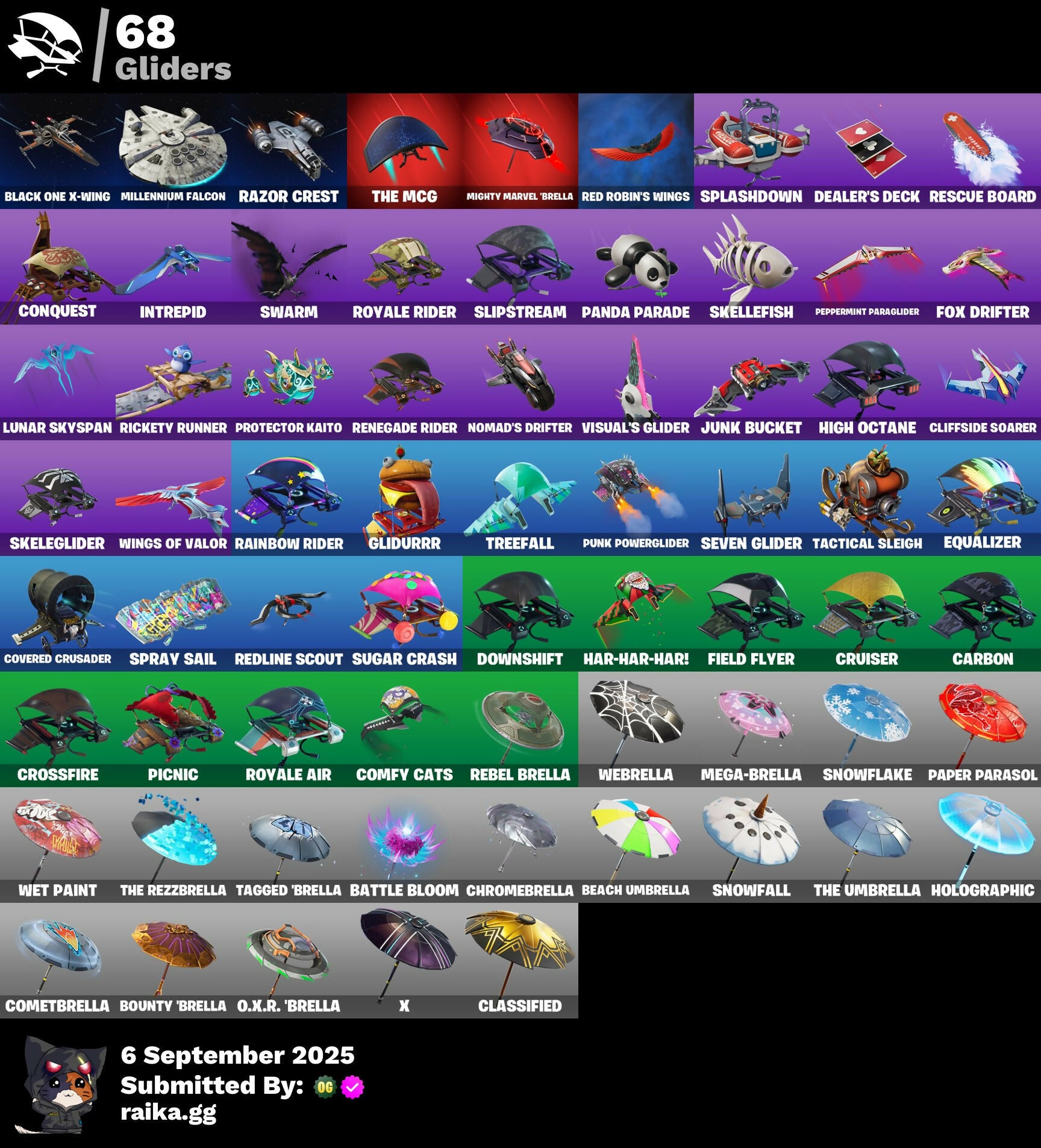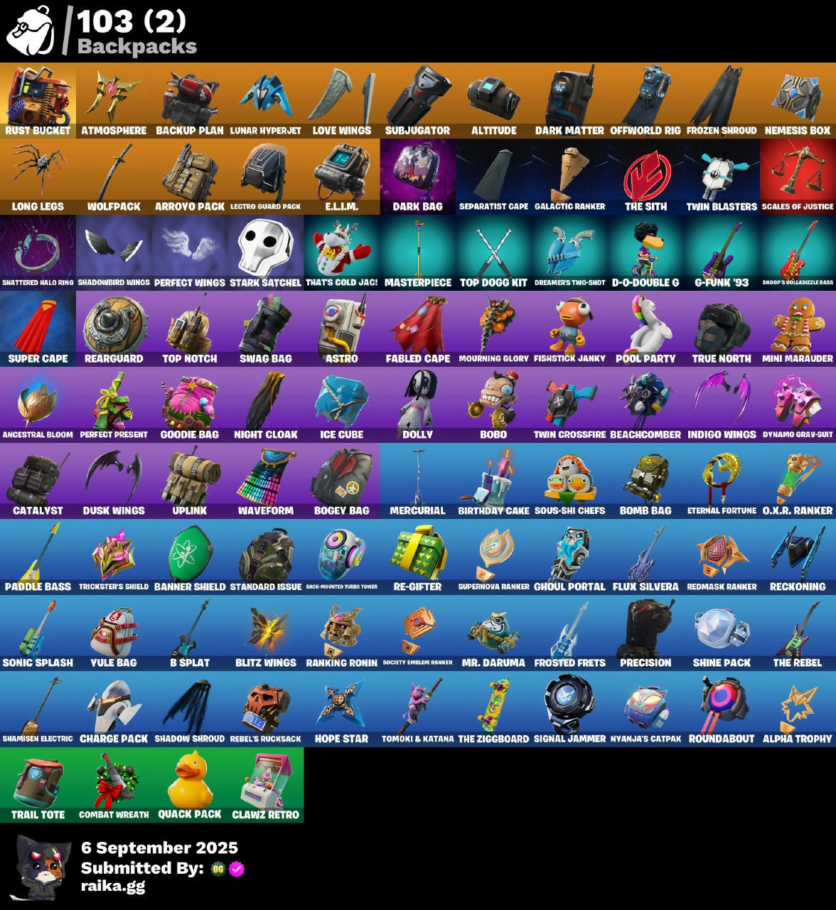A.I.M., Abominable Axe, Adira's Armor, Aerial Assault Bomber, Aerial Classic, Alpha Trophy, Altitude, Ancestral Bloom, Apex Predator, Arachne, Arctic Adeline, Arctic Camo, Array, Arroyo Pack, Astro, Atmosphere, Auntie Dot, B Splat, Back-Mounted Turbo Tower, Backup Blades, Backup Plan, Balloon Axe, Bamboo-Tana, Bananaxe, Banner Shield, Batsickle, Battle Bloom, Battlehawk, Beach Umbrella, Beachcomber, Best Mates, Bike To Go, Birthday Cake, Black Leader, Black One X-Wing, Blacklight, Blades of Light, Blasted, Blitz Wings, Blue Metallic, Bobo, Bogey Bag, Bomb Bag, Boogie Down, Boomin', Bounty 'Brella, Breakdown, Breaking Point, Breakpoint, Brush Your Shoulders, Buckets, Bunker Basher, Buttoned Up, Calamity, Calculated, Call Me, Candy Axe, Carbide, Carbon, Carbon & Gold, Cat Flip, Catalyst, Catrina, Charge Pack, Chrome Marked, Chromebrella, Classified, Clawz Retro, Cliffside Soarer, Combat Wreath, Cometbrella, Comfy Cats, Conquest, Cosmic Cleavers, Covered Crusader, Crossfire, Crowbar, Crowning Achievement, Cruiser, Crystal Smasher, Cuddle Hearts, Cursed, D-O-Double G, DJ Yonder, Dabstand, Dark Bag, Dark Bomber, Dark Matter, Dark Voyager, Dealer's Deck, Deep Dab, Diamond Diva, Dire, Disco, Dogg Treat, Dolly, Downshift, Dragon Axe, Dreamer's Two-Shot, Drift, Driver, Dual Edge, Durrr Burger, Durrr Taisho, Dusk, Dusk Wings, Dynamo Grav-Suit, E.L.I.M., Electro Pairing Blades, Elite Agent, Emote Camo, Enforcer, Equalizer, Eternal Fortune, Eternal Renegade, Eva, Extermination Saw, Fable, Fabled Cape, Fang Saws, Festive Paper, Field Flyer, Fishstick Janky, Fixer, Flamenco, Flippin' Away, Flow Bones, Flux Silvera, Fox Drifter, Freestylin', Frosted Frets, Frozen Axe, Frozen Shroud, Fryangles, G-Carat Cutter, G-Funk '93, Galactic Ranker, Gale Force, Gentleman's Dab, Get Funky, Ghoul Portal, Giddy-Up, Gilded Naginata, Glidurrr, Golf Clap, Good Sportsmanship, Goodie Bag, Grav-Fusion, Groot's Sap Axes, Groove Jam, Ground Pound, Guiding Glow, Har-Har-Har!, Harley Hitter, Havoc, Helichopper, High Octane, Holographic, Hope Star, Hot Marat, Hot Pokers, Humbug Slicer, Huntress, Hype, Hype!, Ice Breaker, Ice Cube, Idol Lights, Indigo Ice, Indigo Wings, Infinite Swirl, Instigator, Intentions Unknown, Intrepid, Invisible Cut, Iris, It's Go Time!, Jade, Jet Signals, Jumpshot, Junk Bucket, Kendo, Knighted, LBC '93 Dogg, LBC Signature, Lady of Cranes, Lectro Guard Pack, Lil' Godzilla Attack, Lil' Prancer, Lil' Tank, Lollipopper, Long Legs, Love Ranger, Love Wings, Low 'n Slow, Lt. Evergreen, Lug Axe, Lunar Hyperjet, Lunar Skyspan, Lynx, Mandalorian, Marsh Walk, Masterpiece, Mega-Brella, Mercurial, Merry Marauder, Mic Drop, Midas' Shadow, Mighty Marvel 'Brella, Millennium Falcon, Mini Marauder, Mission Specialist, Modern Ronin, Moongazer, Moonwalker, Mourning Glory, Mr. Daruma, Ne'Jari Warhammer, Neko Claws, Nekomata Drip, Nemesis Box, Neon Tropics, New Year 2020, Night Cloak, Night Kama, Nightshade, Nomad's Drifter, Nyanja, Nyanja's Catpak, O.M.E.G.A. Spear, O.X.R. 'Brella, O.X.R. Ranker, Offworld Rig, Omega, Onslaught, Orange Justice, Paddle Bass, Paint Pummellers, Panda Parade, Paper Parasol, Peppermint Paraglider, Peppermint Pick, Perfect Present, Perfect Shadow, Perfect Wings, Permafrost, Picnic, Plunja, Pony Up, Pool Party, Pop Axe, Popcorn, Positron, Powder, Precision, Protector Kaito, Punk Powerglider, Quack Pack, Quicksilver Baton Spear, Ragnarok, Rainbow Rider, Ranking Ronin, Raven Team Syd, Razor Crest, Re-Gifter, Reaper, Rearguard, Rebel Brella, Rebel's Rucksack, Reckoning, Red Robin's Wings, Redline, Redline Scout, Redmask Ranker, Reese, Regal Wave, Renegade Reaver, Renegade Rebel, Renegade Rider, Rescue Board, Respect, Respect The Peace, Revel, Rickety Runner, Ride The Pony, Rift Edge, Riftbreaker's Edge, Rock Paper Scissors, Rocket Wrecker, Rogue Agent, Rook, Rose Light Daggers, Roundabout, Royale Air, Royale Rider, Running Man, Rust Bucket, Rust Lord, S-Foil Scrapaxe, Salute, Santa Dogg, Sap, Sawtooth, Scales Of Justice, Scarlet Defender, Scorcher, Scratchmark, Sea Bobber, Sea Sentry, Secret Scimitars, Separatist Cape, Seven Glider, Sgt. Winter, Shadow Shroud, Shadow Skully, Shadowbird, Shadowbird Wings, Shadowgold, Shamisen Electric, Shamisen-Sational, Shattered Halo Ring, Shimmer, Shine Pack, Signal Jammer, Skele-Dance, Skeleglider, Skellefish, Skull Commander, Skully Sceptre, Sledgecracker, Sledgehammer, Slipstream, Slitherin', Slow Clap, Slushy Sneak, Smash O'-Lantern, Smash Up, Snoop's Holladizzle Bass, Snowfall, Snowflake, Snowshaker, Society Emblem Ranker, Sonic Splash, Soundwave Slashers, Sous-Shi Chefs, Space Cowboy, Sparkling Star, Spinal Slicer, Splashdown, Spray Sail, Squad Leader, Standard Issue, Stark Satchel, Storm's Maw, Studded Axe, Sub Commander, Subjugator, Sugar Crash, Summit Striker, Sun Strider, Sunset Vibes, Super Cape, Supernova Ranker, Swag Bag, Swarm, Swipe It, Sypher's Scimitar, Tactical Sleigh, Tagged 'Brella, Tagger's Groove, Take A 'Bow, Take The Elf, Take The L, Teknique, Tenderizer, That's Cold Jac!, The Ace, The Destroyer's Destroyer, The Greenest Onion, The Mcg, The Reaper, The Rebel, The Rezzbrella, The Robot, The Sith, The Umbrella, The Visitor, The Ziggboard, Throwback Axe, Tidal Wave, Tilted Teknique, Tomoki & Katana, Top Dogg Kit, Top Notch, Tra La La, Trail Tote, Trailblazer, Treefall, Trickster's Shield, Trog, True North, Trusty No. 2, Turbulent Blade, Twin Blasters, Twin Crossfire, Twist, Ultra Red, Uplink, Utility Claymore, Valor, Vanishing Boy Wonder, Victory Brawl, Visual's Glider, Vule Bag, Wave, Waveform, Webrella, Wet Paint, Wild Rainbow, Willow, Wingman, Wings Of Valor, Wolfpack, X, X-Lord, Yarn Ball, Yay!, You Shouldn't Have!, You're Awesome, Yulejacket, Yulejacket's Blaster, Zadie's Blade, Zenith, Zoey