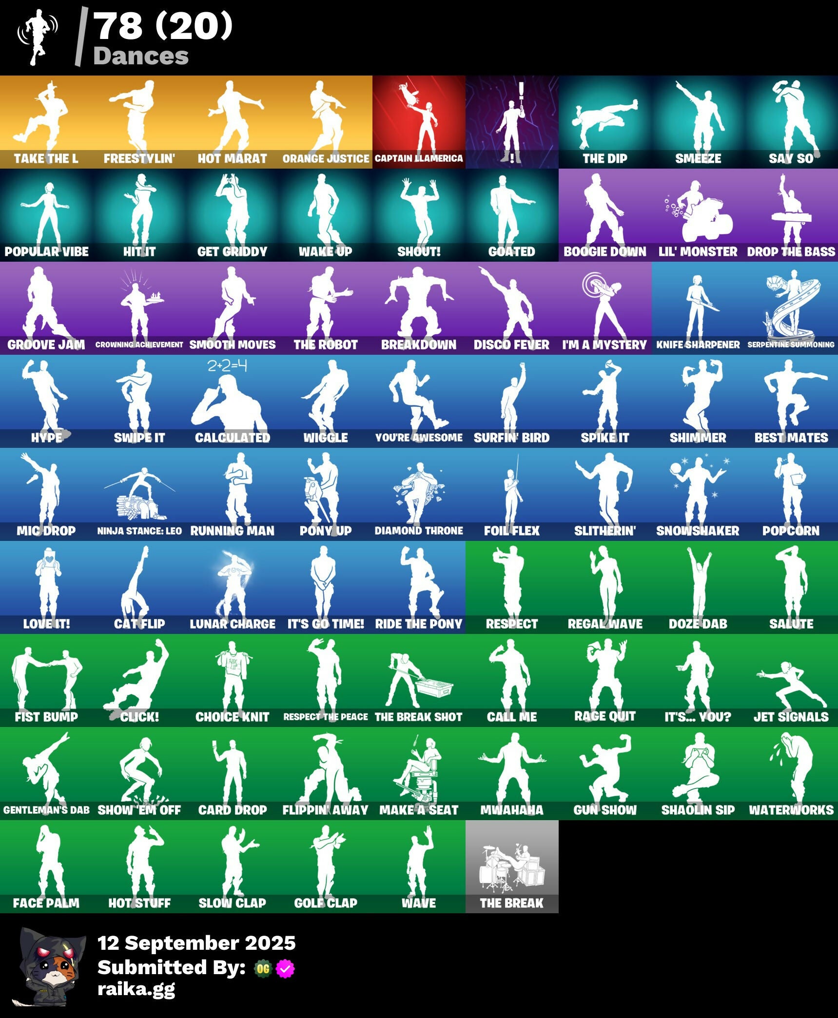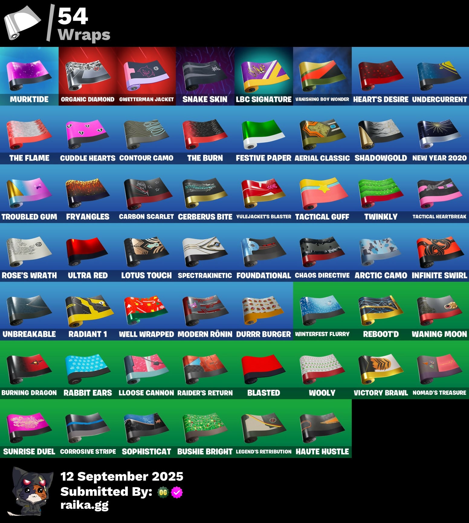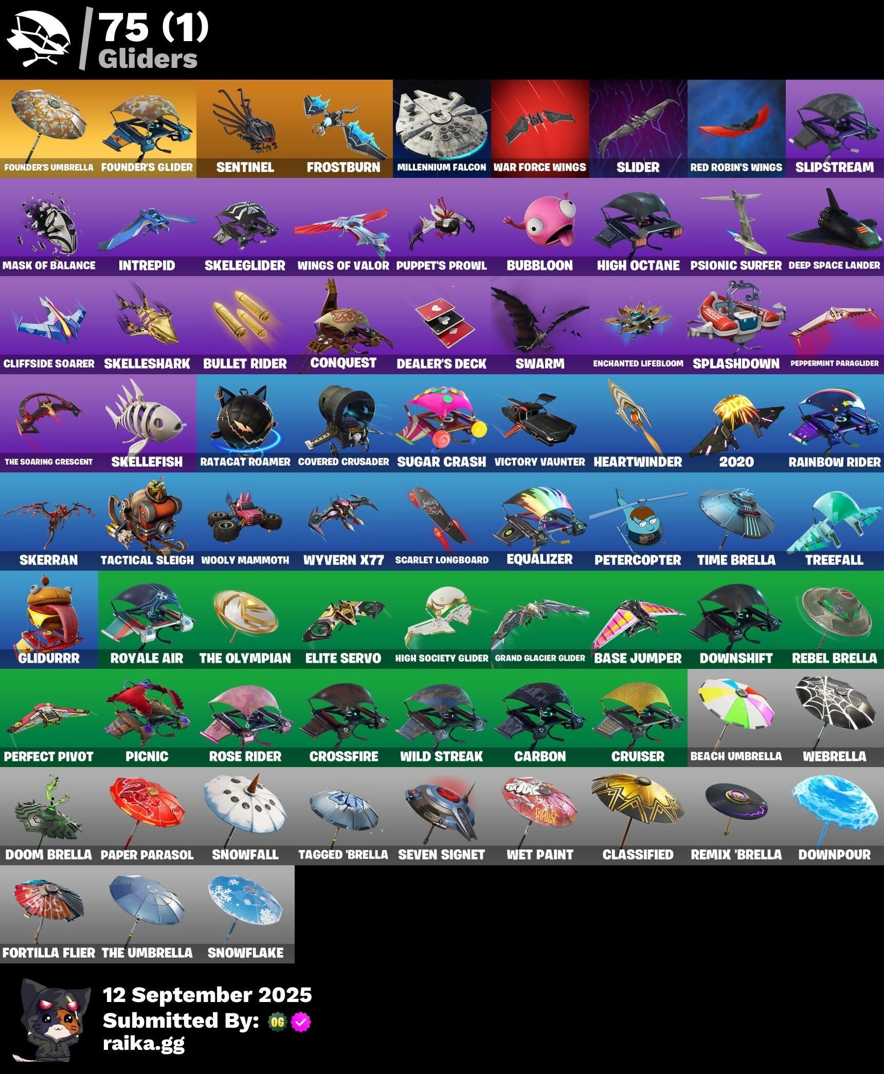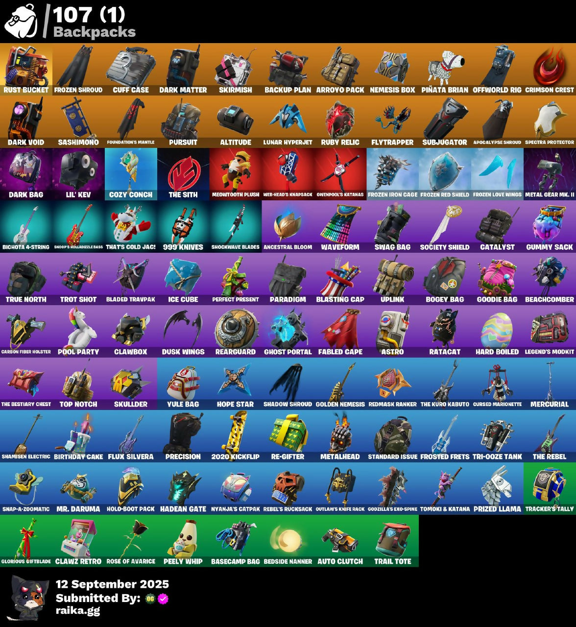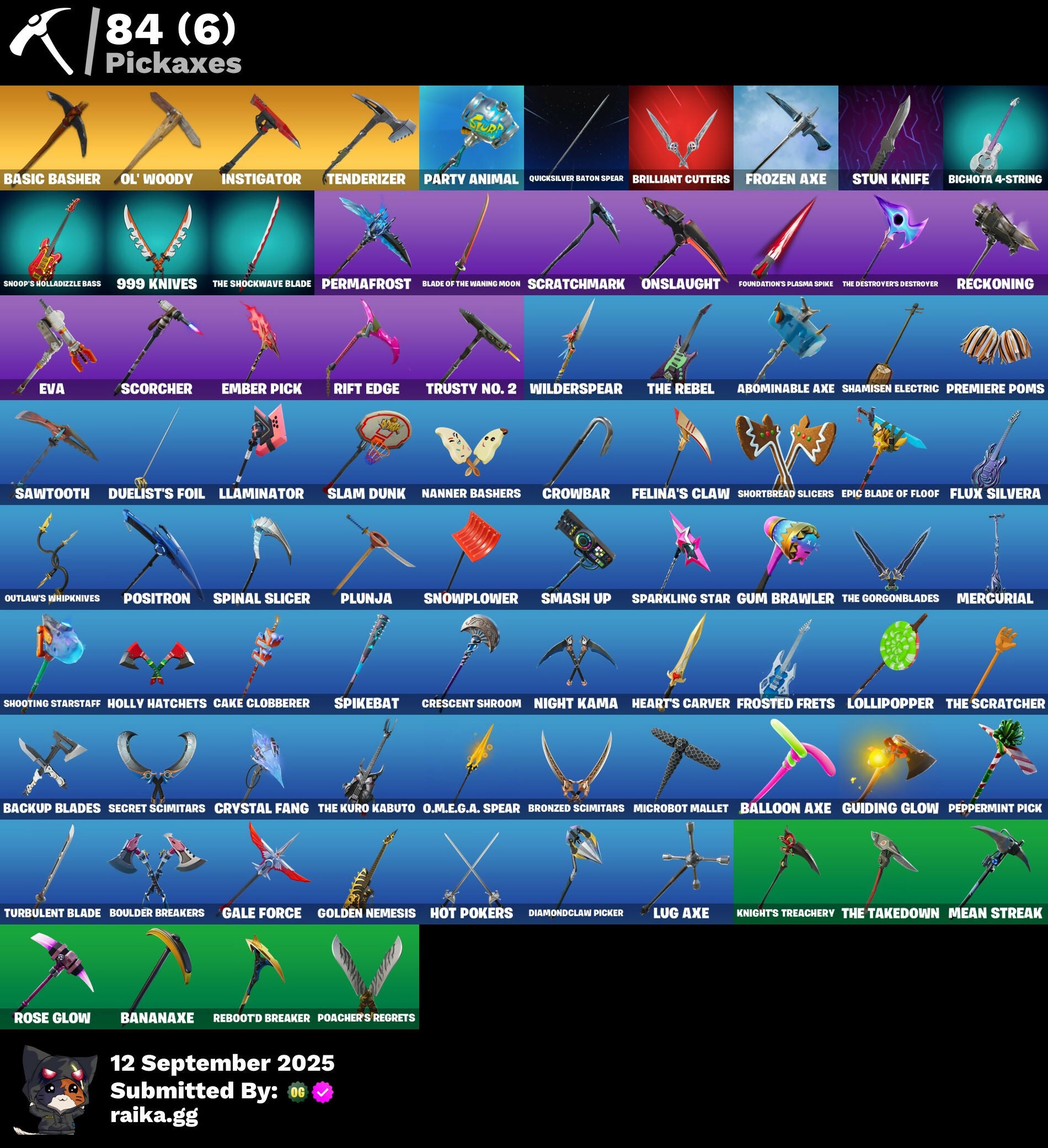 2020, 2020 Kickflip, 999 Knives, Abominable Axe, Aerial Classic, Altitude, Ancestral Bloom, Apocalypse Shroud, Archetype, Arctic Camo, Arroyo Pack, Astro, Auto Clutch, Backup Blades, Backup Plan, Balloon Axe, Bananaxe, Base Jumper, Basecamp Bag, Basic Basher, Battlehawk, Beach Umbrella, Beachcomber, Bedside Nanner, Best Mates, Bichota 4-String, Birthday Cake, Blade Of The Waning Moon, Bladed Travpak, Blasted, Blasting Cap, Bogey Bag, Boogie Down, Boulder Breakers, Breakdown, Brilliant Cutters, Bronzed Scimitars, Bubbloon, Bullet Rider, Burning Dragon, Bushie Bright, Cake Clobberer, Calamity, Calculated, Call Me, Captain Llamerica, Carbide, Carbon, Carbon Fiber Holster, Carbon Scarlet, Card Drop, Cat Flip, Catalyst, Cerberus Bite, Chaos Directive, Choice Knit, Classified, Clawbox, Clawz Retro, Click!, Cliffside Soarer, Conquest, Constructor, Contour Camo, Corrosive Stripe, Covered Crusader, Cozy Conch, Crescent Shroom, Crimson Crest, Crossfire, Crowbar, Crowning Achievement, Cruiser, Crystal Fang, Cuddle Hearts, Cuff Case, Cursed Marionette, DJ Yonder, Dark Bag, Dark Bomber, Dark Matter, Dark Vanguard, Dark Void, Dark Voyager, Dealer's Deck, Deep Space Lander, Diamond Throne, Diamondclaw Picker, Disco Fever, Doom Brella, Downpour, Downshift, Doze Dab, Drift, Drop The Bass, Duelist's Foil, Durrr Burger, Dusk, Dusk Wings, Elite Agent, Elite Servo, Ember Pick, Enchanted Lifebloom, Enforcer, Epic Blade Of Floof, Equalizer, Eva, Fable, Fabled Cape, Face Palm, Felina, Felina's Claw, Festive Paper, Fireworks Team Leader, Fist Bump, Flippin' Away, Flux Silvera, Flytrap, Flytrapper, Foil Flex, Fortilla Flier, Foundation's Mantle, Foundational, Foundations Plasma Spike, Founder's Glider, Founder's Umbrella, Freestylin', Frostburn, Frosted Frets, Frozen Axe, Frozen Iron Cage, Frozen Love Ranger, Frozen Love Wings, Frozen Raven, Frozen Red Knight, Frozen Red Shield, Frozen Shroud, Fryangles, Gale Force, Gentleman's Dab, Get Griddy, Getterman Jacket, Ghost Portal, Giddy-Up, Glidurrr, Glorious Giftblade, Goated, Godzilla's Exo-Spine, Golden Nemesis, Golf Clap, Goodie Bag, Grand Glacier Glider, Groove Jam, Guiding Glow, Gum Brawler, Gumbo, Gummy Sack, Gun Show, Gwenpool's Katanas, Hadean Gate, Hard Boiled, Harlowe, Haute Hustle, Haven, Havoc, Heart's Carver, Heart's Desire, Heartwinder, High Octane, High Society Glider, Hit It, Holiday Boxy, Holly Hatchets, Holo-Boot Pack, Hope, Hope Star, Hot Marat, Hot Pokers, Hot Stuff, Huntress, Hype, I'm A Mystery, Ice Cube, Infinite Swirl, Instigator, Intrepid, It's Go Time!, It's... You?, Jet Signals, Knife Sharpener, Knights Treachery, Krisabelle, Lbc Signature, Legend's Modkit, Legend's Retribution, Lil' Kev, Lil' Monster, Llaminator, Lloose Cannon, Lollipopper, Lotus Touch, Love It!, Lt. Evergreen, Lt. John Llama, Lug Axe, Lunar Charge, Lunar Hyperjet, Lynx, Make A Seat, Marshinobi, Mask of Balance, Mean Streak, Meowtooth Plush, Mercurial, Metal Gear Mk. II, Metalhead, Mic Drop, Microbot Mallet, Millennium Falcon, Mission Specialist, Modern Rōnin, Montague, Moonwalker, Mr. Daruma, Murktide, Musha, Mwahaha, Nanner Bashers, Nemesis Box, New Year 2020, Night Kama, Ninja Stance: Leo, Nisha, Nomad's Treasure, Nyanja's Catpak, O.M.E.G.A. Spear, Offworld Rig, Ol' Woody, Omega, Onslaught, Orange Justice, Organic Diamond, Oscar, Outlander, Outlaw's Knife Rack, Outlaw's Whipknives, Paper Parasol, Paradigm, Party Animal, Peely Whip, Peppermint Paraglider, Peppermint Pick, Perfect Pivot, Perfect Present, Permafrost, Peter Griffin, Petercopter, Picnic, Pinata Brian, Plunja, Poacher's Regrets, Polar Peely, Pony Up, Pool Party, Popcorn, Popular Vibe, Positron, Powder, Precision, Premiere Poms, Prized Llama, Psionic Surfer, Puppet's Prowl, Pursuit, Quicksilver Baton Spear, Rabbit Ears, Rabbit Raider, Radiant 1, Rage Quit, Ragnarok, Raider's Return, Rainbow Rider, Ratacat, Ratacat Roamer, Re-Gifter, Rearguard, Rebel Brella, Rebel's Rucksack, Reboot'd, Reboot'd Breaker, Reckoning, Red Robin's Wings, Redline, Redmask Ranker, Regal Wave, Remix 'Brella, Respect, Respect The Peace, Ride The Pony, Rift Edge, Rogue Agent, Ronin, Rook, Rose Glow, Rose Of Avarice, Rose Rider, Rose Team Leader, Rose's Wrath, Royale Air, Ruby Relic, Running Man, Runway Racer, Rust Bucket, Rust Lord, Salute, Sashimono, Sawtooth, Say So, Scarlet Longboard, Scorcher, Scratchmark, Secret Scimitars, Sentinel, Serpentine Summoning, Seven Signet, Sgt. Winter, Shadow Shroud, Shadowgold, Shamisen Electric, Shanta, Shaolin Sip, Shimmer, Shockwave Blades, Shooting Starstaff, Shortbread Slicers, Shout!, Show 'Em Off, Skeleglider, Skellefish, Skelleshark, Skerran, Skirmish, Skull, Skull Trooper, Skullder, Slam Dunk, Slayer Juice Wrld, Sledgehammer, Slider, Slipstream, Slitherin', Slow Clap, Smash Up, Smeeze, Smooth Moves, Snake Skin, Snap-A-Zoomatic, Snoop's Holladizze Bass, Snoop's Holladizzle Bass, Snowfall, Snowflake, Snowplower, Snowshaker, Society Shield, Soldier, Solid Snake, Sophisticat, Sparkling Star, Spectra Protector, Spectrakinetic, Spider-Man, Spike It, Spikebat, Spinal Slicer, Splashdown, Squad Leader, Standard Issue, Steel Wool, Strong Guard, Stun Knife, Sub Commander, Subjugator, Sugar Crash, Summit Striker, Sun Strider, Sunrise Duel, Surfin' Bird, Swag Bag, Swarm, Swipe It, Tactical Guff, Tactical Heartbreak, Tactical Sleigh, Tagged 'Brella, Take The L, Teknique, Tenderizer, That's Cold Jac!, The Ace, The Bestiary Chest, The Break, The Break Shot, The Burn, The Destroyer's Destroyer, The Dip, The Flame, The Foundation, The Gorgonblades, The Kuro Kabuto, The Olympian, The Reaper, The Rebel, The Robot, The Scratcher, The Shockwave Blade, The Sith, The Soaring Crescent, The Takedown, The Umbrella, The Visitor, Time Brella, Tomoki & Katana, Top Notch, Tracker's Tally, Trail Tote, Trailblazer, Treefall, Tri-Ooze Tank, Triple Threat, Trot Shot, Troubled Gum, True North, Trusty No. 2, Turbulent Blade, Twinkly, Ultra Red, Unbreakable, Undercurrent, Uplink, Valeria, Valor, Vanishing Boy Wonder, Vengeance Jon