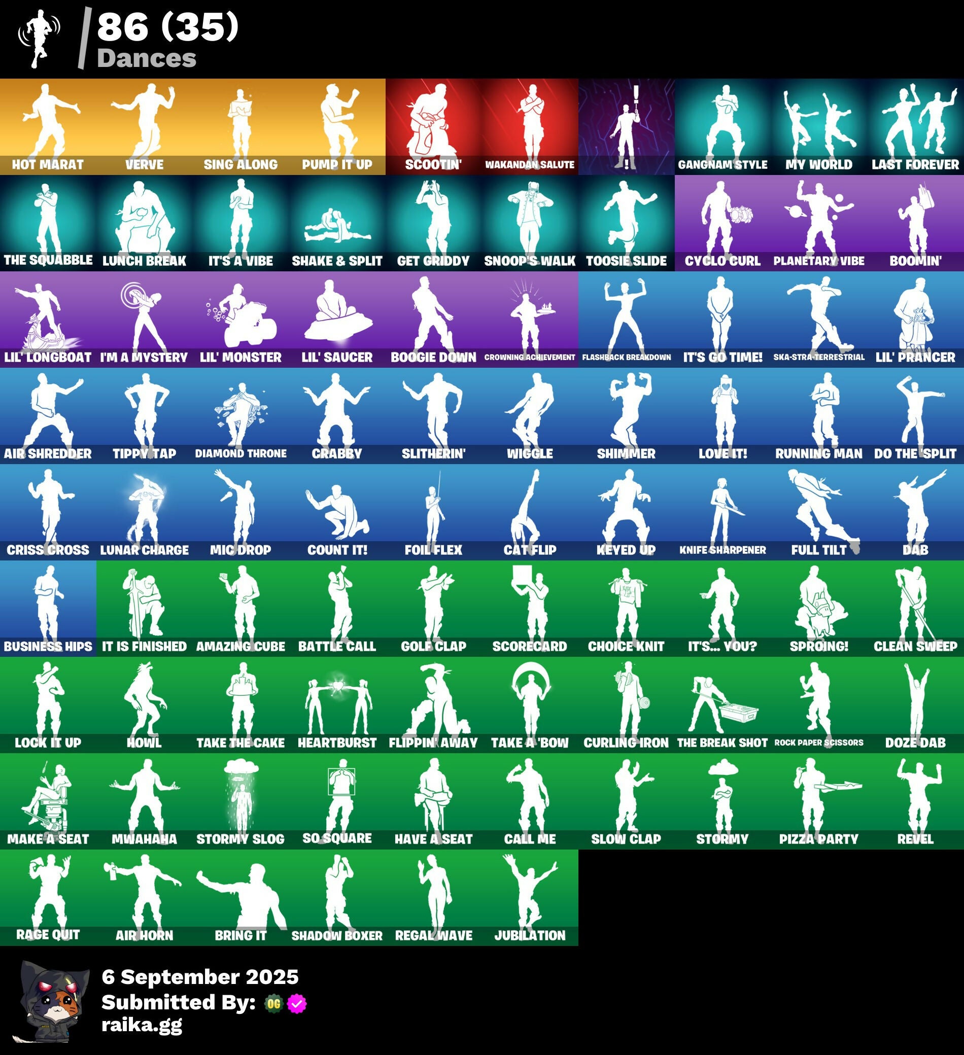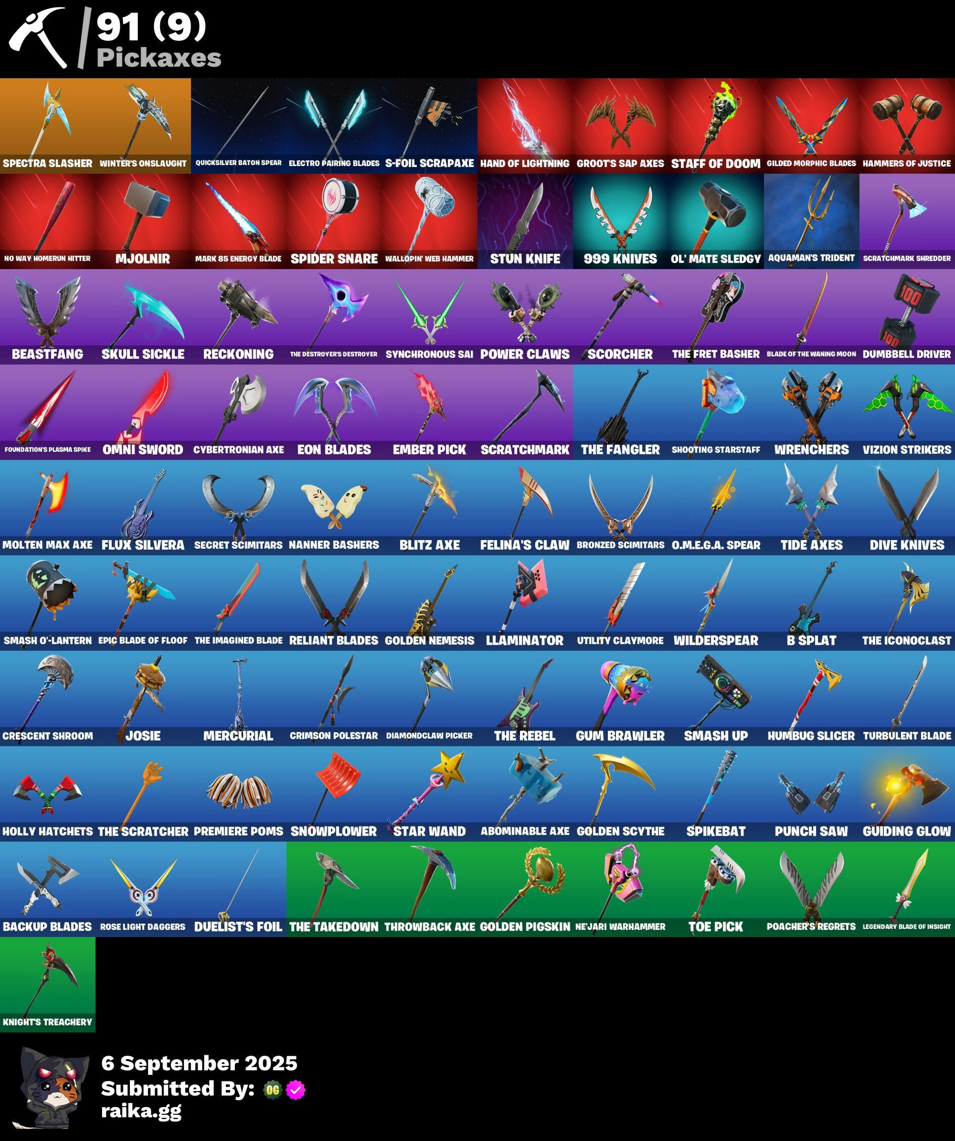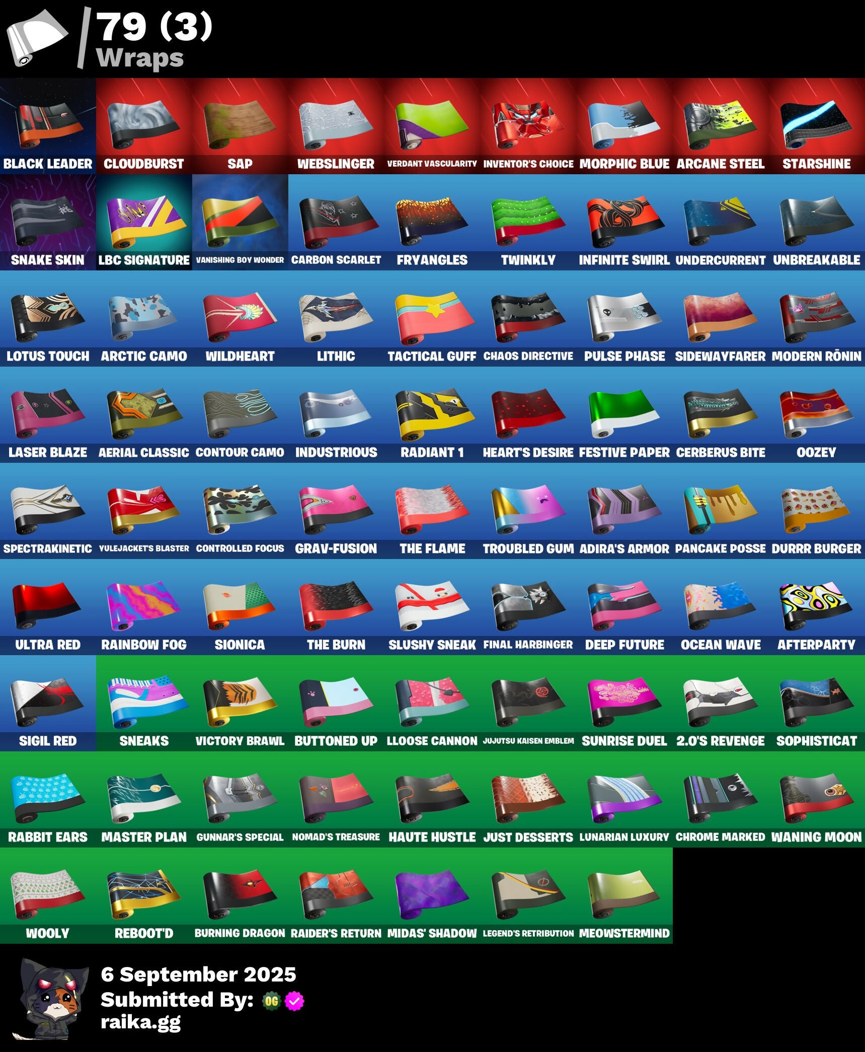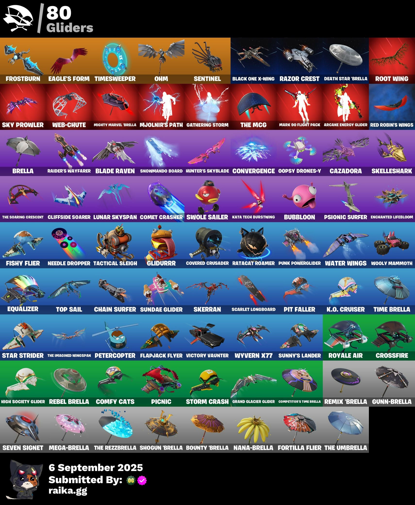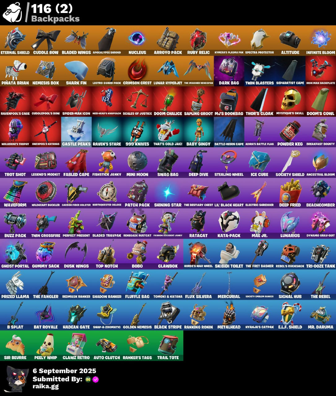 2.0's Revenge, 999 Knives, Abominable Axe, Adira's Armor, Adira's Battle Flag, Aerial Classic, Afterparty, Air Horn, Air Shredder, Altitude, Amazing Cube, Ancestral Bloom, Apocalypse Shroud, Aquaman's Trident, Arcane Energy Glider, Arcane Steel, Arctic Camo, Arroyo Pack, Astra, Auto Clutch, B Splat, Baby Gingy, Backup Blades, Bat Royale, Batman Zero, Battle Call, Battle-Worn Cape, Beachcomber, Beastfang, Beef Boss, Black Leader, Black One X-Wing, Black Stripe, Blade Raven, Blade of the Waning Moon, Bladed Travpak, Bladed Wings, Blitz Axe, Bobo, Boogie Down, Boomin', Bounty 'Brella, Breakfast Bounty, Brella, Bring It, Bronzed Scimitars, Bubbloon, Burning Dragon, Business Hips, Buttoned Up, Buzz Pack, Calamity, Call Me, Carbon Fiber Holster, Carbon Scarlet, Castle Peaks, Cat Flip, Cazadora, Cerberus Bite, Chain Surfer, Chaos Directive, Choice Knit, Chomp Sr., Chrome Marked, Clawbox, Clawz Retro, Clean Sweep, Cliffside Soarer, Cloudburst, Codename E.L.F., Comet Crasher, Comfy Cats, Competitor's Time Brella, Contour Camo, Controlled Focus, Convergence, Count It!, Covered Crusader, Crabby, Crescent Shroom, Crimson Crest, Crimson Polestar, Criss Cross, Crossfire, Crowning Achievement, Cuddle Bow, Cuddle Team Leader, Cuddlepool, Cuddlepools Bow, Curling Iron, Cybertronian Axe, Cyclo Curl, DJ Yonder, Dab, Dark Bag, Dark Bomber, Death Star 'Brella, Deep Dive, Deep Fried, Deep Future, Diamond Throne, Diamondclaw Picker, Dive Knives, Do The 'Split, Doctor Doom, Doom Chalice, Doom's Cowl, Doze Dab, Duelist's Foil, Dumbbell Driver, Durrr Burger, Dusk, Dusk Wings, Dynamo Grav-Suit, E.L.F. Shield, Eagle's Form, Electric Shredder, Electro Pairing Blades, Ember Pick, Enchanted Lifebloom, Eon Blades, Epic Blade of Floof, Equalizer, Eternal Knight, Eternal Shield, Fable, Fabled Cape, Fade, Fashion Accident Janky, Felina, Felina's Claw, Festive Paper, Final Harbinger, Fishstick Janky, Fishy Flier, Flapjack Flyer, Flashback Breakdown, Flippin' Away, Fluffle Bag, Flux Silvera, Foil Flex, Fortilla Flier, Foundation's Plasma Spike, Frostburn, Frozen Fishstick, Frozen Nog Ops, Fryangles, Full Tilt, Galaxy Scout, Gangnam Style, Gathering Storm, Get Griddy, Ghost Portal, Giddy-Up, Gilded Morphic Blades, Glidurr, Golden Nemesis, Golden Pigskin, Golden Scythe, Golf Clap, Grand Glacier Glider, Grav-Fusion, Groot, Groot's Sap Axes, Guff, Guiding Glow, Gum Brawler, Gumbo, Gummy Sack, Gunn-Brella, Gunnar, Gunnar's Special, Gwenpool's Katanas, Hadean Gate, Hammers of Justice, Hand of Lightning, Harlowe, Haute Hustle, Have A Seat, Haven, Heart's Desire, Heartburst, High Society Glider, Holly Hatchets, Hope, Horde's War Wheel, Hot Marat, Howl, Humbug Slicer, Hunter's Skyblade, Hush, I'm A Mystery, Ice Cube, Industrious, Infinite Bloom, Infinite Swirl, Inventor's Choice, Iron Man Backplate, It Is Finished, It's A Vibe, It's Go Time!, It's... You?, Jennifer Walters, Jonesy The First, Josie, Jubilation, Jujutsu Kaisen Emblem, Jules, Just Desserts, K.O. Cruiser, Kata Tech Burstwing, Kata-Pack, Keyed Up, Kit, Knife Sharpener, Knight's Treachery, Krisabelle, Kymera, Kymera's Plasma Pak, LBC Signature, Laser Blaze, Last Forever, Lazarbeam, Lectro Guard Pack, Legend's Modkit, Legend's Retribution, Legendary Blade of Insight, Lil Split, Lil' Black Heart, Lil' Longboat, Lil' Monster, Lil' Prancer, Lil' Saucer, Lithic, Llaminator, Lock It Up, Loose Cannon, Lotus Touch, Love It!, Lt. John Llama, Lunar Charge, Lunar Hyperjet, Lunar Skyspan, Lunarian Luxury, Lunarios, Lunch Break, Lynx, MJ (No Way Home), MJ's Bookbag, Mae Jr., Make A Seat, Mancake, Mandalorian, Mark 85 Energy Blade, Mark 90 Flight Pack, Marshall Never More, Master Plan, Mave, Mega-Brella, Meowstermind, Mercurial, Metalhead, Mic Drop, Midas' Shadow, Mighty Marvel 'Brella, Mini Moon, Mjolnir, Mjolnir's Path, Modern Rōnin, Molten Max Axe, Montague, Morphic Blue, Mr. Daruma, Mwahaha, My World, Mystique, Mystique's Skull, Nana-Brella, Nanner Bashers, Ne'Jari Warhammer, Needle Dropper, Nemesis Box, Nisha, No Way Homerun Hitter, Nog Ops, Nomad's Treasure, Northquester Deluxe, Nucleus, Nyanja's Catpak, O.M.E.G.A. Spear, Ocean, Ocean Wave, Ohm, Ol' Mate Sledgy, Omegarok, Omni Sword, Oopsy Drones-V, Oozey, Oscar, Pancake Posse, Patch Pack, Peely Whip, Perfect Present, Peter Griffin, Petercopter, Picnic, Pit Faller, Pizza Party, Piñata Brian, Planetary Vibe, Poacher's Regrets, Polar Peely, Polarity, Powder, Powder Keg, Power Claws, Premiere Poms, Prized Llama, Psionic Surfer, Pulse Phase, Pump It Up, Punch Saw, Punk Powerglider, Quicksilver Baton Spear, Rabbit Ears, Radiant 1, Rage Quit, Raider's Return, Raider's Wayfarer, Rainbow Fog, Ranker's Tags, Ranking Ronin, Ratacat, Ratacat Roamer, Raven's Stare, Ravenpool, Ravenpool's Cage, Razor Crest, Rebel Brella, Rebel's Rucksack, Reboot'd, Reckoning, Red Robin's Wings, Redmask Ranker, Reese, Regal Wave, Reliant Blades, Remix 'Brella, Renegade Lynx, Renegade Rustcat, Revel, Rock Paper Scissors, Ronin, Root Wing, Rose Light Daggers, Royale Air, Ruby Relic, Running Man, Runway Racer, S-Foil Scrapaxe, Sap, Sapling Groot, Scales Of Justice, Scarlet Longboard, Scootin', Scorcher, Scorecard, Scratchmark, Scratchmark Shredder, Scuba Jonesy, Secret Scimitars, Sentinel, Separatist Cape, Seven Signet, Sgt. Winter, Shadow Boxer, Shadow Ranker, Shake & Split, Shanta, Shark Fin, Shimmer, Shining Star, Shogun, Shogun 'Brella, Shooting Starstaff, Sidewayfarer, Sigil Red, Signal Hub, Sing Along, Siona, Sionica, Sir Beurre, Ska-stra-terrestrial, Skelleshark, Skerran, Skibidi Toilet, Skull Sickle, Skull Trooper, Sky Prowler, Slayer Juice Wrld, Slitherin', Slow Clap, Slushy Sneak, Smash O'-Lantern, Smash Up, Snake Skin, Snap-A-Zoomatic, Sneaks, Snoop's Walk, Snowmando Board, Snowplower, So Square, Society Emblem Ranker, Society Shield, Solid Snake, Sophisticat, Spectra Knight, Spectra Protector, Spectra Slasher, Spectrakinetic, Spider Snare, Spider-Man, Spider-Man (No Way Home), Spider-Man Icon, Spikebat, Sproing!, Staff of Doom, Star Strider, Star Wa