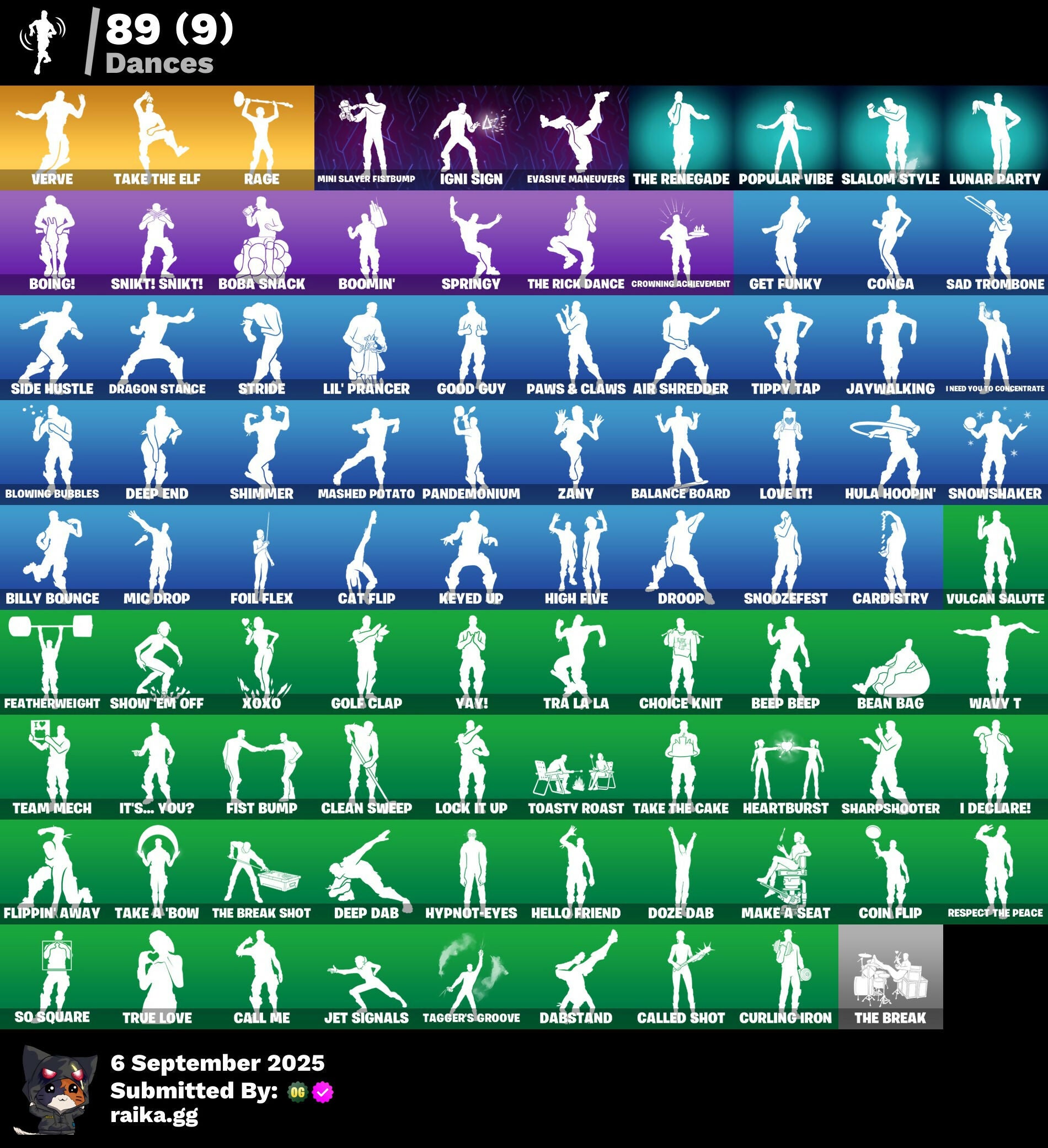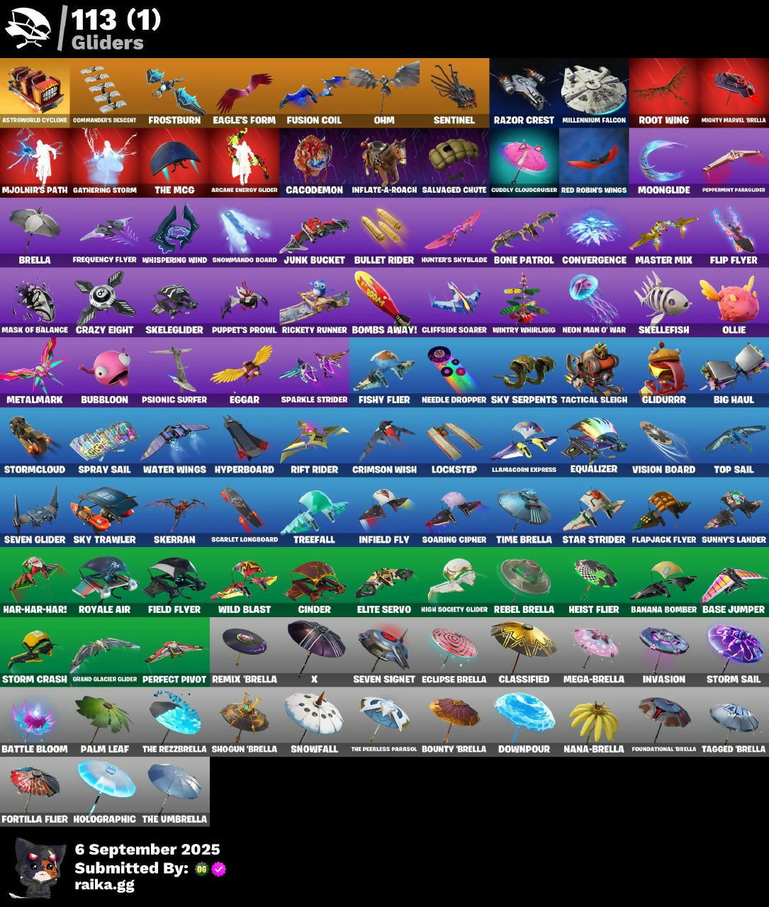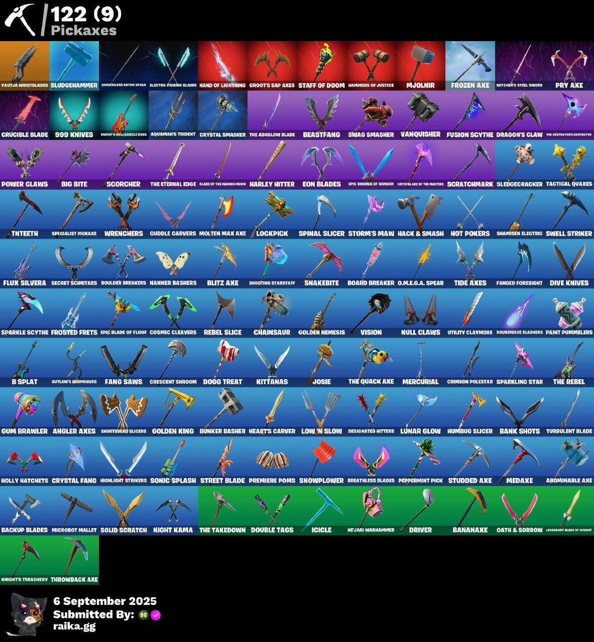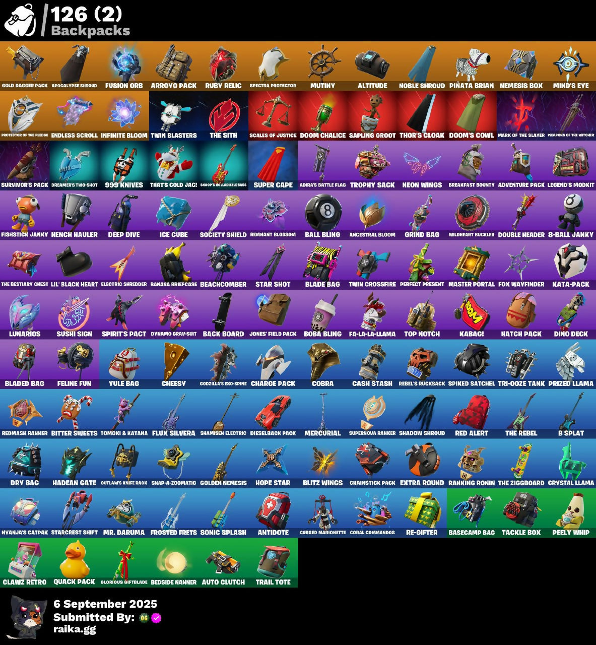 8 Splat, 8-Ball, 8-Ball Janky, 8-Ball Vs Scratch, 999 Knives, Abominable Axe, Acolyte's Curse, Adira's Armor, Adira's Battle Flag, Adventure Pack, Aerial Classic, Afterparty, Agent Jones, Agent Peely, Air Shredder, Altitude, Ancestral Bloom, Angler Axes, Antidote, Apocalypse Shroud, Aquaman's Trident, Arcane Energy Glider, Arcane Steel, Arctic Adeline, Arctic Camo, Arroyo Pack, Astroworld Cyclone, Aura, Auto Clutch, B Splat, Back Board, Backup Blades, Balance Board, Ball Bling, Banana Bomber, Banana Briefcase, Bananaxe, Bank Shots, Base Jumper, Basecamp Bag, Battle Bloom, Beachcomber, Bean Bag, Beastfang, Bedside Nanner, Beep Beep, Big Bite, Big Haul, Billy Bounce, Birdie, Bitter Sweets, Blackheart, Blade Bag, Blade of the Waning Moon, Bladed Bag, Blasted, Blitz Axe, Blitz Wings, Blowing Bubbles, Board Breaker, Boba Bling, Boba Snack, Boing!, Bombs Away!, Bone Patrol, Boomin', Boulder Breakers, Bounty Brella, Breakfast Bounty, Breathless Blades, Brella, Bruteball, Brutus, Bubbloon, Bullet Rider, Bunker Basher, Burning Dragon, Burnoff, Bushie Bright, Cacodemon, Calico, Call Me, Called Shot, Cameo, Cameo Vs Chic, Carbon & Gold, Carbon Scarlet, Cardistry, Cash Stash, Cat Flip, Catalyst, Cerberus Bite, Chainsaur, Chainstick Pack, Chaos Directive, Charge Pack, Cheesy, Chic, Choice Knit, Cinder, Classified, Clawz Retro, Clean Sweep, Cliffside Soarer, Cloudburst, Cobra, Coin Flip, Commander’s Descent, Conga, Contour Camo, Controlled Focus, Convergence, Coral Commandos, Cosmic Cleavers, Crazy Eight, Crescent Shroom, Crimson Polestar, Crimson Wish, Crowning Achievement, Crucible Blade, Crystal Axe of the Masters, Crystal Fang, Crystal Llama, Crystal Smasher, Cuddle Carvers, Cuddly Cloudcruiser, Curling Iron, Cursed, Cursed Marionette, Dabstand, Deadpool, Deep Dab, Deep Dive, Deep End, Denim Destiny, Designated Hitters, Dieselback Pack, Dino Deck, Disco, Dive Knives, Dizzie, Dj Pepperoni, Doctor Doom, Dogg Treat, Doom Chalice, Doom Slayer, Doom's Cowl, Double Header, Double Tags, Downpour, Doze Dab, Dragon Stance, Dragon's Claw, Dreamer's Two-Shot, Driftwood, Driver, Droop, Dry Bag, Durrr Burger, Dusty, Dynamo Grav-Suit, EQ, Eagle’s Form, Eclipse Brella, Eggar, Electric Shredder, Electro Pairing Blades, Elite Servo, Emote Camo, Endless Scroll, Eon Blades, Epic Blade of Floof, Epic Swords of Wonder, Equalizer, Escapees, Evasive Maneuvers, Exile's Emblem, Extra Round, Fa-La-La-Llama, Fade, Falling Leaf, Fang Saws, Fanged Foresight, Featherweight, Feline Fun, Festive Paper, Field Flyer, Fiend, Fishstick Janky, Fishy Flier, Fist Bump, Flapjack Flyer, Flip Flyer, Flippin' Away, Flux Silvera, Foil Flex, Fortilla Flier, Foundational Brella, Fox Wayfinder, Frequency Flyer, Frostburn, Frosted, Frosted Frets, Frozen Axe, Fryangles, Fusion, Fusion Coil, Fusion Orb, Fusion Scythe, Gathering Storm, Gear Specialist Maya, Geralt Of Rivia, Get Funky, Gila Classic, Gingerbread Raider, Glidurrr, Glorious Giftblade, Godzilla's Exo-Spine, Gold Dagger Pack, Gold Midas, Golden King, Golden Nemesis, Golf Clap, Good Guy, Grand Glacier Glider, Grav-Fusion, Greed, Grind Bag, Gringle Gift, Groot, Groots Sap Axes, Guff Gringle, Guild, Gum Brawler, Gunnar's Special, Hack & Smash, Hadean Gate, Hammers of Justice, Hand of Lightning, Har-Har-Har!, Harley Hitter, Hatch Pack, Haute Hustle, Heart's Carver, Heart's Desire, Heartburst, Heist Flier, Hello Friend, Helsie, Hench, Hench Hauler, High Five, High Society Glider, Highlight Strikers, Highrise Assault Trooper, Holiday Boxy, Holly Hatchets, Holographic, Hope Star, Hot Pokers, Hula Hoopin', Humbug Slicer, Hunter Purple, Hunter’s Skyblade, Hybrid, Hyperboard, Hypnot-Eyes, I Declare!, I Need You to Concentrate, Ice Cube, Icicle, Igni Sign, Imagined Edge, Indigo Ice, Industrious, Infield Fly, Infinite Bloom, Infinite Swirl, Inflate-A-Roach, Intentions Unknown, Invasion, It's... You?, Jaywalking, Jennifer Walters, Jet Signals, Jones' Field Pack, Josie, Journey Vs Hazard, Jules, Junk Bucket, Jurassically Charged, Kabag!, Kata-Pack, Kevin, Keyed Up, Kit, Kittanas, Knight's Treachery, Knighted, Kondor, Krisabelle, LBC Signature, Lara Croft, Legend's Modkit, Legendary Blade of Insight, Lexa, Lil' Black Heart, Lil' Prancer, Lithic, Llamacorn Express, Lock It Up, Lockpick, Lockstep, Love It!, Low 'N Slow, Lt. Evergreen, Lunar Glow, Lunar Party, Lunarian Luxury, Lunarios, Lynx, Make a Seat, Mancake, Mandalorian, Mark of the Slayer, Mashed Potato, Mask Of Balance, Massai, Massai Fire, Master Mix, Master Portal, Mave, Medaxe, Mega-Brella, Meowscles, Meowstermind, Mercurial, Metalmark, Mic Drop, Microbot Mallet, Midas Memory, Midfield Maestro, Mighty Marvel Brella, Millennium Falcon, Mind's Eye, Mini Slayer Fistbump, Mjolnir, Mjolnir’s Path, Modern Ronin, Molten Max Axe, Moonglide, Mr. Daruma, Mutiny, Nana-Brella, Nanner Bashers, Ne'Jari Warhammer, Needle Dropper, Nemesis Box, Neon Man O’ War, Neon Tendrils, Neon Tropics, Neon Wings, New Year 2020, Nezumi, Night Kama, Nitelite, Noble Shroud, Nog Ops, Null Claws, Nyanja's Catpak, O.M.E.G.A. Spear, Oath & Sorrow, Ocean, Ocean Wave, Ohm, Ollie, Onesie, Oozev, Outlaw's Knife Rack, Outlaw's Whipknives, Paint Pummelers, Palm Leaf, Pancake Posse, Pandemonium, Paws & Claws, Peely, Peely Whip, Peppermint Paraglider, Peppermint Pick, Perfect Pivot, Perfect Present, Piñata Brian, Polar Peely, Popular Vibe, Powder, Power Claws, Praetor Shroud, Predator, Premiere Poms, Prized Llama, Protector of the Pledge, Pry Axe, Psionic Surfer, Puppet’s Prowl, Quack Pack, Quicksilver Baton Spear, Radiant 1, Rage, Raider's Return, Rainbow Fog, Ranking Ronin, Raz, Razor Crest, Re-Gifter, Rebel Brella, Rebel Slice, Rebel's Rucksack, Reboot'd, Red Alert, Red Robin’s Wings, Red Strike, Redmask Ranker, Reese, Remedy Vs Toxin, Remix Brella, Remnant Blossom, Respect the Peace, Rickety Runner, Rift Rider, Ripplex, Rippley Vs Sludge, Riptide, Rogue Gunner, Root Wing, Rose's Wrath, Royale Air, Ruby, Ruby Relic, Runway Racer, Sad Trombone, Salvaged Chute, Santa Dog