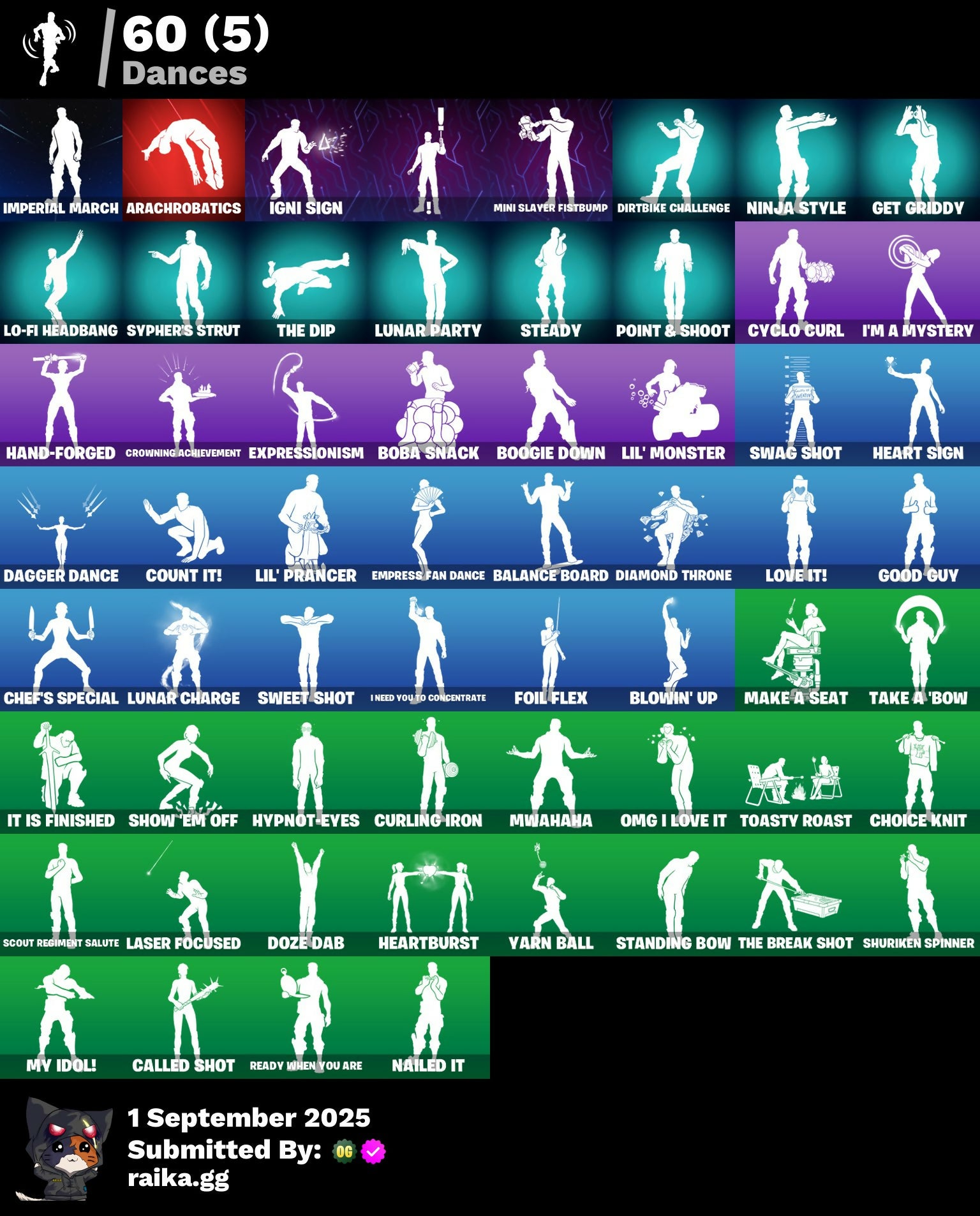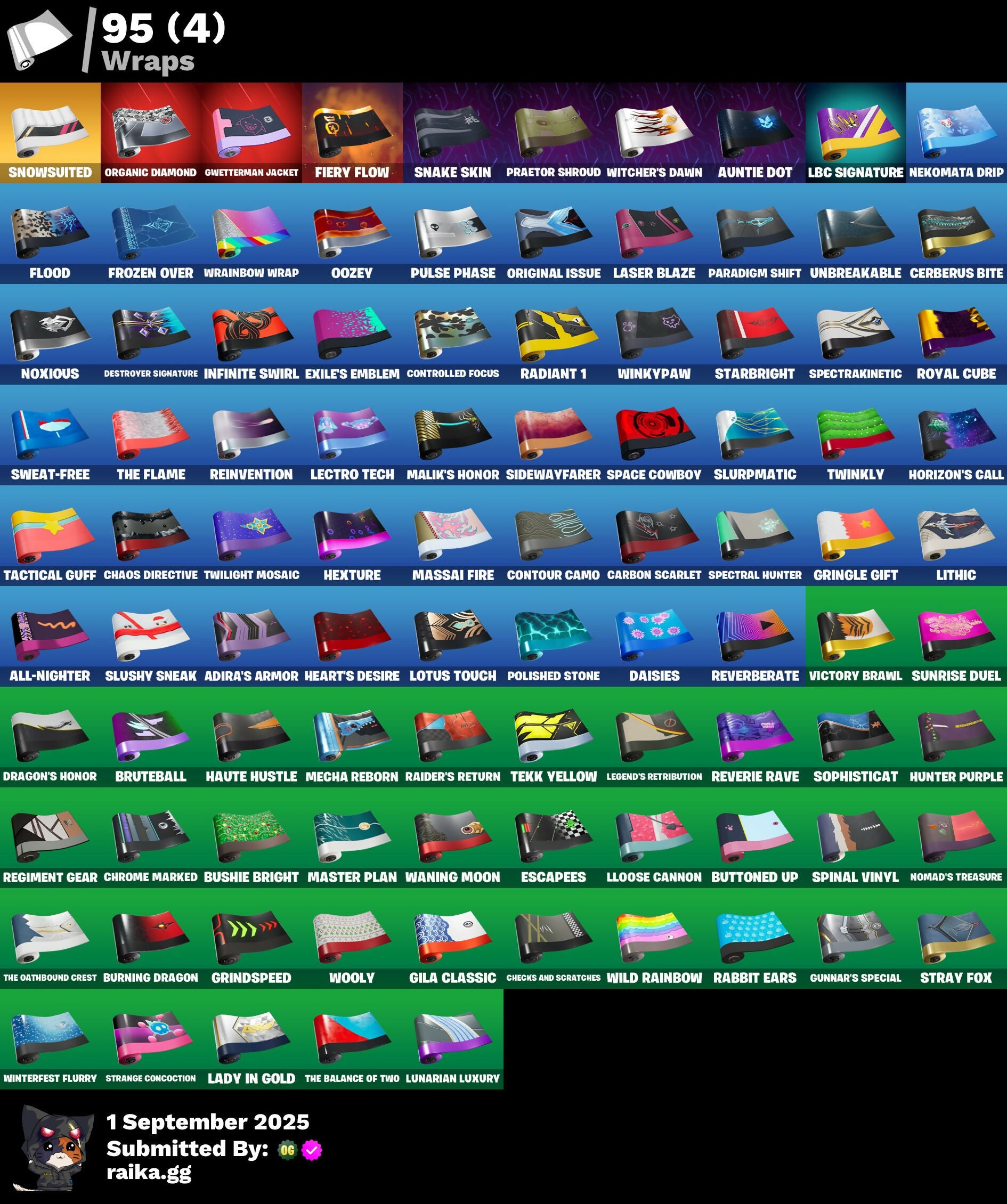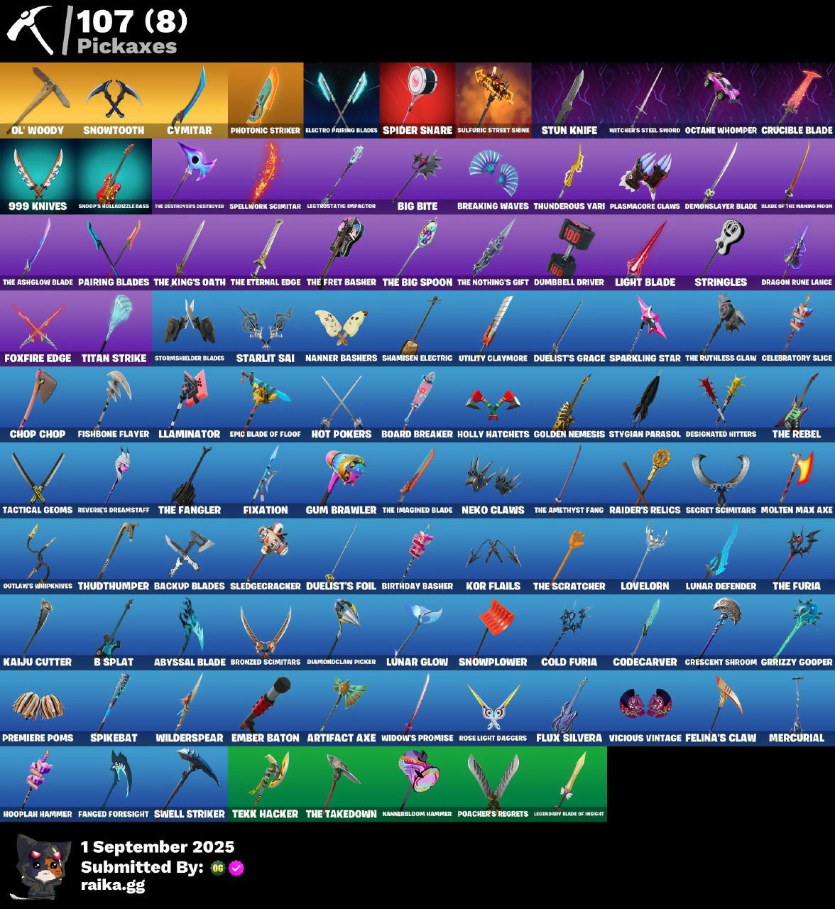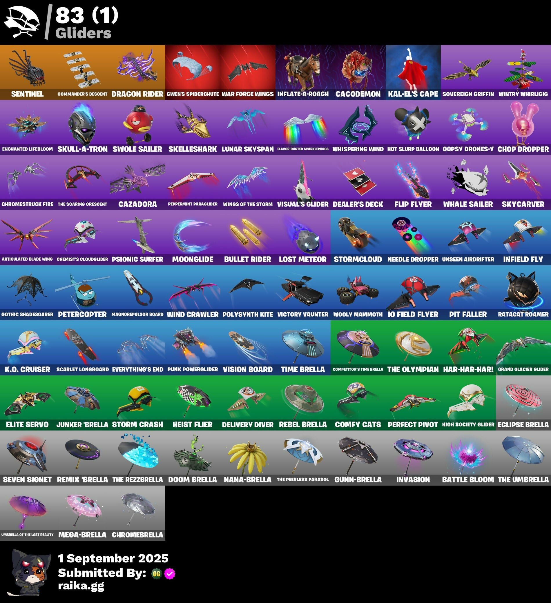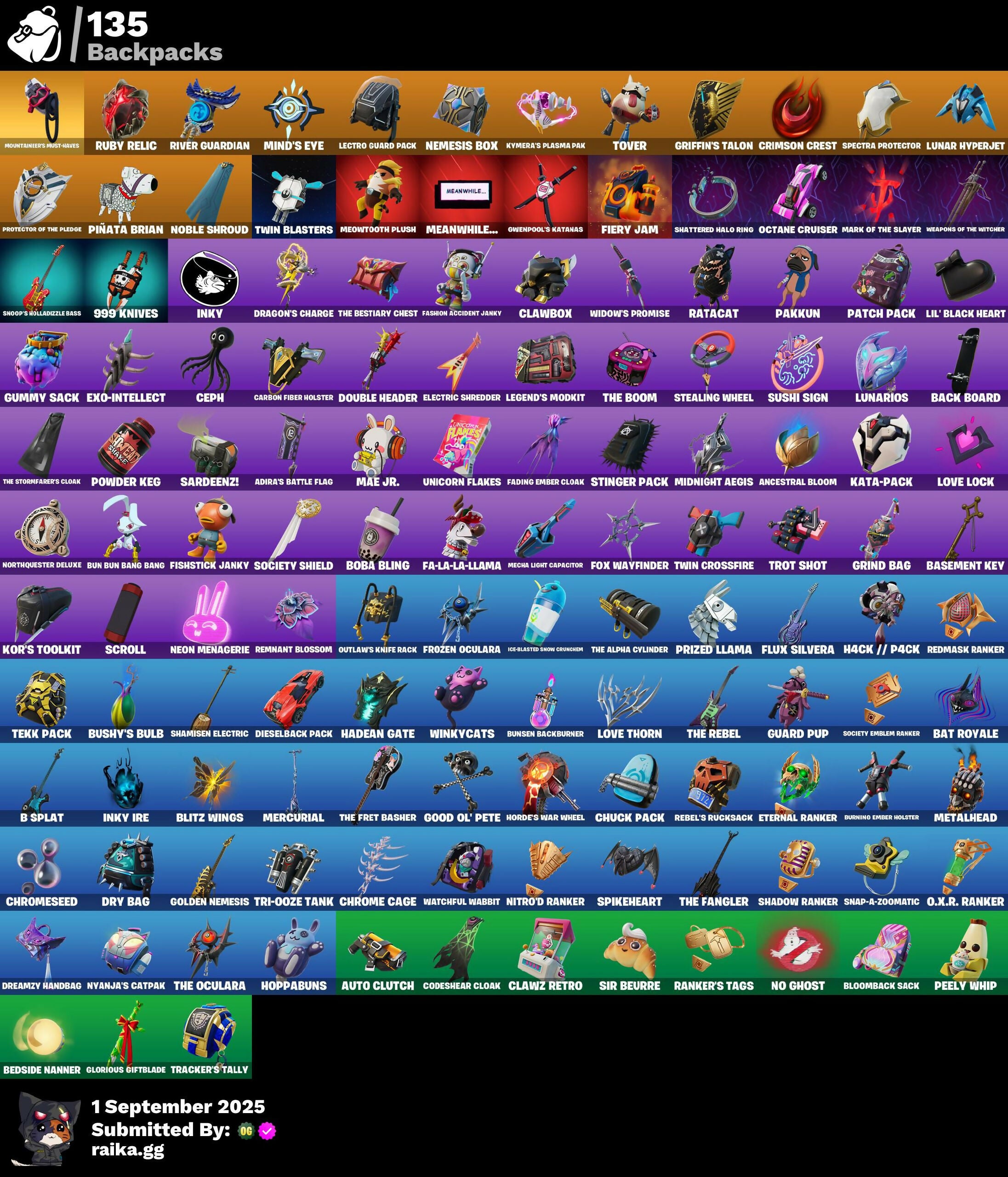 10 Field Flyer, 999 Knives, Absenz, Abyssal Blade, Adira, Adira's Armor, Adira's Battle Flag, All-Nighter, Ancestral Bloom, Arachrobatics, Arctic Adeline, Articulated Blade Wing, Artifact Axe, Auntie Dot, Auto Clutch, Ayida, B Splat, Back Board, Backup Blades, Balance Board, Basement Key, Bat Royale, Battle Bloom, Bedside Nanner, Big Bite, Birthday Basher, Blade Of The Waking Moon, Blitz Wings, Blizzabelle, Blizzard Bomber, Bloomback Sack, Blowin' Up, Board Breaker, Boba Bling, Boba Snack, Boogie Down, Breaking Waves, Bronzed Scimitars, Bruteball, Bullet Rider, Bun Bun Bang Bang, Bunsen Backburner, Burning Dragon, Burning Ember Holster, Bushie Bright, Bushy's Bulb, Buttoned Up, Bytes, Cacodemon, Called Shot, Carbon Fiber Holster, Carbon Scarlet, Cazadora, Celebratory Slice, Ceph, Cerberus Bite, Chaos Directive, Charlotte, Checks And Scratches, Chef's Special, Chemist's Cloudglider, Chigusa, Choice Knit, Chop Chop, Chop Dropper, Chrome Cage, Chrome Marked, Chrome Punk, Chromebrella, Chromeseed, Chromestruck Fire, Chuck Pack, Clawbox, Clawz Retro, Codecarver, Codeshear Cloak, Cold Furia, Comfy Cats, Commander's Descent, Competitor's Time Brella, Contour Camo, Controlled Focus, Count It!, Crescent Shroom, Crimson Crest, Crowning Achievement, Crucible Blade, Curling Iron, Cyclo Curl, Cymitar, Dagger Dance, Dahlia, Daisies, Dealer's Deck, Delivery Diver, Demonslayer Blade, Desdemona, Designated Hitters, Destroyer Signature, Diamond Throne, Diamondclaw Picker, Dieselback Pack, Dirtbike Challenge, Doom Brella, Doom Slayer, Double Header, Doze Dab, Dragon Rider, Dragon Rune Lance, Dragon's Charge, Dragon's Honor, Dreamzy Handbag, Dry Bag, Duelist's Foil, Duelist's Grace, Dumbbell Driver, Dusty, Eclipse Brella, Electric Shredder, Electro Pairing Blades, Electrostatic Impactor, Elite Servo, Ember Baton, Empress Fan Dance, Enchanted Lifebloom, Epic Blade Of Floof, Eren Jaeger, Escapees, Eternal Ranker, Everything's End, Evie, Exile's Emblem, Exo-Intellect, Expressionism, Fa-la-la-llama, Fabio Sparklemane, Fading Ember Cloak, Fanged Foresight, Fashion Accident Janky, Felina, Felina's Claw, Fiery Flow, Fiery Jam, Fishbone Flayer, Fishstick Janky, Fixation, Flavor-Dusted Sparklewings, Flip Flyer, Flood, Flux Silvera, Focus, Foil Flex, Fox Wayfinder, Foxfire Edge, Frozen Oculara, Frozen Over, Geralt Of Rivia, Get Griddy, Gila Classic, Glorious Giftblade, Golden Nemesis, Good Guy, Good Ol' Pete, Gothic Shadesoarer, Grand Glacier Glider, Griffin's Talon, Grind Bag, Grindspeed, Gringle Gift, Grizzly Gooper, Grriz, Guard Pup, Guff Gringle, Guggimon, Gum Brawler, Gumbo, Gummy Sack, Gunn-Brella, Gunnar's Special, Gwen's Spiderchute, Gwenpool's Katanas, Gwetterman Jacket, H4ck // P4ck, Hadean Gate, Halley, Hand-Forged, Har-Har-Har!, Haute Hustle, Haven, Heart Sign, Heart's Desire, Heartburst, Heist Flier, Helsie, Hexture, High Society Glider, Highwire, Holiday Boxy, Holly Hatchets, Hooplah Hammer, Hope, Hoppabuns, Horde's War Wheel, Horizon’s Call, Hot Pokers, Hot Slurp Balloon, Hunter Purple, Hypnot-Eyes, I Need You To Concentrate, I'm A Mystery, Ice-Blasted Snow Cruncher, Igni Sign, Imani, Imperial March, Infield Fly, Infinite Swirl, Inflate-A-Roach, Inky, Inky Ire, Invasion, It Is Finished, Jackie, Jon-Hwan, Junker 'Brella, K.O. Cruiser, Kaiju Cutter, Kakashi Hatake, Kal-El's Cape, Kata-Pack, Kor, Kor Flails, Kor's Toolkit, Krisabelle, Kymera, Kymera's Plasma Pak, LBC Signature, Lady In Gold, Laser Blaze, Laser Focused, Lectro Guard Pack, Lectro Tech, Leelah, Legend's Modkit, Legendary Blade Of Insight, Legend’s Retribution, Lennox Rose, Light Blade, Lil' Black Heart, Lil' Monster, Lil' Prancer, Lithic, Llaminator, Lloose Cannon, Lo-Fi Headbang, Lost Meteor, Lotus Touch, Love It!, Love Lock, Love Thorn, Lovelorn, Lt. John Llama, Lunar Charge, Lunar Defender, Lunar Glow, Lunar Hyperjet, Lunar Party, Lunar Skyspan, Lunarian Luxury, Lunarios, Mae Jr., Magnorepulsor Board, Make A Seat, Malik, Malik's Honor, Mark of the Slayer, Massai, Massai Fire, Master Plan, Meanwhile..., Mecha Light Capacitor, Mecha Reborn, Mecha Strike Commander, Mega-Brella, Megumi, Meow Skulls, Meowtooth Plush, Mercurial, Metalhead, Midnight Aegis, Min-Joon, Mina Park, Mind's Eye, Mini Slaver Fistbump, Mizuki, Molten Max Axe, Montague, Moonglide, Mwahaha, My Idol!, Mystica, Nailed It, Nana-Brella, Nanner Bashers, Nannerbloom Hammer, Naruto Uzumaki, Needle Dropper, Neko Claws, Nekomata Drip, Nemesis Box, Neon Menagerie, Nezumi, Ninja Style, Nisha, Nitro'd Ranker, No Ghost, Noble Shroud, Nomad’s Treasure, Northquester Deluxe, Noxious, Nyanja, Nyanja's Catpak, O.X.R. Ranker, OMG I Love It, Octane Cruiser, Octane Whomper, Ol' Woody, Oopsy Drones-y, Oozey, Organic Diamond, Original Issue, Oscar, Outlaw's Knife Rack, Outlaw's Whipknives, Pairing Blades, Pakkun, Paradigm (Reality-659), Paradigm Shift, Patch Pack, Peely Whip, Peppermint Paraglider, Perfect Pivot, Peter Griffin, Petercopter, Phaedra, Photonic Striker, Pit Faller, Piñata Brian, Plasmacore Claws, Poacher's Regrets, Point & Shoot, Polar Peely, Polished Stone, Polysynth Kite, Powder Keg, Praetor Shroud, Premiere Poms, Prized Llama, Protector of the Pledge, Psionic Surfer, Pulse Phase, Punk Powerglider, Rabbit Ears, Radiant 1, Raider's Relics, Raider's Return, Ranker's Tags, Ratacat, Ratacat Roamer, Ready When You Are, Rebel Brella, Rebel's Rucksack, Redmask Ranker, Regiment Gear, Reinvention, Remix 'Brella, Remnant Blossom, Renzo The Destroyer, Reverberate, Reverie, Reverie Rave, Reverie's Dreamstaff, River Guardian, Ronin, Rose Light Daggers, Royal Cube, Ruby Relic, Runway Racer, Sabina, Sardeenz!, Scarlet Longboard, Scout Regiment Salute, Scroll, Secret Scimitars, Selene, Sentinel, Seven Signet, Shadow Ranker, Shamisen Electric, Shanta, Shattered Halo Ring, Shimmer Specialist, Show 'Em Off, Shuriken Spinner, Sidewayfarer, Sir Beurre, Skelleshark, Skull-A-Tron, Skycarver, Slayer Juice Wrld, Sled Ready Guff, Sledgecracker, Slurpmatic, Slushy Sneak, Snake Skin, Snap, Snap-a-Zoo
