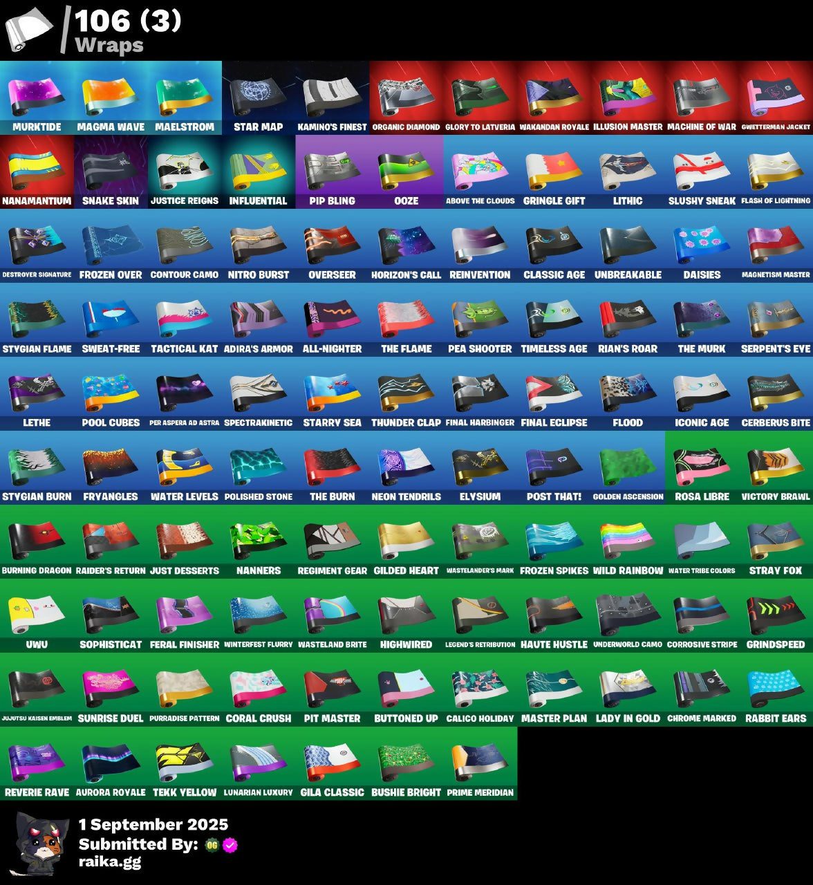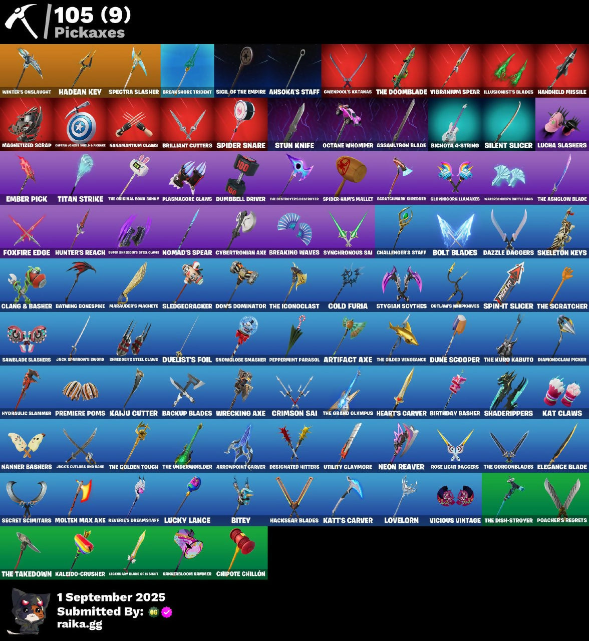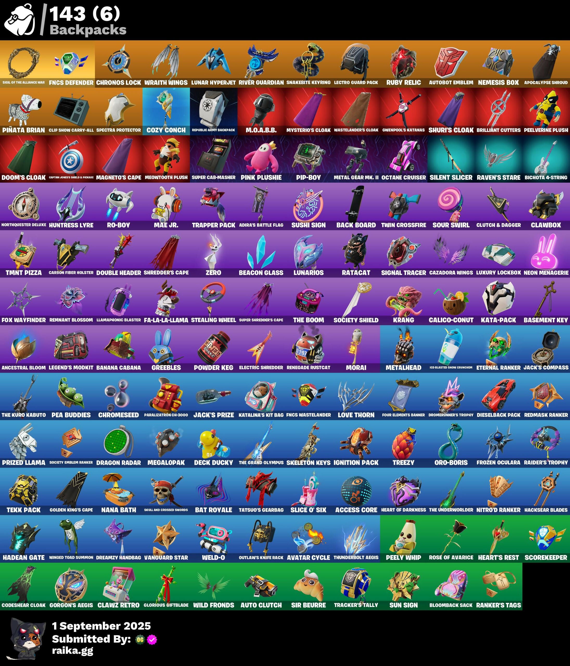 (Snikti), Above The Clouds, Access Core, Adira's Armor, Adira's Battle Flag, Adventure Aerial, Ahsoka Tano, Ahsoka's Staff, Air Horn, All-Nighter, Ancestral Bloom, Antonia, Aphrodite, Apocalypse Shroud, Arctic Adeline, Arrowpoint Carver, Artemis, Artifact Axe, Ascendant Midas, Assaultron Blade, Aura, Aurora Royale, Auto Clutch, Autobot Emblem, Avatar Cycle, Avatar's Flourish, Back Board, Backup Blades, Balanced, Banana Cabana, Basement Key, Bat Royale, Battle Bloom, Battle Prep, Battle Prep: Super, Battle-Tested, Batwing Bonespike, Beach Breezer, Beacon Glass, Bear Hug, Beatzbunny, Bichota 4-String, Big Fan, Birthday Basher, Bitey, Black Knight T-60 Power Armor, Black Panther (Shuri), Black Queen, Blazing Fire Cerberus, Bloomback Sack, Bolt Blades, Boogie Down, Boosting Ki, Bounce Wit' It, Breaking Waves, Breakshore Trident, Brilliant Cutters, Brite Moves, Brite Raider, Bubblegum Highwire, Bugsy, Bullet Rider, Burning Ambition Valeria, Burning Dragon, Bushie Bright, Buttoned Up, Buzzsaw Breacher, Cacodemon, Calico Holiday, Calico-Conut, Captain Jones, Captain Jones's Shield & Pickaxe, Captain Llamerica, Captain's Glider, Carbon Fiber Holster, Card Drop, Cazadora, Cazadora Wings, Cerberus, Cerberus Bite, Challenger's Staff, Charging Up, Chef's Special, Chipote Chillón, Chrome Marked, Chrome Punk, Chromeseed, Chronos Lock, Chun-Li, Clang & Basher, Classic Age, Classic Peelverine, Clawbox, Clawz Retro, Clip Show Carry-All, Clone Trooper, Clutch & Dagger, Codeshear Cloak, Codsworth's Cleanup, Cold Furia, Collector Kado Thorne, Combat Tech Jules, Comfy Cats, Competitor's Time Brella, Conch Call, Contour Camo, Coral Crush, Corrosive Stripe, Count It!, Cozy Conch, Crack It, Crimson Sai, Crowning Achievement, Cursed Jack Sparrow, Cybertronian Axe, Daisies, Darklands Brite Raider, Dawn Duelist Nisha, Dazzle Daggers, Deck Ducky, Delivery Diver, Designated Hitters, Destroyer Signature, Diamond Throne, Diamondclaw Picker, Dice Roll, Dieselback Pack, Disassemble, Do The Split, Don's Dominator, Doom, Doom Brella, Doom's Cloak, Doom's Domain, Double Header, Doze Dab, Dragon Radar, Dramatic Flares, Dreamzy Handbag, Drome Drifter, Dromerunner's Trophy, Duelist's Foil, Dumbbell Driver, Dune Scooper, Eclipse Brella, El Chapulin Colorado, Electric Shredder, Elegance Blade, Elite Servo, Elysium, Ember Pick, Emma Frost, Empress Fan Dance, Era, Eren Jaeger, Eternal Ranker, Explorer Emilie, Expressionism, Fa-La-La-Llama, Fancy Peter Griffin, Fang Dance, Feral Finisher, Final Eclipse, Final Harbinger, Finger Guns, Fire Show, Fireworks Salvo, Fish Thicc, Fist Of Doom, Flaky Feast, Flash Of Lightning, Flashback Breakdown, Flight Risk, Flood, Fncs Defender, Fncs Wastelander, Foil Flex, Four Elements Banner, Fox Wayfinder, Foxfire Edge, Frostburn, Frozen Oculara, Frozen Over, Frozen Spikes, Fryangles, Full Googly, Furmidable Meowscles, Gangnam Style, Get Out Of Your Mind, Gila Classic, Gilded Heart, Glorious Giftblade, Glory To Latveria, Glowunicorn Llamaxes, Golden Ascension, Golden King's Cape, Good Game, Well Played, Gorgon's Aegis, Grand Glacier Glider, Greebles, Grindspeed, Gringle Gift, Guff Gringle, Gwen-Step, Gwenpool, Gwenpool's Katanas, Gwetterman Jacket, Hacksear Blades, Hadean Chariot, Hadean Gate, Hadean Key, Hades, Handheld Missile, Har-Har-Har!, Harbinger Armor Omegarok, Haute Hustle, Heart Of Darkness, Heart Sign, Heart's Carver, Heart's Rest, Heartbreaker Aphrodite, Heartburst, Heartwinder, Hellfire Dance, High Society Glider, Highwire, Highwired, Holiday Boxy, Hope, Horizon’s Call, Hunter's Reach, Huntress Lyre, Hydraulic Slammer, I'm A Mystery, Ice-Blasted Snow Cruncher, Iconic Age, Iconic Era, Ignition Pack, Illusion Master, Illusionist's Blades, Imani, Immortal Form, Imperial March, Influential, It Is Finished, Jack Skellington, Jack Sparrow, Jack Sparrow's Sword, Jack's Compass, Jack's Cutlass and Bane, Jack's Prize, Jack's Ship, Jack's Sled, Jackie, Jar Of Dirt, Jujutsu Kaisen Emblem, Jumbo Popcorn, Junker 'Brella, Just Desserts, Justice Reigns, Kado Thorne, Kaiju Cutter, Kaleido-Crusher, Kamino's Finest, Kat Claws, Kata-Pack, Katalina, Katalina's Kit Bag, Katt, Katt's Carver, Khabby Lame, King Wings, Knife Sharpener, Korra, Korra's Air Glider, Krang, Lady In Gold, Lana Llane, Lectro Guard Pack, Legend's Modkit, Legendary Blade of Insight, Legend’s Retribution, Lethe, Lil Split, Lil' Longboat, Lil' Podracer, Lil' Prancer, Lil' T-6 Shuttle, Lithic, Llamaphonic Blaster, Lock, Shock And Barrel's Tub, Lorenzo, Lorenzo The Reckless, Lost Meteor, Love Thorn, Lovelorn, Lucha Slashers, Lucky Lance, Lunar Hyperjet, Lunar Skyspan, Lunarian Luxury, Lunarios, Luxury Lockbox, M.O.A.B.B., Machine Of War, Mae, Mae Jr., Maelstrom, Magma Wave, Magmatic Mizuki, Magmatic Poseidon, Magnetic Steps, Magnetism Master, Magnetized Scrap, Magneto, Magneto's Cape, Make A Seat, Marauder's Machete, Mariposa, Marsh Walk, Marshall Never More, Marshall Never More (Marshall Magma), Master Plan, Me & You, Medusa, Mega Wave Imani, Mega Wave Thunder, Mega-Brella, Megalo Don, Megalopak, Meowtooth Plush, Metal Gear Mk. II, Metalhead, Mizuki, Mobile Megalodon, Molten Max Axe, Montague, Moonbow Breezer, Moonlit Mystery, Morai, MrBeast, Murktide, Mysterio, Mysterio's Cloak, Mysterio's Magic Trick, Mystica, Nana Bath, Nana-Brella, Nanamantium, Nanamantium Claws, Nanner Bashers, Nanner Ringer, Nannerbloom Hammer, Nanners, Needle Dropper, Nemesis Box, Neon Menagerie, Neon Reaver, Neon Tendrils, Never Gonna, Night Hunter Scarr, Ninja Stance: Donnie, Ninja Stance: Leo, Ninja Stance: Mikey, Ninja Stance: Raph, Nisha, Nitro Burst, Nitro Flare Machinist, Nitro Fusion Megalo Don, Nitro'd Ranker, Nolan Chance, Nomad's Spear, Northquester Deluxe, Nue, Octane Cruiser, Octane Whomper, Old Snake, Omegarok, Oopsy Drones-V, Ooze, Optimus Prime, Organic Diamond, Oro-Boris, Oscar, Outlaw's Knife Rack, Outlaw's Whipknives, Overseer, Owu, Oxide Rust, Pandora's Armor Doom, Parade Riffs, Paralizatron CH-3000, Party Hips, Pea Buddies, Pea Part Harmony
