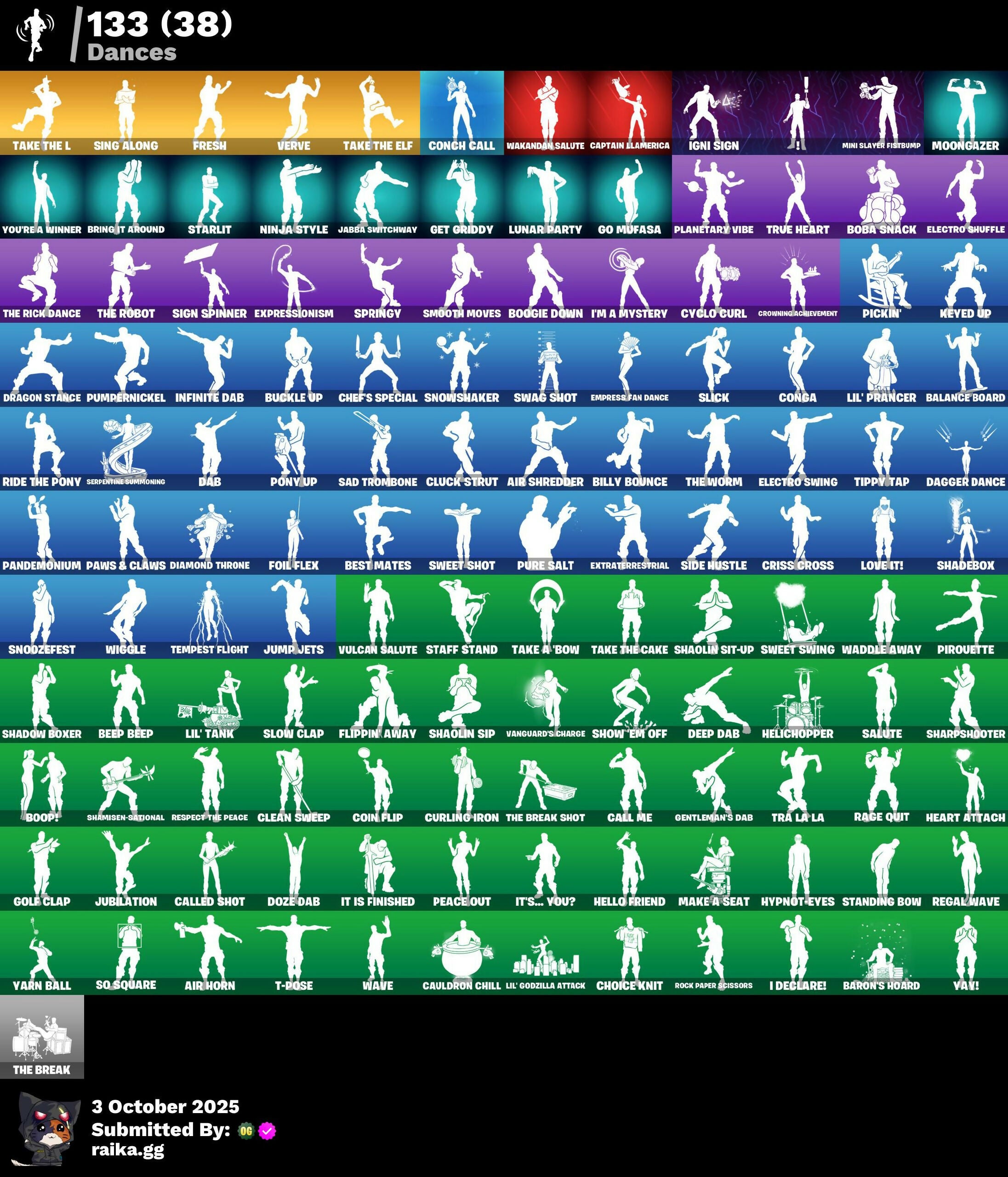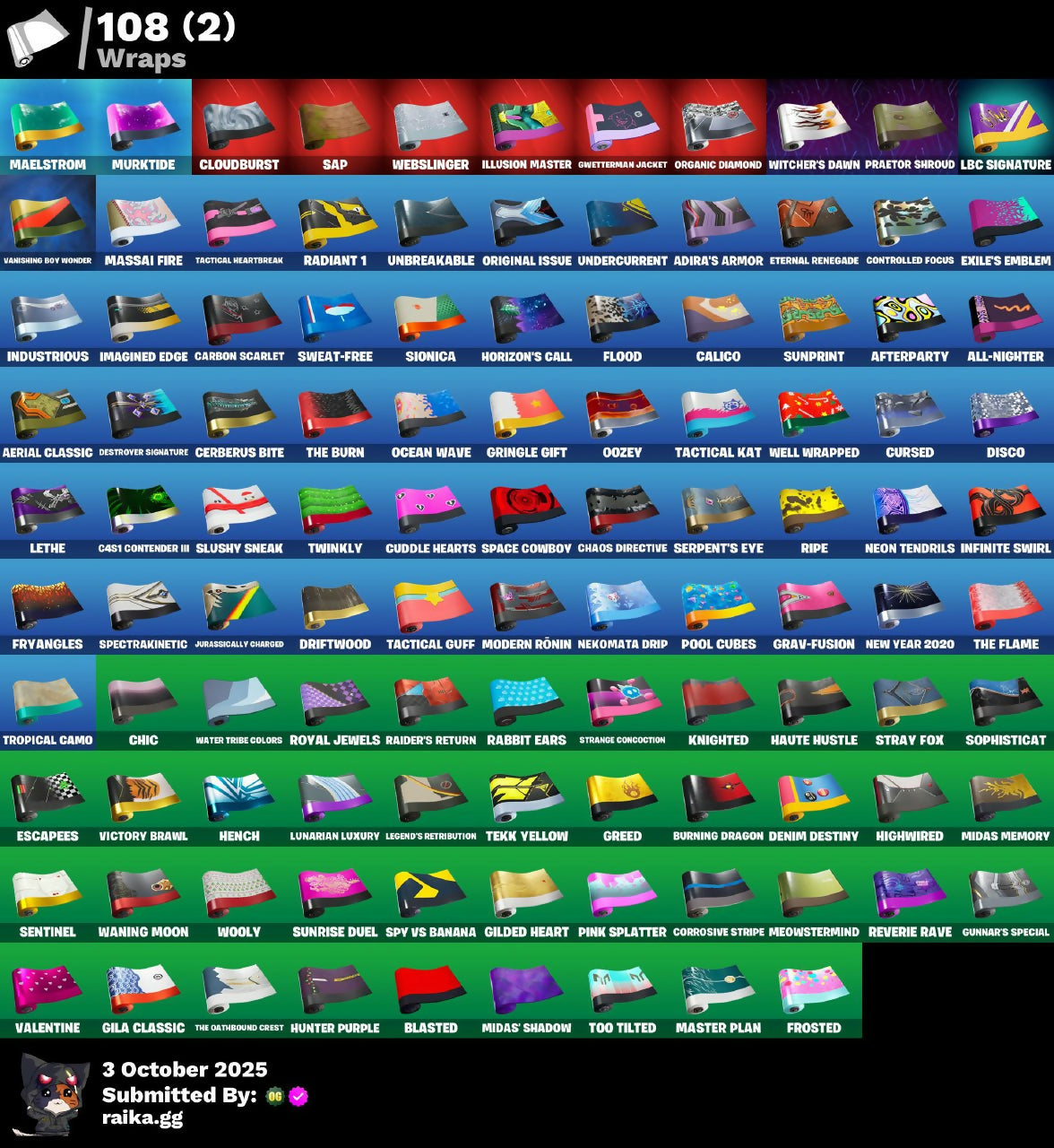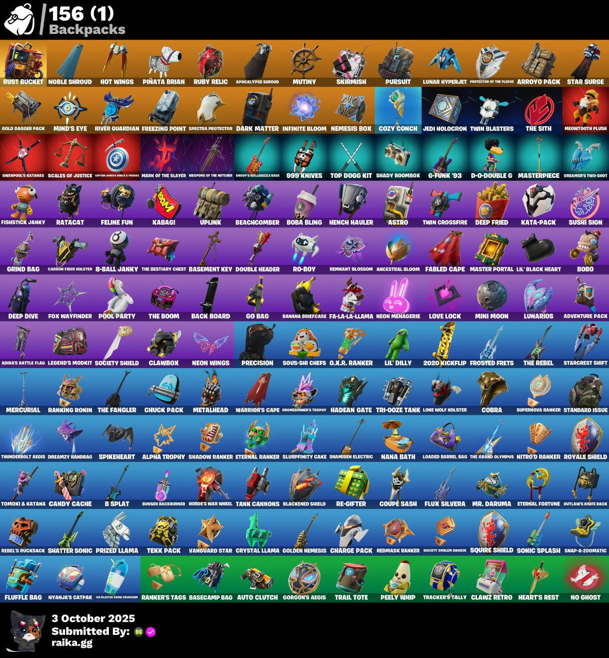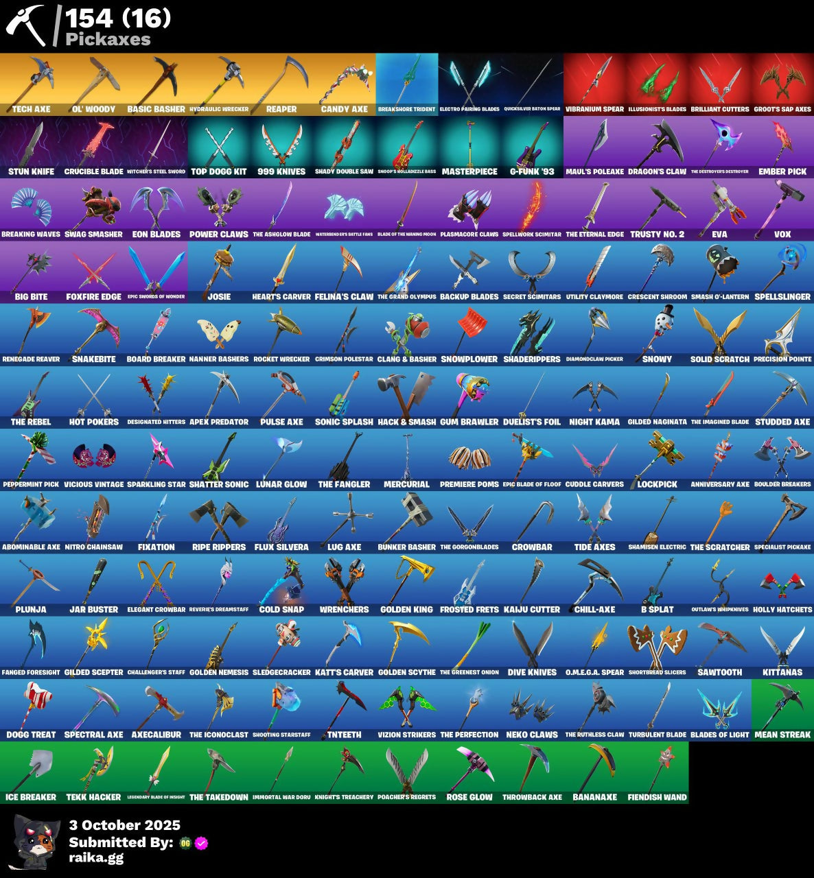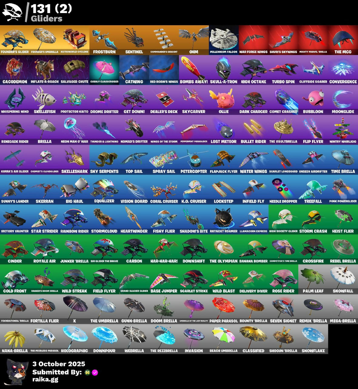 2020 Kickflip, 8-Ball Janky, 999 Knives, Abominable Axe, Adira's Armor, Adira's Battle Flag, Adventure Pack, Aerial Classic, Afterparty, Agent Peely, Air Horn, Air Shredder, All-Nighter, Alpha Trophy, Anakin Skywalker, Ancestral Bloom, Anniversary Axe, Apex Predator, Aphrodite, Apocalypse Shroud, Arctic Adeline, Ares, Arrovo Pack, Astro, Astroworld Cyclone, Auto Clutch, Axecalibur, B Splat, Back Board, Backup Blades, Balance Board, Banana Bomber, Banana Briefcase, Bananaxe, Baron's Hoard, Base Jumper, Basecamp Bag, Basement Key, Basic Basher, Beach Umbrella, Beachcomber, Beef Boss, Beep Beep, Best Mates, Big Bite, Big Haul, Billy Bounce, Blackened Shield, Blackheart, Blade of the Waning Moon, Blades of Light, Blasted, Blue Squire, Board Breaker, Boba Bling, Boba Snack, Bobo, Bombs Away!, Boogie Down, Boop!, Boulder Breakers, Bounty 'Brella, Breaking Waves, Breakshore Trident, Brella, Brilliant Cutters, Bring It Around, Brutus, Bubbloon, Buckle Up, Bullet Rider, Bunker Basher, Bunker Jonesy, Bunnymoon, Bunsen Backburner, Burning Dragon, Cacodemon, Calico, Call Me, Called Shot, Candy Axe, Candy Cache, Captain Ilamerica, Carbon, Carbon Fiber Holster, Carbon Scarlet, Cash Contender III, Catwing, Cauldron Chill, Cerberus, Cerberus Bite, Challenger's Staff, Chaos Directive, Charge Pack, Chef's Special, Chemist's Cloudglider, Chic, Chill-Axe, Choice Knit, Chuck Pack, Cinder, Clang & Basher, Clara, Classified, Clawbox, Clawz Retro, Clean Sweep, Cliffside Soarer, Cloudburst, Cluck Strut, Cobra, Coin Flip, Cold Front, Cold Snap, Comet Crasher, Commander's Descent, Competitor's Time Brella, Conch Call, Conga, Controlled Focus, Convergence, Coral Cruiser, Corrosive Stripe, Coupé Sash, Cozy Conch, Crescent Shroom, Crimson Polestar, Criss Cross, Crossfire, Crowbar, Crowning Achievement, Crucible Blade, Crystal Llama, Cuddle Carvers, Cuddle Hearts, Cuddly Cloudcruiser, Curling Iron, Cursed, Cyclo Curl, D-0-Double G, Dab, Dagger Dance, Dark Charger, Dark Matter, Dark Voyager, Deadpool, Dealer's Deck, Deep Dab, Deep Dive, Deep Fried, Delivery Diver, Denim Destiny, Designated Hitters, Destroyer Signature, Diamond Throne, Diamondclaw Picker, Disco, Dive Knives, Dogg Treat, Doom Brella, Doom Slayer, Double Header, Downpour, Downshift, Doze Dab, Dragon Stance, Dragon's Claw, Dreamer's Two-Shot, Dreamzy Handbag, Driftwood, Drome Drifter, Dromerunner's Trophy, Duelist's Foil, Durrr Taisho, Dusty, Electro Pairing Blades, Electro Shuffle, Electro Swing, Elegant Crowbar, Elite Agent, Ember Pick, Empress Fan Dance, Eon Blades, Epic Blade of Floof, Epic Swords of Wonder, Equalizer, Escapees, Eternal Fortune, Eternal Ranker, Eternal Renegade, Eva, Exile's Emblem, Expressionism, Extraterrestrial, Fa-La-La-Llama, Fabled Cape, Fade, Fanged Foresight, Felina, Felina's Claw, Feline Fun, Field Flyer, Fiendish Wand, Fishstick Janky, Fishy Flier, Fixation, Flapjack Flyer, Flip Flyer, Flippin' Away, Flood, Fluffle Bag, Flux Silvera, Focus, Foil Flex, Fortilla Flier, Foundational 'Brella, Founder's Glider, Founder's Umbrella, Fox Wayfinder, Foxfire Edge, Freezing Point, Fresh, Frostbite, Frostburn, Frosted, Frosted Frets, Fryangles, G-Funk '93, Gear Specialist Maya, Gentleman's Dab, Geralt Of Rivia, Get Down!, Get Griddy, Gila Classic, Gilded Heart, Gilded Naginata, Gilded Scepter, Go Bag, Go Mufasa, Gold Dagger Pack, Golden King, Golden Nemesis, Golden Scythe, Golf Clap, Gorgon's Aegis, Grand Glacier Glider, Grav-Fusion, Greed, Grind Bag, Gringle Gift, Groot's Sap Axes, Guff, Guff Gringle, Gum Brawler, Gunn-Brella, Gunnar’s Special, Gwenpool's Katanas, Gwetterman Jacket, Hack & Smash, Hadean Gate, Har-Har-Har!, Haute Hustle, Heart Attach, Heart's Carver, Heart's Rest, Heartwinder, Heist Flier, Helichopper, Hello Friend, Helsie, Hench, Hench Hauler, High Octane, High Society Glider, Highwire, Highwired, Holly Hatchets, Holographic, Hope, Horde's War Wheel, Horizon’s Call, Hot Pokers, Hot Wings, Hunter Purple, Hybrid, Hydraulic Wrecker, Hypnot-eyes, I Declare!, I'm A Mystery, Ice Breaker, Igni Sign, Illusion Master, Illusionist's Blades, Imagined Edge, Imani, Immortal War Doru, Industrious, Infield Fly, Infinite Bloom, Infinite Dab, Infinite Swirl, Inflate-A-Roach, Invasion, It Is Finished, It's... You?, Jabba Switchway, Jade, Jar Buster, Jedi Holocron, Josie, Jubilation, Jules, Jump Jets, Junker 'Brella, Jurassically Charged, K.O. Cruiser, Kabag!, Kaiju Cutter, Kata-Pack, Katt, Katt's Carver, Keyed Up, Kit, Kittanas, Knight's Treachery, Knighted, Korra, Korra's Air Glider, Krisabelle, LBC '93 Dogg, Lady Of Cranes, Lbc Signature, Legend's Modkit, Legend's Retribution, Legendary Blade of Insight, Lethe, Lil' Black Heart, Lil' Dilly, Lil' Godzilla Attack, Lil' Prancer, Lil' Tank, Llamacorn Express, Loaded Barrel Bag, Lockpick, Lockstep, Lone Wolf Holster, Lost Meteor, Love It!, Love Lock, Lt. Evergreen, Lug Axe, Lunar Glow, Lunar Hyper-Jet, Lunar Party, Lunarian Luxury, Lunarios, Maelstrom, Make A Seat, Mark of the Slayer, Massai, Massai Fire, Master Plan, Master Portal, Masterpiece, Maul's Poleaxe, Mean Streak, Medusa, Mega-Brella, Meowscles, Meowstermind, Meowtooth Plush, Mercurial, Metalhead, Midas, Midas Memory, Midas' Shadow, Mighty Marvel 'Brella, Millennium Falcon, Mina Park, Mind's Eye, Mini Moon, Mini Slayer Fistbump, Mission Specialist, Mizuki, Modern Rōnin, Montague, Moongazer, Moonglide, Moonwalker, Mr. Dappemint, Mr. Daruma, Murktide, Mutiny, Mystica, Nana Bath, Nana-Brella, Nanner Bashers, Needle Dropper, Neko Claws, Neko Hatsune Miku, Nekomata Drip, Nemesis Box, Neon Man O' War, Neon Menagerie, Neon Tendrils, Neon Wings, New Year 2020, Nezumi, Night Kama, Ninja Style, Nisha, Nitro Chainsaw, Nitro'd Ranker, No Ghost, Noble Shroud, Nomad's Drifter, Nyanja, Nyanja's Catpak, O.M.E.G.A. Spear, O.X.R. Ranker, Ocean, Ocean Wave, Ohm, Ol' Woody, Ollie, Oozey, Organic Diamond, Original Issue, Oscar, Outlaw's Knife Rack, Outlaw's Whipknives, Palm Leaf, Pandemonium, Paper Parasol, Paws & Claws, Peace Out, Peely, Peely 