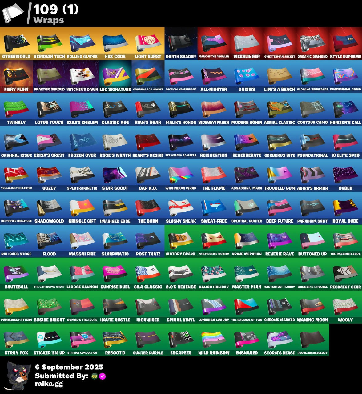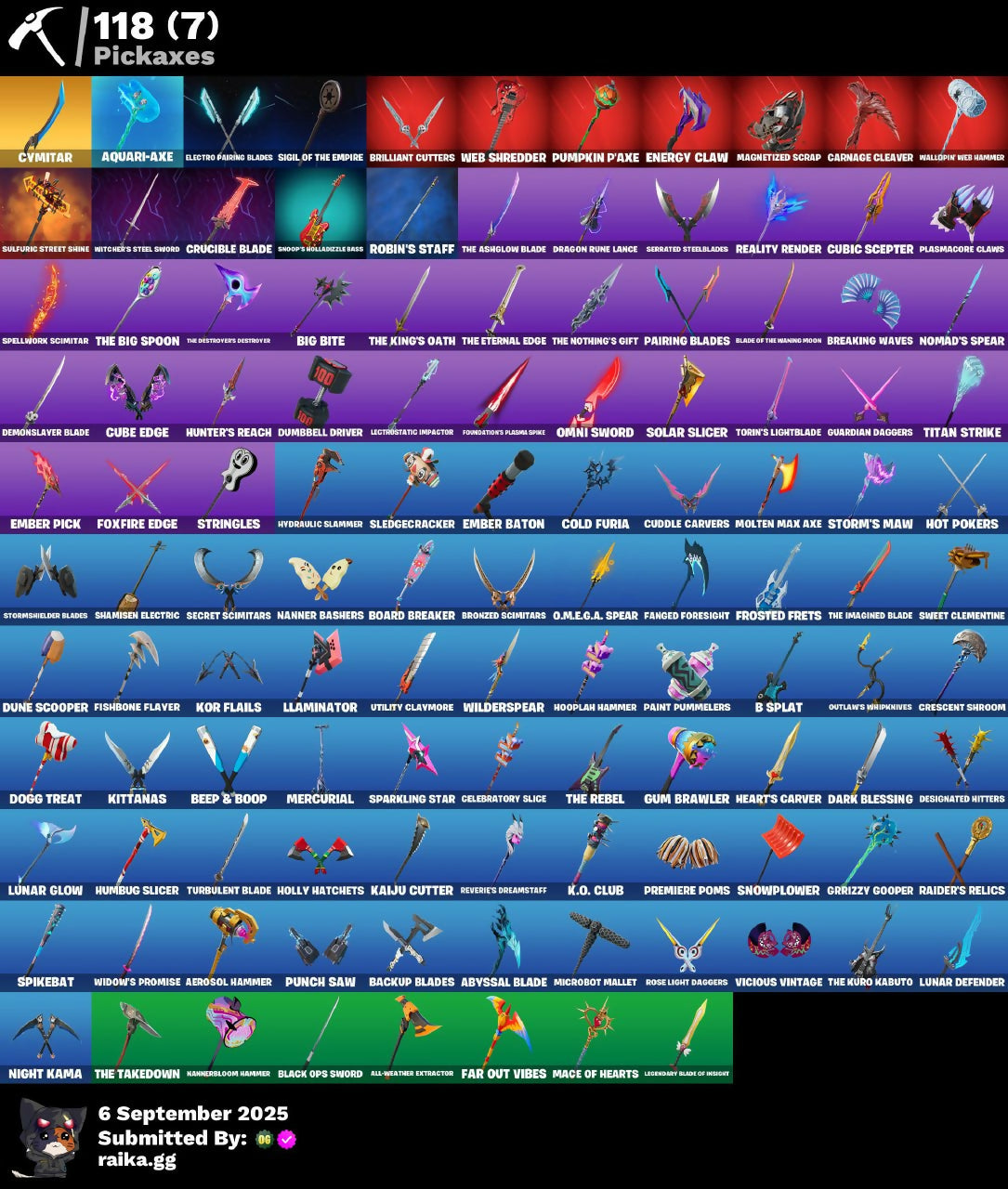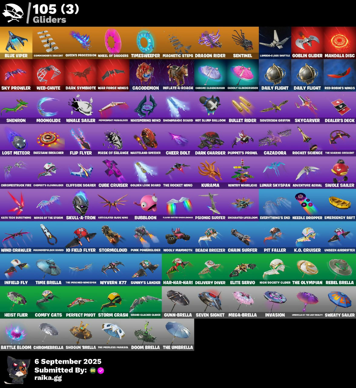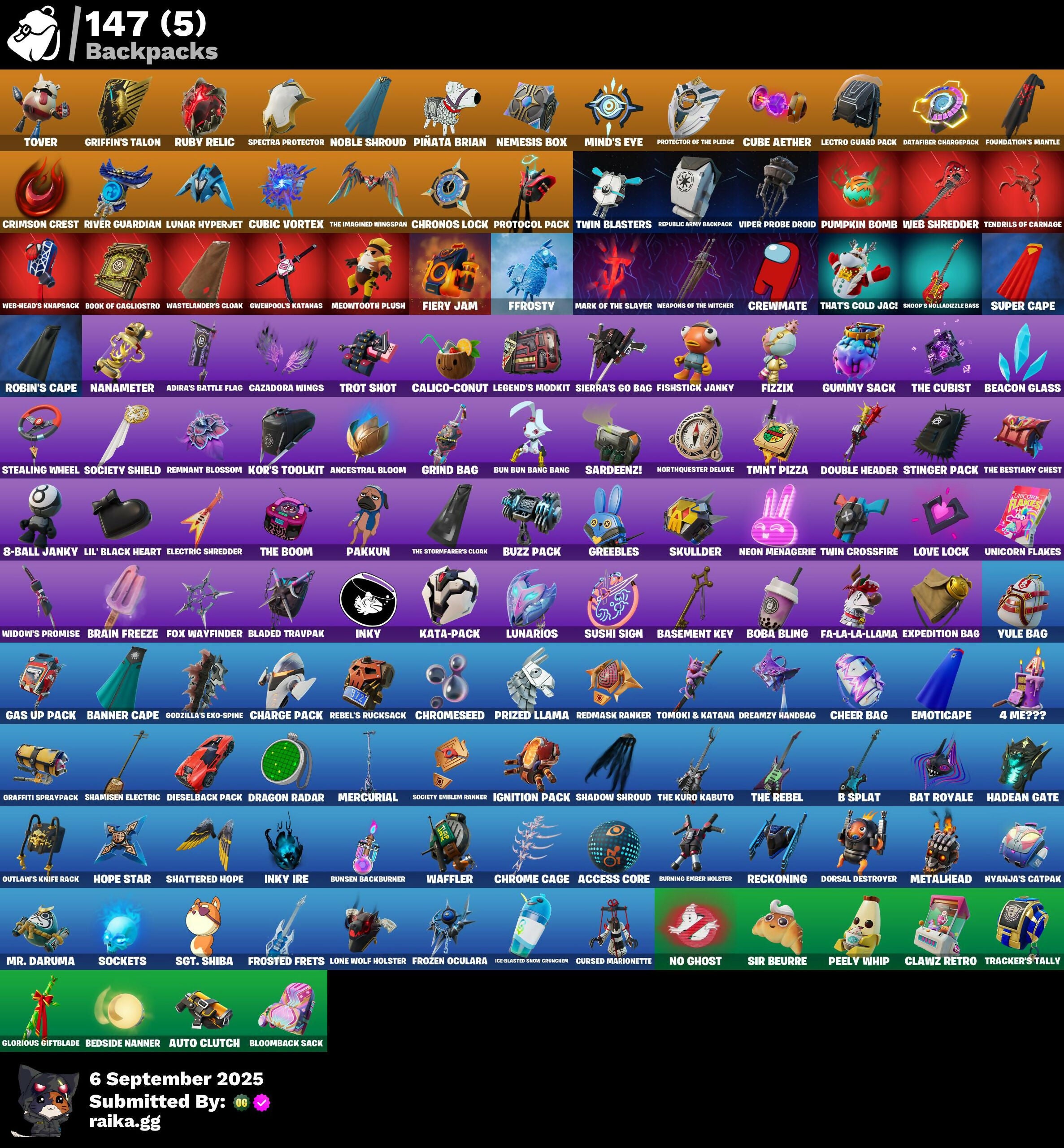 2.0's Revenge, 4 Me???, 8-Ball Janky, Absenz, Abyssal Blade, Access Core, Adira, Adira's Armor, Adira's Battle Flag, Adventure Aerial, Aerial Classic, Aerosol Hammer, All-Nighter, All-Weather Extractor, Ancestral Bloom, Aquari-Axe, Arctic Adeline, Arm The Pumpkin!, Around The Clock, Articulated Blade Wing, Assassin's Mark, Auto Clutch, B Splat, Backup Blades, Balance Board, Banner Cape, Basement Key, Bat Royale, Battle Bloom, Beach Breezer, Beacon Glass, Bedside Nanner, Beep & Boop, Big Bite, Big Fan, Birdarang Flourish, Black Ops Sword, Blade Of The Waning Moon, Bladed Travpak, Blizzabelle, Bloomback Sack, Blowin' Up, Blue Viper, Board Breaker, Boba Bling, Boba Snack, Boogie Down, Book of Cagliostro, Boosting Ki, Brain Freeze, Breaking Waves, Brilliant Cutters, Bring It Around, Bronzed Scimitars, Bruteball, Bubbloon, Bullet Rider, Bun Bun Bang Bang, Bunsen Backburner, Burning Ember Holster, Bushie Bright, Buttoned Up, Buzz Pack, Buzzsaw Breacher, Bytes, Cacodemon, Calico Holiday, Calico-Conut, Called Shot, Cap K.O., Carnage, Carnage Cleaver, Cazadora, Cazadora Wings, Celebratory Slice, Cerberus Bite, Chain Surfer, Charge Pack, Charging Up, Charlotte, Cheer Bag, Cheer Bolt, Chef's Special, Chemist's Cloudglider, Choice Knit, Chrome Cage, Chrome Cloudcruiser, Chrome Marked, Chromebrella, Chromeseed, Chromestruck Fire, Chronos Lock, Classic Age, Clawz Retro, Cliffside Soarer, Cold Furia, Comfy Cats, Commander's Descent, Conjure Weapon, Contour Camo, Contract Giller, Controller Crew, Crescent Shroom, Crewmate, Crimson Crest, Crowning Achievement, Crucible Blade, Cube Aether, Cube Assassin, Cube Cruiser, Cube Edge, Cubed, Cubic Scepter, Cubic Vortex, Cuddle Carvers, Cuddly Cloudcruiser, Cursed Marionette, Cyclo Curl, Cymitar, D'Ark, Dagger Dance, Daily Flight, Daisies, Dark Blessing, Dark Charger, Dark Symbiote, Darth Shader, Darth Vader, Datafiber Chargepack, Dealer's Deck, Deep Future, Delivery Diver, Demonslayer Blade, Designated Hitters, Destroyer Signature, Dieselback Pack, Dimensional Camo, Distraction Dance, Doctor Strange, Dogg Treat, Don't Start Now, Doom Brella, Doom Slayer, Dorsal Destroyer, Double Header, Dragon Radar, Dragon Rider, Dragon Rune Lance, Dreamzy Handbag, Dumbbell Driver, Dune Scooper, Dusk Knight, Dusty, Electric Shredder, Electro Pairing Blades, Electrostatic Impactor, Elite Servo, Ember Baton, Ember Pick, Emergency Raft, Emoticape, Enchanted Lifebloom, Energy Claw, Ensnared, Era, Eren Jaeger, Erisa, Erisa’s Crest, Escapees, Everything's End, Evie, Exile's Emblem, Expedition Bag, Explorer Emilie, Expressionism, Fa-La-La-Llama, Fabio Sparklemane, Fanged Foresight, Far Out Vibes, Ffrosty, Fiery Flow, Fiery Jam, Fishbone Flayer, Fishstick Janky, Fist Bump, Fixer, Fizzix, Flavor-Dusted Sparklewings, Flip Flyer, Flood, Foil Flex, Foundation's Mantle, Foundation's Plasma Spike, Foundational, Fox Wayfinder, Foxfire Edge, Frosted Frets, Frozen Oculara, Frozen Over, GGWP, Gas Up Pack, Geralt Of Rivia, Get Out Of Your Mind, Gila Classic, Glorious Giftblade, Glowing Vengeance, Goblin Glider, Godzilla's Exo-Spine, Golden Look Board, Good Game, Well Played, Good Guy, Graffiti Spraypack, Grand Glacier Glider, Grand Salute, Greebles, Green Goblin, Griffin's Talon, Grind Bag, Gringle Gift, Grriz, Grrizzy Gooper, Guardian Daggers, Guff Gringle, Gum Brawler, Gumbo, Gummy Sack, Gunn-Brella, Gunnar, Gunnar's Special, Gwenpool's Katanas, Gweterman Jacket, Hadean Gate, Hand-Forged, Har-Har-Har!, Harlowe, Haute Hustle, Haven, Heart Sign, Heart's Carver, Heartburst, Heart’s Desire, Heist Flier, Helsie, Hex Code, High Society Glider, Highwire, Highwired, Holiday Boxy, Holly Hatchets, Hooplah Hammer, Hope Star, Horizon’s Call, Hot Pokers, Hot Slurp Balloon, Humbug Slicer, Hunter Purple, Hunter's Reach, Hydraulic Slammer, Hypnot-Eyes, I Ain't Afraid, I Need You To Concentrate, IO Elite Spec, Ice-Blasted Snow Cruncher, Igni Sign, Ignition Pack, Imagined Edge, Imani, Imperial March, Indiana Jones, Infield Fly, Inflate-A-Roach, Inky, Inky Ire, Invasion, Io Field Flyer, It Is Finished, It's... You?, J.B. Chimpanski, Jackie, Jumbo Popcorn, Jun-Hwan, K.O. Club, K.O. Cruiser, Kaiju Cutter, Kakashi Hatake, Kata Tech Burstwing, Kata-Pack, Kiara K.O., Kittanas, Kor, Kor Flails, Kor's Toolkit, Krisabelle, Kurama, LBC Signature, Lambda-Class Shuttle, Laser Focused, Lectro Guard Pack, Legend's Modkit, Legendary Blade Of Insight, Lennox Rose, Life's A Beach, Light Burst, Lil' Black Heart, Lil' Monster, Lil' Prancer, Lil' Rover, Lina Scorch, Live From Haddonfield, Llaminator, Lloose Cannon, Lone Wolf Holster, Lost Meteor, Lotus Touch, Love It!, Love Lock, Lt. John Llama, Lunar Charge, Lunar Defender, Lunar Glow, Lunar Hyperjet, Lunar Party, Lunar Skyspan, Lunarian Luxury, Lunarios, Mace Of Hearts, Magnetic Steps, Magnetized Scrap, Magnorepulso Board, Major Mancake, Make A Seat, Malik, Malik's Honor, Mandala Disc, Marika, Mark Of The Prowler, Mark of the Slayer, Mary Jane Watson, Mask Of Balance, Massai, Massai Fire, Master Plan, Mega-Brella, Meow Skulls, Meowtooth Plush, Mercurial, Metalhead, Microbot Mallet, Mind's Eye, Mini Slayer Fistbump, Mizuki, Modern Ronin, Molten Max Axe, Moonglide, Mr. Dappermint, Mr. Daruma, Mwahaha, Mystica, Nailed It, Nanameter, Nanner Bashers, Nanner Ringer, Nannerbloom Hammer, Needle Dropper, Nemesis Box, Neon Menagerie, Nezumi, Night Kama, Ninja Stance: Donnie, Ninja Stance: Leo, No Ghost, Noble Shroud, Nomad's Spear, Nomad's Treasure, Northquester Deluxe, Nyanja's Catpak, O.M.E.G.A. Spear, Omg I Love It, Omni Sword, Oozev, Organic Diamond, Original Issue, Otherworld, Outlaw's Knife Rack, Outlaw's Whipknives, Paint Pummelers, Pairing Blades, Pakkun, Paradigm, Paradigm Shift, Paradise Meowscles, Peely Whip, Peppermint Paraglider, Per Aspera Ad Astra, Perfect Pivot, Pit Faller, Pizza Party, Piñata Brian, Plasmacore Claws, Polar Peely, Polished Stone, Post That!, Praetor Shroud, Premiere Poms, Primate Space Program, Prime Meridian, Prized Llama, Protector of the Pledge, 