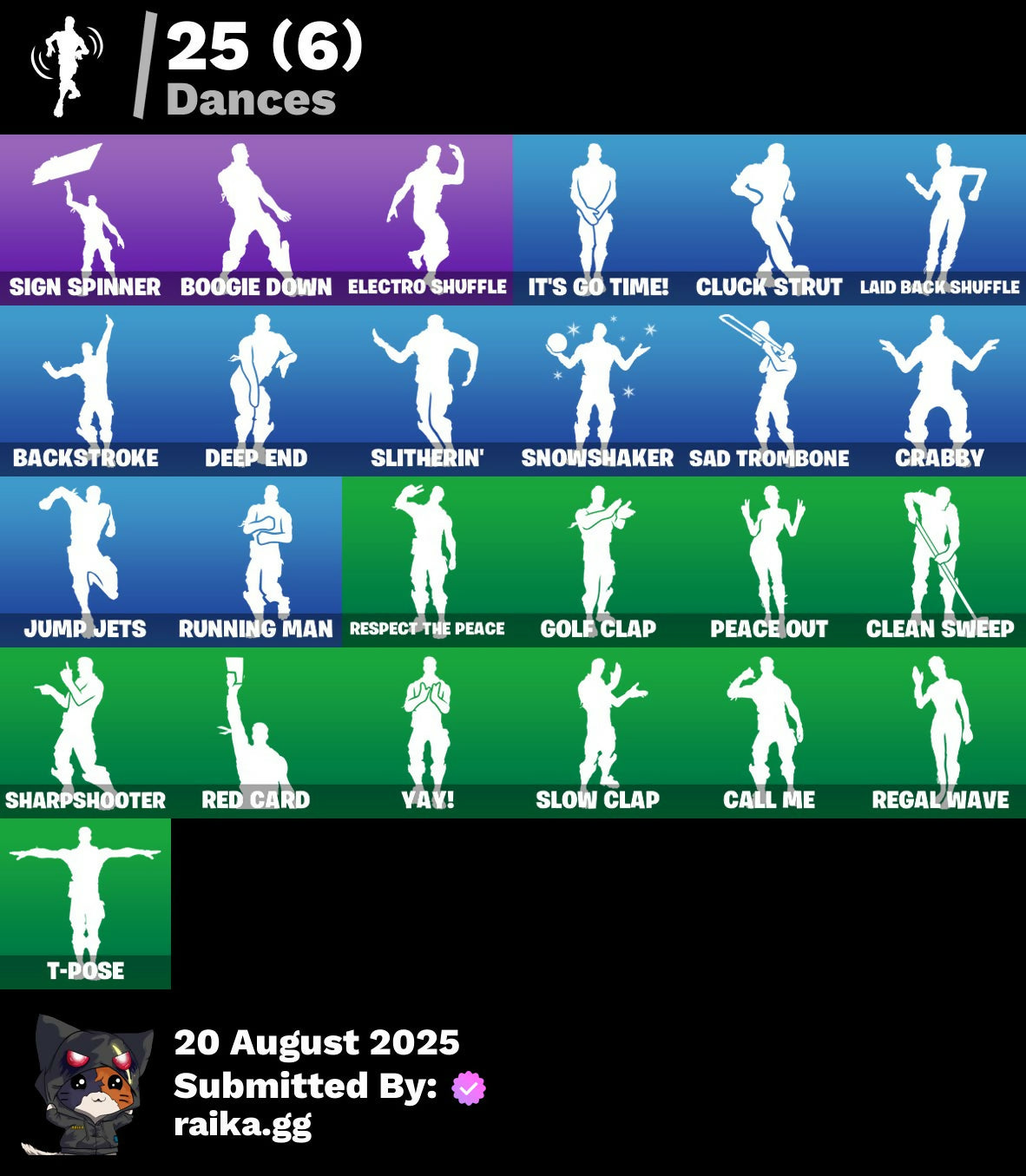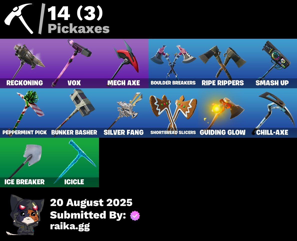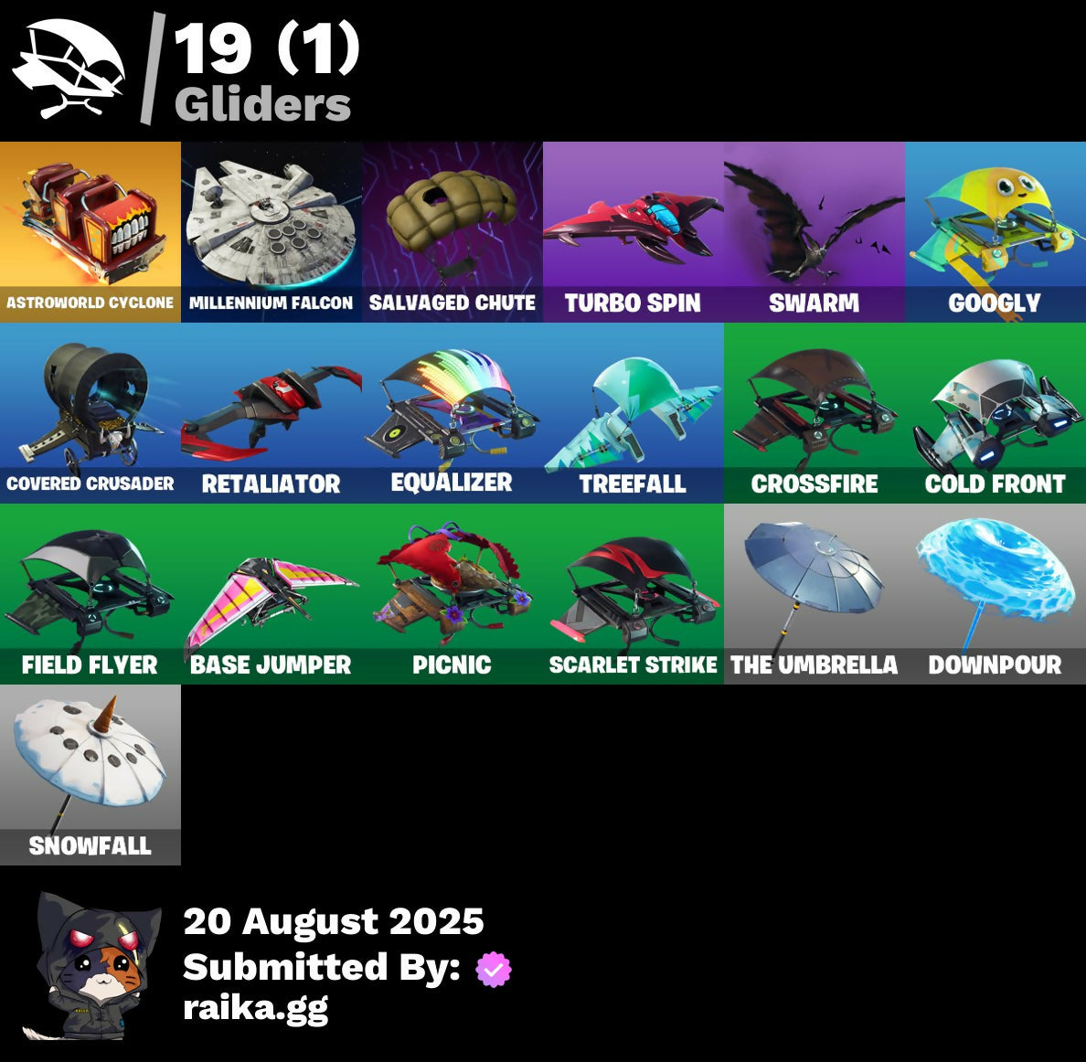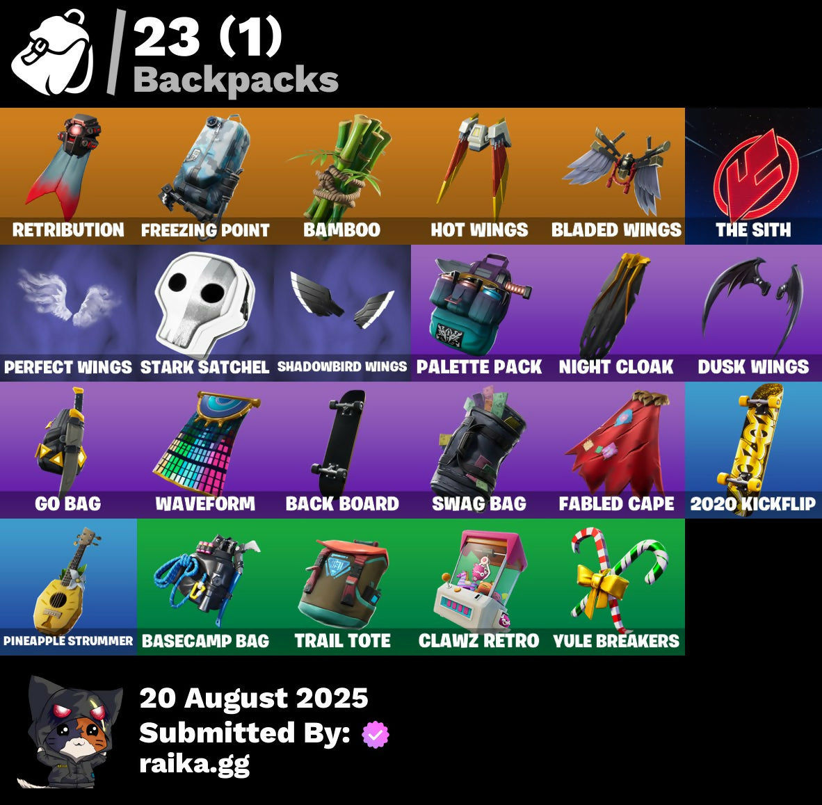 2020 Kickflip, Astroworld Cyclone, Back Board, Backstroke, Bamboo, Base Jumper, Basecamp Bag, Bladed Wings, Boogie Down, Boulder Breakers, Bunker Basher, Bunker Jonesy, Calamity, Call Me, Chill-Axe, Clawz Retro, Clean Sweep, Cluck Strut, Cold Front, Covered Crusader, Crabby, Crossfire, DJ Yonder, Deep End, Demi, Downpour, Dusk, Dusk Wings, Electro Shuffle, Equalizer, Fable, Fabled Cape, Field Flyer, Freezing Point, Frostbite, Giddy-Up, Go Bag, Golf Clap, Googly, Guiding Glow, Hot Wings, Ice Breaker, Icicle, It's Go Time!, Jump Jets, Laguna, Laid Back Shuffle, Mech Axe, Midfield Maestro, Millennium Falcon, Night Cloak, Nightshade, P.A.N.D.A Team Leader, Palette Pack, Peace Out, Peppermint Pick, Perfect Shadow, Perfect Wings, Picnic, Pineapple Strummer, Reckoning, Red Card, Regal Wave, Respect The Peace, Retaliator, Retribution, Ripe Rippers, Rox, Running Man, Sad Trombone, Salvaged Chute, Scarlet Strike, Sentinel, Shadow Skully, Shadowbird, Shadowbird Wings, Sharpshooter, Shogun, Shortbread Slicers, Sign Spinner, Silver Fang, Slitherin', Slow Clap, Smash Up, Snowfall, Snowshaker, Stark Satchel, Stratus, Swag Bag, Swarm, T-Pose, The Ace, The Sith, The Umbrella, Trail Tote, Treefall, Turbo Spin, Vega, Vendetta, Vox, Waveform, Wilde, Wooly Warrior, Yay!, Yule Breakers