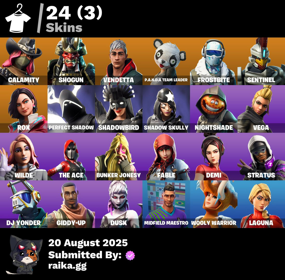 [PC/PSN/XBOX] [PC] 24 skins | Astroworld Cyclone | Calamity | Shogun | Vendetta | P.A.N.D.A Team Leader | Frostbite | Sentinel | Rox | Perfect Shadow | Shadowbird | 200 VB