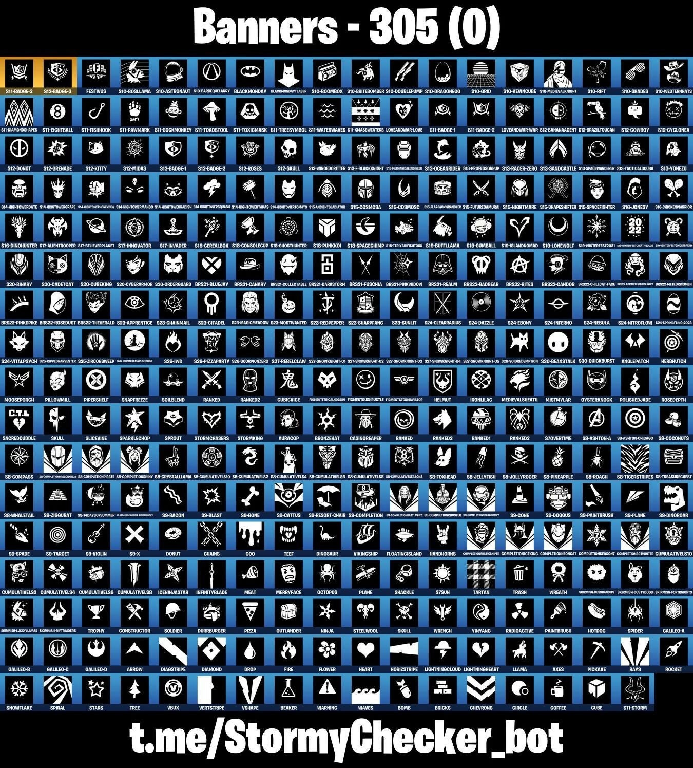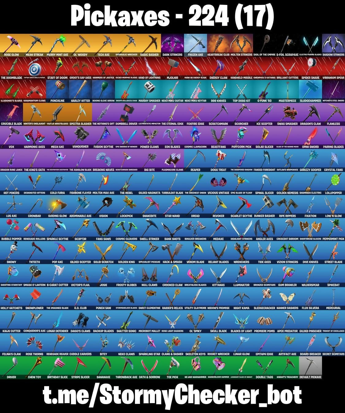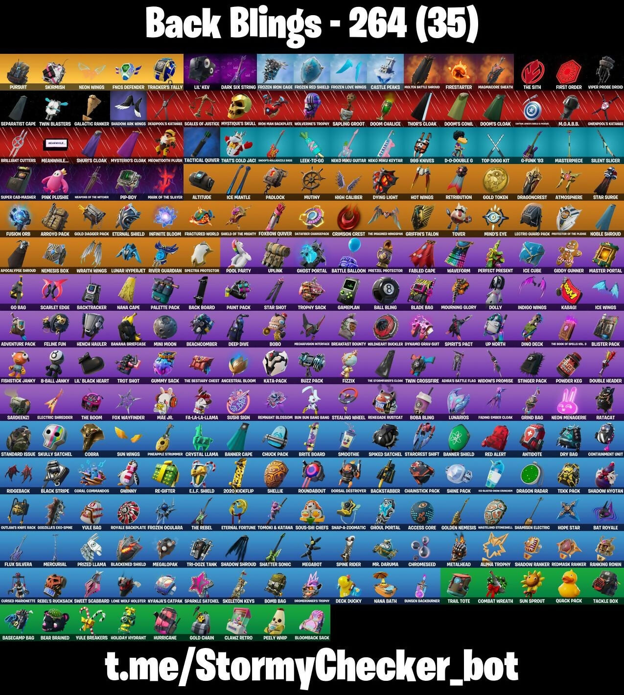 (Snikty!), 2020 Kickflip, 6-Carat Cutter, 8-Ball Janky, 8-Ball vs Scratch, 999 Knives, Abominable Axe, Access Core, Adira, Adira's Battle Flag, Adventure Pack, Aerial Assault Bomber, Afterparty, Agent Peely, Air Horn, Air Shredder, Alpha Trophy, Altitude, Ancestral Bloom, Anglepatch, Angler Axes, Antidote, Apex Predator, Apocalypse Shroud, Arachnobatics, Arctic Adeline, Arrow, Arroyo Pack, Artifact Axe, Astroworld Cyclone, Atmosphere, Aura, Auracop, Axes, B.R.U.T.E. Gunner, BRS21-Bluejay, BRS21-Canary, BRS21-Collectable, BRS21-Darkstorm, BRS21-Fuschia, BRS21-Pinkwidow, BRS21-Realm, BRS22-Badbear, BRS22-Bites, BRS22-Candor, BRS22-Chillcatface, BRS22-Fortnitemars2023, BRS22-Meteormermin, BRS22-Pinkspike, BRS22-Rosedust, BRS22-Thererald, Back Board, Backstabber, Backtracker, Backup Blades, Balance Board, Ball Bling, Banana Briefcase, Bananaxe, Bank Shots, Banner Cape, Banner Shield, Basecamp Bag, Basic Basher, Bat Royale, Battle Balloon, Battle Blessing, Beach Bomber, Beachcomber, Beaker, Bear Brained, Beastfang, Beep Beep, Big Bite, Billy Bounce, Birdie, Birthday Slice, Bitey, Black Knight, Black Stripe, BlackMonday, BlackMondayTeaser, Blackened Shield, Blackheart, Blacklight, Blade Bag, Blade of The Waning Moon, Blades of Light, Blaze, Blister Pack, Bloomback Sack, Bloomin' Bouquet, Blowin' Up, Blowing Bubbles, Board Breaker, Boba Bling, Boba Snack, Bobo, Boing!, Bomb, Bomb Bag, Bones, Boobytrapped, Boogie Down, Boomin', Boosting Ki, Boulder Breakers, Bounce Berry, Boxing Glove Arrow, Bracer, Breakfast Bounty, Breaking Point, Breaking Waves, Breakneck, Breathless Blades, Bricks, Brilliant Cutters, Bring It, Brite Board, Bronzed Scimitars, Bronzehat, Brush Your Shoulders, Brutus, Bubble Popper, Bullseye, Bun Bun Bang Bang, Bundles, Bunker Basher, Bunker Jonesy, Bunnymoon, Bunsen Backburner, Burpee, Business Hips, Busy, Buzz Pack, Bytes, Calculated, Call Me, Called Shot, Cameo vs Chic, Cap Kick, Captain America's Shield & Pickaxe, Captain Jones, Captain Llamerica, Casinoreaper, Cassidy Quinn, Castle Peaks, Cat Flip, Catalyst, Catrina, Chains, Chainstick Pack, Charging Up, Chef's Special, Chevrons, Chew Toy, Chimichanga!, Choice Knit, Chrome Punk, Chromeseed, Chuck Pack, Chun-Li, Circle, Clang & Basher, Clawz Retro, Clean Sweep, Cluck Strut, Cobra, Codename E.L.F., Coffee, Coin Flip, Cold Furia, Combat Wreath, Completionarcticspicer, Completionlocking, Completionneocat, Completionogswinter, Completionseason7, Conga, Conqueror's Axe, Conqueror's Claim, Constructor, Containment Unit, Contract Giller, Controller Crew, Coral Commandos, Cosmic Cleavers, Cosmic Llamacorn, Crescent Shroom, Crimson Crest, Criss Cross, Crooked Claw, Crowbar, Crowning Achievement, Crucible Blade, Crusher, Crystal, Crystal Fang, Crystal Llama, Cube, Cubicvice, Cuddle Carvers, Cuddle Hearts, Cuddle Team Specialist, Cumulativels10, Cumulativels2, Cumulativels4, Cumulativels6, Cumulativels8, Curling Iron, Cursed Marionette, Cyclo Curl, D-O Double G, Dabstand, Daigo, Daigo's Claws, Dance Moves, Dark Power Chord, Dark Six String, Dark Strikers, Darth Vader, Datafire Chargepack, Deadpool, Deadpool's Katanas, Deck Ducky, Deep Dab, Deep Dive, Deep End, Default Pickaxe, Demi, Denied, Designated Hitters, Diagstripe, Diamond, Diamond Diva, Dino Deck, Dinosaur, Dirtbike Challenge, Diva Fever, Dive Knives, Do The 'Split, Doctor Doom, Dogg Treat, Dolly, Donut, Doom Chalice, Doom Slayer, Doom's Cloak, Doom's Cowl, Dorsal Destroyer, Double Header, Double Tags, Double Up, Doze Dab, Dragon Radar, Dragon Rune Lance, Dragon Stance, Dragon's Claw, Dragoncrest, Dread, Driver, Dronerunner's Trophy, Droop, Drop, Drop The Bass, Dry Bag, Duelist's Card Trick, Dumbbell Driver, Durrburger, Durrr Taisho, Dusty, Dying Light, Dynamo Grav-Suit, E.L.F. Shield, Electric Shredder, Electro Paing Blades, Electro Shuffle, Electro Swing, Electrostatic Impactor, Ember, Emma Frost, Empress Fan Dance, Energy Claw, Eon Blades, Epic Blade of Floof, Epic Swords of Wonder, Epitaph Edge, Eternal Fortune, Eternal Knight, Eternal Shield, Eternal Voyager, Evie, Expressionism, FNCS Defender, Fa-La-La-Llama, Fabled Cape, Face Palm, Fade, Fading Ember Cloak, Fang Saws, Fanged Foresight, Featherweight, Felina, Felina's Claw, Feline Fun, Festivus, Fierce, Figmentrthrushustle, Figmentstormaviator, Figmenttechnicalnoggin, Finger Wag, Fire, Firestarter, Fireworks Salvo, First Order, Fishbone Flayer, Fishstick Janky, Fist Bump, Fixation, Fizzix, Flashback Breakdown, Flawless, Flippin' Away, Floatingisland, Flower, Flux Silvera, Focus, Focused, Founder's Glider, Founder's Umbrella, Fox Wayfinder, Foxbow Quiver, Foxfire Edge, Fractured World, Free Flow, Front Page Pose, Frosty Globes, Frozen Axe, Frozen Fishstick, Frozen Iron Cage, Frozen Love Ranger, Frozen Love Wings, Frozen Nog Ops, Frozen Oculara, Frozen Raven, Frozen Red Knight, Frozen Red Shield, Full Tilt, Fusion, Fusion Orb, Fusion Scythe, G-Funk '93, Galactic Ranker, Galaxia, Galaxy Scout, Galileo-A, Galileo-B, Galileo-C, Galileo-D, Gameplan, Gear Specialist Maya, Gentleman's Dab, Geralt of Rivia, Get Funky, Get Griddy, Get Loose, Ghost Portal, Ghoul Portal, Ghoul Trooper, Giddy Gunner, Gilded Morphic Blades, Gilded Naginata, Gilded Pinscher, Gilded Scepter, Ginger Gunner, Glitter, Go Bag, Go! Go! Go!, Godzilla Evolved, Godzilla's Exo-Spine, Gold Chain, Gold Dagger Pack, Gold Token, Golden King, Golden Nemesis, Golf Clap, Goo, Good Game, Well Played, Green Arrow, Griffin's Talon, Grind Bag, Grizzly Gooper, Groot, Groot's Sap Axes, Grriz, Guiding Glow, Gum Brawler, Gumbo, Gummy Sack, Gunnar, Gwen-Step, Gwenpool, Gwenpool's Katanas, Gwinny, Hack & Smash, Hammers of Justice, Hand Signals, Hand of Lightning, Handheld Missile, Handhorns, Harley Hitter, Harley Quinn, Harlowe, Harmonic Axes, Haruka of the Masks, Have A Seat, Haven, Haze, Heart, Heart Chopper, Heart Sign, Heartbreak Club, Heartbreak Ranger, Heartburst, Heartspan, Heidi, Helichopper, Hellfire Dance, Hello Friend, Helmut, Helsie, Hench Hauler, Herbhutch, Hero Bay