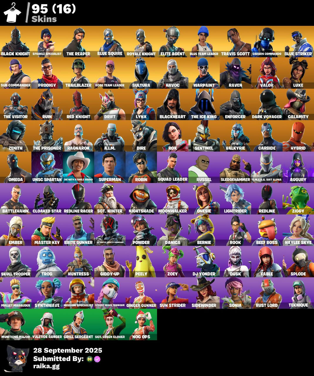 A.I.M., Augury, Battlehawk, Beef Boss, Bernie, Black Knight, Blackheart, Blue Squire, Blue Striker, Blue Team Leader, Brite Gunner, Calamity, Carbide, Carbon Commando, Cloaked Star, DJ Yonder, Danica, Dark Voyager, Die With A Smile Bruno, Dire, Drift, Dusk, Elite Agent, Ember, Enforcer, Fable, Giddy-Up, Ginger Gunner, Grill Sergeant, Havoc, Haylee Skye, Huntress, Hybrid, Lightrider, Luxe, Lynx, Master Key, Mission Specialist, Moonwalker, Mullet Marauder, Munitions Major, Nightshade, Nog Ops, O.M.E.G.A. Suit Alpha, Omega, Onesie, Peely, Powder, Prodigy, Ragnarok, Raven, Red Knight, Redline, Redline Racer, Robin, Rook, Rose Team Leader, Rox, Royale Knight, Ruin, Russel, Rust Lord, Sentinel, Sgt. Green Clover, Sgt. Winter, Sidewinder, Skull Trooper, Sledgehammer, Sonia, Sparkle Specialist, Splode, Squad Leader, Street Wave Teknique, Sub Commander, Sultura, Sun Strider, Superman, Synthwave, Teknique, The Ice King, The Prisoner, The Reaper, The Visitor, Trailblazer, Travis Scott, Trog, UNSC Spartan, Valkyrie, Valor, Warpaint, Yuletide Ranger, Zenith, Ziggy, Zoey