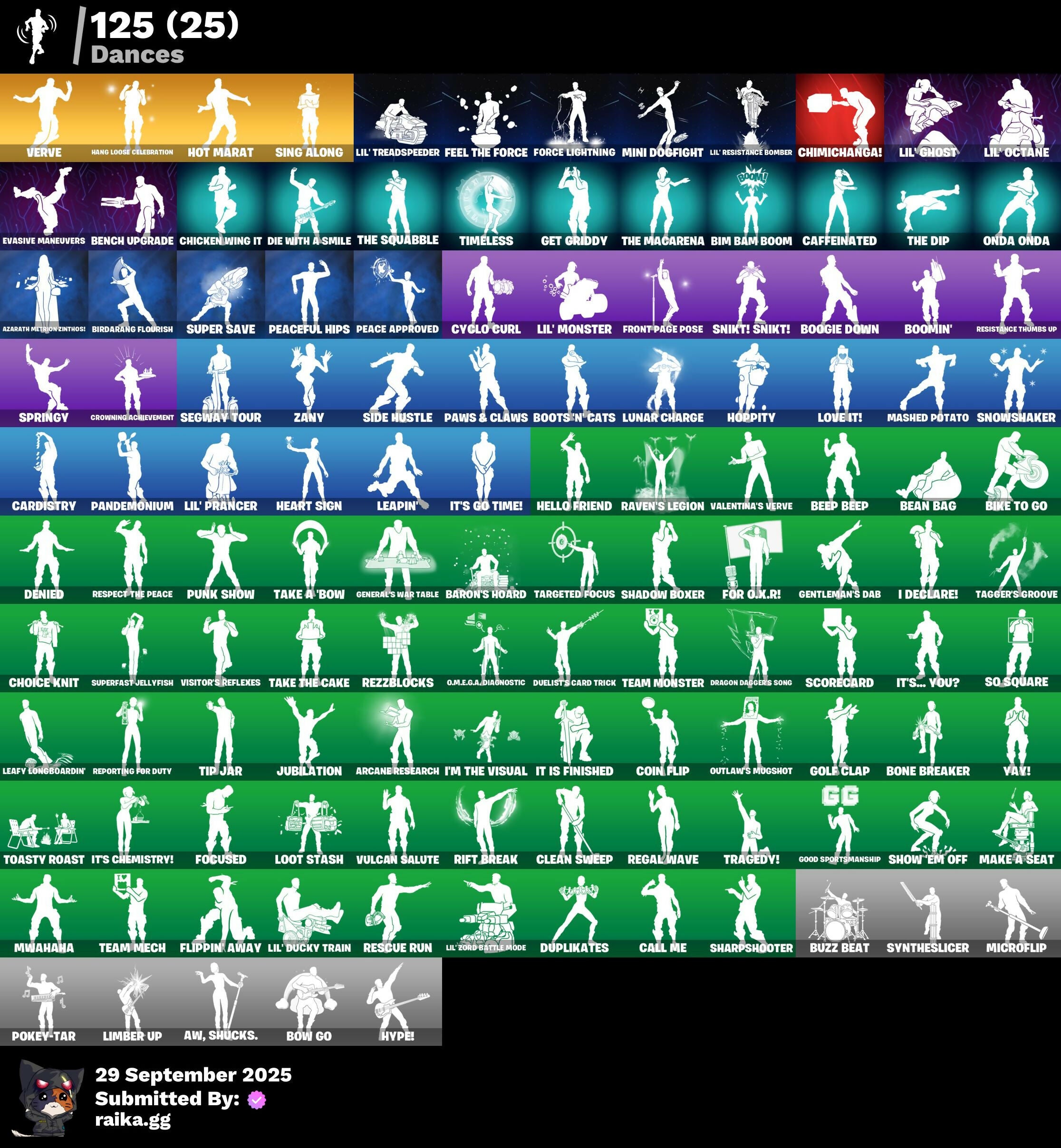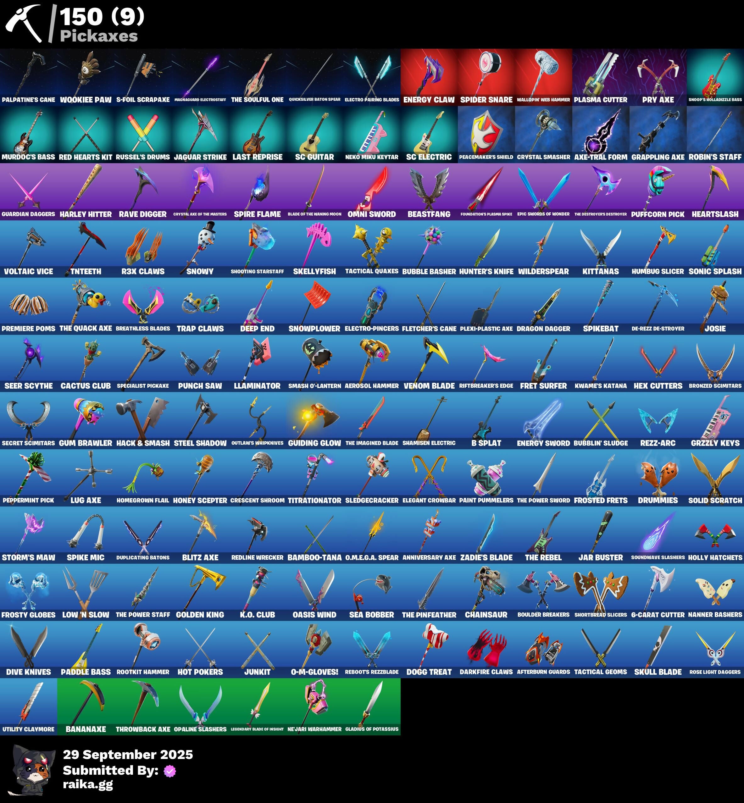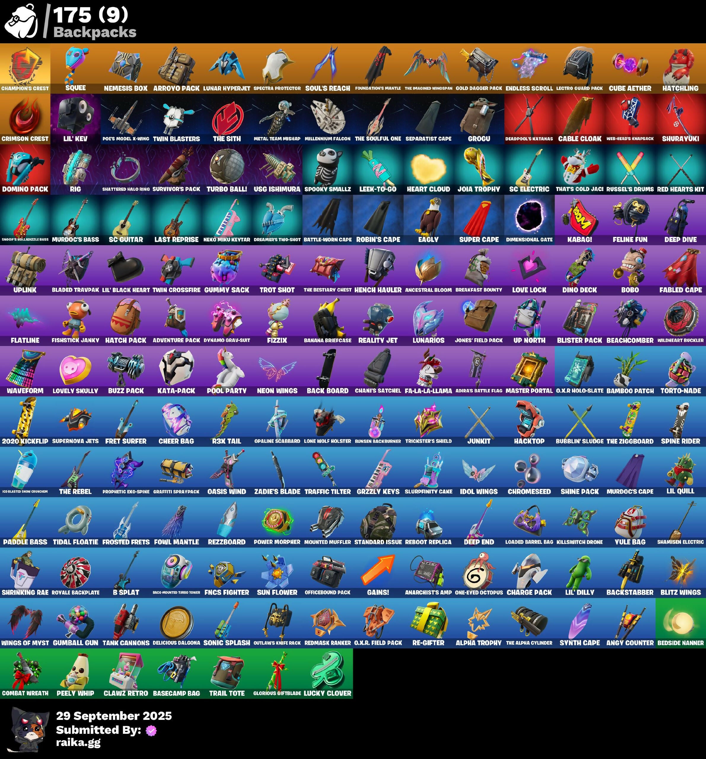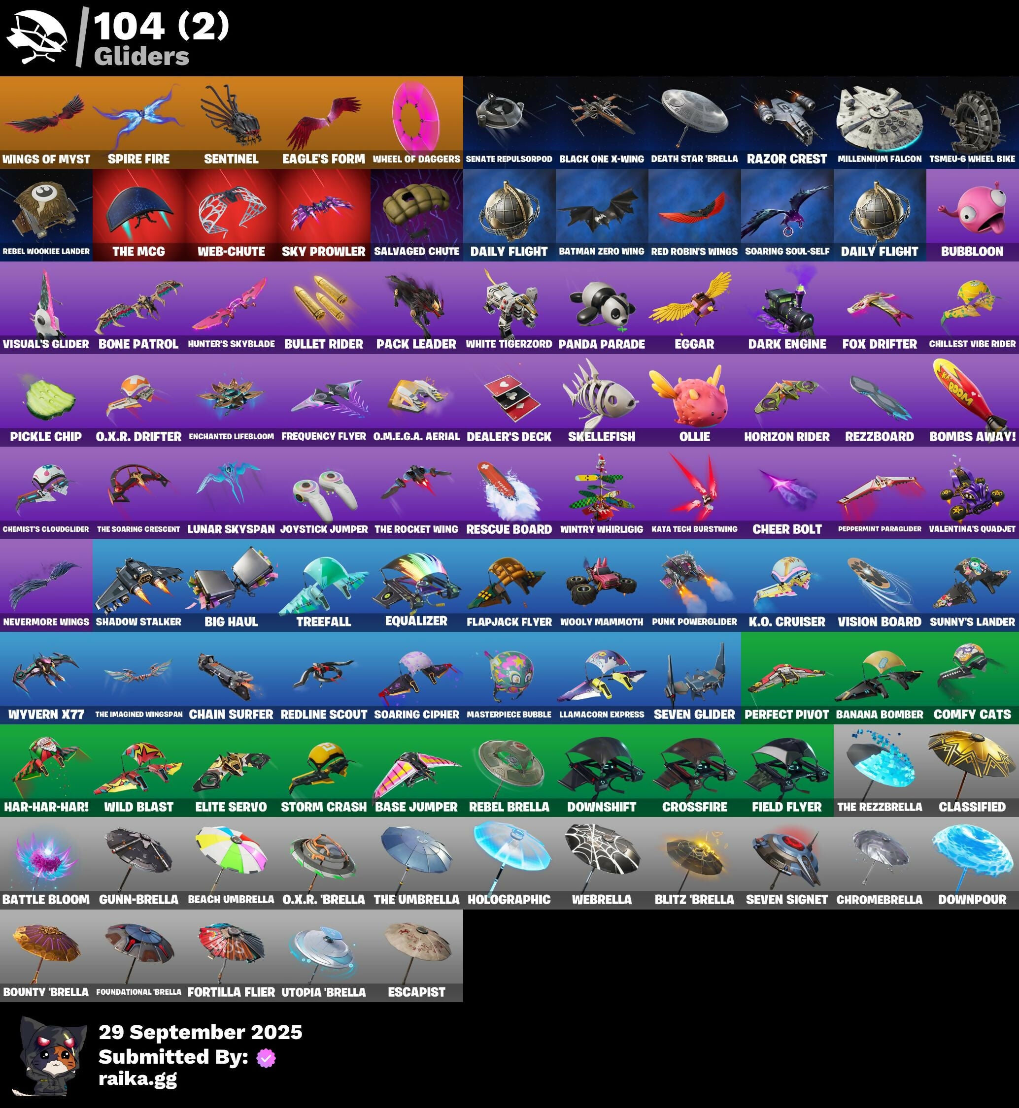 'Base Jumper, 2020 Kickflip, 6-Carat Cutter, Adira's Battle Flag, Adventure Pack, Aerosol Hammer, Afterburn, Afterburn Guards, Aftermath, Agent Jones, Agent Patch, Agent Peely, Alli, Alpha Trophy, Anarchist's Amp, Ancestral Bloom, Angy Counter, Anniversary Axe, Apprentice Evie, Arcane Research, Arctic Adeline, Arroyo Pack, Augury, Aw, Shucks., Axe-Tral Form, Ayla Winn, Azarath Metrion Zinthos!, B Splat, Back Board, Backstabber, Bamboo Patch, Bamboo-Tana, Banana Bomber, Banana Briefcase, Bananaxe, Baron's Hoard, Basecamp Bag, Batman Zero, Batman Zero Wing, Battle Bloom, Battle Gamer Mae, Battle-Worn Cape, Beach Umbrella, Beachcomber, Bean Bag, Beastfang, Bedside Nanner, Beep Beep, Bench Upgrade, Bernie, Big Dill, Big Haul, Bike To Go, Bim Bam Boom, Birdarang Flourish, Birdie, Bisc-Mounted Turbo Tower, Black One X-Wing, Bladed Travpak, Blister Pack, Blitz 'Brella, Blitz Axe, Blitz Wings, Bobo, Bombs Away!, Bone Breaker, Bone Patrol, Bones, Boogie Down, Boomin', Boots 'N' Cats, Boulder Breakers, Bounty 'Brella, Bow Go, Breakfast Bounty, Breathless Blades, Bronzed Scimitars, Brutus, Bubble Basher, Bubblin' Sludge, Bubbloon, Bullet Rider, Bunsen Backburner, Buzz Beat, Buzz Pack, Cable, Cable Cloak, Cactus Club, Caffeinated, Call Me, Captain Phasma, Cardistry, Carmine Rosso, Cassidy Quinn, Chain Surfer, Chainsaur, Champion's Crest, Chan's Satchel, Chani, Charge Pack, Cheer Bag, Cheer Bolt, Chemist's Cloudglider, Chicken Wing It, Chillest Vibe Rider, Chimichanga!, Choice Knit, Chromebrella, Chromeseed, Classified, Clawz Retro, Clean Sweep, Cluck, Coin Flip, Combat Wreath, Comfy Cats, Cosmic Infinity, Crescent Shroom, Crimson Crest, Crossfire, Crowning Achievement, Crystal Smasher, Cube Aether, Cyclo Curl, Daily Flight, Danica, Dark Engine, Darkfire Claws, De-Rezz De-Stroyer, Deadpool, Deadpool's Katanas, Dealer's Deck, Death Star 'Brella, Deep Dive, Deep End, Delicious Dalgona, Denied, Diamond Diva, Diamond Hanz, Die With A Smile, Die With A Smile Bruno, Dimensional Gate, Dino Deck, Dino Megazord, Dive Knives, Dogg Treat, Domino, Domino Pack, Downpour, Downshift, Dragon Dagger, Dragon Dagger's Song, Dreamer's Two-Shot, Drummies, Duelist's Card Trick, Dupli-Kate, Duplicating Batons, Duplikates, Dusk Knight, Dynamo Grav-Suit, Eagle's Form, Eagly, Eggar, Electro-Pincers, Elegant Crowbar, Elite Servo, Enchanted Lifebloom, Endless Scroll, Energy Claw, Energy Sword, Equalizer, Escapist, Evasive Maneuvers, FNCS Fighter, Fa-La-La-Llama, Fabled Cape, Feel The Force, Feline Fun, Field Flyer, Fishstick Janky, Fizzix, Flapjack Flyer, Flatline, Fletcher Kane, Fletcher's Cane, Flippin' Away, Focused, For O.X.R.!, Force Lightning, Fortilla Flier, Foundation's Mantle, Foundational 'Brella, Fowl Mantle, Fox Drifter, Frequency Flyer, Fret Surfer, Front Page Pose, Frosted Frets, Frosty Globes, Gains!, Gear Specialist Maya, General's War Table, Gentleman's Dab, Get Griddy, Gladius Of Potassius, Glorious Giftblade, Gold Dagger Pack, Golden King, Golf Clap, Good Sportsmanship, Graffiti Spraypack, Grappling Axe, Green Ranger, Grizzly Keys, Grogu, Grzzly Keys, Guardian Daggers, Guiding Glow, Gum Brawler, Gumball Gun, Gumbo, Gummy Sack, Gunn-Brella, Gunnar, Hack & Smash, Hacktop, Han Solo, Hang Loose Celebration, Har-Har-Har!, Harley Hitter, Harlowe, Hatch Pack, Hatchling, Haven, HaxSaur, Haylee Skye, Heart Cloud, Heart Sign, Heartslash, Hello Friend, Hench Hauler, Hex Cutters, Holiday Boxy, Holly Hatchets, Holographic, Homegrown Flail, Honey Scepter, Hoppity, Horizon Rider, Hot Marat, Hot Pokers, Humbug Slicer, Hunter's Knife, Hunter's Skyblade, Hype!, I Declare!, I'm The Visual, Ice-Blasted Snow Crunch'em, Idol Wings, Isaac Clarke, It Is Finished, It's Chemistry!, It's Go Time!, It's... You?, Jaguar Strike, Jar Buster, Joia Trophy, Jones' Field Pack, Jonkit, Josie, Joss, Joystick Jumper, Jubilation, Junkit, K.O. Club, K.O. Cruiser, Kabag!, Kata Tech Burstwing, Kata-Pack, Kiara K.O., Killswitch, Killswitch Drone, Kittanas, Krisabelle, Kwame, Kwame's Katana, Lara Croft, Last Reprise, Leafy Longboardin', Leapin', Lectro Guard Pack, Leek-To-Go, Lightrider, Lil Quill, Lil' Black Heart, Lil' Dilly, Lil' Ducky Train, Lil' Ghost, Lil' Kev, Lil' Monster, Lil' Octane, Lil' Prancer, Lil' Resistance Bomber, Lil' Treadspeeder, Lil' Zorb's Battle Mode, Limber Up, Llamacorn Express, Llambro, Llaminator, Loaded Barrel Bag, Lone Wolf Holster, Loot Stash, Love It!, Love Lock, Lovely Skully, Low 'N Slow, Lt. Evergreen, Lt. John Llama, Lt. Ripp Slade, Lucky Clover, Lug Axe, Lunar Charge, Lunar Hyperjet, Lunar Skyspan, Lunarios, Make A Seat, Mancake, Mandalorian, Marika, Mashed Potato, Master Portal, Masterpiece Bubble, Mave, Mecha R3X, Meowscles, Metal Team Mishap, Microflip, Midas, Millennium Falcon, Min-Joon, Mini Dogfight, Morgan Myst, Mounted Muffler, Murdoc, Murdoc's Bass, Murdoc's Cape, Mwahaha, Nanner Bashers, Nejari Warhammer, Neko Hatsune Miku, Neko Miku Keytar, Nemesis Box, Neon Wings, Nevermore Wings, Neymar Jr, Nyangelica, O-M-Gloves!, O.M.E.G.A. Aerial, O.M.E.G.A. Diagnostic, O.M.E.G.A. Spear, O.M.E.G.A. Suit Alpha, O.X.R Field Pack, O.X.R Holo-Slate, O.X.R. 'Brella, O.X.R. Drifter, Oasis Wind, Officebound Pack, Ollie, Omni Sword, Onda Onda, One-Eyed Octopus, Onyx Winter, Opaline Scabbard, Opaline Slashers, Outlaw Midas, Outlaw's Knife Rack, Outlaw's Mugshot, Pack Leader, Paddle Bass, Paint Pummellers, Palpatine's Cane, Panda Parade, Pandemonium, Paws & Claws, Peace Approved, Peaceful Hips, Peacemaker, Peacemaker's Shield, Peely Whip, Peppermint Paraglider, Peppermint Pick, Perfect Pivot, Pickle Chip, Plasma Cutter, Plexi-Plastic Axe, Poe Dameron, Poe's Model X-Wing, Pokey-Tar, Polar Peely, Polly, Pool Party, Power Morpher, Power Punk, Predator, Premiere Poms, Prophetic Exo-Spine, Prowler, Pry Axe, Psylocke, Puffcorn Pick, Punch Saw, Punk Powerglider, Punk Show, R3X Claws, R3X Tail, Rave Digger, Raven's Legion, Raz, Razor Crest, Re-Gifter, Reality Jet, Rebel Brella, Rebel Oro, Rebel Wookiee Lander, Rebirth Raven, Reboot Man