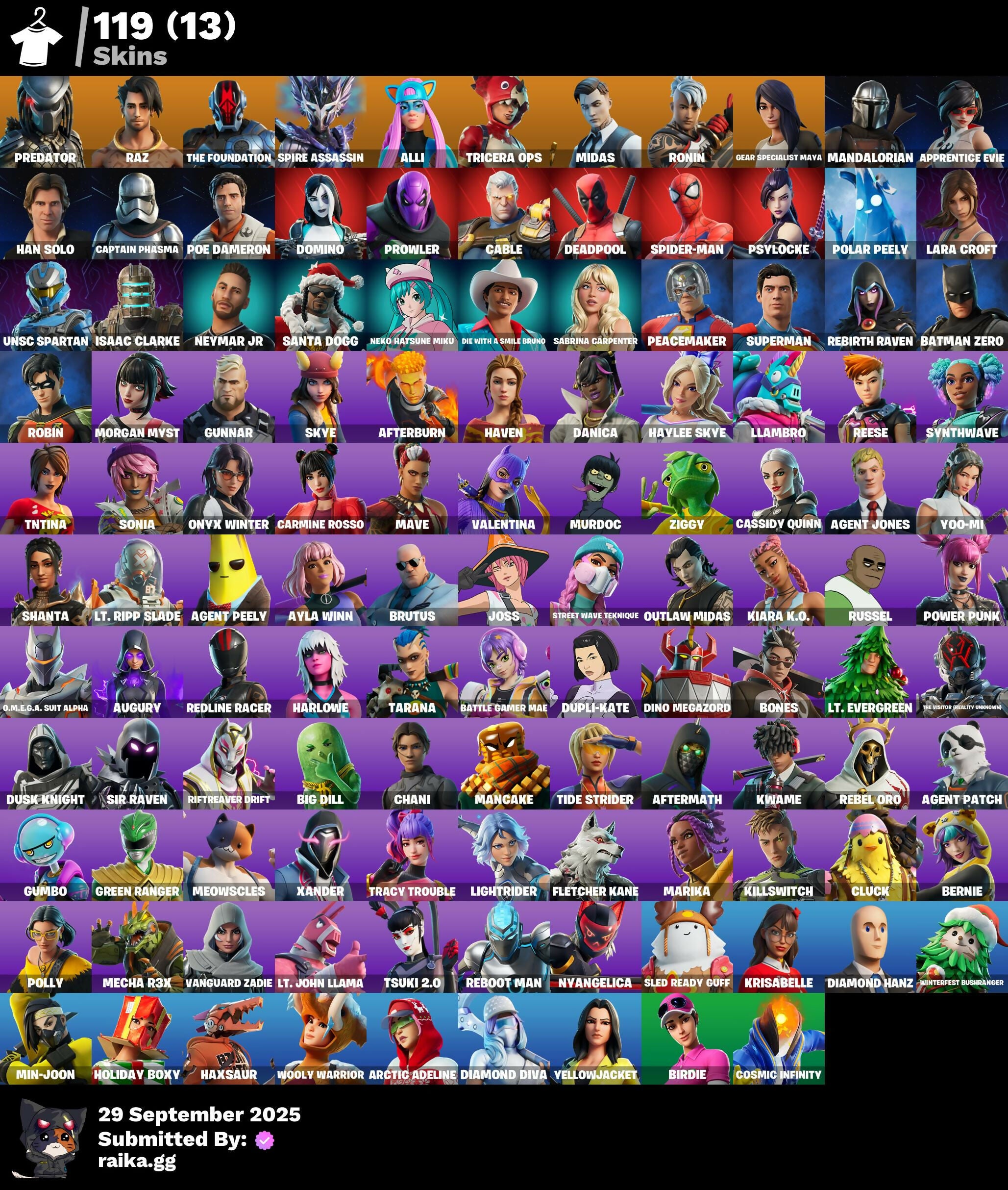 [PC/XBOX] 119 skins | Predator | Raz | The Foundation | Spire Assassin | Alli | Tricera Ops | Midas | Ronin | Gear Specialist Maya | Mandalorian | 120 VB