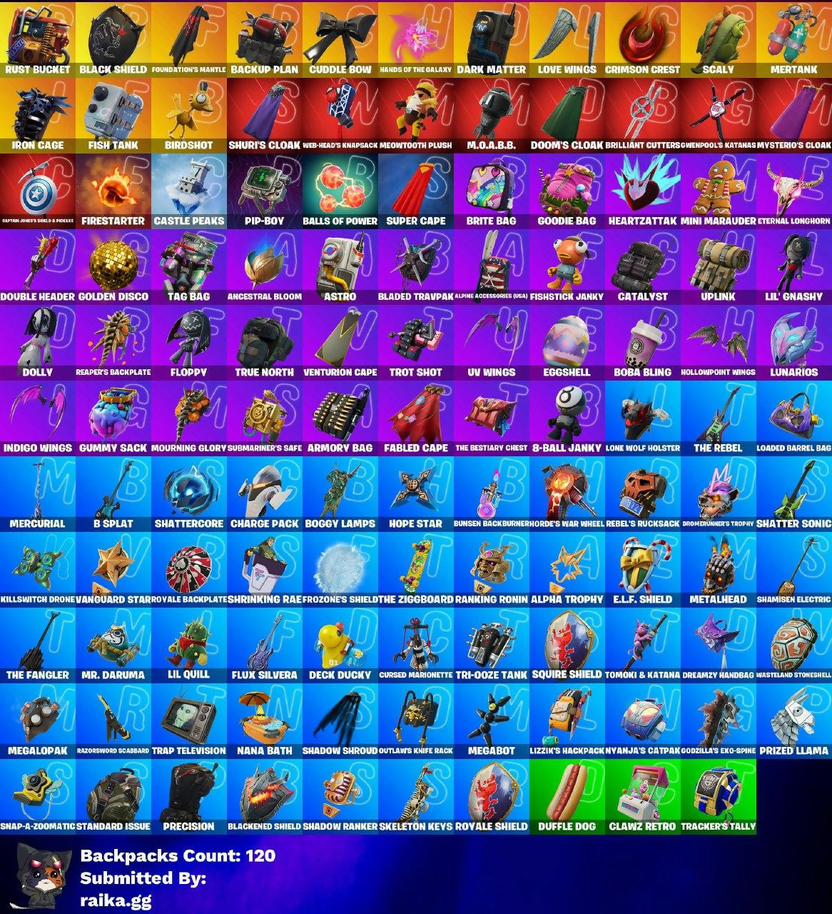 8-Ball Janky, Abstrakt, Alpha Trophy, Alpine Accessories (USA), Alpine Ace (USA), Ancestral Bloom, Armory Bag, Astro, B Splat, B.R.U.T.E. Gunner, Backlash, Backup Plan, Balls Of Power, Bandolier, Battlehawk, Billy, Birdshot, Black Knight, Black Shield, Blackened Shield, Blacklight, Bladed Travpak, Blaze, Blizzabelle, Blue Squire, Blue Team Leader, Boba Bling, Boggy Lamps, Bogstick, Brilliant Cutters, Brite Bag, Brite Bomber, Brite Gunner, Bunny Brawler, Bunsen Backburner, Burnoff, Calamity, Camille, Captain Jones, Captain Jones's Shield & Pickaxe, Carbide, Cassidy Quinn, Castle Peaks, Catalyst, Catrina, Charge Pack, Clawz Retro, Codename E.L.F., Crackshot, Crimson Crest, Cuddle Bow, Cuddle Team Leader, Cursed Marionette, DJ Yonder, Daigo, Dalgona Destroyer, Dara, Dark Matter, Dark Voyager, Ddakji Defender, Deck Ducky, Dolly, Doom, Doom's Cloak, Double Header, Dreamzy Handbag, Drift, Dromrunner's Trophy, Duffle Dog, Dusk Knight, E.L.F. Shield, Eggshell, Elite Agent, Emma Frost, Eternal Longhorn, Fabled Cape, Felina, Firestarter, Fish Tank, Fishstick Janky, Fletcher Kane, Floppy, Flux Silvera, Flying Stone Fighter, Foundation's Mantle, Frozen Fishstick, Frozen Nog Ops, Frozone, Frozone's Shield, Funk Ops, Galaxy Grappler, Games Guard, Games Manager, Giddy-Up, Glass Bridge Survivor, Gnash, Godzilla Evolved, Godzilla's Exo-Spine, Golden Disco, Gong-Gi, Goodie Bag, Grave, Great The Night, Green Light Guardian, Guff Gringle, Gumbo, Gummy Sack, Gunslinger Calamity, Gwenpool, Gwenpool's Katanas, Hands Of The Galaxy, Harlowe, Haven, Havoc, Heartzattak, Hero Baymax, Hollowpoint Wings, Hope, Hope Star, Horde's War Wheel, Huntress, Indigo Wings, Iron Cage, Jade, Jegi Juggler, Joss, Jumpshot, Kendo, Killswitch Drone, Krisabelle, Leviathan, Lil Quill, Lil' Gnashy, Liteshow, Lizzik, Lizzik's Hackpack, Loaded Barrel Bag, Lone Wolf Holster, Love Ranger, Love Wings, Lt. John Llama, Lunarios, Lustrous Luxe, M.O.A.B.B., Marble Maven, Megabot, Megalopak, Meowtooth Plush, Mercurial, Merry Marauder, Mertank, Metalhead, Mini Marauder, Mission Specialist, Moisty Merman, Moonwalker, Mourning Glory, Mr. Daruma, Mysterio, Mysterio's Cloak, Nana Bath, Nitehare, Nitelite, Nyanja, Nyanja's Catpak, Outlaw Midas, Outlaws Knife Rack, Peelverine, Pentathlon Perfector, Pip-Boy, Polar Peely, Precision, Prized Llama, Ranking Ronin, Raven, Razorsword Scabbard, Reaper's Backplate, Rebel's Rucksack, Redline, Relaxed Runner, Reverie, Rex, Rogue Agent, Ronin, Rose, Royale Knight, Royale Shield, Rust Bucket, Rust Lord, Sash Sergeant, Scaly, Shadow Blade, Shadow Ranker, Shadow Shroud, Shamisen Electric, Shanta, Shatter Sonic, Shattercore, Shrinking Rae, Shuri, Shuri's Cloak, Skeleton Keys, Snap-A-Zoomatic, Snorkel Ops, Sparkle Specialist, Sparx, Spider-Man, Squire Shield, Standard Issue, Starrovale Backplate, Sub Commander, Submariner's Safe, Super Cape, Tag Bag, Teknique, The Bestiary Chest, The Brat, The Devourer, The Fangler, The Goldfish, The Reaper, The Rebel, The Ziggboard, TheGrefg, They're Back-Lash, Tomoki & Katana, Tracker's Tally, Trailblazer, Trap Television, Tri-Ooze Tank, Trot Shot, True North, Tug Of War Titan, UV Wings, Uplink, Valor, Vanguard, Venturion, Venturion Cape, Violet, Void Warrior Absent, War Machine, Wasteland Stoneshell, Web-Head's Knapsack, Whiplash, Willow, Zoey