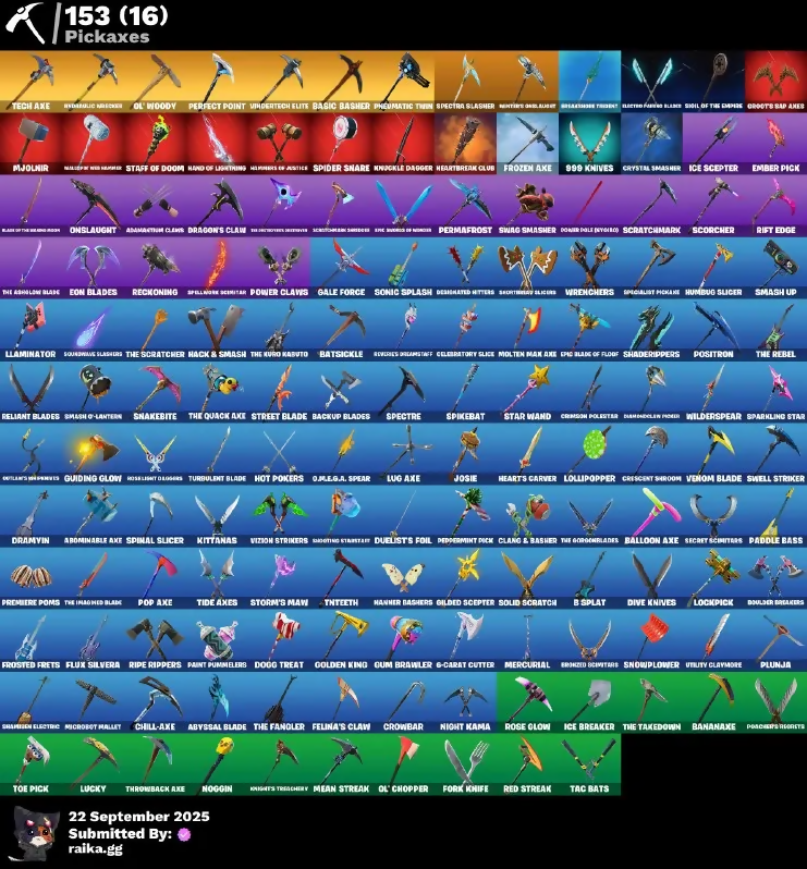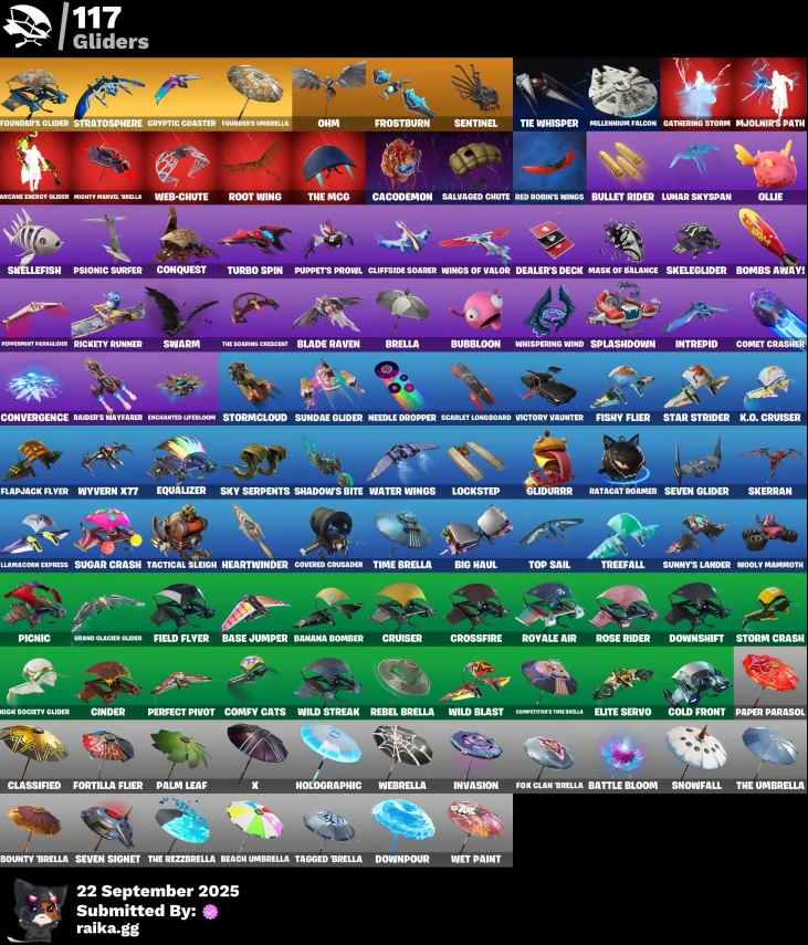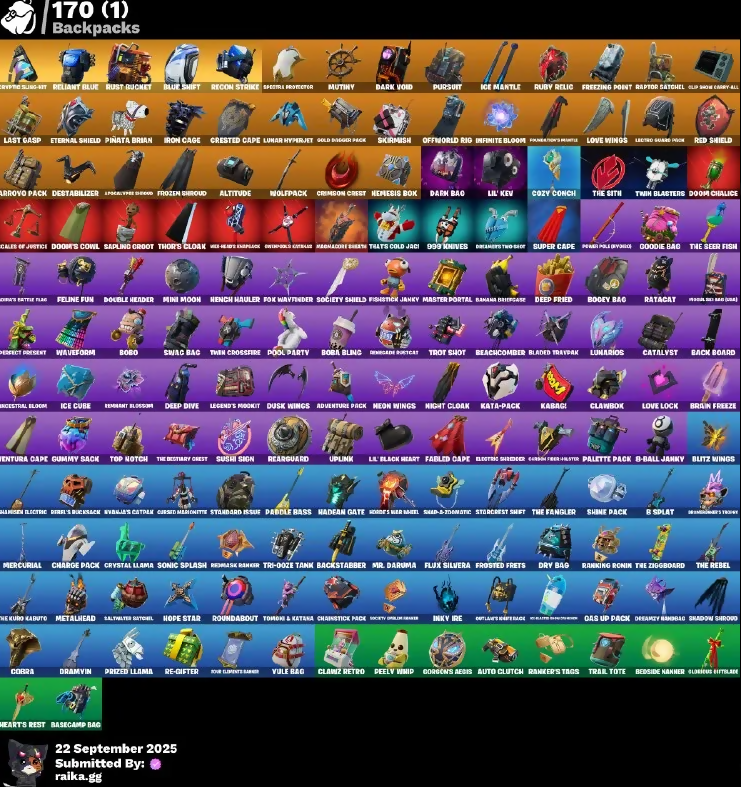 6-Carat Cutter, 8-Ball Janky, 999 Knives, A Abominable Axe, A.I.M. Heartbreaker Ranger, Absenz, Absolute Zero, Abyssal Blade, Adamantium Claws, Adventure Pack, Agent Peely, Air Shredder, Altitude, Ancestor Bloom, Aphrodite, Arcane Energy Glider, Arroyo Pack, Artemis Summer, Assault Trooper, Aura, Auto Clutch, Avalina Catraz, B Splat, Back Board, Backstabber, Backup Blades, Balloon Axe, Banana Bomber, Banana Briefcase, Bananaxe, Base Jumper, Basecamp Bag, Basic Basher, BattSickle, Battle Bloom, Battle Call, Battle Hound, Battlehawk, Beach Umbrella, Beachcomber, Bearashmere Trident, Bedside Hammer, Beef Boss, Beep Beep, Beerus, Behold!, Big Haul, Blackheart, Blade Raven, Blade of the Burning Moor, Bladed Travvak, Blitz, Blitz Wings, Blue Shift, Blue Striker, Bobi Bling, Bodey Bag, Bogo, Bombs Away!, Boulder Breakers, Bounty 'Brella, Brain Freeze, Breakdown, Breaking Point, Breezy, Brella, Brilliant Striker, Brite Bomber, Bronzed Scimitars, Brutus, Bubbloon, Buckets, Bullet Rider, Bunker Jonesy, Business Upfront, Cacodemon, Calamity, Calculated, Call Me, Carbide, Carbon Fiber Blaster, Card Drop, Cat Flip, Catalyst, Celebratory Slice, Cerberus, Chainstick Pack, Charge Pack, Chill-Axe, Choice Knit, Cinder, Clang & Basher, Classified, Clawbok, Clawz Retro, Clean Sweep, Cliffside Soarer, Cluck Strut, Cobra, Coin Flip, Cold Front, Comet Crasher, Comfy Cats, Commando, Competitor's Time Brella, Conch Call, Conga, Conquest, Convergence, Covered Crusader, Cozy Conch, Crescent Shroom, Crested Cape, Crimson Crest, Crimson Polarstar, Crossbows Engaged, Crossfire, Crowbar, Cruiser, Cryptic Coaster, Cryptic Slug-It, Crystal, Crystal Llama, Crystal Smasher, Cyclo Curl, DJ Yonder, Dagger Dance, Dark Bag, Dark Bomber, Dark Vanguard, Dark Void, Deadpool, Dealer's Deck, Deep Dive, Deep Fried, Denied, Destabilizer, Diamond Diva, Diamond Throne, Diamondclaw Power, Dire, Disco Fever, Dive Knives, Do The Split, Doctor Doom, Dog Party, Dogg Treat, Doom Chalice, Doom's Cowl, Doominated Hitters, Double Header, Dourar Dale (Envoyro), Downpour, Downshift, Doze Dab, Dragon Stance, Dragon's Claw, Dramvin, Dreamer's Two-Shot, Dreamy Hangbag, Drift, Drum Major, Dry Bag, Duelist's Foil, Dusk, Dusk Wings, Electric Shredder, Electro Flared Lancer, Elite Servo, Ember, Ember Pick, Enchanted Lifebloom, Energy Electric, Eon Blades, Epic Blade of Floof, Epic Swords of Honor, Equalizer, Eternal Knight, Eternal Shield, Fable, Fabled Cape, Fade, Felina, Felina's Claw, Feline Fun, Field Flyer, Finger Guns, Fishstick, Fishstick Janky, Fishy Flier, Fist Bump, Flamenco, Flapjack Flyer, Flashfire Eversion, Flippin’ Away, Flux Silvera, Foil Flex, Fork Knife, Fortilla Flier, Founder's Glider, Founder's Umbrella, Fox Clan Brella, Free Flow, Freezing Point, Fresh, Frostbite, Frostburn, Frosted Frets, Frozen Axe, Frozen Shroud, Full Tilt, Gale Force, Gas Up Pack, Gathering Storm, Gear Specialist Maya RX, Gentleman’s Dab, Get Funky, Ghost Magnetts, Ghost's Sad Axes, Giddy-Up, Gilded Scepter, Glidurr, Gold Digger Pack, Gold Midas, Golden King, Golf Clap, Goodie Bag, Gorgcaps Regen, Grand Glacier Glider, Groot, Groove Jam, Guiding Glow, Guitar Walk, Gum Brawler, Gumbo, Gummy Sack, Hack & Smash, Hammer Bashers, Hammers of Justice, Hand of Lightning, Harlowe, Harmony, Haven, Heart Sign, Heart's Carver, Heart's Rest, Heartbreak Club, Heartwinder, Hello Friend, Hench Hauler, High Society Glider, Holiday Boxy, Holographic, Hope, Hope Star, Hot Marat, Hot Pokers, Hula, Humbug Slicer, Huntress, Hybrid, Hype, Hype!, Hypnot Eyes, I Declare!, Ice Breaker, Ice Cube, Ice Mantle, Ice Scepter, Imperial March, Infinite Bloom, Infinite Dab, Inky Ire, Intrepid, Introducing..., Invasion, Iris, Iron Cage, It Is Finished, It’s Go Time!, It’s... You?, I’m A Mystery, Jennifer Walters, Jet Signals, Josie, Jubilation, Jules, K.O. Cruiser, Kabagi, Kata-Pack, Keep It Mello, Keyed Up, Kick Ups, Kit, Kittanas, Knife Sharpener, Knight's Treacher, Knox's War Brite, Knuckle Dagger, Last Gasp, Lavish, Lazer Blast, Legend's Hookit, Lil Split, Lil' Black Heart, Lil' Kev, Lil’ Longboat, Lil’ Monster, Llamacorn Express, Llaminator, Loaded Updater, Lockpick, Lockstep, Lollipopper, Love It!, Love Lock, Love Ranger, Lovie Wings, Lt. Evergreen, Lt. John Llama, Lucky, Lug Axe, Luna Scorch, Lunar Charge, Lunar Hyperjet, Lunar Skyspan, Lunarios, Lynx, Make A Seat, Mal'Dyur's War Hammer, Marko Marauder, Mask of Balance, Master Portal, Mean Streak, Mech-Alld Repulser, Medusa, Megalooted Sheath, Meowscles, Mercurial, Metalhead, Mic Drop, Microbot Mallet, Mighty Marvel Brella, Millennium Falcon, Mini Moon, Mjolnir, Mjolnir's Path, Mogul Master (USA), Molten Max Axe, Montague, Mothrider Dual Blades, Mr. Daruma, Munitions Expert, Mutiny, Mwahaha, My Cabbages!, Nadean Gate, Nana Nana, Needle Dropper, Nemesis Box, Neon Wings, Night Cloak, Night Kama, Nightshade, Ninja Stance: Leo, Nisha, Nog Ops, Noggin, O.M.E.G.A. Spear, Oblivion, Oblivion's Keyblade, Ocean, Offworld Rig, Ohm, Ol' Chopper, Ol' Woody, Ollie, Omega, Omegarok, Onesie, Onslaught, Orange Justice, Oscar, Outlaw's Heritage, Outlaw's Morning Kiss, Paddle Bass, Paint Punmlers, Palette Pack, Palm Leaf, Pandemonium, Paper Parasol, Paws & Claws, Peace Out, Pebble Bass, Peely, Peely Whip, Penny Pols (Override), Peppermint Paraglider, Peppermint Pick, Perfect Pivot, Perfect Point, Permafrost, Peter Griffin, Picnic, Pinata Brian, Pizza Party, Planetary Vibe, Plunja, Pneumatic Twin, Pockertip Knickers, Point It Out, Point Patroller, Polar Peely, Pop Axe, Pop Lock, Popcorn, Poseidon, Positron, Powder, Power Claws, Pox Wayfinder, Premiere Poms, Prized Llama, Psionic Surfer, Puppet's Prowl, Pursuit, Quick Bite, Ragnarok, Raider's Wayfarer, Rambunctious, Ranker's Tags, Ranking Ronin, Raptor, Raptor Satchel, Ratacat, Ratcat Roamer, Raven, Raver's Dreamstaff, Re-Gifter, Rearguard, Rebel Brella, Reckoning, Recon Commander, Recon Strike, Red Knight, Red Robin's Wings, Red Shield, Red Streak, Redline, Redmask Bunker, Regal Wave, Reliant B