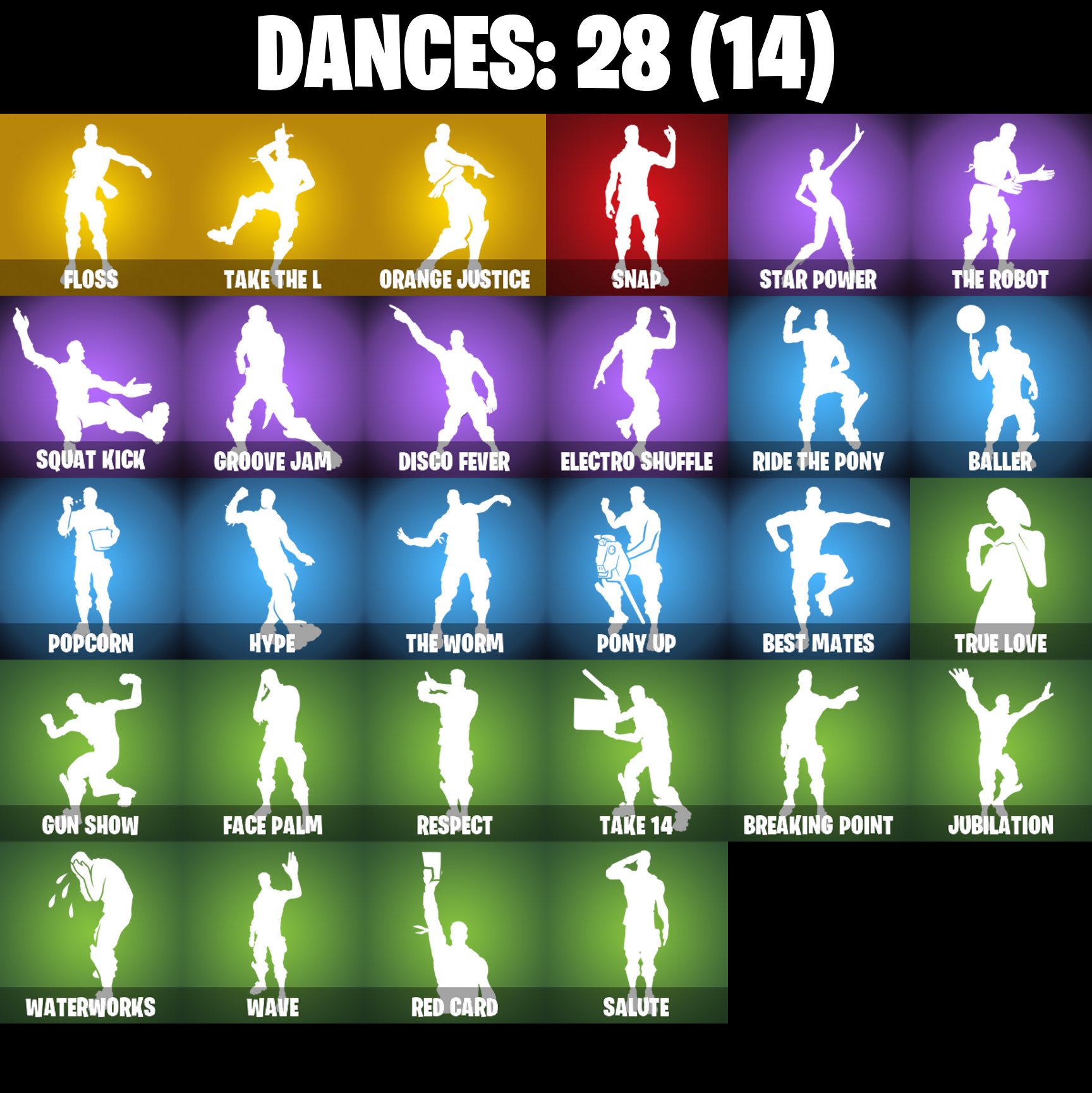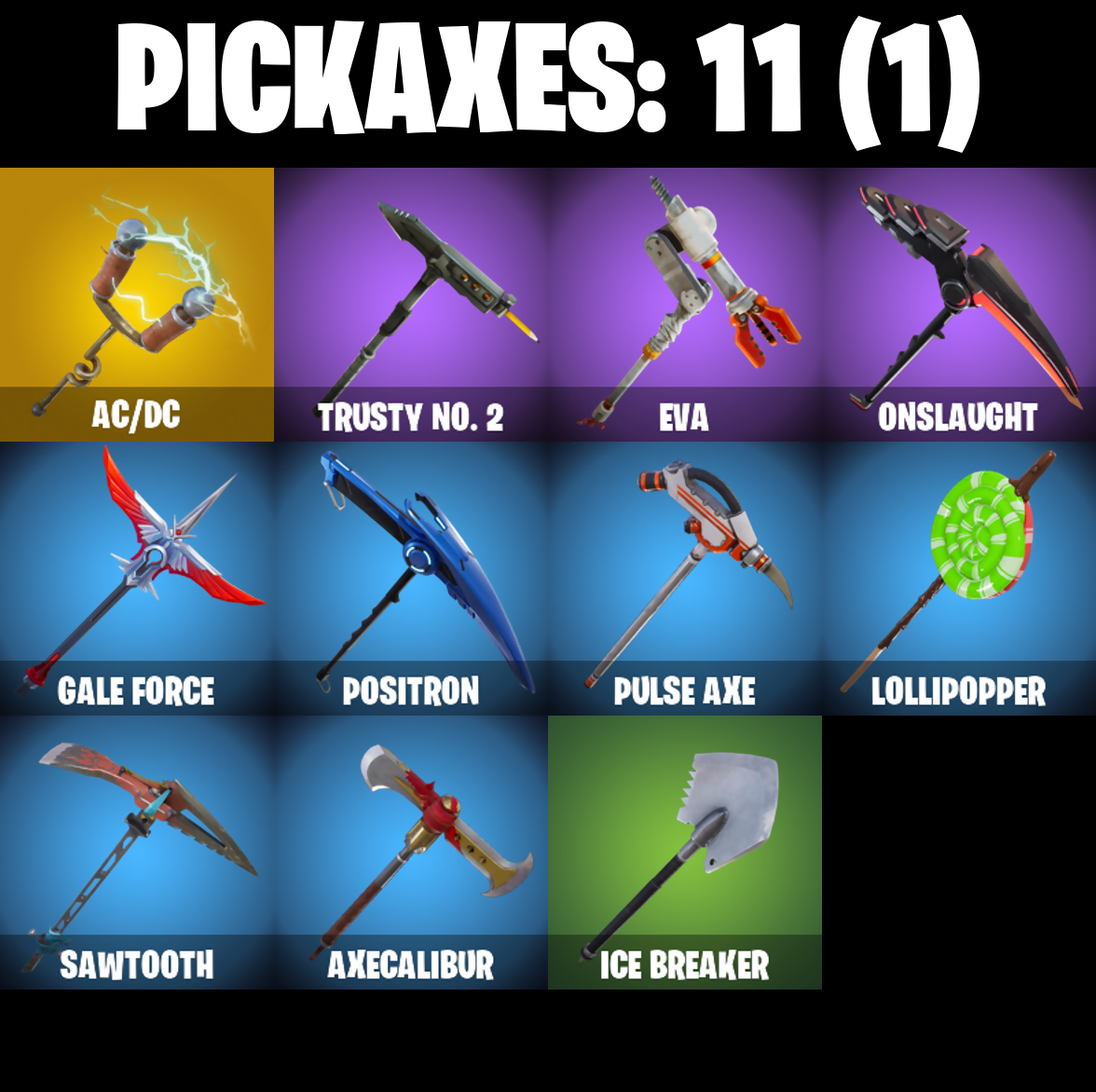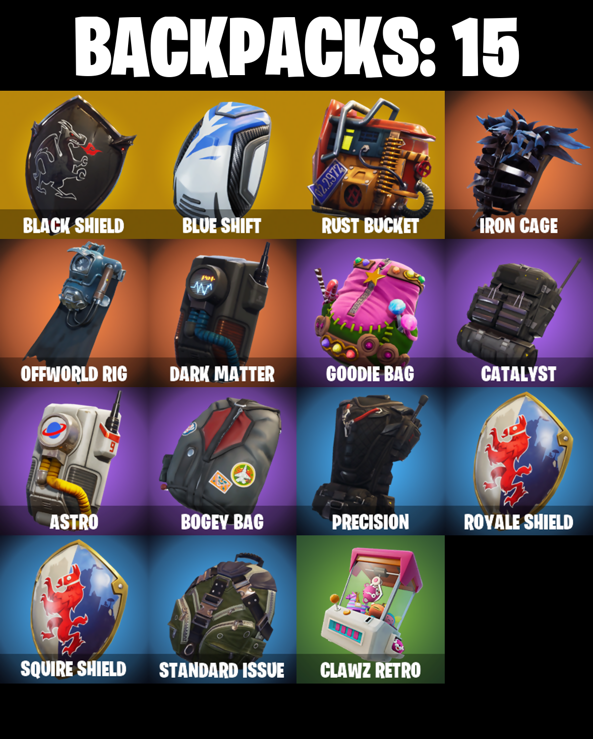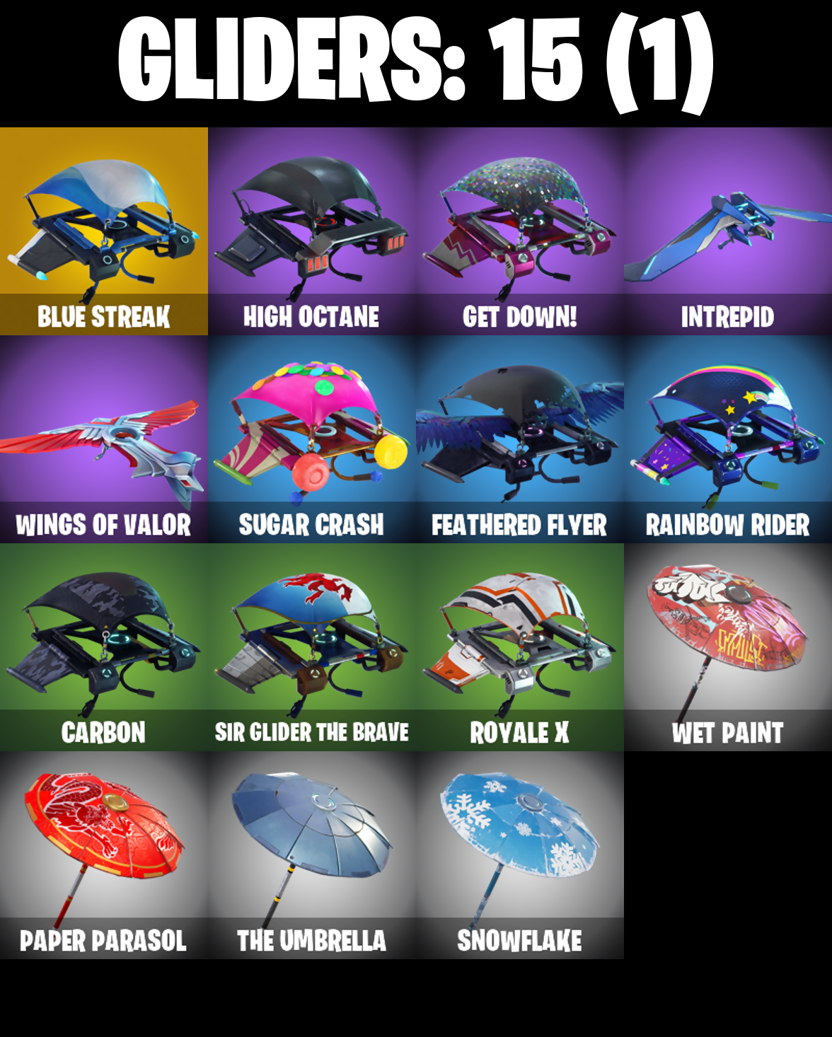 Ac/Dc, Astro, Axecalibur, Baller, Battlehawk, Best Mates, Black Knight, Black Shield, Blue Shift, Blue Squire, Blue Streak, Blue Striker, Blue Team Leader, Bogey Bag, Breaking Point, Carbide, Carbide Armor Stage 5, Carbon, Catalyst, Clawz Retro, Dark Matter, Dark Voyager, Disco Fever, Electro Shuffle, Elite Agent, Eva, Face Palm, Feathered Flyer, Floss, Gale Force, Get Down!, Goodie Bag, Groove Jam, Gun Show, High Octane, Hype, Ice Breaker, Intrepid, Iron Cage, Jubilation, Lollipopper, Mission Specialist, Moonwalker, Offworld Rig, Omega, Onslaught, Orange Justice, Paper Parasol, Pony Up, Popcorn, Positron, Precision, Pulse Axe, Rainbow Rider, Raven, Red Card, Respect, Ride The Pony, Rogue Agent, Royale Knight, Royale Shield, Royale X, Rust Bucket, Rust Lord, Salute, Sawtooth, Sir Glider The Brave, Snap, Snowflake, Sparkle Specialist, Squad Leader, Squat Kick, Squire Shield, Standard Issue, Star Power, Sugar Crash, Take 14, Take The L, Teknique, The Reaper, The Robot, The Umbrella, The Visitor, The Worm, True Love, Trusty No. 2, Valor, Waterworks, Wave, Wet Paint, Wingman, Wings Of Valor, Zoey
