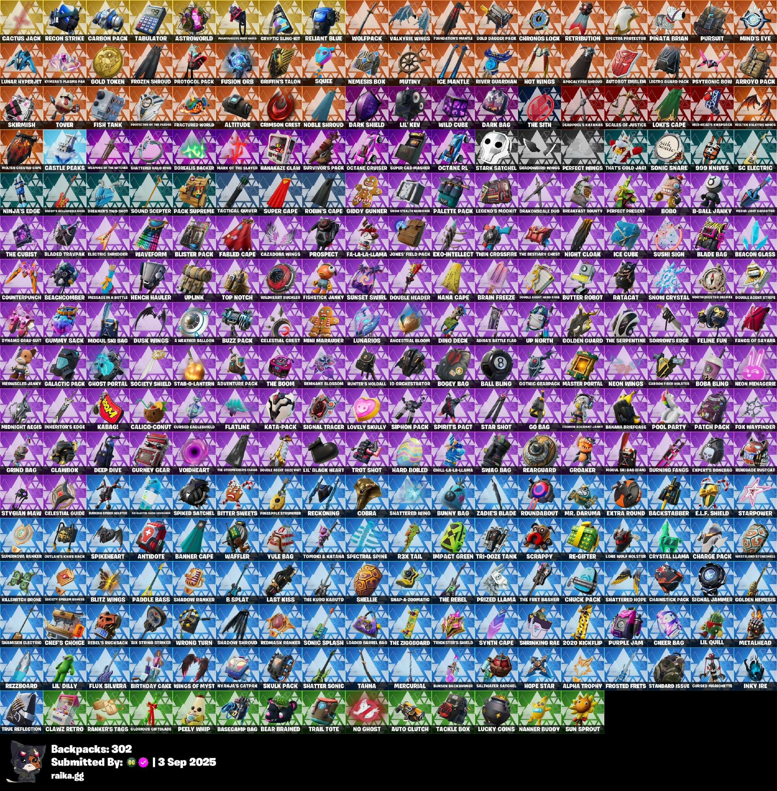 10 Orchestrator, 2020 Kickflip, 8-Ball Janky, 8-Ball vs Scratch, 999 Knives, A Weather Balloon, Absenz, Adira, Adira's Battle Flag, Adventure Pack, Aftermath, Agent Jones, Agent Peely, Alli, Alpha Trophy, Altitude, Ancestral Bloom, Anderson .Paak, Antidote, Apocalypse Shroud, Arctic Adeline, Arroyo Pack, Astrea, Astro Jack, Astroworld, Aura, Auto Clutch, Autobot Emblem, B Splat, B.R.U.T.E. Gunner, Backlash, Backstabber, Ball Bling, Banana Briefcase, Banner Cape, Basecamp Bag, Beachcomber, Beacon Glass, Bear Brained, Birdie, Birthday Cake, Bitter Sweets, Blackheart, Blade Bag, Bladed Travpak, Blister Pack, Blitz Wings, Blizzabelle, Blizzard Bomber, Boba Bling, Bobo, Bogey Bag, Borealis Backer, Brain Freeze, Breakfast Bounty, Breakpoint, Breezabelle, Brite Bomber, Bruno Mars, Bullseye, Bunker Jonesy, Bunny Bag, Bunsen Backburner, Burning Ember Holster, Burning Fangs, Butter Robot, Buzz Pack, Cactus Jack, Calamity, Calico-Coconut, Cameo vs Chic, Cammy, Carbon Fiber Holster, Carbon Pack, Carson Commando, Castle Peaks, Catalyst, Cazadora Wings, Celestial Crest, Celestial Guide, Chainstick Pack, Chaos Double Agent, Chaos Origins, Charge Pack, Charlotte, Cheer Bag, Chef's Choice, Chill-A-La Llama, Chronos Lock, Chuck Pack, Chun-Li, Clawbox, Clawz Retro, Cobra, Codename E.L.F., Counterpunch, Crimson Crest, Cryptic, Cryptic Sling-Kit, Crystal, Crystal Llama, Cube Assassin, Cursed Eagleshield, Cursed Marionette, D'ark, DJ Yonder, Dahlia, Dark Bag, Dark Bomber, Dark Jonesy, Dark Red Knight, Dark Shield, Dark Wild Card, Deadpool, Deadpool's Katanas, Deep Dive, Deimos, Demi, Dino Deck, Dire, Dizzie, Doctor Slone, Doom Slayer, Double Agent Doc's Kit, Double Agent Hard Case, Double Agent Husk, Double Agent Stripe, Double Agent Wildcard, Double Header, Dragon Steel Hybrid, Drakonscale Duo, Dream, Dreamer's Two-Shot, Drift, Dummy, Dusk, Dusk Knight, Dusk Wings, Dusty, Dynamic Dribbler, Dynamo, Dynamo Grav-Suit, E.L.F. Shield, Echo, Electric Shredder, Ember, Era, Evie, Exo-Intellect, Experts Bonebag, Extra Round, FNCS 3:1 Champion, Fa-La-La-Llama, Fable, Fabled Cape, Fangs of Savara, Felina, Feline Fun, Field Surgeon, Fish Tank, Fishing Accident Janky, Fishstick, Fishstick Janky, Fixer, Flatline, Flux Silvera, Focus, Foundation's Mantle, Fox Wayfinder, Fractured World, Frosted Frets, Frozen Fishstick, Frozen Nog Ops, Frozen Shroud, Fusion, Fusion Orb, Galactic Pack, Galaxia, Games Manager, Gear Specialist Maya, Geralt Of Rivia, Ghost Portal, Ghoul Trooper, Giddy Gunner, Giddy-Up, Gildhart, Ginger Gunner, Gingerbread Raider, Glorious Giftblade, Glow, Go Bag, Gold Brutus, Gold Dagger Pack, Gold Midas, Gold Token, Golden Guard, Golden Nemesis, Gothic Gearpack, Green Arrow, Griffin's Talon, Grind Bag, Groaker, Guggimon, Gumbo, Gummy Sack, Gurney Gear, Hanakaze Claw, Hard Boiled, Harley Quinn, Harlowe, Haven, Haylee Skye, Helsie, Hench Hauler, Heron Stance Hero, Highwire, Holiday Boxy, Hope, Hope Star, Hopper, Hot Wings, Human Bill, Hunter's Holdall, Huntress, Hybrid, Ice Cube, Ice Intercept, Ice Mantle, Ice-Blasted Snow Crone, Ikonik, Imani, Impact Green, Inheritor's Edge, Inky Ire, Iris, Jellie, Joey, Jones' Field Pack, Joni The Red, Journey vs Hazard, Joy, Jumpshot, Jun-Hwan, Jungle Scout, Kata-Pack, Killswitch, Killswitch Drone, Komplex, Kondor, Krisabelle, Kymera, Kyra, Laguna, Lara Croft, Last Kiss, Legend's Modkit, Legtro Guard Pack, Leviathan, Lightrider, Lil Quill, Lil Split, Lil' Black Heart, Lil' Dilly, Lil' Kev, Llambro, Loaded Barrel Bag, Loki Laufeyson, Loki's Cape, Lone Wolf Holster, Lorenzo, Lovely Skully, Lt. Evergreen, Lt. John Llama, Lucky Coins, Lunar Hyperjet, Lunarios, Lynx, Major Mancake, Malik, Mancake, Mandalorian, Manic, Mariposa, Mark of the Slayer, Marked Marauder, Massai, Master Portal, Mave, Mecha Cuddle Master, Mecha Strike Commander, Mega Light Capacitor, Meowscles, Meowscles Janky, Mercurial, Merry Marauder, Message in a Bottle, Metalhead, Michael Myers, Midnight Aegis, Mina Park, Mind's Eye, Mini Marauder, Miss Bunny Penny, Mizuki, Mogul Master, Mogul Master (Camo), Mogul Ski Bag, Mogul Ski Bag (Again), Molten Battle Hound, Molten Crested Cape, Molten Valkyrie, Molten Valkyrie Wings, Montague, Morgan Myst, Mountaineers Rust Marks, Mr. Daruma, Mutiny, Mystica, Nana Cape, Nanner Buddy, Nemesis Box, Neon Menagerie, Neon Wings, Nezumi, Night Cloak, Nightshade, Ninja, Ninja's Edge, Nisha, No Ghost, Noble Shroud, Nog Ops, Nolan Chance, Northquestual Deluxe, Nyanja's Catpak, Octane Cruiser, Octane RL, Omegarok, Onesie, Optimus Prime, Oscar, Outlaw's Knife Rack, Pack Supreme, Paddle Bass, Palette Pack, Paradise Meowscles, Patch Pack, Peely, Peely Whip, Perfect Present, Perfect Shadow, Perfect Wings, Peter Griffin, Pinata Brian, Pineapple Strummer, Point Patroller, Poised Playmaker, Polar Peely, Pool Party, Powder, Prickly Patroller, Prince Orin, Princess Lexa, Prized Llama, Prodigy, Prospect, Protector of the Pledge, Protocol Pack, Psytronic Bow, Purple Jam, Pursuit, R3X Tail, Rabbit Raider, Ragnarok, Ranker's Tags, Ratacat, Re-Gifter, Rear Guard, Rebel's Rucksack, Reckoning, Recon Expert, Recon Specialist, Recon Strike, Red Jade, Red-Nosed Raider, Redline, Redmask Ranker, Reese, Reliant Blue, Relik, Remedy vs Toxin, Remnant Blossom, Renegade, Renegade Lynx, Renegade Raider, Renegade Rustcat, Renzo The Destroyer, Retribution, Rezzboard, Rian, Rick Sanchez, Rift Knight Kieran, Rippley vs Sludge, River Guardian, Robin, Robin's Cape, Ronin, Rook, Rose Team Leader, Roundabout, Rox, Runway Racer, SC Electric, Sakura, Saltwater Satchel, Santa Dogg, Sayara, Scales of Justice, Scarlet Defender, Scrappy, Seeker, Selene, Sentinel, Sgt. Green Clover, Sgt. Winter, Shadow Ops, Shadow Ranker, Shadow Shroud, Shadow Skully, Shadowbird, Shadowbird Wings, Shamisen Electric, Shanta, Shatter Sonic, Shattered Halo Ring, Shattered Hope, Shattered Wing, Shellie, Shimmerdusk, Shrinking Rae, Sidewinder, Signal Jammer, Signal Tracer, Silas Hesk, Siphon Pack, Siren, Six String Striker, Skirmish, Skulk Pack, Sku