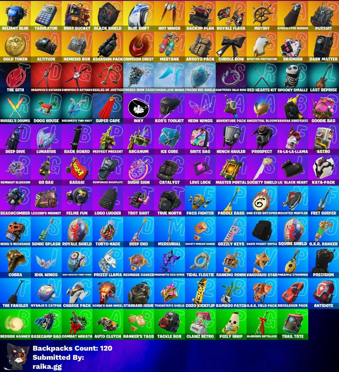 2020 Kickflip, Adventure Pack, Agent Patch, Agent Peely, Altitude, Ancestral Bloom, Antidote, Apocalypse Shroud, Arcanum, Arroyo Pack, Assassin Pack, Astro, Augury, Auto Clutch, Back Board, Back-Mounted Turbo Tower, Backup Plan, Bamboo Patch, Banana Briefcase, Bandollete, Basecamp Bag, Battle Gamer Mae, Battlehawk, Beachcomber, Bedside Nanner, Bernie, Black Knight, Black Shield, Blackheart, Blue Shift, Blue Squire, Blue Striker, Blue Team Leader, Brite Bag, Brite Gunner, Brutus, Bunker Jonesy, Calamity, Carbide, Catalyst, Charge Pack, Charlotte, Clawz Retro, Clutch, Cobalt, Cobra, Combat Wreath, Crimson Crest, Cuddle Bow, Cuddle Team Leader, DJ Yonder, Danica, Dark Matter, Deadpool, Deadpool's Katanas, Deep Dive, Deep End, Die With A Smile Bruno, Dieselback Pack, Dogg House, Dreamer's Two-Shot, Elite Agent, FNCS Fighter, Fa-La-La-Llama, Feline Fun, Fret Surfer, Frozen Iron Cage, Frozen Love Ranger, Frozen Love Wings, Frozen Raven, Frozen Red Knight, Frozen Red Shield, Game Knight, Gear Specialist Maya, Glorious Giftblade, Go Bag, Gold Token, Goodie Bag, Grind, Grzzly Keys, Gwenpool's Katanas, Havoc, Hench Hauler, Holiday Boxy, Horde's War Wheel, Hot Wings, Hybrid, Ice Cube, Idol Wings, Inky, Jake The Dog, John Wick, Journey Vs Hazard, Jumpshot, Kabag!, Kata-Pack, Kor, Kor's Toolkit, Laguna, Last Reprise, Legend's Modkit, Lil' Black Heart, Logo Lugger, Love Lock, Lt. John Llama, Lt. Ripp Slade, Lunarios, Lynx, Marshmello, Master Portal, Meowscles, Mercurial, Mertank, Mission Specialist, Moisty Mermandark Voyager, Moonwalker, Mounted Muffler, Mutiny, Nemesis Box, Neon Wings, Nog Ops, Nyanja's Catpak, O.X.R. Field Pack, O.X.R. Ranker, One-Eyed Octopus, Paddle Bass, Peely, Peely Whip, Perfect Present, Pineapple Strummer, Poised Playmaker, Powder, Precision, Prized Llama, Prodigy, Prophetic Exo-Spine, Prospect, Pursuit, Ranker's Tags, Ranking Ronin, Rebel's Rucksack, Recon Ranger, Red Hearts Kit, Redline Racer, Redmask Ranker, Reinforced Backplate, Reliant Blue, Remedy Vs Toxin, Remnant Blossom, Riftreaver Drift, Rippley Vs Sludge, Rogue Agent, Ronin, Rose Team Leader, Rox, Royale Flags, Royale Knight, Royale Shield, Russel, Russel's Drums, Rust Bucket, Rust Lord, Scales of Justice, Scourge, Sentinel, Sgt. Winter, Shadow Ops, Shanta, Shattered Halo Ring, Sidewinder, Skate Pocket Duffle, Skirmish, Snoop Dogg, Society Emblem Ranker, Society Shield, Sonic Splash, Sparkle Specialist, Spectra Protector, Spooky Smallz, Squire Shield, Standard Issue, Sub Commander, Super Cape, Sushi Sign, Tabulator, Tackle Box, Teknique, The Fangler, The Reaper, The Sith, Tidal Floatie, Tide Strider, Tntina, Toona Fish, Torto-Nade, Trail Tote, Trailblazer, Trickster's Shield, Trilogy, Trot Shot, True North, Turk Vs Riptide, Unchained Ramirez, Unsc Spartan, Vanguard Star, Vega, Voo-Mi, Warpaint, Winterfest Bushranger, Wukong, X-Lord, Zenith, Zoey