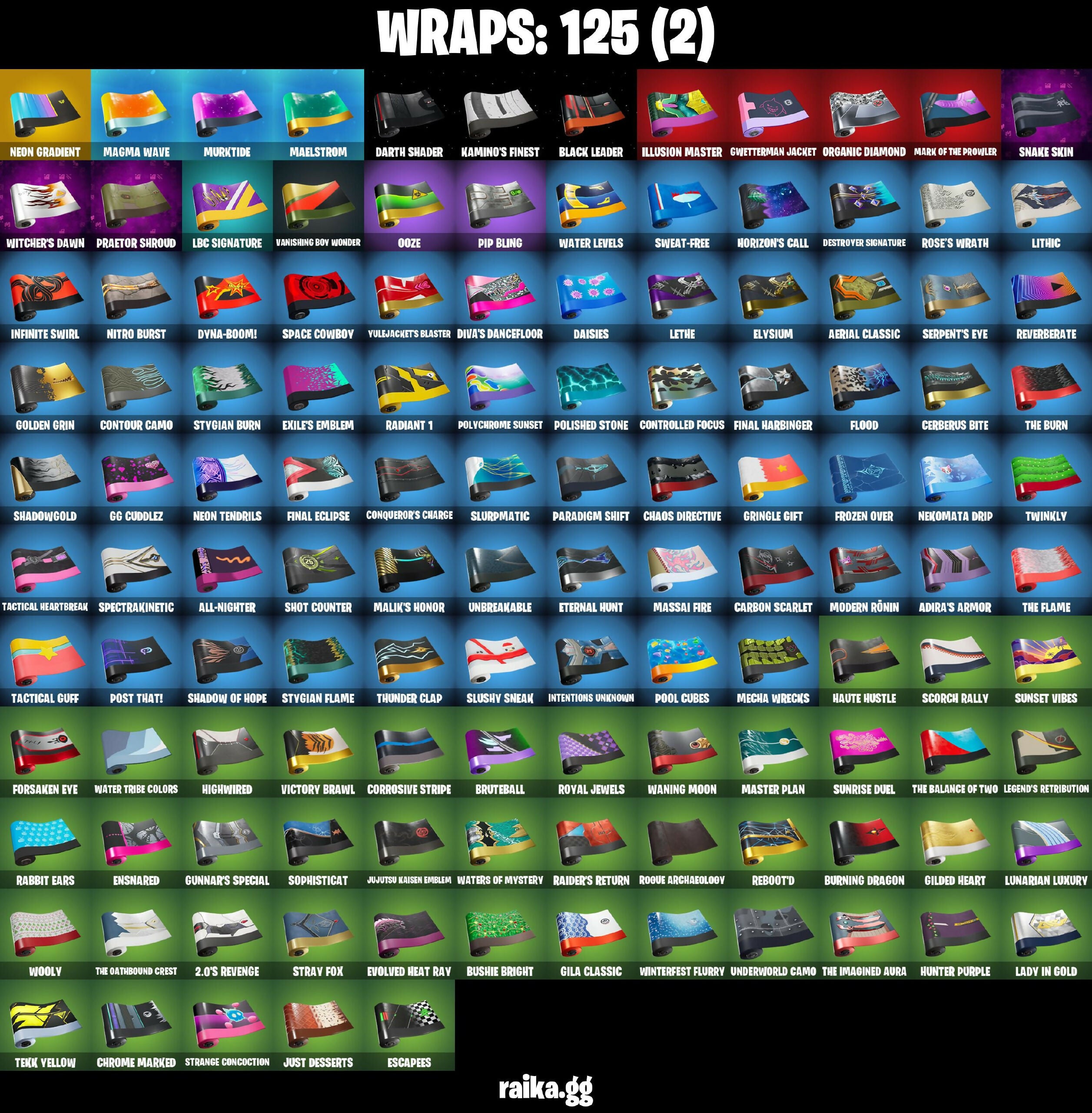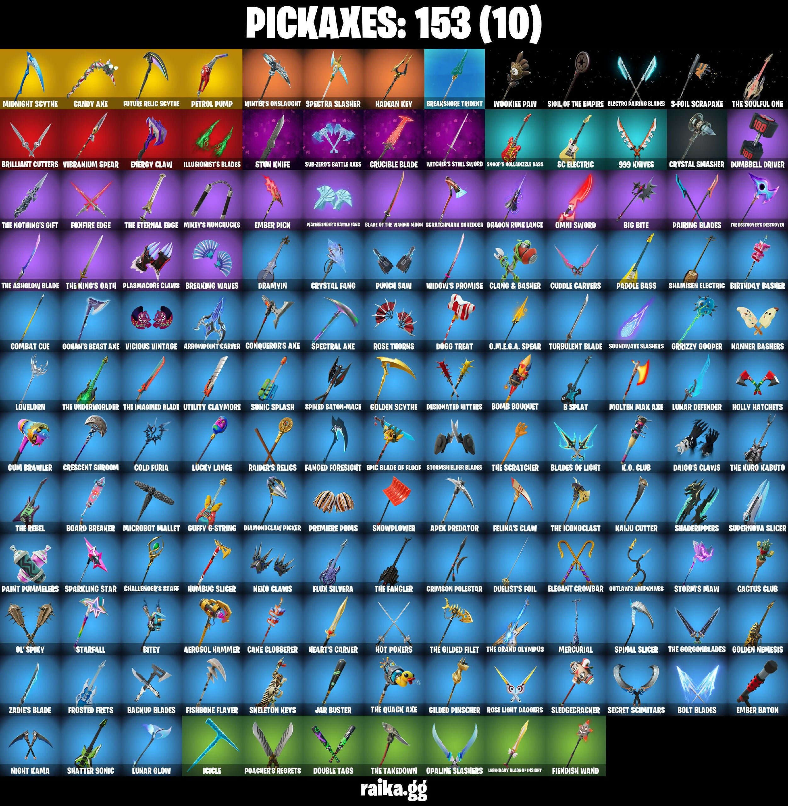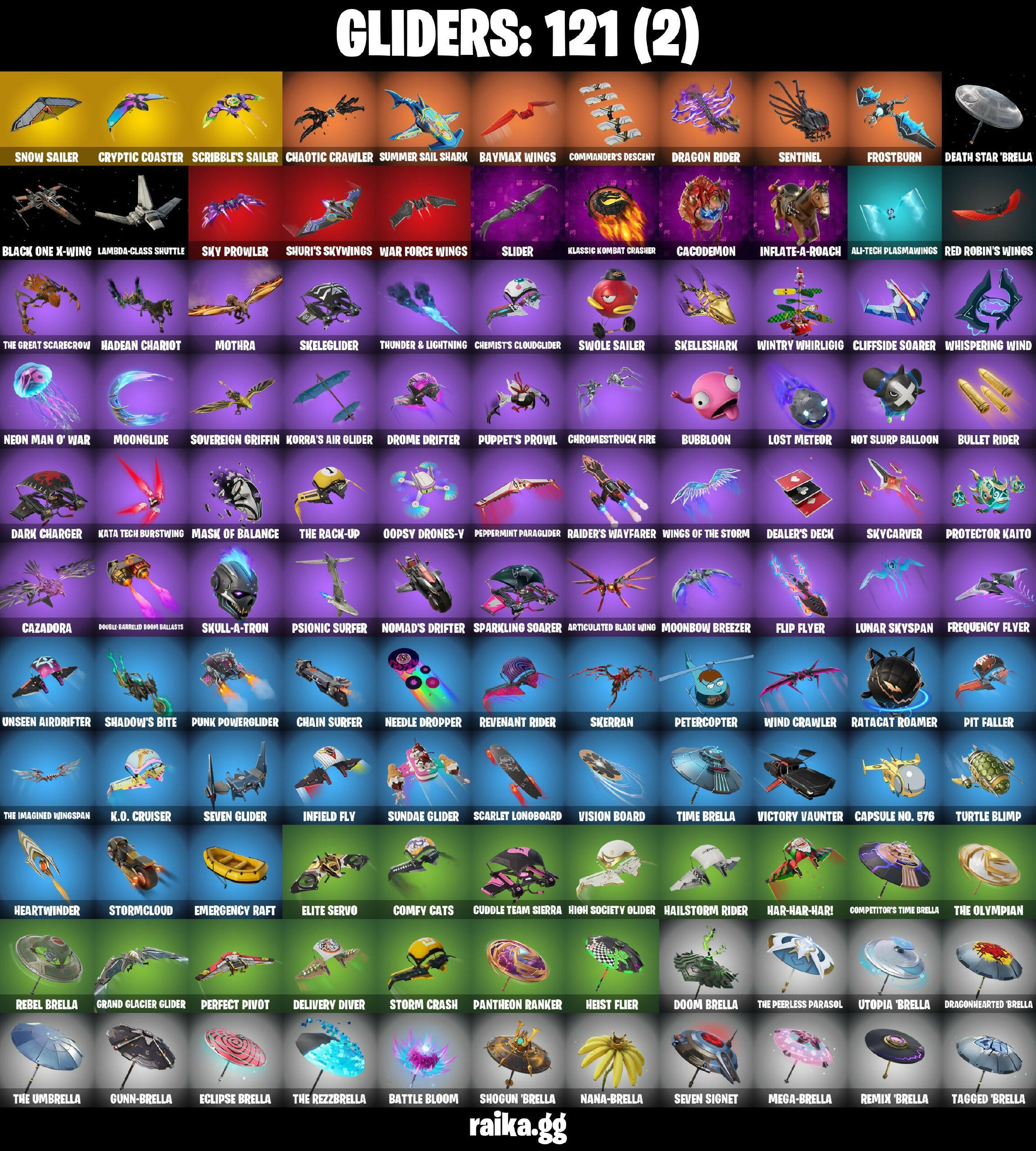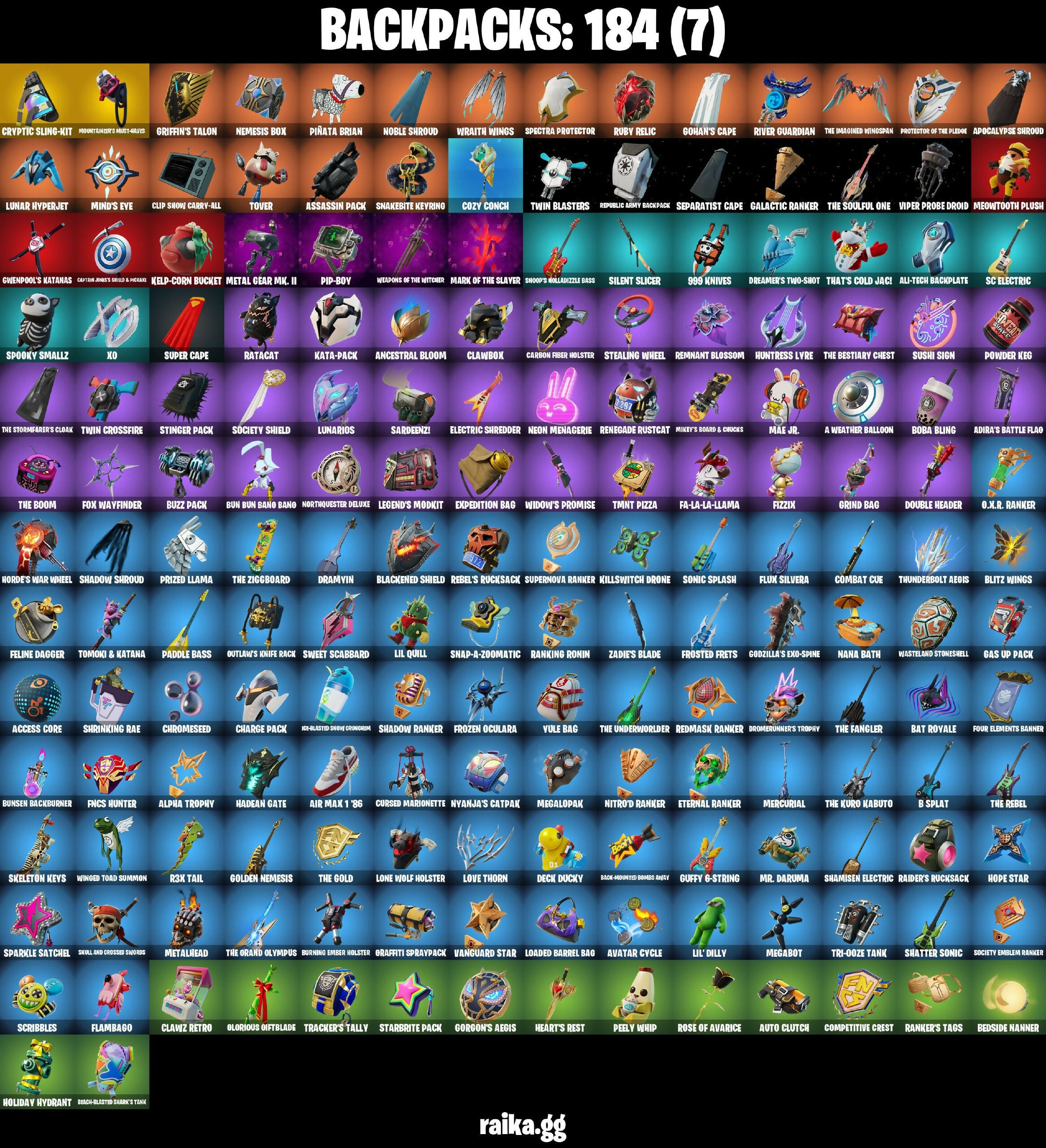2.0'S Revenge, 999 Knives, A Weather Balloon, Access Core, Adira (Battle Mask), Adira's Armor, Adira's Battle Flag, Aerial Assault Trooper, Aerial Classic, Aerosol Hammer, Air Horn, Air Max 1 '86, Ali-A, Ali-Tech Backplate, Ali-Tech Plasmawings, All-Nighter, All-Tech Backplate, All-Tech Plasmawings, Alpha Trophy, Ancestral Bloom, Apex Predator, Aphrodite, Apocalypse Shroud, Arctic Adeline, Arrowpoint Carver, Articulated Blade Wing, Ascension Nezumi, Assassin Pack, Astro Armor, Auto Clutch, Avatar Cycle, Avatar's Flourish, B Splat, Back On 74, Back-Mounted Bombs Away, Backup Blades, Balance Board, Balanced, Banner Icon, Baron's Hoard, Baseball, Bat Royale, Battle Blessing, Battle Bloom, Baymax Wings, Beach-Blasted Shark's Tank, Bedside Nanner, Big Bite, Birthday Basher, Bitey, Black Hole, Black Leader, Black One X-Wing, Blackened Shield, Blade Of The Waning Moon, Blades Of Light, Blitz Wings, Blizzard Bomber, Blowin' Up, Board Breaker, Boba Bling, Boba Snack, Bolt Blades, Bomb Bouquet, Boo'd Up Groove, Boogie Down, Breaking Waves, Breakshore Trident, Brilliant Cutters, Brite Agent, Bruteball, Bubloon, Bullet Rider, Bullpen Brawler Dusty, Bun Bun Bano Bang, Bunsen Backburner, Burning Ambition Valeria, Burning Dragon, Burning Ember Holster, Bushie Bright, Buzz Pack, Bytes (Lone Traveler), Bytes' Sigil, Cacodemon, Cactus Club, Caffeinated, Cake Clobberer, California Love, Called Shot, Candy Axe, Caper (Bunny), Capsule No. 576, Captain Jones' Shield & Pickaxe, Captain Llamerica, Carbon Fiber Holster, Carbon Scarlet, Card Drop, Cauldron Chill, Cazadora, Cerberus, Cerberus Bite, Chain Surfer, Chalked Up 1-Ball, Challenger's Staff, Chaos Directive, Chaotic Crawler, Charge Pack, Chef's Special, Chemist's Cloudglider, Chess Master, Choice Knit, Chrome Marked, Chrome Punk, Chromeseed, Chromestruck Fire, Clang & Basher, Clawbox, Clawz Retro, Cliffside Soarer, Clinical Crosser, Clip Show Carry-All, Club President Helsie, Coffin, Cold Furia, Combat Cue, Comfy Cats, Commander's Descent, Competitive Crest, Competitor's Time Brella, Conch Call, Conqueror's Axe, Conqueror's Charge, Conqueror's Claim, Contour Camo, Controlled Focus, Corrosive Stripe, Count It!, Cozy Conch, Crescent Shroom, Crimson Polestar, Crowning Achievement, Crucible Blade, Cryptic Coaster, Cryptic Sigil, Cryptic Sling-Kit, Crystal, Crystal Fang, Crystal Smasher, Cuddle Carvers, Cuddle Team Sierra, Curling Iron, Cursed Marionette, Cyclo Curl, Daigo's Claws, Daisies, Dancefloor Diva, Dark Charger, Darth Shader, Darth Vader, Dawn Duelist Nisha, Dealer's Deck, Death Star 'Brella, Deck Ducky, Delivery Diver, Demon Hunter Hope, Designated Hitters, Destroyer Signature, Diamond Throne, Diamondclaw Picker, Disco (Surf Curse), Diva Fever, Diva's Dancefloor, Do The Split, Dogg Treat, Doom Brella, Double Header, Double Tags, Double-Barreled Boom Ballasts, Doze Dab, Dragon Rider, Dragon Rune Lances, Dragonhearted 'Brella, Dragoon Rune Lance, Dramvin, Dramyin, Dreamer's Two-Shot, Drome Drifter, Dromerunner's Trophy, Duelist's Foil, Dumbbell Driver, Dusk Knight, Dyna-Boom!, Dynamo Intoon-a, Dynamo Tntoon-A, Easter Egg, Eclipse Brella, Electric Shredder, Electro Pairing Blades, Elegant Crowbar, Elite Servo, Elysian Artemis, Elysium, Ember Baton, Ember Pick, Emergency Raft, Empress Fan Dance, Energized Godzilla, Energy Claw, Ensnared, Epic Blade Of Floof, Eren Jaeger, Escapees, Eternal Hunt, Eternal Ranker, Evie, Evolved Heat Ray, Exile's Emblem, Expedition Bag, Expressionism, FNCS Hunter, Fa-La-La-Llama, Fancy Footwork, Fancy Peter Griffin, Fanged Foresight, Felina, Felina's Claw, Feline Dagger, Fiendish Wand, Final Eclipse, Final Harbinger, Fishbone Flayer, Fishpool, Fist Bump, Fizzix, Flambago, Flashback Breakdown, Flip Flyer, Flood, Flux Silvera, Fncs Renegade, Foil Flex, Follow The Butterfly, Forsaken Eye, Four Elements Banner, Fox Wayfinder, Foxfire Edge, Frequency Flyer, Frostburn, Frosted Frets, Frozen Oculura, Frozen Over, Full Googly, Future Relic Scythe, Galactic Ranker, Gas Up Pack, Gc Cuddlez, Geralt, Get Griddy, Gila, Gila Classic, Gilded Heart, Gilded Pinscher, Glorious Giftblade, Godzilla's Exo-Spine, Gohan's Beast Axe, Gohan's Cape, Golden Conqueror, Golden Grin, Golden Nemesis, Golden Scythe, Good Game, Well Played, Gorgon's Aegis, Graffiti Spraypack, Grand Glacier Glider, Griffin's Talon, Grind Bag, Gringle Gift, Grizzly Gooper, Grriz, Guardian Jade, Guffy 6-String, Guffy G-String, Gum Brawler, Gumbo, Gunn-Brella, Gunnar, Gunnar's Special, Gwenpool's Katanas, Gwierterman Jacket, Hadean Chariot, Hadean Gate, Hadean Key, Hailstorm Rider, Hand of Trace, Har-Har-Har!, Harbinger Armor Omegorok, Harrow Under Armor Omegadron, Haute Hustle, Haven, Heart Chopper, Heart Of A King, Heart's Carver, Heart's Rest, Heartwinder, Heist Flier, High Society Glider, Highwire, Highwired, Holiday Boxy, Holiday Hydrant, Holly Hatchets, Hope, Hope Star, Horde's War Wheel, Horizon’s Call, Hot Pokers, Hot Slurp Balloon, Human Bill, Humbug Slicer, Hunter Purple, Huntress Lyre, Hype!, Hypnot-Eyes, I Need You To Concentrate, I'm A Mystery, Ice-Blasted Snow Crunch, Icicle, Igni Sign, Illusion Master, Illusionist's Blades, Imani, Immortal Form, Immortal Zeus, Imperial March, Indiana Jones, Indiana Jones' Hat, Infield Fly, Infinite Swirl, Inflate-A-Roach, Intentions Unknown, Invisible Cut, It Is Finished, It's Like This, It's... You?, Jar Buster, Jet Signals, John Wick, Jujutsu Kaisen Emblem, Jun-Hwan, Just Desserts, K.O. Club, K.O. Cruiser, Kaiju Cutter, Kamino's Finest, Kata Tech Burstwing, Kata-Pack, Kelp-Corn Bucket, Kiara K.O. (Captain's Bomber), Killswitch Drone, Kintsugi Daigo, Kiss Kiss, Klassic Kombat Crasher, Knife Sharpener, Korra's Air Glider, Krisabelle, Lady In Gold, Lambda-Class Shuttle, Laser Focused, Lbc Signature, Legend's Modkit, Legend's Retribution, Legendary Blade Of Insight, Lethe, Lil Quill, Lil' Dilly, Lil' Diplodocus, Lil' Godzilla Attack, Lil' Longboat, Lil' Podracer, Lil' Prancer, Lina Scorch, Line Dancin', Lithic, Loaded Barrel Bag, 