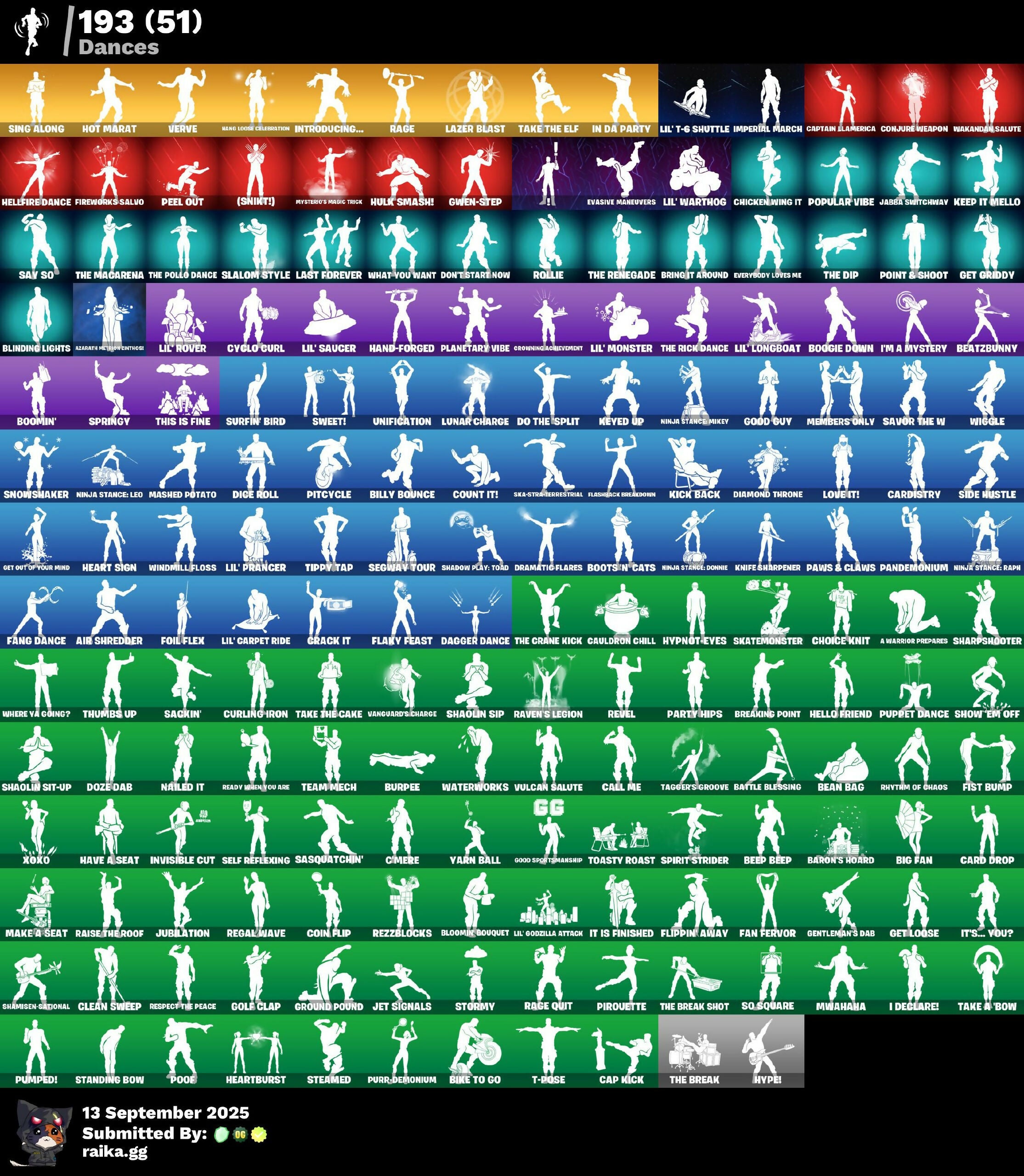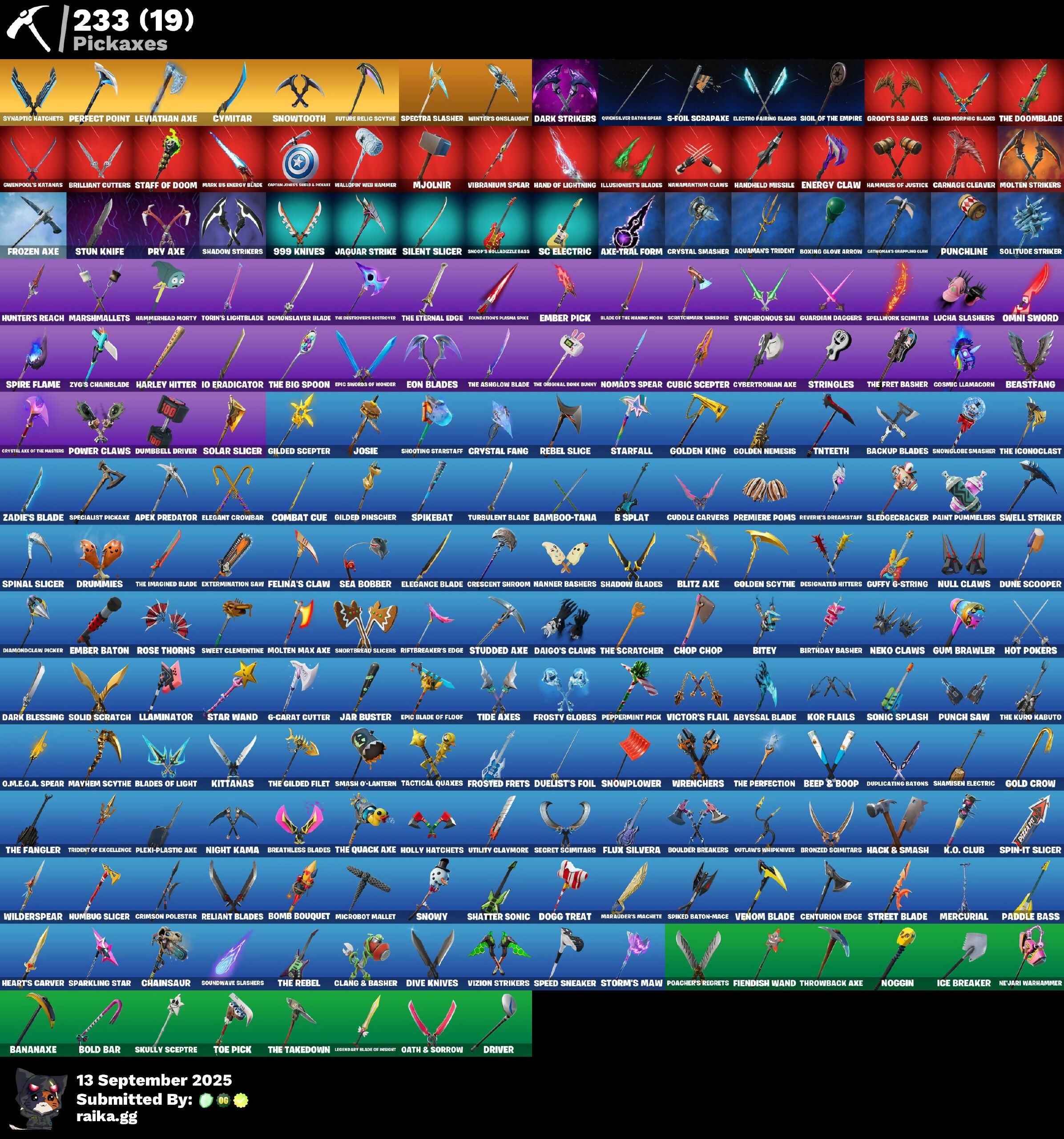 (Snikt!), 1-Ball, 6-Carat Cutter, 999 Knives, A Warrior Prepares, Absenz, Abyssal Blade, Agent Jones, Agent Peely, Air Shredder, Antonia, Apex Predator, Aquaman, Aquaman's Trident, Arctic Adeline, Astro Antidote, Astro Jack, Astroworld Cyclone, Aura, Axe-Tral Form, Azarath Metrion Zinthos, B Splat, Backlash, Backup Blades, Bamboo-Tana, Bananaxe, Baron's Hoard, Battle Blessing, Bean Bag, Beastfang, Beatzbunny, Beep & Boop, Beep Beep, Big Fan, Bike To Go, Billy Bounce, Birthday Basher, Bitey, Blade of the Waning Moon, Blades of Light, Blinding Lights, Blitz Axe, Bloomin' Bouquet, Bold Bar, Bomb Bouquet, Boogie Down, Boomin', Boots n' Cats, Boulder Breakers, Boxing Glove Arrow, Breaking Point, Breathless Blades, Brilliant Cutters, Bring It Around, Bronzed Scimitars, Bullseye, Burpee, C'mere, Call Me, Cap Kick, Caper, Captain Ilamerica, Captain Jinny's Grubb & Hooker, Captain Jones, Card Drop, Cardistry, Carnage, Carnage Cleaver, Catwoman's Grappling Claw, Cauldron Chill, Centurion, Centurion Edge, Chainsaur, Chaos Director, Charlotte, Chicken Wing It, Chigusa, Choice Knit, Chop Chop, Clang & Basher, Clark Kent, Clean Sweep, Cluck, Cobalt Overdrive, Coin Flip, Combat Cue, Commando, Conjure Weapon, Cosmic Llamacorn, Count It!, Crack It, Crescent Shroom, Crimson Polestar, Crowning Achievement, Crystal, Crystal Axe of the Masters, Crystal Fang, Crystal Smasher, Cubic Scepter, Cuddle Carvers, Curling Iron, Cybertronian Axe, Cyclo Curl, Cyminitar, Cymitar, D'Ark, Dagger Dance, Daigo, Daigo's Claws, Dark Blessing, Dark Power Chord, Dark Strikers, Deadpool, Demonslayer Blade, Designated Hitters, Diamond Diva, Diamond Throne, Diamondclaw Picker, Dice Roll, Dive Knives, Dizzie, Do The Split, Doctor Doom, Doctor Slone, Doctor Strange, Dogg Treat, Don't Start Now, Doom, Doze Dab, Dramatic Flares, Dream, Drippy Drift, Driver, Drummies, Duelist's Foil, Dumbbell Driver, Dummy, Dune Scooper, Duplicating Batons, Dusk Knight, Dynamo, Dynamo Tntina, Electro Faring Blades, Elegance Blade, Elegant Crowbar, Ember Baton, Ember Pick, Emma Frost, Energy Claw, Eon Blades, Epic Blade of Floof, Epic Swords of Wonder, Era, Erisa, Eternal Knight, Evasive Maneuvers, Everybody Loves Me, Extermination Saw, Fabio Sparklemane, Fade, Fan Fervor, Fang Dance, Felina, Felina's Claw, Fiendish Wand, Fireworks Salvo, Fish Thicc, Fist Bump, Fixer, Flaky Feast, Flashback Breakdown, Flippin' Away, Flux Silvera, Foil Flex, Foundation Plasma Spear, Frosted Frets, Frosty Globes, Frozen Axe, Future Relic Scythe, Galaxia, Gear Specialist Maya, Gentleman's Dab, Get Griddy, Get Loose, Get Out Of Your Mind, Gilded Morphic Blades, Gilded Pinscher, Gilded Scepter, Godzilla Evolved, Gold Brutus, Gold Crow, Gold Meowscles, Gold Midas, Golden King, Golden Nemesis, Golden Scythe, Golf Clap, Good Guy, Good Sportsmanship, Green Arrow, Groot, Groot's Sap Axes, Ground Pound, Guardian Daggers, Guffy G-String, Guggimon, Gum Brawler, Gumbo, Gunnar, Gwen-step, Gwenpool, Gwenpool's Katanas, Hack & Smash, Hammerhead Morty, Hammers of Justice, Hand of Lightning, Hand-Forged, Handheld Missile, Hang Loose Celebration, Harley Hitter, Harley Quinn, Harlowe, Have A Seat, Haven, Heart Sign, Heart's Carver, Heartburst, Hellfire Dance, Hello Friend, Hero Baymax, Hex Code, Holiday Boxy, Holly Hatchets, Hope, Hot Marat, Hot Pokers, Hulk Smash!, Humbug Slicer, Hunter's Reach, Hype!, Hypnot-Eyes, I Declare!, I'm A Mystery, IO Eradicator, Ice Breaker, Illusionist's Blades, Imperial March, In Da Party, Introducing..., Invisible Cut, It Is Finished, It's... You?, J.B. Chimpanski, Jabba Switchway, Jade, Jaguar Strike, Jar Buster, Jennifer Walters, Jet Signals, Joey, Josie, Jubilation, Jules, Jun-Hwan, K.O. Club, Kado Thorne, Keep It Mello, Kendo, Keyed Up, Khaby Lame, Kiara K.O., Kick Back, Kit, Kittanas, Knife Sharpener, Kondor, Kor, Kor Flails, Krisabelle, Kymera, Kyra, Lara Croft, Last Forever, Lazer Blast, Legendary Blade of Insight, Leviathan Axe, Lexa, Light Burst, Lil Split, Lil' Carpet Ride, Lil' Godzilla Attack, Lil' Longboat, Lil' Monster, Lil' Prancer, Lil' Rover, Lil' Saucer, Lil' T-6 Shuttle, Lil' Warthog, Llaminator, Lorenzo, Love It!, Lt. Evergreen, Lt. John Llama, Lucha Slashers, Lunar Charge, Mae, Make A Seat, Mancake, Mandalorian, Manic, Marauder's Machete, Mariposa, Marius, Mark 85 Energy Blade, Marshmallets, Mashed Potato, Mave, Mayhem Scythe, Megumi, Melody Maverick, Members Only, Menace, Meowdas, Mercurial, Microbot Mallet, Mjolnir, Modena Icon, Mogul Master, Molten Max Axe, Molten Omen, Molten Strikers, Montague, Mr. Meeseeks, Mwahaha, Mysterio, Mysterio's Magic Trick, Mystique, Nailed It, Nanner Bashers, Nanomantium Claws, Nej'ari Warhammer, Neko Claws, Neon Gradient, Neymar Jr, Night Kama, Ninja Stance: Donnie, Ninja Stance: Leo, Ninja Stance: Mikey, Ninja Stance: Raphael, Nisha, Nitelite, Nog Ops, Noggin, Nolan Chance, Nomad's Spear, Null Claws, Nyanja, O.M.E.G.A. Spear, Oath & Sorrow, Ocean, Omegarok, Omni Sword, Oscar, Otherworld, Outlaw's Whipknives, Paddle Bass, Paint Pummellers, Pandemonium, Party Hips, Paws & Claws, Peel Out, Peelverine, Peppermint Pick, Perfect Point, Peter Griffin, Piper Pace, Pirouette, Pitch Patroller, Pitcycle, Planetary Vibe, Plexi-Plastic Axe, Poacher's Regrets, Point & Shoot, Point Patrol, Point Patroller, Polar Peely, Poof, Popular Vibe, Power Claws, Predator, Premiere Poms, Prowler, Pry Axe, Pumped!, Punch Saw, Punchline, Puppet Dance, Pure-Demonium, Purradise Meowscles, Qicksilver Baton Spear, Rage, Rage Quit, Raise The Roof, Raven's Legion, Raz, Ready When You Are, Rebel Slice, Rebirth Raven, Recon Expert, Recon Strike, Reese, Regal Wave, Reliant Blades, Reliant Blue, Relik, Renegade Lynx, Respect The Peace, Revel, Reverie, Revive's Dreamstaff, Rezzblocks, Rhythm Of Chaos, Rian, Rick Sanchez, Riftbreaker's Edge, Rollie, Rolling Glyphs, Ronin, Rose Thorns, Runway Racer, S-Foil Scrapaxe, SC Electric, Sackin', Santa Dogg, Sasquatchin', Savor The W, Say So, Scarlet Defender, Scribble's Sailer, Scuba Jonesy, Scytheclaw'
