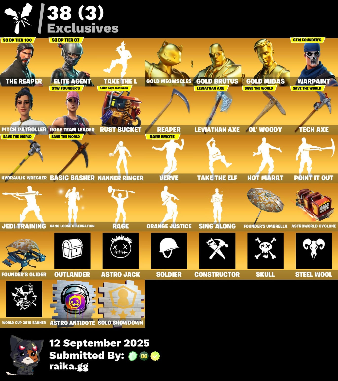 💥🌟💥 EXCLUSIVE OFFER 💥🌟💥 224 SKINS 💎 OG STW 💎 RENEGADE RAIDER 💎 THE REAPER 💎 ELITE AGENT 💎 GOLD MEOWSCLES 💎 GOLD BRUTUS 💎 GOLD MIDAS 💎 PITCH PATROLLER 💎 LUXE