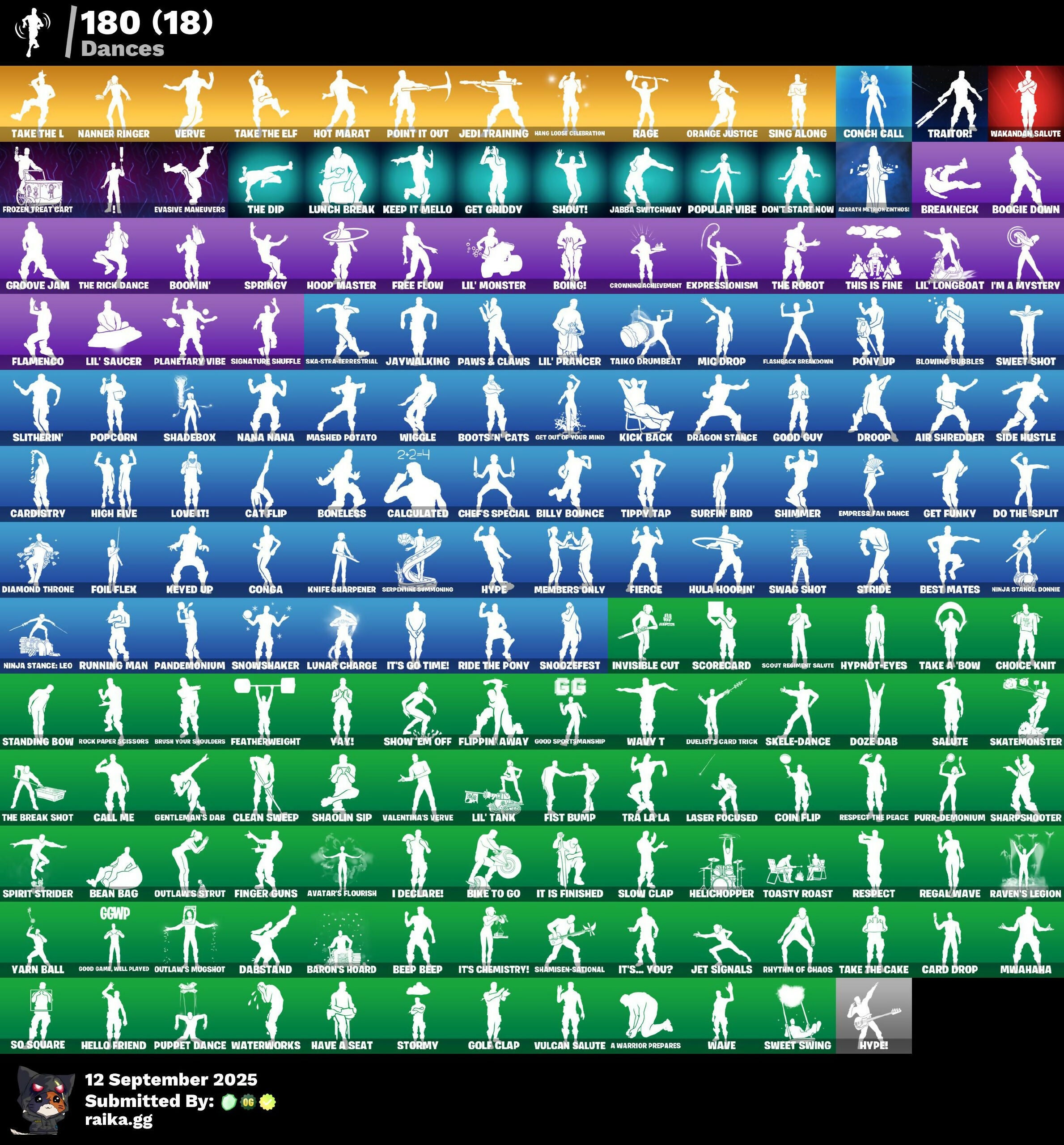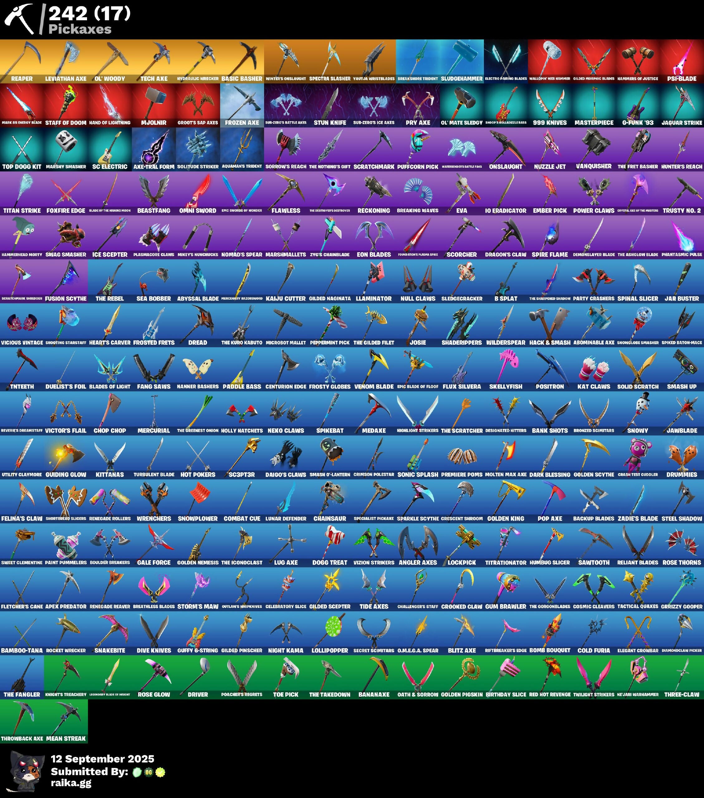 1-Ball, 8-Ball vs Scratch, 999 Knives, A Warrior Prepares, A.L.M., Abominable Axe, Absenz, Abyssal Blade, Aerial Assault Bomber, Agent Jones, Agent Peely, Air Shredder, Alli, Angler Axes, Antiestest Bush Ranger, Apex Predator, Aphrodite, Aquaman, Aquaman's Trident, Arctic Adeline, Astro Antidote, Astro Jack, Astroworld Cyclone, Avatar's Flourish, Axe-Tral Form, Azarath Metrion Zinthos!, B Splat, Backup Blades, Bamboo-Tana, Bananaxe, Bank Shots, Baron's Hoard, Basic Basher, Battlehawk, Bean Bag, Beastfang, Beep Beep, Best Mates, Big Dill, Bike To Go, Billy Bounce, Birthday Slice, Blackheart, Blade of the Waning Moon, Blades of Light, Blaze, Blitz Axe, Blowing Bubbles, Boing!, Bomb Bouquet, Boneless, Boogie Down, Boomin', Boots N' Cats, Boulder Breakers, Breaking Waves, Breakneck, Breakshore Trident, Breathless Blades, Bronzed Scimitars, Brush Your Shoulders, Bytes, Calamity, Calculated, Call Me, Cameo vs Chic, Carbide, Card Drop, Cardistry, Cassidy Quinn, Cat Flip, Catalyst, Celebratory Slice, Centurion, Centurion Edge, Cerberus, Chainsaur, Challenger's Staff, Chance, Chaos Director, Charlotte, Chef's Special, Choice Knit, Chop Chop, Chord Kahele, Clean Sweep, Cluck, Cobalt, Codename E.L.F., Coin Flip, Cold Furia, Combat Cue, Conch Call, Conga, Constructor, Contract Giller, Cosmic Cleavers, Crash Test Cuddler, Crescent Shroom, Crimson Polestar, Crooked Claw, Crowning Achievement, Crystal Axe of the Masters, D'ark, DJ Yonder, Dabstand, Daigo, Daigo's Claws, Dara, Dark Blessing, Dark Voyager, Deadpool, Deimos, Demonslayer Blade, Designated Hitters, Diamond Throne, Diamondclaw Picker, Dire, Dive Knives, Do The Split, Doctor Doom, Doctor Slone, Dogg Treat, Don't Start Now, Doze Dab, Dragon Stance, Dragon's Claw, Dread, Driver, Droop, Drummies, Duelist Card Trick, Duelist's Foil, Durrr Taisho, Dusk, Dynamo Tntina, Electro Fang Blades, Elegant Crowbar, Elite Agent, Ember, Ember Pick, Empress Fan Dance, Eon Blades, Epic Blade of Floof, Epic Swords of Wonder, Era, Eren Jaeger, Eternal Knight, Eternal Voyager, Eva, Evasive Maneuvers, Expressionism, Fable, Fade, Fang Saws, Featherweight, Felina, Felina's Claw, Fierce, Finger Guns, Fist Bump, Flakey The Snowbird, Flamenco, Flashback Breakdown, Flawless, Fletcher Kane, Fletcher's Cane, Flippin' Away, Flux Silvera, Foil Flex, Foundation's Paloma Spire, Founder's Glider, Founder's Umbrella, Foxfire Edge, Free Flow, Frost Squad, Frosted Frets, Frosty Globes, Frozen Axe, Frozen Fishstick, Frozen Nog Ops, Frozen Treat Cart, Fusion, Fusion Scythe, G-Funk '93, Gale Force, Gear Specialist Maya, Gentleman's Dab, Get Funky, Get Griddy, Get Out Of Your Mind, Giddy-Up, Gilded Moprhic Blades, Gilded Naginata, Gilded Pinscher, Gilded Scepter, Gold Brutus, Gold Meowscles, Gold Midas, Golden King, Golden Nemesis, Golden Pigskin, Golden Scythe, Golf Clap, Good Game, Well Played, Good Guv, Good Sportsmanship, Grizzly Gooper, Groot, Groot's Sap Axes, Groove Jam, Grriz, Guffy G-String, Guggimon, Guiding Glow, Gum Brawler, Gumbo, Hack & Smash, Hammerhead Morty, Hammers of Justice, Hand of Lightning, Hang Loose Celebration, Harlowe, Haruka Of The Masks, Have A Seat, Haven, Heart's Carver, Helichopper, Hello Friend, Hellspohn Web Repairer, Hero Baymax, High Five, Highlight Strikers, Highwire, Holiday Boxy, Holly Hatchets, Hoop Master, Hope, Hot Marat, Hot Pokers, Hula Hoopin', Humbug Slicer, Hunter's Reach, Hybrid, Hydraulic Wrecker, Hype, Hype!, Hypnot-Eyes, I Declare!, I'm A Mystery, IO Eradicator, Ice Scepter, Imani, Invisible Cut, Iris, It Is Finished, It's Chemistry!, It's Go Time!, It's... You?, Jabba Switchway, Jackie, Jade, Jaguar Strike, Jar Buster, Jawblade, Jaywalking, Jedi Training, Jennifer Walters, Jet Signals, Joey, Josie, Joss, Journey vs Hazard, Jules, Kaiju Cutter, Kat Claws, Katalina, Keep It Mello, Keisha Cross, Kendo, Keyed Up, Kick Back, Kit, Kittanas, Knife Sharpener, Knight's Treachery, Kondor, Korra, Krisabelle, Kymera, LBC '93 Dogg, Lady Of Cranes, Lara Croft, Laser Focused, Lazarbeam, Legendary Blade of Insight, Leviathan Axe, Lexa, Lil Split, Lil' Longboat, Lil' Monster, Lil' Prancer, Lil' Saucer, Lil' Tank, Llambro, Llaminator, Lockpick, Lollipopper, Love It!, Lt. Evergreen, Lt. John Llama, Lug Axe, Lunar Charge, Lunar Defender, Lunch Break, Luxe, Lynx, Major Mancake, Mancake, Mandalorian, Mark 85 Energy Blade, Marshmallets, Marshy Smasher, Mashed Potato, Master Kev, Masterpiece, Mave, Mean Streak, Mecha Cuddle Master, Medaxe, Members Only, Menace, Meowdas, Mercenary Rizzorsword, Mercurial, Mic Drop, Michelangelo, Microbot Mallet, Mission Specialist, Mixey's Knuckrocks, Mizuki, Mjolnir, Molten Max Axe, Montague, Moonwalker, Mwahaha, Mystica, Mystique, Nana Nana, Nanner Bashers, Nanner Ringer, Nejari Warhammer, Neko Claws, Neko Hatsune Miku, Neymar Jr, Night Kama, Nightshade, Ninja Stance: Donnie, Ninja Stance: Leo, Nisha, Nomad's Spear, Null Claws, Nuzzle Jet, Nyanja, O.M.E.G.A. Spear, Oath & Sorrow, Ocean, Ol' Mate Sledgy, Ol' Woody, Omega, Omegarok, Omni Sword, Onesie, Onslaught, Orange Justice, Oscar, Outlander, Outlaw Midas, Outlaw's Mugshot, Outlaw's Strut, Outlaw's Warprimes, Paddle Bass, Paint Pummellers, Pandemonium, Paradigm (Reality E505), Party Crashers, Paws & Claws, Peely, Peppermint Pick, Peter Griffin, Phantasmic Pulse, Pitch Patroller, Planetary Vibe, Plasmacore Claws, Poacher's Regrets, Point It Out, Polar Peely, Pony Up, Pop Axe, Popcorn, Popular Vibe, Poseidon, Positron, Powder, Power Claws, Predator, Premiere Poms, Pry Axe, Psi-Blade, Puffcorn Pick, Puppet Dance, Purr-Demonium, Rage, Raven Team Syd, Raven's Legion, Raz, Reaper, Rebirth Raven, Reckoning, Red Hot Revenge, Reese, Regal Wave, Reliant Blades, Remedy vs Toxin, Renegade Lynx, Renegade Raider, Renegade Reaver, Renegade Rebel, Renegade Rollers, Renzo The Destroyer, Respect, Respect The Peace, Reverie, Reverse's Dreamstaff, Rhythm Of Chaos, Rick Sanchez, Ride The Pony, Riftbreaker's Edge, Rippley vs Sludge, Rock Paper Scissors, Rocket Wrecker, Ronin, Rose Glow, Rose T