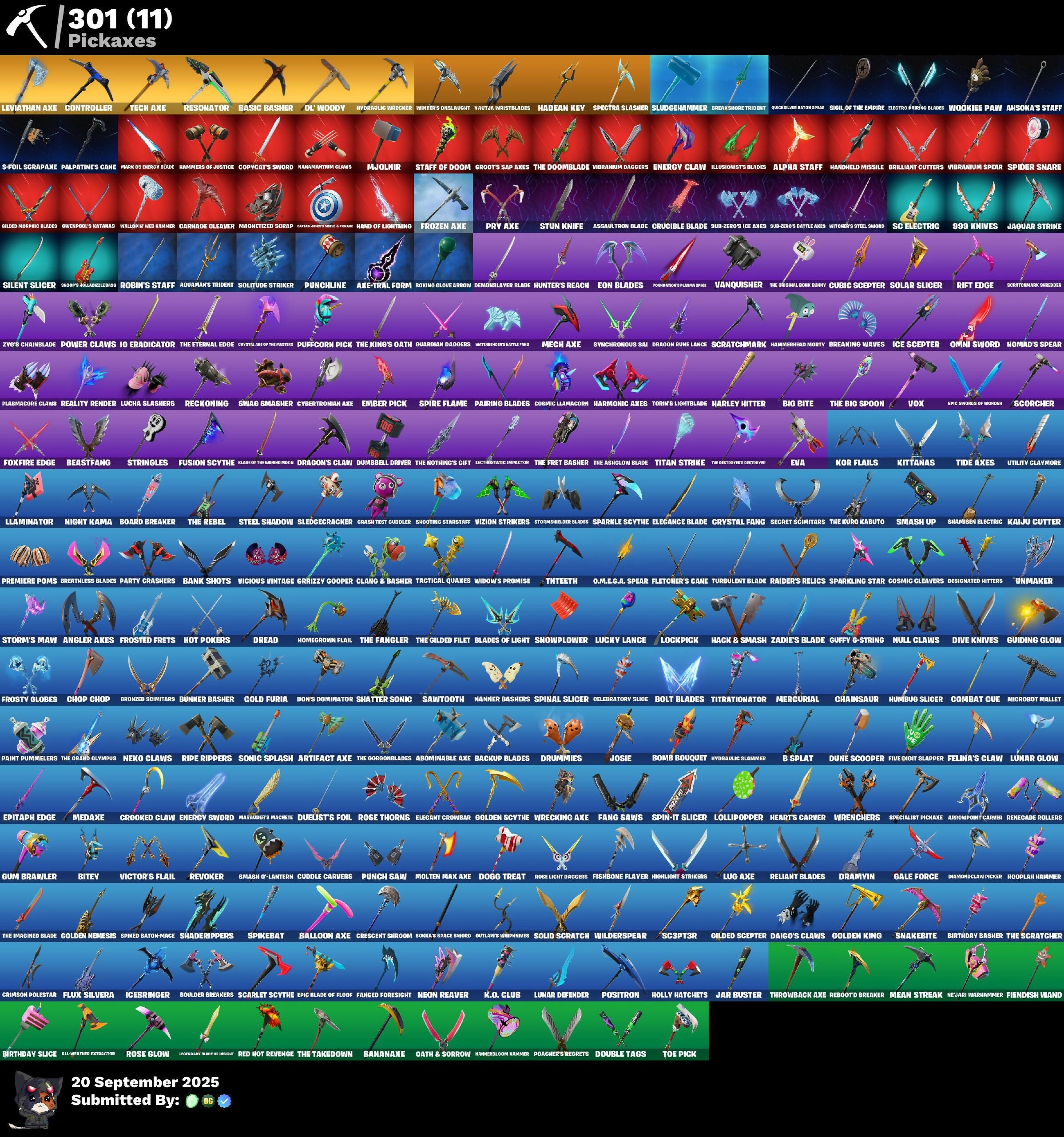 (SNIKT!), 1-Ball, 8-Ball Vs Scratch, 999 Knives, A Warrior Prepares, Abominable Axe, Adira, Agent Jones, Agent Peely, Ahsoka Tano, Ahsoka's Staff, Air Shredder, All-Weather Extractor, Alpha Staff, Angler Axes, Antonia, Aphrodite, Apprentice Evie, Aquaman, Aquaman's Trident, Arachrobatics, Arctic Adeline, Arrowpoint Carver, Artemis, Artifact Axe, Assaulton Blade, Astro Antidote, Astro Jack, Astroworld Cyclone, Aurora, Avatar's Flourish, Axe-Tral Form, Azarath Metrion Zinthos, B Splat, Backup Blades, Balance Board, Balloon Axe, Bananaxe, Bank Shots, Baron's Hoard, Basic Basher, Battle Blessing, Battlehawk, Bean Bag, Beast Boy & Raven, Beastfang, Beatz Bunny, Beep Beep, Best Mates, Big Bite, Big Dill, Big Fan, Bike To Go, Birdbrand Flourish, Birthday Basher, Birthday Slice, Bitey, Black Panther, Blackheart, Blade of the Waning Moon, Blades of Light, Blowin' Up, Blowing Bubbles, Blue Shift, Blue Streak, Blue Striker, Blue Team Leader, Board Breaker, Boba Snack, Boing!, Bolt Blades, Bomb Bouquet, Boogie Down, Boomin', Boosting Ki, Boots N' Cats, Boulder Breakers, Boxing Glove Arrow, Breaking Waves, Breakneck, Breakshore Trident, Breathless Blades, Brilliant Cutters, Brite Moves, Brite Raider, Bronzed Scimitars, Bully, Bunker Basher, Bunker Jonesy, Burst Case Scenario, Buzzer Beater, Bytes, Calamity, Calculated, Call Me, Called Shot, Cameo Vs Chic, Captain America, Captain America's Shield & Pickaxe, Captain Jones, Captain Marvel, Carbide, Cardistry, Carnage, Carnage Cleaver, Cassidy Quinn, Cat Flip, Catalyst, Cauldron Chill, Celebratory Slice, Cerberus, Chainsaur, Chaos Director, Charlotte, Chef's Special, Choice Knit, Chomp Sr., Chop Chop, Chrome Punk, Clang & Basher, Clark Kent, Clean Sweep, Clone Trooper, Cluck, Cluck Strut, Coaxial Blue, Codsworth's Cleanup, Coin Flip, Cold Furia, Combat Cue, Conch Call, Conga, Constructor, Controller, Copycat's Sword, Cosmic Cleavers, Cosmic Llamacorn, Count It!, Crack It, Crash Test Cuddler, Crescent Shroom, Crimson Polestar, Crooked Claw, Crowning Achievement, Crucible Blade, Crystal Axe of the Masters, Crystal Fang, Cubic Scepter, Cuddle Carvers, Cybertronian Axe, Cyclo-Curl, Dabstand, Dagger Dance, Daigo, Daigo's Claws, Darth Vader, Deadpool, Demi, Demonslayer Blade, Designated Hitters, Diamond Throne, Diamondclaw Picker, Dice Roll, Dirtbike Challenge, Disassemble, Distraction Dance, Dive Knives, Dj Yonder, Do The Split, Doctor Doom, Doctor Slone, Dogg Treat, Don's Dominator, Doom, Doom Slayer, Doom's Domain, Double Tags, Doze Dab, Dragon Rune Lance, Dragon Stance, Dragon's Claw, Dramatic Flares, Dramyin, Dread, Drift, Droop, Drummies, Duelist's Card Trick, Duelist's Foil, Dumbell Driver, Dune Scooper, Dusk, Dusk Knight, Dusty, Dynamo TNTina, Electro Flaring Blades, Electrostatic Impactor, Elegance Blade, Elegant Crowbar, Ember, Ember Pick, Emma Frost, Empress Fan Dance, Energy Claw, Energy Sword, Eon, Eon Blades, Epic Blade of Floof, Epic Swords of Wonder, Epitaph Edge, Era, Eren Jaeger, Erisa, Eternal Knight, Eternal Voyager, Eva, Evasive Maneuvers, Evie, Expressionism, Fabio Sparklemane, Fable, Fade, Fang Saws, Fanged Foresight, Featherweight, Feel The Flow, Feel The Force, Felina, Felina's Claw, Fiendish Wand, Fire Show, Fireworks Salvo, Fish Thicc, Fishbone Flayer, Fist Bump, Five Digit Slapper, Flaky Feast, Flamenco, Flappy, Flashback Breakdown, Fletcher Kane, Fletcher's Cane, Flippin' Away, Flux Silvera, Foil Flex, Force Lightning, Founder's Glider, Founder's Umbrella, Foxfire Edge, Foxfretton's Plasma Spike, Free Flow, Frost Squad, Frosted Frets, Frosty Globes, Frozen Axe, Frozen Treat Cart, Fusion, Fusion Scythe, Galaxia, Gale Force, Gear Specialist Maya, Gentleman's Dab, Geralt Of Rivia, Get Funky, Get Out Of Your Mind, Giddy-Up, Gilded Morphic Blades, Gilded Scepter, Godzilla Evolved, Gold Brutus, Gold Clap, Gold Meowscles, Gold Midas, Gold TNTina, Golden King, Golden Nemesis, Golden Scythe, Good Guy, Green Arrow, Grizzly Gooper, Grookslayer Baton Spear, Groop's Balloozle Bag, Groot, Groot's Sap Axes, Grriz, Guardian Daggers, Guardian Shield, Guffy 6-String, Guggimon, Guiding Glow, Gum Brawler, Gumbo, Gunnar, Gwen-Step, Gwenpool, Gwenpool's Katanas, Hack & Smash, Hadean Key, Hammerhead Morty, Hammers of Justice, Hand Loose Celebration, Hand of Lightning, Hand-Forged, Handheld Missile, Harley Hitter, Harley Quinn, Harlowe, Harmonic Axes, Haven, Haylee Skye, Heart Sign, Heart's Carver, Hellfire Dance, Hello Friend, Helsie, Hero Baymax, High Five, High Hoops, Highlight Strikers, Highwire, Holiday Boxy, Holly Hatchets, Homegrown Flail, Hooplah Hammer, Hope, Hot Marat, Hot Pokers, Hula Hoopin', Humbug Slicer, Hunter's Reach, Huntress, Hybrid, Hydraulic Slammer, Hydraulic Wrecker, Hype, Hype!, Hypnot-Eyes, I Declare!, I'm A Mystery, Ice Scepter, Icebringer, Igni Sign, Illusionist's Blades, Imani, Imperial March, Indiana Jones, Invisible Cut, Io Eradicator, It Is Finished, It's Chemistry!, It's Go Time!, It's... You?, J.B. Chimpanski, Jade, Jaguar Strike, Jar Buster, Jaywalking, Jennifer Walters, Jet Signals, Joey, John Cena, Josie, Joss, Journey Vs Hazard, Jules, Jump Jets, K.O. Club, Kado Thorne, Kaiju Cutter, Keisha Cross, Kendo, Keyed Up, Khaby Lame, Kiara K.O., Kick Back, Kit, Kittanas, Knife Sharpener, Kondor, Kor, Kor Flails, Korra, Kratos, Krisabelle, Kymera, Laid Back Shuffle, Lara Croft, Laser Focused, Leafy Longboardin', Legendary Blade of Insight, Lennox Rose, Leviathan Axe, Lexa, Lil Split, Lil' Ghost, Lil' Godzilla Attack, Lil' Longboat, Lil' Monster, Lil' Podracer, Lil' Prancer, Lil' Resistance Bomber, Lil' Rover, Lil' Saucer, Lil' T-6 Shuttle, Llambro, Llaminator, Lockpick, Lollipopper, Lorenzo, Love It!, Lt. John Llama, Lucia Slashers, Lucky Lance, Lug Axe, Lunar Charge, Lunar Defender, Lunar Glow, Lunar Party, Lynx, Mae, Magnetized Scrap, Make A Seat, Malik, Mancake, Mandalorian, Mandersloom Hammer, Marauder's Machete, Mariposa, Mark 85 Energy Blade, Marshmello, Mashed Potato, Massai, Master Key, MasterDMT's Battle Fans, Mave, M