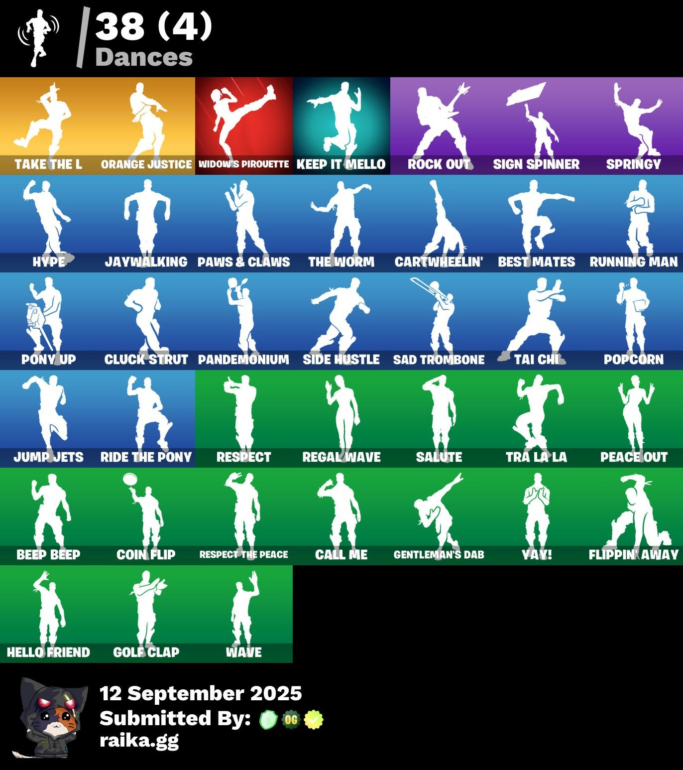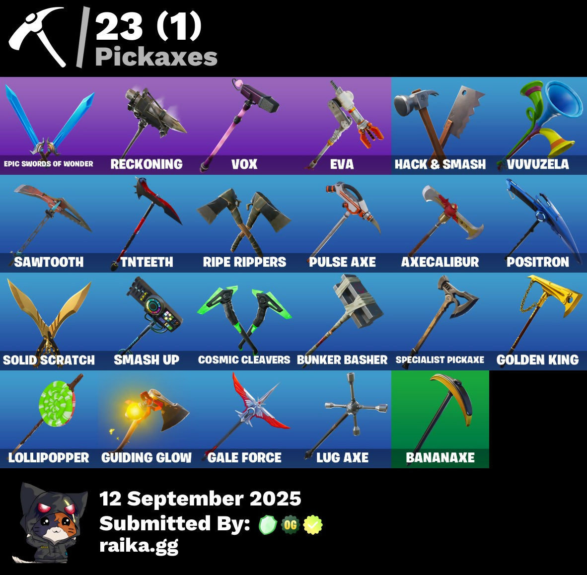 Agent Peely, Astroworld Cyclone, Axecalibur, Bananaxe, Battlehawk, Beep Beep, Best Mates, Blue Squire, Brutus, Bunker Basher, Bunker Jonesy, Calamity, Call Me, Carbide, Cartwheelin', Catalyst, Cluck Strut, Coin Flip, Cosmic Cleavers, DJ Yonder, Dark Voyager, Epic Swords Of Wonder, Eva, Flippin' Away, Gale Force, Gear Specialist Maya, Gentleman's Dab, Giddy-Up, Golden King, Golf Clap, Guiding Glow, Hack & Smash, Hello Friend, Hype, Jaywalking, Jump Jets, Keep It Mello, Lollipopper, Lug Axe, Meowscles, Midas, Mission Specialist, Moonwalker, Orange Justice, Pandemonium, Paws & Claws, Peace Out, Pony Up, Popcorn, Positron, Pulse Axe, Reckoning, Regal Wave, Respect, Respect The Peace, Ride The Pony, Ripe Rippers, Rock Out, Rogue Agent, Rox, Royale Knight, Running Man, Rust Bucket, Rust Lord, Sad Trombone, Salute, Sawtooth, Sentinel, Side Hustle, Sign Spinner, Skye, Smash Up, Solid Scratch, Specialist Pickaxe, Springy, Stratus, Tai Chi, Take The L, Teknique, The Ace, The Worm, Tilted Teknique, Tnteeth, Tntina, Tra La La, Vega, Vox, Vuvuzela, Wave, Widow's Pirouette, Wild Card, Wilde, Wingman, X-Lord, Yay!, Zoey