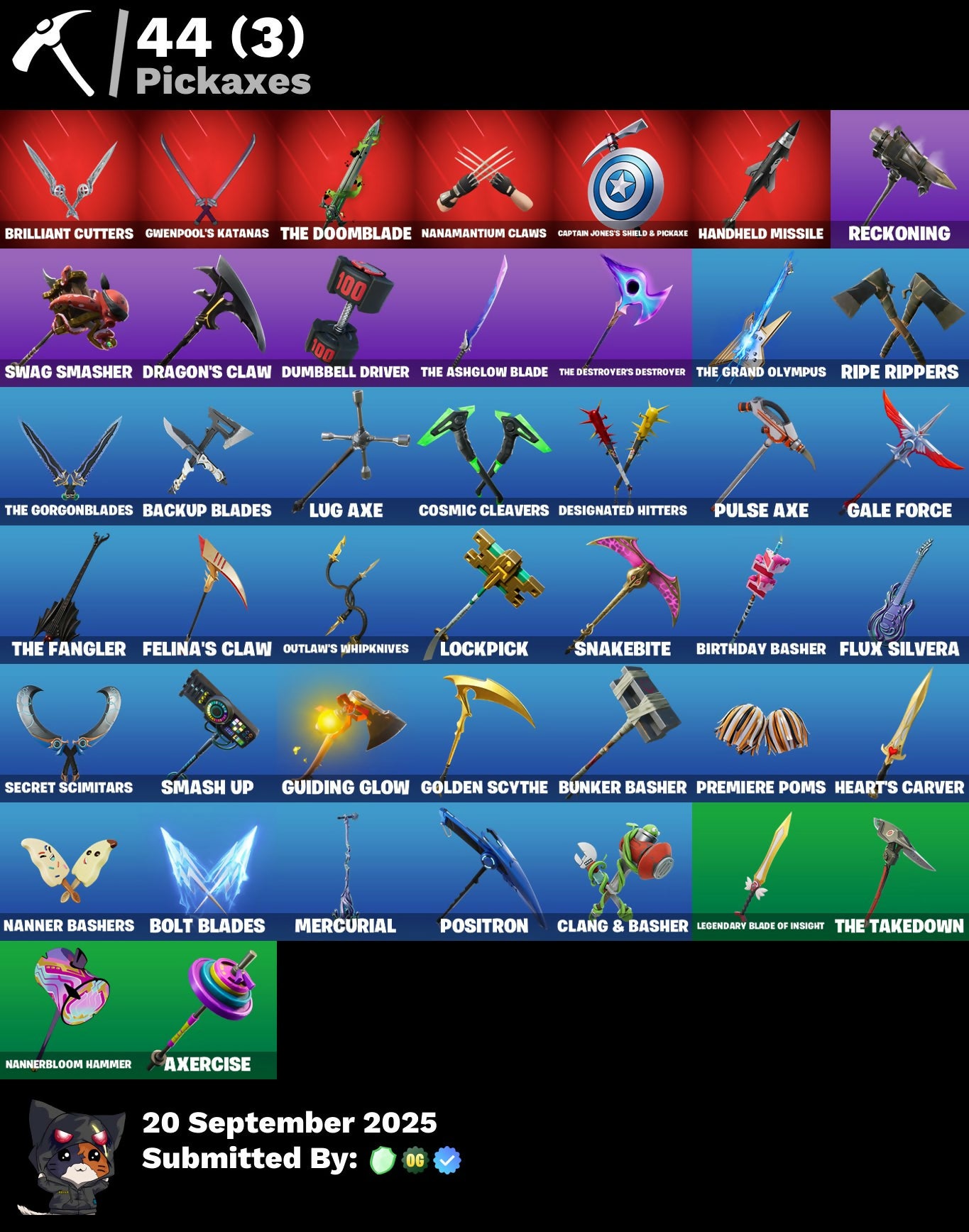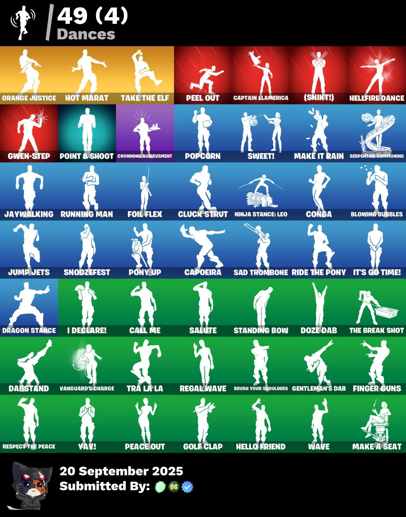 Axercise, Backup Blades, Battlehawk, Birthday Basher, Blackheart, Blowing Bubbles, Blue Squire, Bolt Blades, Brilliant Cutters, Brite Bomber, Brush Your Shoulders, Bunker Basher, Bunker Jonesy, Calamity, Call Me, Capoeira, Captain Jones, Captain Jones's Shield & Pickaxe, Captain Llamerica, Carbide, Catalyst, Clang & Basher, Cluck Strut, Conga, Cosmic Cleavers, Crowning Achievement, Cryptic Coaster, Cryptic Sling-Kit, DJ Yonder, Dabstand, Designated Hitters, Doom, Doze Dab, Dragon Stance, Dragon's Claw, Dumbbell Driver, Emma Frost, Fable, Felina, Felina's Claw, Finger Guns, Flux Silvera, Foil Flex, Gale Force, Gentleman's Dab, Giddy-Up, Golden Scythe, Golf Clap, Guiding Glow, Gwen-Step, Gwenpool, Gwenpool's Katanas, Handheld Missile, Heart's Carver, Hellfire Dance, Hello Friend, Hot Marat, Hybrid, I Declare!, It's Go Time!, Jack O'Sassin, Jaywalking, Jump Jets, Legendary Blade Of Insight, Lockpick, Lug Axe, Make A Seat, Make It Rain, Mercurial, Nanamantium Claws, Nanner Bashers, Nannerbloom Hammer, Ninja Stance: Leo, Orange Justice, Outlaw's Whipknives, Peace Out, Peel Out, Peelverine, Peely, Point & Shoot, Pony Up, Popcorn, Positron, Premiere Poms, Pulse Axe, Reckoning, Regal Wave, Respect The Peace, Ride The Pony, Ripe Rippers, Rogue Agent, Rox, Royale Knight, Running Man, Rust Bucket, Sad Trombone, Salute, Secret Scimitars, Sentinel, Serpentine Summoning, Sidewinder, Smash Up, Snakebite, Snikt!, Snoozefest, Standing Bow, Subzero Cryptic, Swag Smasher, Sweet!, Symbol Stalwart, Take The Elf, Teknique, The Ashglow Blade, The Break Shot, The Destroyer's Destroyer, The Doombrade, The Fangler, The Gorgonblades, The Grand Olympus, The Takedown, Tilted Teknique, Tra La La, Vanguard's Charge, Vega, War Machine, Wave, Wilde, X-Lord, Yay!, Yond3r