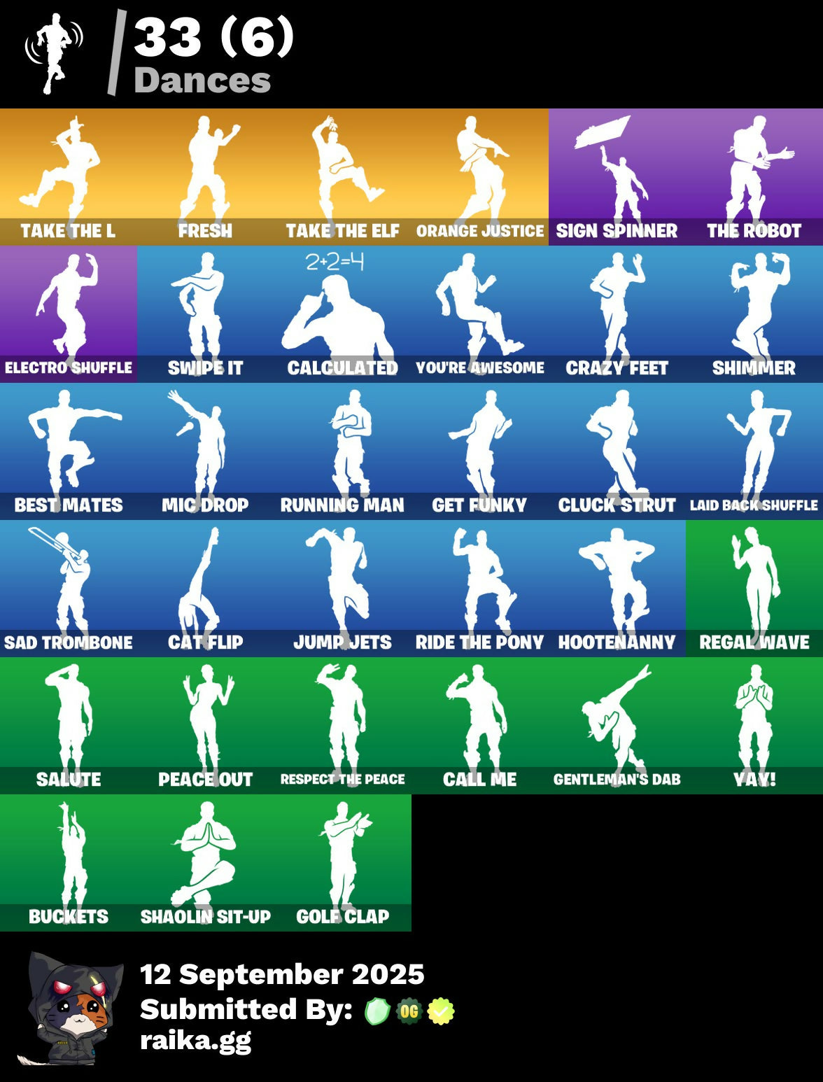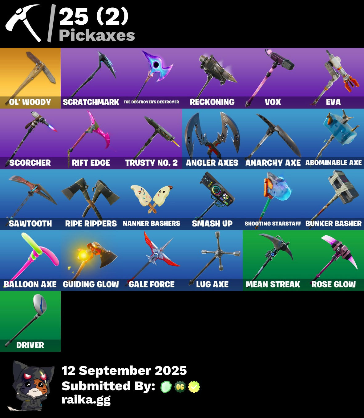 Abominable Axe, Anarchy Axe, Angler Axes, Balloon Axe, Battlehawk, Best Mates, Buckets, Bunker Basher, Bunker Jonesy, Calamity, Calculated, Call Me, Carbide, Cat Flip, Cloaked Shadow, Cluck Strut, Constructor, Crazy Feet, DJ Yonder, Dark Voyager, Demi, Drift, Driver, Electro Shuffle, Elite Agent, Enforcer, Eva, Founder's Glider, Founder's Umbrella, Fresh, Gale Force, Gentleman's Dab, Get Funky, Giddy-Up, Golf Clap, Guiding Glow, Hootenanny, Huntress, Journey Vs Hazard, Jump Jets, Laid Back Shuffle, Lug Axe, Lynx, Mean Streak, Mic Drop, Mission Specialist, Moonwalker, Nanner Bashers, Ol' Woody, Orange Justice, Peace Out, Powder, Power Chord, Raven, Reckoning, Redline, Regal Wave, Respect The Peace, Ride The Pony, Rift Edge, Ripe Rippers, Rose Glow, Rose Team Leader, Rox, Running Man, Rust Bucket, Rust Lord, Sad Trombone, Salute, Sawtooth, Scorcher, Scratchmark, Sentinel, Sgt. Winter, Shaolin Sit-Up, Shimmer, Shooting Starstaff, Sign Spinner, Sledgehammer, Smash Up, Soldier, Stratus, Summit Striker, Sun Strider, Swipe It, Take The Elf, Take The L, Teknique, The Destroyer's Destroyer, The Reaper, The Robot, Trog, Trusty No. 2, Turk Vs Riptide, Vega, Vox, Warpaint, Yay!, You're Awesome, Zenith