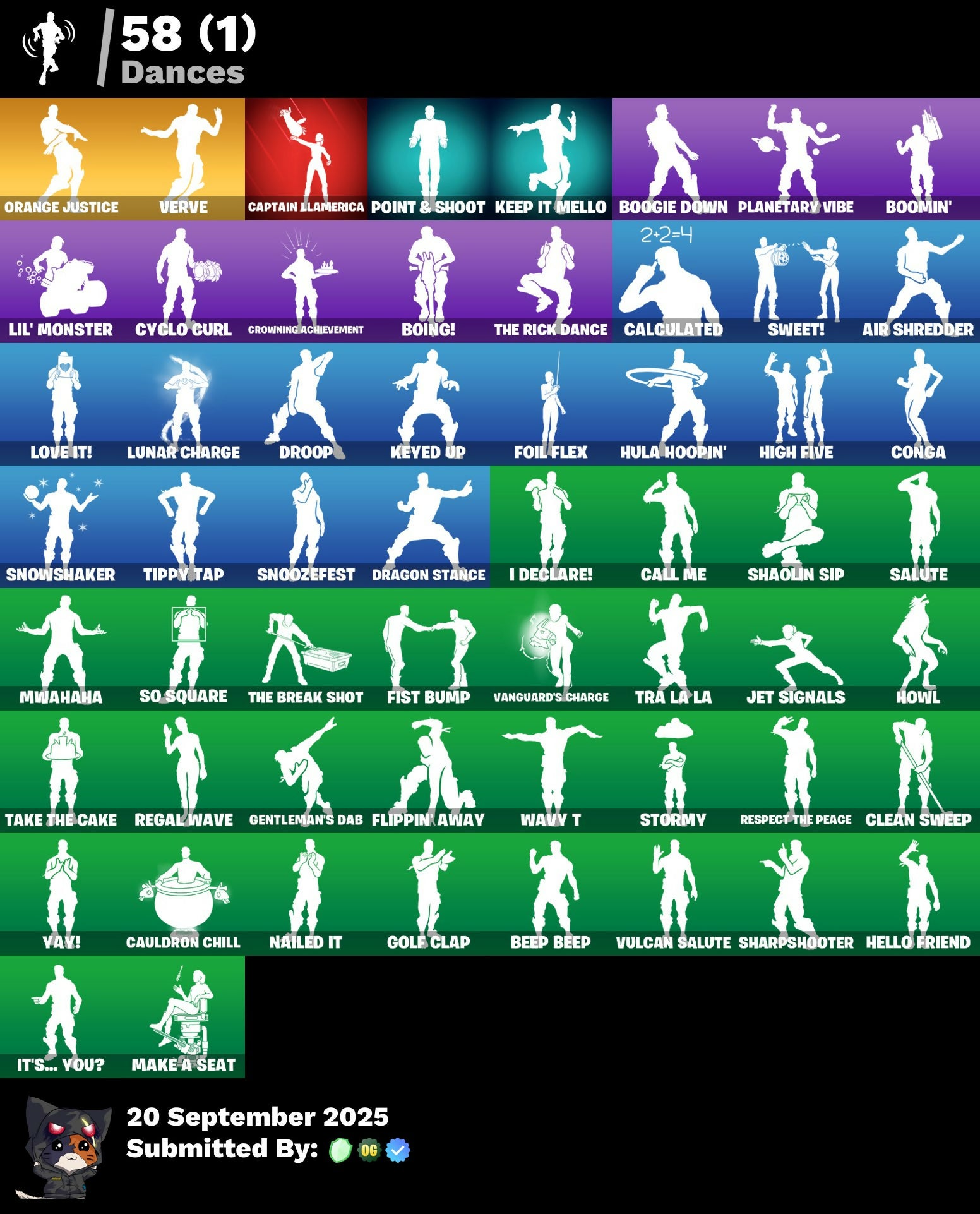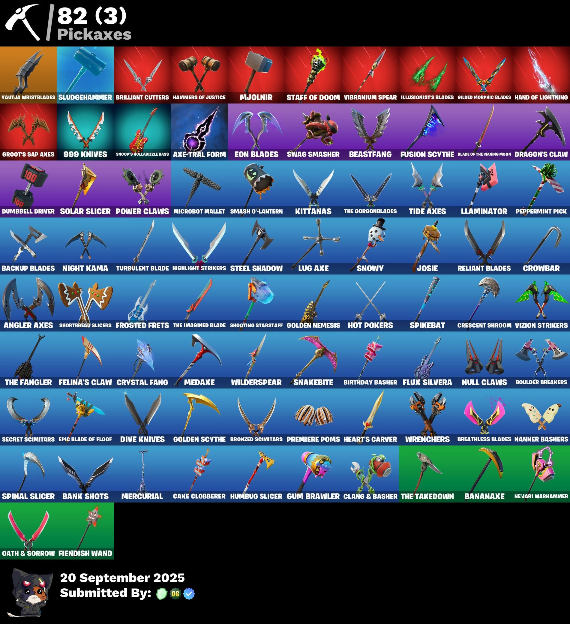 8-Ball Vs Scratch, 999 Knives, Air Shredder, Angler Axes, Astro Jack, Astroworld Cyclone, Axe-Tral Form, Backup Blades, Bananaxe, Bank Shots, Beastfang, Beep Beep, Birthday Basher, Blackheart, Blade of the Waning Moon, Boing!, Boogie Down, Boomin', Boulder Breakers, Breathless Blades, Brilliant Cutters, Bronzed Scimitars, Cake Clobberer, Calculated, Call Me, Cameo Vs Chic, Captain Llamerica, Cauldron Chill, Chun-Li, Clang & Basher, Clean Sweep, Conga, Crescent Shroom, Crowbar, Crowning Achievement, Crystal Fang, Cyclo Curl, Dive Knives, Doctor Doom, Dragon Stance, Dragon's Claw, Droop, Dumbbell Driver, Eon Blades, Epic Blade of Floof, Fade, Felina, Felina's Claw, Fiendish Wand, Fist Bump, Flippin' Away, Flux Silvera, Foil Flex, Frosted Frets, Fusion, Fusion Scythe, Gentleman's Dab, Gilded Morphic Blades, Golden Nemesis, Golden Scythe, Golf Clap, Groot, Groots Sap Axes, Gum Brawler, Gumbo, Hammers of Justice, Hand of Lightning, Harlowe, Haven, Heart's Carver, Hello Friend, High Five, Highlight Strikers, Hot Pokers, Howl, Hula Hoopin', Humbug Slicer, Hybrid, I Declare!, Illusionist's Blades, It's... You?, Jennifer Walters, Jet Signals, Josie, Journey Vs Hazard, Jules, Keep It Mello, Keyed Up, Kit, Kittanas, Kondor, Lexa, Lil' Monster, Llaminator, Love It!, Lt. Evergreen, Lt. John Llama, Lug Axe, Lunar Charge, Make A Seat, Mancake, Mandalorian, Mave, Medaxe, Mercurial, Microbot Mallet, Mjolnir, Mwahaha, Mystique, Nailed It, Nanner Bashers, Ne'Jari Warhammer, Night Kama, Null Claws, Oath & Sorrow, Ocean, Orange Justice, Peppermint Pick, Planetary Vibe, Point & Shoot, Power Claws, Premiere Poms, Reese, Regal Wave, Reliant Blades, Remedy Vs Toxin, Respect The Peace, Rippley Vs Sludge, Ronin, Ryu, Salute, Santa Dogg, Scuba Jonesy, Secret Scimitars, Shanta, Shaolin Sip, Sharpshooter, Shooting Starstaff, Shortbread Slicers, Sidewinder, Siona, Slayer Juice Wrld, Sludgehammer, Smash O'-Lantern, Snakebite, Snoop's Holladizzle Bass, Snoozefest, Snowshaker, Snowy, So Square, Solar Slicer, Spider-Man, Spikebat, Spinal Slicer, Staff of Doom, Steel Shadow, Storm, Stormy, Swag Smasher, Sweet!, Take The Cake, The Break Shot, The Fangler, The Gorgonblades, The Imagined Blade, The Rick Dance, The Takedown, Thor, Tide Axes, Tippy Tap, Tra La La, Turbulent Blade, Turk Vs Riptide, Vanguard's Charge, Verve, Vibranium Spear, Vizion Strikers, Vulcan Salute, Wavy T, Wilderspear, Wolverine, Wooly Warrior, Wrenchers, Yautja Wristblades, Yay!, Yulejacket