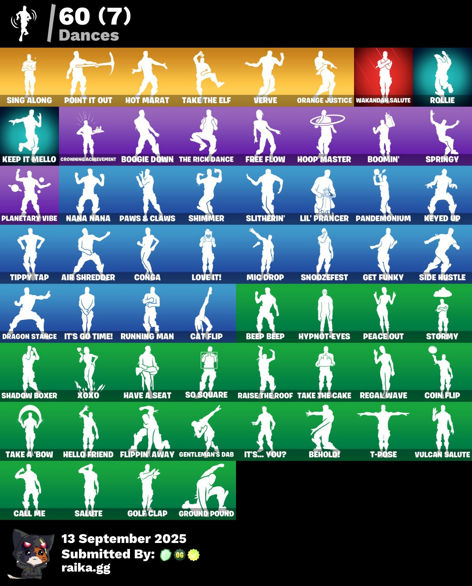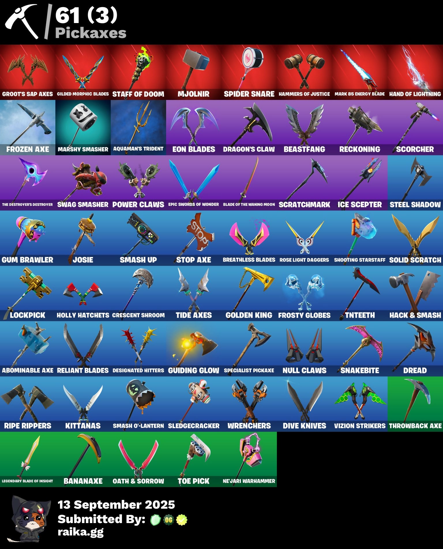 Abominable Axe, Agent Peely, Air Shredder, Aquaman, Aquaman's Trident, Arctic Adeline, Astro Jack, Astroworld Cyclone, Aura, Bananaxe, Beastfang, Beep Beep, Behold!, Blackheart, Blade of the Waning Moon, Boogie Down, Boomin', Breathless Blades, Calamity, Call Me, Cat Flip, Coin Flip, Conga, Crescent Shroom, Crowning Achievement, DJ Yonder, Dark Bomber, Deadpool, Designated Hitters, Dive Knives, Doctor Doom, Dragon Stance, Dragon's Claw, Dread, Dusk, Ember, Eon Blades, Epic Swords of Wonder, Eternal Knight, Fable, Fade, Flippin' Away, Free Flow, Frosty Globes, Frozen Axe, Gear Specialist Maya, Gentleman's Dab, Get Funky, Giddy-Up, Gilded Morphic Blades, Gold Brutus, Gold Midas, Golden King, Golf Clap, Groot, Groot's Sap Axes, Ground Pound, Guiding Glow, Gum Brawler, Hack & Smash, Hammers of Justice, Hand of Lightning, Have A Seat, Hello Friend, Holly Hatchets, Hoop Master, Hot Marat, Hybrid, Hypnot-Eyes, Ice Scepter, It's Go Time!, It's... You?, Jellie, Jennifer Walters, Josie, Jules, Keep It Mello, Keyed Up, Kit, Kittanas, Kondor, Legendary Blade of Insight, Lexa, Lil' Prancer, Lockpick, Love It!, Lynx, Mancake, Mandalorian, Mark 85 Energy Blade, Marshy Smasher, Master Key, Mave, Menace, Meowscles, Mic Drop, Mjolnir, Mystique, Nana Nana, Ne'Jari Warhammer, Null Claws, Oath & Sorrow, Ocean, Onesie, Orange Justice, Pandemonium, Paws & Claws, Peace Out, Peely, Planetary Vibe, Point It Out, Powder, Power Claws, Raise The Roof, Reckoning, Reese, Regal Wave, Reliant Blades, Ripe Rippers, Rogue Agent, Rollie, Rose Light Daggers, Rox, Ruin, Running Man, Rust Bucket, Salute, Scorcher, Scratchmark, Scuba Jonesy, Sentinel, Sgt. Winter, Shadow Boxer, Shimmer, Shooting Starstaff, Side Hustle, Sidewinder, Sing Along, Siona, Skye, Sled Ready Guff, Sledgecracker, Slitherin', Smash O'-Lantern, Smash Up, Snakebite, Snoozefest, So Square, Solid Scratch, Specialist Pickaxe, Spider Snare, Spike, Springy, Staff of Doom, Steel Shadow, Stop Axe, Storm, Stormy, Swag Smasher, T-Pose, Take A 'Bow, Take The Cake, Take The Elf, The Destroyer's Destroyer, The Ice King, The Prisoner, The Rick Dance, Thor, Throwback Axe, Tide Axes, Tippy Tap, Tnteeth, Tntina, Toe Pick, Tony Stark, Trog, Verve, Vizion Strikers, Vulcan Salute, Wakandan Salute, Wolverine, Wrenchers, Xoxo, Zenith