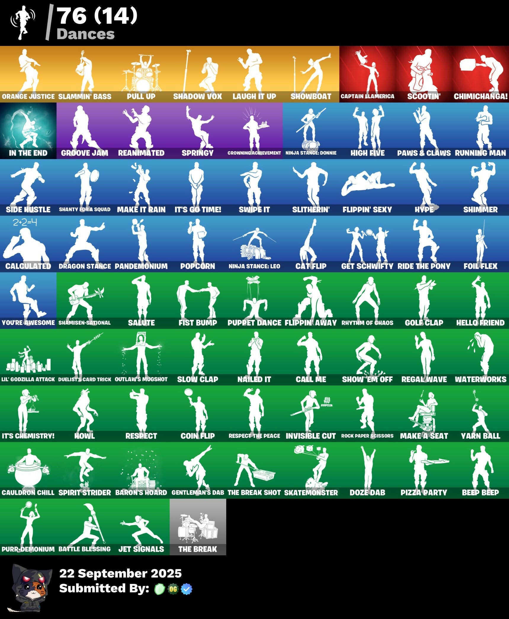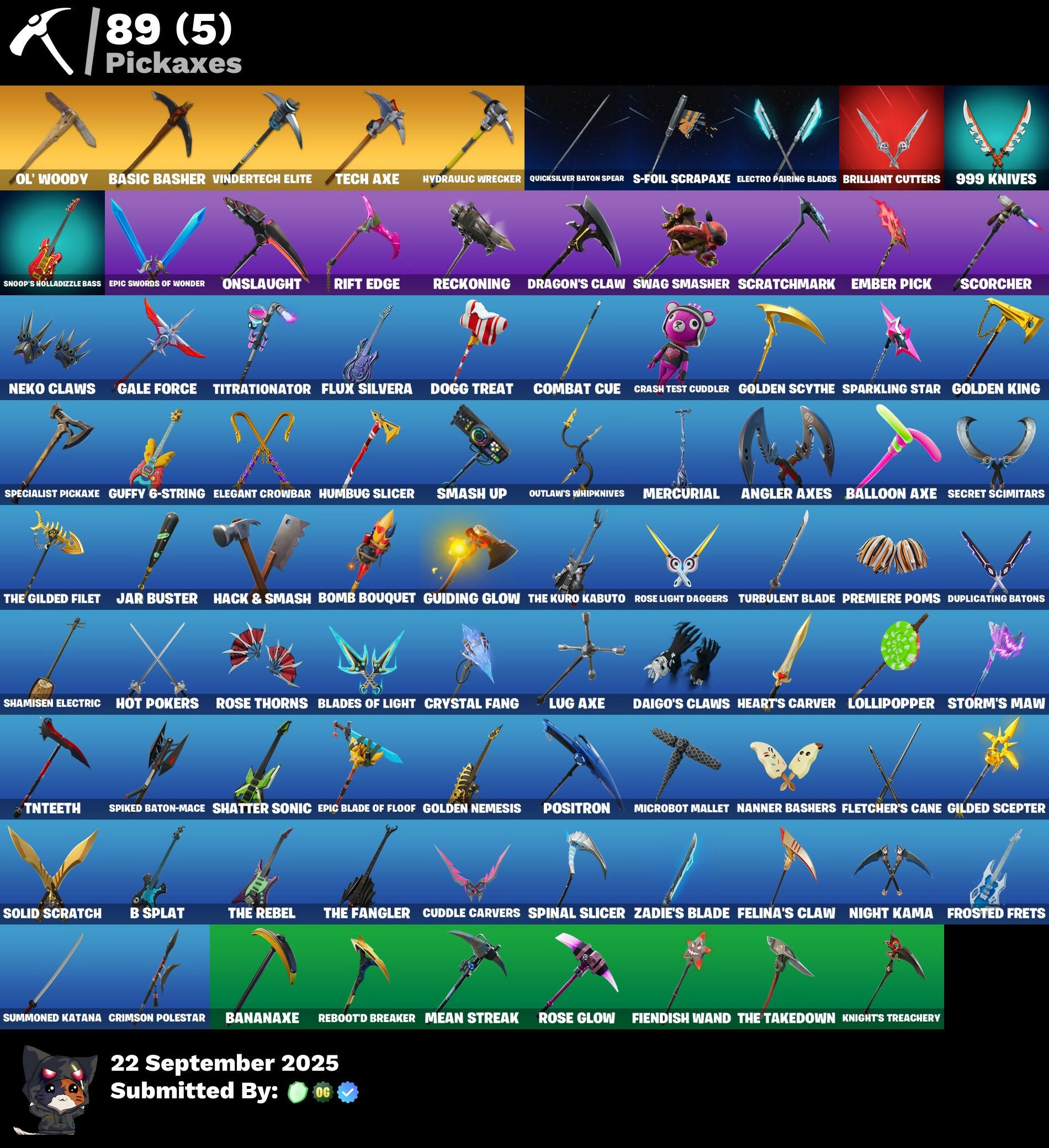 1-Ball, 999 Knives, Agent Peely, Angler Axes, Astroworld Cyclone, B Splat, Balloon Axe, Bananaxe, Baron's Hoard, Basic Basher, Battle Blessing, Battlehawk, Beep Beep, Big Dill, Blackheart, Blades Of Light, Bomb Bouquet, Brilliant Cutters, Calamity, Calculated, Call Me, Captain Llamerica, Carbide, Cassidy Quinn, Cat Flip, Cauldron Chill, Chaos Director, Chimichanga!, Coin Flip, Combat Cue, Constructor, Crash Test Cuddler, Crimson Polestar, Crowning Achievement, Crystal Fang, Cuddle Carvers, Daigo, Daigo's Claws, Deadpool, Dj Yonder, Dogg Treat, Doze Dab, Dragon Stance, Dragon's Claw, Drift, Duelist's Card Trick, Duplicating Batons, Dusk, Dynamo Tntina, Electro Pairing Blades, Elegant Crowbar, Ember Pick, Epic Blade Of Floof, Epic Swords Of Wonder, Fable, Felina, Felina's Claw, Fiendish Wand, Fist Bump, Fletcher Kane, Fletcher's Cane, Flippin' Away, Flippin' Sexy, Flux Silvera, Foil Flex, Founder's Glider, Founder's Umbrella, Frosted Frets, Gale Force, Gear Specialist Maya, Gentleman's Dab, Get Schwifty, Giddy-Up, Gilded Scepter, Godzilla Evolved, Gold Brutus, Gold Midas, Golden King, Golden Nemesis, Golden Scythe, Golf Clap, Groove Jam, Guffy 6-String, Guiding Glow, Hack & Smash, Heart's Carver, Hello Friend, Hero Baymax, High Five, Holiday Boxy, Hot Pokers, Howl, Humbug Slicer, Huntress, Hybrid, Hydraulic Wrecker, Hype, In The End, Invisible Cut, It's Chemistry!, It's Go Time!, Jade, Jar Buster, Jet Signals, Joss, Journey Vs Hazard, Kendo, Knights Treachery, Laugh It Up, Lil' Godzilla Attack, Lollipopper, Lug Axe, Lynx, Make A Seat, Make It Rain, Mean Streak, Meowdas, Meowscles, Mercurial, Microbot Mallet, Mr. Meeseeks, Nailed It, Nanner Bashers, Neko Claws, Night Kama, Ninja Stance: Donnie, Ninja Stance: Leo, Nyanja, Ol' Woody, Omega, Onslaught, Orange Justice, Outlander, Outlaw Midas, Outlaw's Mugshot, Outlaw's Whipknives, Pandemonium, Paws & Claws, Pizza Party, Popcorn, Positron, Premiere Poms, Pull Up, Puppet Dance, Purr-Demonium, Quicksilver Baton Spear, Reanimated, Reboot'd Breaker, Reckoning, Redline, Regal Wave, Respect, Respect The Peace, Rhythm Of Chaos, Ride The Pony, Rift Edge, Rippley Vs Sludge, Rock Paper Scissors, Rose Glow, Rose Light Daggers, Rose Team Leader, Rose Thorns, Running Man, Runway Racer, S-Foil Scrapaxe, Salute, Santa Dogg, Scootin', Scorcher, Scratchmark, Secret Scimitars, Sgt. Winter, Shadow Blade Hope, Shadow Vox, Shamisen Electric, Shamisen-Sational, Shanty For A Squad, Shatter Sonic, Shimmer, Show 'Em Off, Showboat, Side Hustle, Skatemonster, Skull, Skye, Slammin' Bass, Slayer Juice Wrld, Sledgehammer, Slitherin', Slow Clap, Smash Up, Snoop's Holladizzle Bass, Soldier, Solid Scratch, Sparkling Star, Specialist Pickaxe, Spiked Baton-Mace, Spinal Slicer, Spirit Strider, Springy, Squad Leader, Squared, Steel Wool, Storm's Maw, Summoned Katana, Sun Strider, Swag Smasher, Swipe It, Tech Axe, Teknique, The Ace, The Break, The Break Shot, The Fangler, The Gilded Filet, The Kuro Kabuto, The Night Rose, The Rebel, The Takedown, The Visitor, Titrationator, Tnteeth, Tntina, Turbulent Blade, Turk Vs Riptide, Undercover Skye, Valentina, Valor, Vindertech Elite, Warpaint, Waterworks, Winterfest Bushranger, Yarn Ball, You're Awesome, Yulejacket, Zadie's Blade, Zenith, Zoey