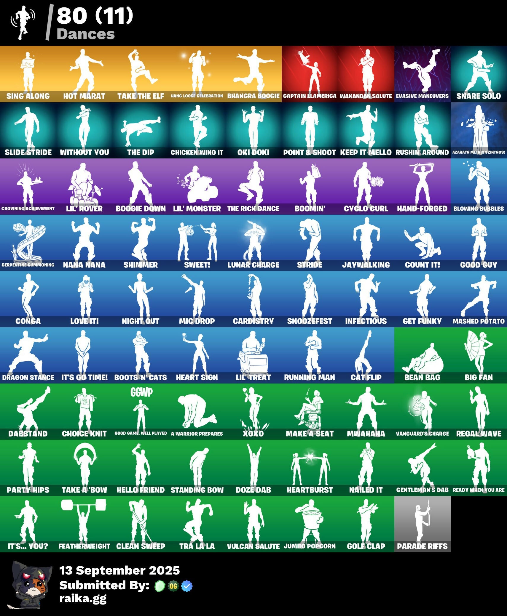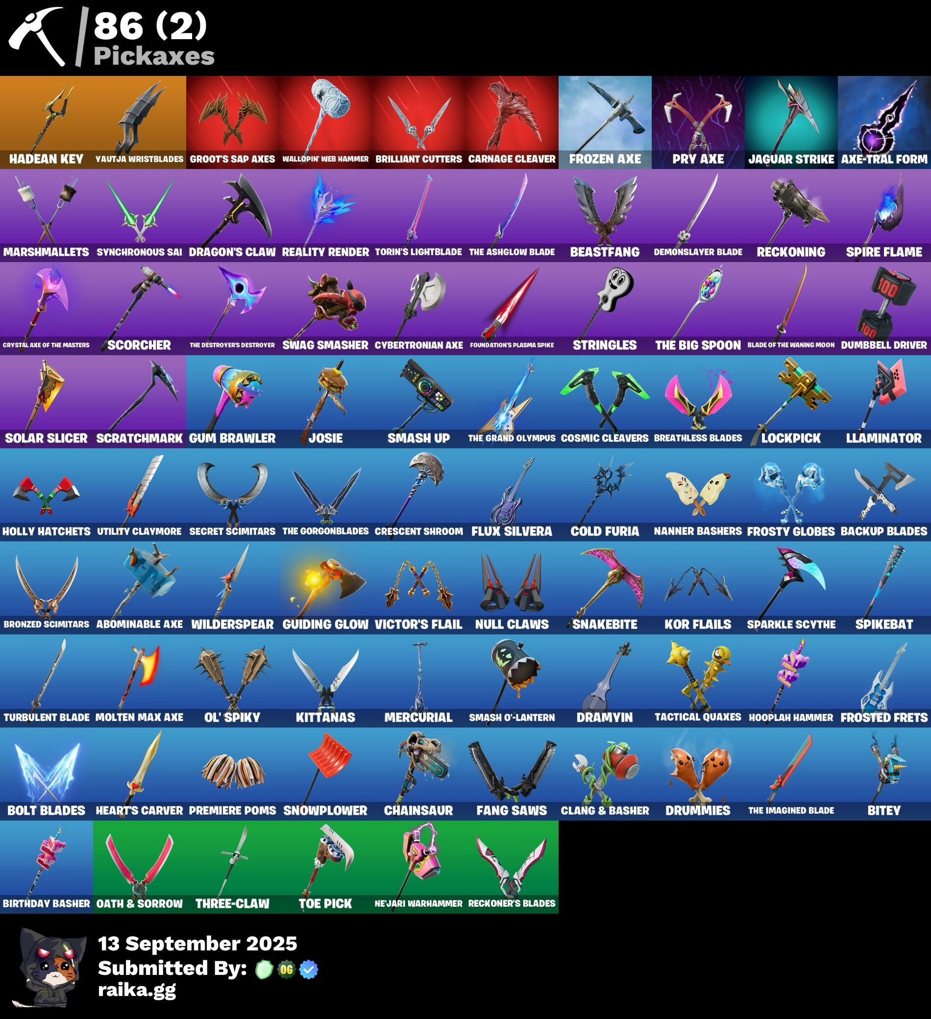 A Warrior Prepares, Abominable Axe, Agent Jones, Axe-Tral Form, Azarath Metrion Zinthos!, Backup Blades, Bean Bag, Beastfang, Bhangra Boogie, Big Fan, Birthday Basher, Bitey, Blackheart, Blade Of The Waning Moon, Blowing Bubbles, Bolt Blades, Boogie Down, Boomin', Boots 'N' Cats, Breathless Blades, Brilliant Cutters, Bronzed Scimitars, Bunnymoon, Calamity, Captain Llamerica, Cardistry, Carnage, Carnage Cleaver, Cat Flip, Catalyst, Chainsaur, Championship Aura, Charlotte, Chica, Chicken Wing It, Choice Knit, Clang & Basher, Clean Sweep, Cluck, Cold Furia, Conga, Cosmic Cleavers, Count It!, Crescent Shroom, Crowning Achievement, Crystal, Crystal Axe Of The Masters, Cybertronian Axe, Cyclo Curl, DJ Yonder, Dabstand, Demonslayer Blade, Doze Dab, Dragon Stance, Dragon's Claw, Dramyin, Drummies, Dumbbell Driver, Evasive Maneuvers, Fabio Sparklemane, Fable, Fang Saws, Featherweight, Flux Silvera, Foundation's Plasma Spike, Frost Squad, Frosted Frets, Frosty Globes, Frozen Axe, Gentleman's Dab, Get Funky, Giddy-Up, Glumbunny, Golf Clap, Good Game, Well Played, Good Guy, Groot's Sap Axes, Guiding Glow, Gum Brawler, Gumbo, Hadean Key, Hand-Forged, Hang Loose Celebration, Hard-Won Treasure, Harlowe, Haven, Heart Sign, Heart's Carver, Heartburst, Hello Friend, High Hoops, Holly Hatchets, Hooplah Hammer, Hot Marat, Hybrid, Infectious, Isabelle, It's Go Time!, It's... You?, J.B. Chimpanski, Jaguar Strike, Jaywalking, Jolly Jammer, Josie, Jumbo Popcorn, Keep It Mello, Kittanas, Kondor, Kor, Kor Flails, Krisabelle, Lara Croft, Lexa, Lil' Monster, Lil' Rover, Lil' Treat, Llaminator, Lockpick, Love It!, Lt. John Llama, Lunar Charge, Lynx, Make A Seat, Mancake, Mandalorian, Marshmallets, Mashed Potato, Mave, Menace, Mercurial, Mic Drop, Molten Max Axe, Mwahaha, Nailed It, Nana Nana, Nanner Bashers, Ne'jari Warhammer, Neymar Jr, Night Out, Null Claws, Oath & Sorrow, Oki Doki, Ol' Spiky, Onesie, Parade Riffs, Party Hips, Peely, Point & Shoot, Polar Peely, Powder, Predator, Premiere Poms, Pry Axe, Raz, Ready When You Are, Reality Render, Rebirth Raven, Reckoner's Blades, Reckoning, Reese, Regal Wave, Ronin, Running Man, Rushin' Around, Santa Dogg, Scorcher, Scratchmark, Secret Scimitars, Serpentine Summoning, Sgt. Winter, Shanta, Shimmer, Sidewinder, Sing Along, Slide Stride, Smash O'-Lantern, Smash Up, Snakebite, Snare Solo, Snoozefest, Snowmando, Snowplower, Solar Slicer, Sparkle Scythe, Sparkle Supreme, Spider-Man, Spikebat, Spire Assassin, Spire Flame, Standing Bow, Stride, Stringles, Summit Striker, Swag Smasher, Sweet!, Synchronous Sai, Tactical Quaxes, Take A 'Bow, Take The Elf, Tarana, The Ace, The Ashglow Blade, The Big Spoon, The Cube Queen, The Destroyer's Destroyer, The Dip, The Foundation, The Gorgonblades, The Grand Olympus, The Imagined Blade, The Prisoner, The Rick Dance, Three-Claw, Tilted Teknique, Toe Pick, Toona Fish, Torin, Torin's Lightblade, Tra La La, Trog, Turbulent Blade, Underworld Desdemona, Utility Claymore, Vanguard's Charge, Victor's Flail, Vulcan Salute, Wakandan Salute, Wallopin' Web Hammer, Wilderspear, Without You, X-Lord, Xoxo, Yautja Wristblades, Yond3r, Zenith