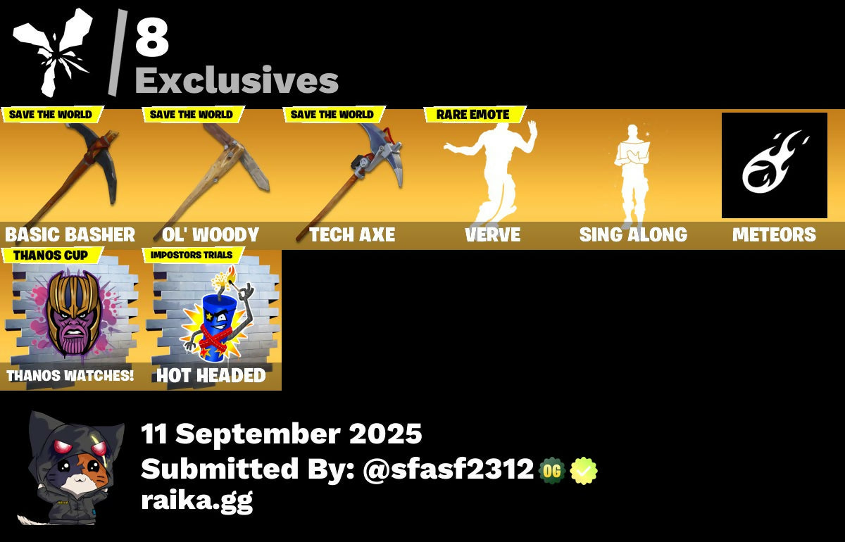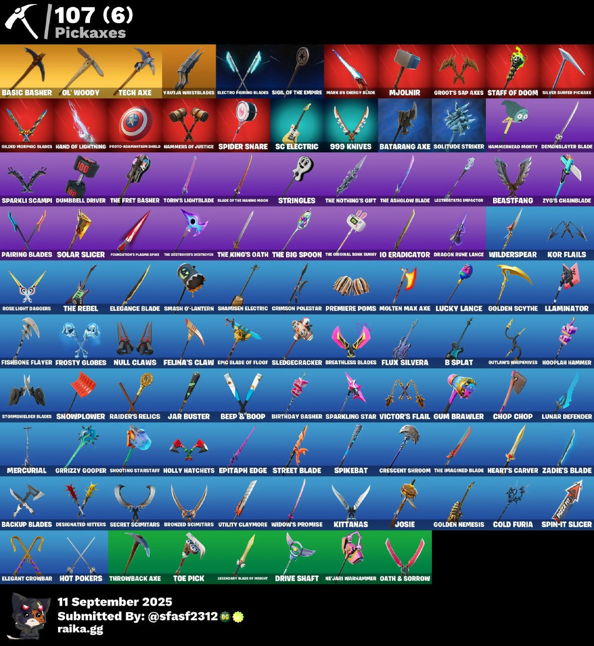 999 Knives, A Warrior Prepares, Adira, Ahsoka Tano, Arctic Adeline, B Splat, Backup Blades, Ballsy, Baron's Hoard, Basic Basher, Batarang Axe, Beastfang, Beep & Boop, Birthday Basher, Blade Of The Waning Moon, Blowin' Up, Boogie Down, Boomin', Boosting Ki, Breathless Blades, Bronzed Scimitars, Bytes, Call Me, Captain America, Castaway Jonesy, Charging Up, Charlotte, Choice Knit, Chop Chop, Clark Kent, Clean Sweep, Clone Trooper, Cold Furia, Count It!, Crescent Shroom, Crimson Polestar, Crowning Achievement, Curling Iron, Cyclo Curl, Dagger Dance, Darth Vader, Demonslayer Blade, Designated Hitters, Doctor Doom, Doctor Slone, Dragon Rune Lance, Drive Shaft, Dumbbell Driver, Electro Pairing Blades, Elegance Blade, Elegant Crowbar, Epic Blade Of Floof, Epitaph Edge, Evie, Fabio Sparklemane, Felina's Claw, Fish Thicc, Fishbone Flaver, Flaky Feast, Flippin' Away, Flux Silvera, Foundation's Plasma Spike, Frost Squad, Frosty Globes, Gilded Morphic Blades, Golden Nemesis, Golden Scythe, Good Guy, Grizzly Gooper, Groot, Groot's Sap Axes, Grriz, Guggimon, Gum Brawler, Gumbo, Hammerhead Morty, Hammers Of Justice, Hand Of Lightning, Hand-Forged, Harlowe, Haven, Heart's Carver, Holly Hatchets, Hooplah Hammer, Hot Headed, Hot Pokers, IO Eradicator, Imperial March, Imperial Stormtrooper, Indiana Jones, It Is Finished, J.B. Chimpanski, Jar Buster, Jennifer Walters, Joey, Josie, Kick Back, Kittanas, Kondor, Kor, Kor Flails, Krisabelle, Kymera, Laser Focused, Last Forever, Lectrostatic Impactor, Legendary Blade Of Insight, Lennox Rose, Lexa, Lil' Monster, Lil' Podracer, Lil' Prancer, Lil' Rover, Lil' Saucer, Llaminator, Love It!, Lt. John Llama, Lucky Lance, Lumi Jellie, Lunar Charge, Lunar Defender, Make A Seat, Malik, Mancake, Mandalorian, Mark 85 Energy Blade, Mashed Potato, Mave, Menace, Meow Skulls, Mercurial, Meteors, Mjolnir, Molten Max Axe, Mwahaha, Mystique, Nailed It, Ne'Jari Warhammer, Never Gonna, Nolan Chance, Null Claws, OMG I Love It, Oath & Sorrow, Obi-Wan's Message, Ol' Woody, Out West, Outlaw's Whipknives, Pairing Blades, Paradigm (Reality-659), Piper Pace, Pitcycle, Polar Peely, Predator, Premiere Poms, Proto-Adamantium Shield, Raider's Relics, Rainbow Racer, Raise The Roof, Raven's Legion, Ready When You Are, Reese, Rick Sanchez, Rollie, Ronin, Rose Light Daggers, SC Electric, Sabina, Samurai Scrapper, Secret Scimitars, Seeker, Shamisen Electric, Shanta, Shooting Starstaff, Shuriken Spinner, Sigil Of The Empire, Silver Surfer, Silver Surfer Pickaxe, Sing Along, Ska-Straterrestrial, Slayer Juice Wrld, Sled Ready Guff, Sledgecracker, Smash O'-Lantern, Snap, Snowmando, Snowplower, Solar Slicer, Solitude Striker, Sparkling Star, Sparklì Scampi, Spider Snare, Spikebat, Spin-It Slicer, Staff Of Doom, Standing Bow, Steady, Storm, Stormfarer, Stormshielder Blades, Street Blade, Stringles, Sunny, Take A 'Bow, Take The Cake, Tech Axe, Thanos Watches!, The Ashglow Blade, The Big Spoon, The Break Shot, The Cube Queen, The Destroyer's Destroyer, The Foundation, The Fret Basher, The Herald, The Imagined Blade, The King's Oath, The Nothing's Gift, The Original Bonk Bunny, The Rebel, The Renegade, The Rick Dance, Thor, Throwback Axe, Toe Pick, Tony Stark, Toona Fish, Torin, Torin's Lightblade, Twyn, Underworld Desdemona, Utility Claymore, Vanguard Zadie, Vautja Wristblades, Verve, Victor's Flail, Vulcan Salute, Wakandan Salute, Widow's Promise, Wilderspear, Wolverine, Wrap Recon, Xoxo, ZVG's Chainblade, Zadie's Blade, Zoe Clash, Zyg