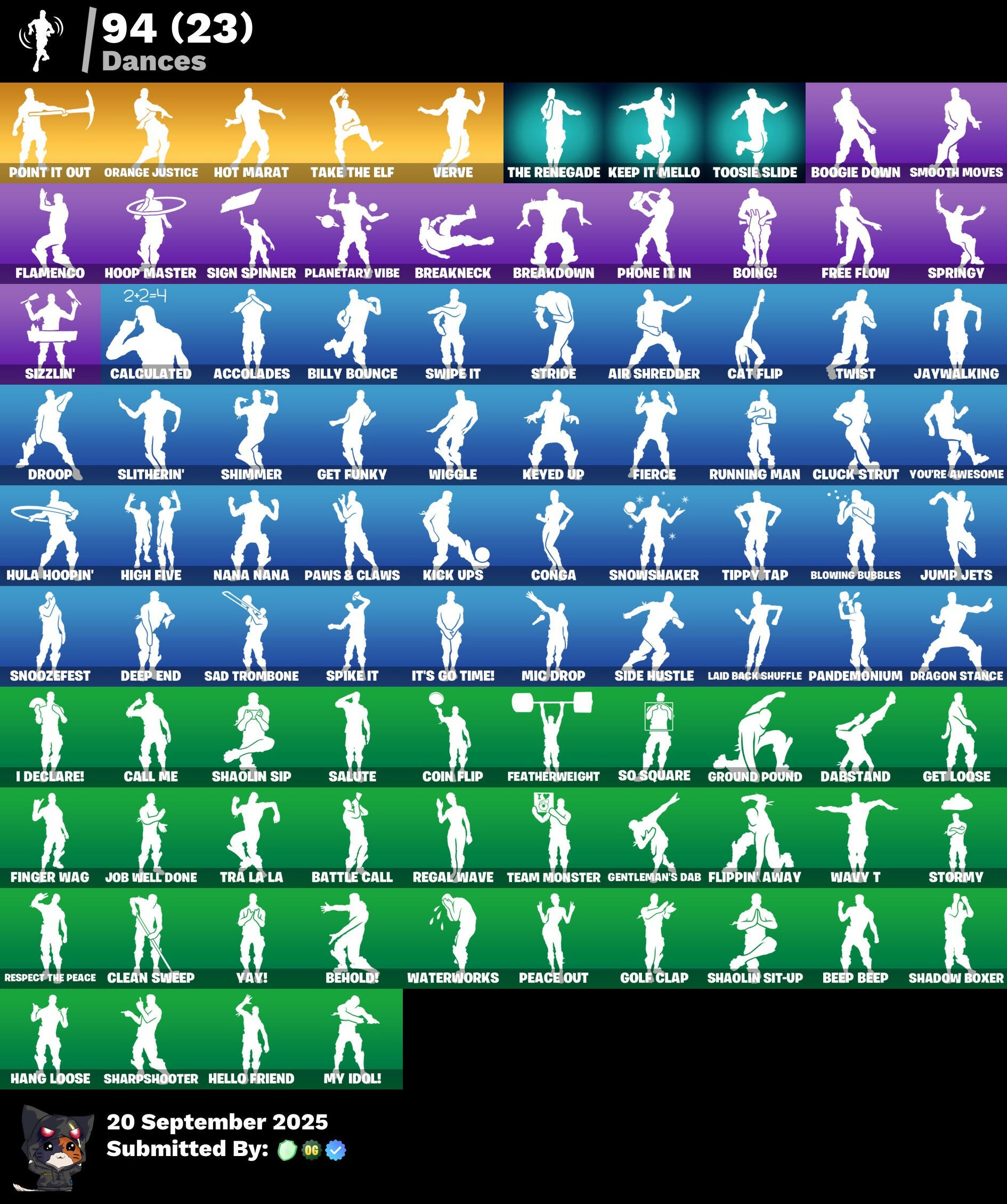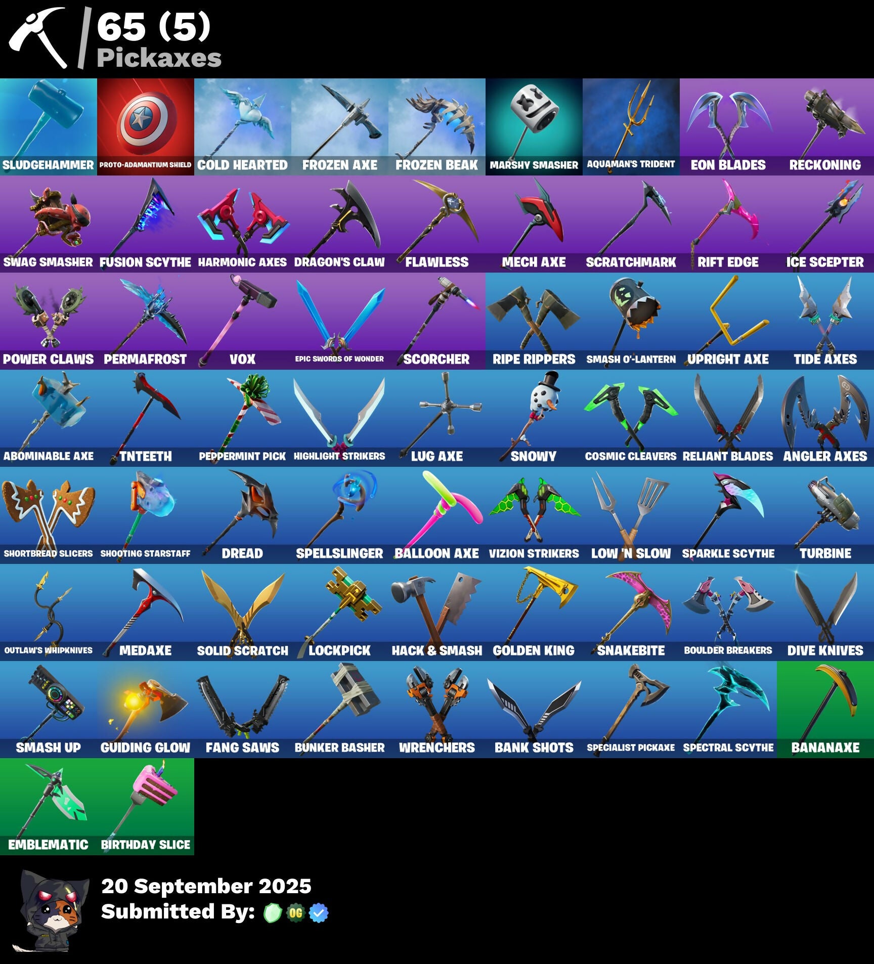 8-Ball vs Scratch, Abominable Axe, Accolades, Agent Peely, Air Shredder, Angler Axes, Aquaman, Aquaman's Trident, Astro Jack, Astroworld Cyclone, Axo, Balloon Axe, Bananaxe, Bank Shots, Battle Call, Beep Beep, Behold!, Billy Bounce, Birthday Slice, Blackheart, Blowing Bubbles, Boing!, Boogie Down, Boulder Breakers, Branded Brigadier, Breakdown, Breakneck, Brite Bomber, Bunker Basher, Bunker Jonesy, Calamity, Calculated, Call Me, Cameo vs Chic, Captain America, Cat Flip, Catalyst, Clean Sweep, Cluck Strut, Coin Flip, Cold Hearted, Conga, Cosmic Cleavers, DJ Yonder, Dabstand, Deadpool, Deep End, Demi, Dire, Dive Knives, Dragon Stance, Dragon's Claw, Dread, Drift, Droop, Dusk, Ember, Emblematic, Eon Blades, Epic Swords Of Wonder, Eternal Knight, Eternal Voyager, Fable, Fade, Fang Saws, Featherweight, Fierce, Finger Wag, Fishstick, Flamenco, Flawless, Flippin' Away, Free Flow, Frozen Axe, Frozen Beak, Frozen Feathers, Fusion, Fusion Scythe, Gear Specialist Maya, Gentleman's Dab, Get Funky, Get Loose, Giddy-Up, Gold Brutus, Gold Meowscles, Gold Midas, Golden King, Golf Clap, Ground Pound, Guiding Glow, Hack & Smash, Hang Loose, Harmonic Axes, Hello Friend, High Five, Highlight Strikers, Hoop Master, Hot Marat, Hula Hoopin', Huntress, Hybrid, I Declare!, Ice Scepter, It's Go Time!, Jaywalking, Job Well Done, John Wick, Journey vs Hazard, Jules, Jump Jets, Keep It Mello, Keyed Up, Kick Ups, Kit, Laid Back Shuffle, Lockpick, Low 'N Slow, Lt. Evergreen, Lug Axe, Luxe, Lynx, Marshy Smasher, Master Key, Mech Axe, Mecha Team Banner, Medaxe, Mic Drop, Monster Team Banner, My Idol!, Nana Nana, Nightshade, Ocean, Onesie, Orange Justice, Outlaw's Whipknives, Pandemonium, Paws & Claws, Peace Out, Peely, Peppermint Pick, Permafrost, Phone It In, Planetary Vibe, Point It Out, Poised Playmaker, Powder, Power Claws, Proto-Adamantium Shield, Ragnarok, Reckoning, Redline, Regal Wave, Reliant Blades, Remedy vs Toxin, Respect The Peace, Rift Edge, Ripe Rippers, Rippley vs Sludge, Rook, Rox, Ruin, Running Man, Rust Bucket, Sad Trombone, Salute, Scorcher, Scratchmark, Scuba Jonesy, Sentinel, Sgt. Green Clover, Sgt. Winter, Shadow Boxer, Shaolin Sip, Shaolin Sit-Up, Sharpshooter, Shimmer, Shooting Starstaff, Shortbread Slicers, Side Hustle, Sidewinder, Sign Spinner, Siona, Sizzlin', Skull Trooper, Skye, Sledgehammer, Slitherin', Sludgehammer, Smash O'-Lantern, Smash Up, Smooth Moves, Snakebite, Snoozefest, Snowshaker, Snowy, So Square, Solid Scratch, Sparkle Scythe, Sparkle Supreme, Specialist Pickaxe, Spectral Scythe, Spellslinger, Spike, Spike It, Springy, Stormy, Stratus, Stride, Summit Striker, Sun Strider, Swag Smasher, Swipe It, TNTeeth, Take The Elf, Team Monster, The Ice King, The Prisoner, The Renegade, The Scientist, Tide Axes, Tilted Teknique, Tippy Tap, Tntina, Toosie Slide, Tra La La, Trog, Turbine, Turk vs Riptide, Twist, Upright Axe, Vega, Vendetta, Verve, Vizion Strikers, Vox, Waterworks, Wavy T, Wiggle, Wingman, Wooly Warrior, World Cup 2019, World Cup 2019 Banner, Wrenchers, X-Lord, Yay!, Yond3r, You're Awesome, Zenith