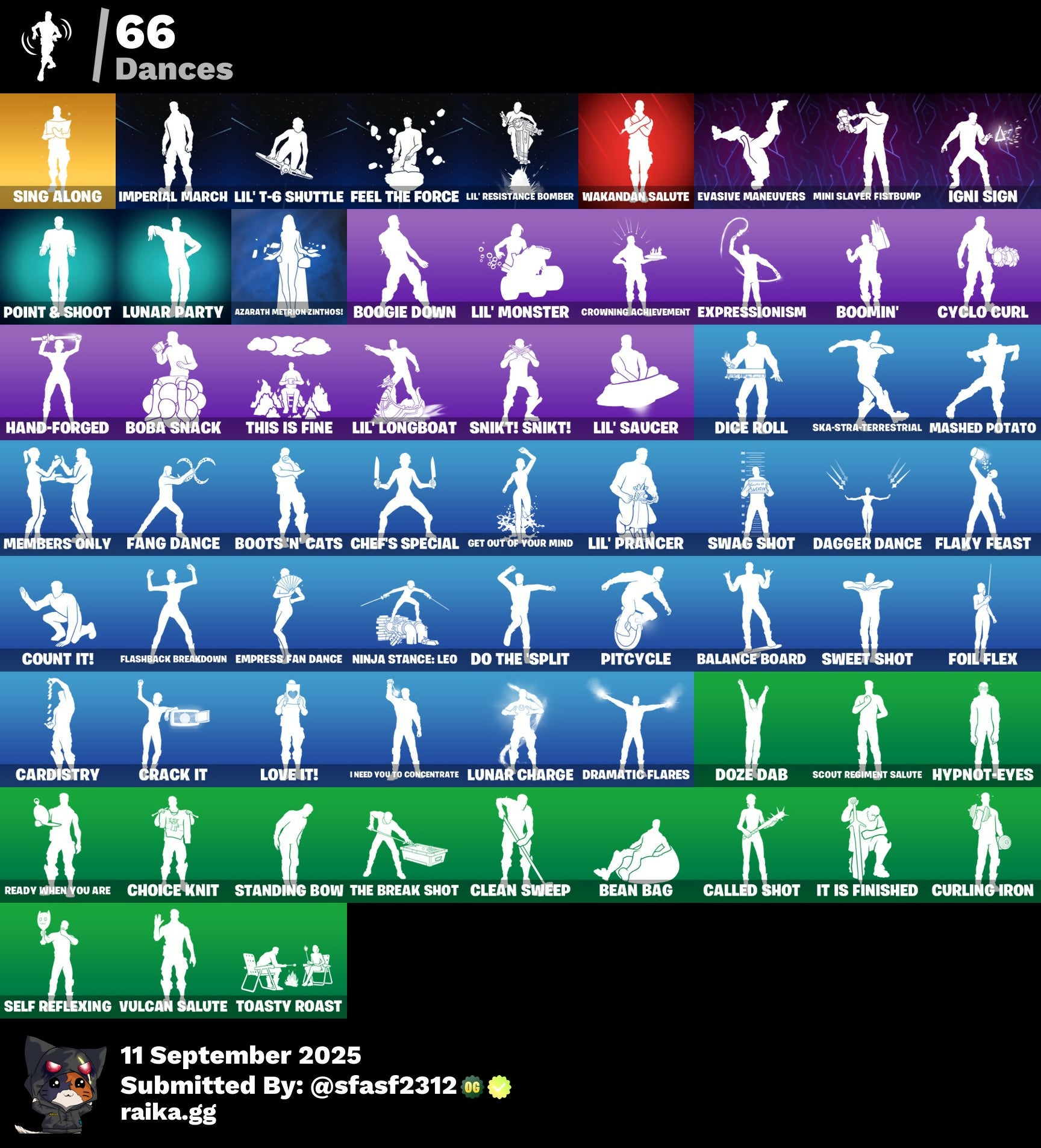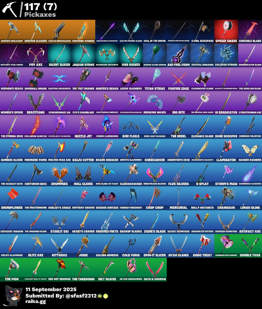999 Knives, Agent Jones, Ahsoka Tano, Antonia, Apprentice Evie, Arctic Adeline, Artifact Axe, Axe-Tral Form, Azarath Metrion Zinithos!, Azuki, B Splat, Backup Blades, Balance Board, Bean Bag, Beastfang, Big Bite, Birthday Basher, Blade of the Waning Moon, Blitz Axe, Board Breaker, Boba Snack, Boogie Down, Boomin', Boots 'N' Cats, Boxing Glove Arrow, Breaking Waves, Breathless Blades, Bronzed Scimitars, Called Shot, Cardistry, Centurion, Centurion Edge, Chainsaur, Charlotte, Chef's Special, Choice Knit, Chop Chop, Chrome Punk, Clean Sweep, Cluck, Codecarver, Cold Furia, Cosmic Llamacorn, Count It!, Crack It, Crescent Shroom, Crimson Polestar, Crowning Achievement, Crucible Blade, Cryptic, Crystal Axe of the Masters, Crystal Smasher, Curling Iron, Cybertronian Axe, Cyclo Curl, Dagger Dance, Dahlia, Deimos, Demonslayer Blade, Designated Hitters, Dice Roll, Do The Split, Doctor Slone, Dogg Treat, Doom Slayer, Double Tags, Doze Dab, Dramatic Flares, Drummies, Duelist's Grace, Dumbbell Driver, Dune Scooper, Dusk Knight, Dusty, Electric Crescents, Electro Pairing Blades, Elegance Blade, Empress Fan Dance, Epic Blade of Floof, Era, Evasive Maneuvers, Expressionism, Fang Dance, Fanged Foresight, Feel The Force, Fish Thicc, Flakes Power, Flaky Feast, Flashback Breakdown, Flux Silvera, Foil Flex, Foxfire Edge, Frosted Frets, Galaxia, General Grievous, Geralt Of Rivia, Get Out Of Your Mind, Giannis Antetokounmpo, Gildhart, Gilt Glaive, Golden Nemesis, Green Arrow, Guff Gringle, Guggimon, Hand-Forged, Hashmark Hatchets, Heart's Carver, Helsie, Highwire, Holiday Boxy, Holly Hatchets, Humbug Slicer, Hunter's Reach, Hypnot-Eyes, I Need You To Concentrate, IO Eradicator, Igni Sign, Imani, Imperial March, Inheritor's Edge, It Is Finished, Jaguar Strike, Joey, Joni The Red, Josie, Kaiju Cutter, Khaby Lame, Kittanas, Kondor, Kor Flails, Krisabelle, Kymera, Lara Croft, Lexa, Lil Split, Lil' Longboat, Lil' Monster, Lil' Prancer, Lil' Resistance Bomber, Lil' Saucer, Lil' T-6 Shuttle, Llaminator, Lorenzo, Love It!, Lt. John Llama, Lucha Slashers, Lunar Charge, Lunar Glow, Lunar Party, Mae, Magmaguard Electrostaff, Mancake, Mandalorian, Marauder's Machete, Mariposa, Mashed Potato, Massai, Mave, Mecha Cuddle Master, Members Only, Mercurial, Mini Slayer Fistbump, Mizuki, Molten Max Axe, Mystica, Nanner Bashers, Nannersbloom Hammer, Ne'Jari Warhammer, Neymar Jr, Nezumi, Ninja Stance: Leo, Nolan Chance, Nomad's Spear, Null Claws, Nuzzle Jet, Nyan Claws, Oath & Sorrow, Omegarok, Optimus Prime, Photonic Striker, Piper Pace, Pitcycle, Plasmacore Claws, Poe Dameron, Point & Shoot, Polar Peely, Predator, Premiere Poms, Pry Axe, Purradise Meowscles, Quicksilver Baton Spear, Rap Boy, Raz, Ready When You Are, Rebirth Raven, Red Hot Revenge, Reese, Relik, Renegade Lynx, Renzo The Destroyer, Rian, Rift Knight Kieran, Ronin, Rose Light Daggers, Runway Racer, S-Foil Scrapaxe, Santa Dogg, Scout Regiment Salute, Scratchmark Shredder, Secret Scimitars, Selene, Self Reflexing, Shanta, Sigil Of The Alliance War, Sigil of the Empire, Silent Slicer, Sing Along, Ska-Stra-Terrestrial, Slayer Juice Wrld, Sled Ready Guff, Sledgecracker, Smith's Slammers, Snikt! Snikt!, Snowplower, Solitude Striker, Sorrow's Reach, Soundwave Slashers, Spectra Knight, Spectra Slasher, Spellwork Scimitar, Spider Snare, Spin-It Slicer, Standing Bow, Starlit Sai, Storm's Maw, Stray, Sunny, Swag Shot, Swamp Knight, Sweet Shot, Sylvie, Synchronous Sai, Tarana, The Ageless, The Ashglow Blade, The Break Shot, The Destroyer's Destroyer, The Eternal Edge, The Fret Basher, The Imagined Blade, The Masterwork, The Original Bonk Bunny, The Rebel, The Scarlet Oath, The Takedown, This Is Fine, Thunder, Titan Strike, Toasty Roast, Toe Pick, Toona Fish, Trace, Triarch Nox, Underworld Desdemona, Utility Claymore, Vautja Wristblades, Vicious Vintage, Vulcan Salute, Wakandan Salute, Winter's Onslaught, Winterfest Bushranger, Witcher's Steel Sword, Zadie's Blade, Zyg, Zyg's Chainblade