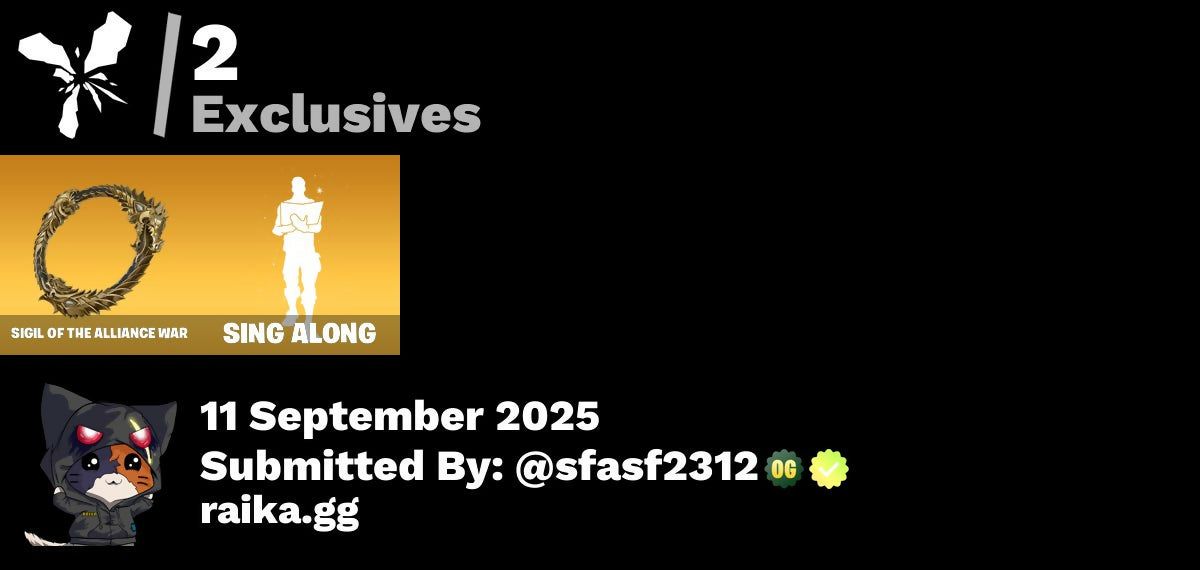 Outfits: Black Knight | Sparkle Specialist | The Reaper | Blue Squire | Royale Knight | Elite Agent | Omega (stage 5) | Rogue Agent | Zenith (Stage 4) | Lynx (Stage 4 - No Ponytail) | Drift Stage 5 | Ice King (Gold) | Carbide Armor Stage 5 | Rococo Cloak-o | Magmatic Mizuki | Valor | Gear Specialist Maya | Hime | Raven | Midas | Leviathan | The Prisoner | Love Ranger | Era | Dark Voyager | Wukong | The Visitor | Frostbite | Coruscant Guard | Clone Trooper | Darth Maul | Wolf Pack Trooper | Ahsoka's Clone Trooper |