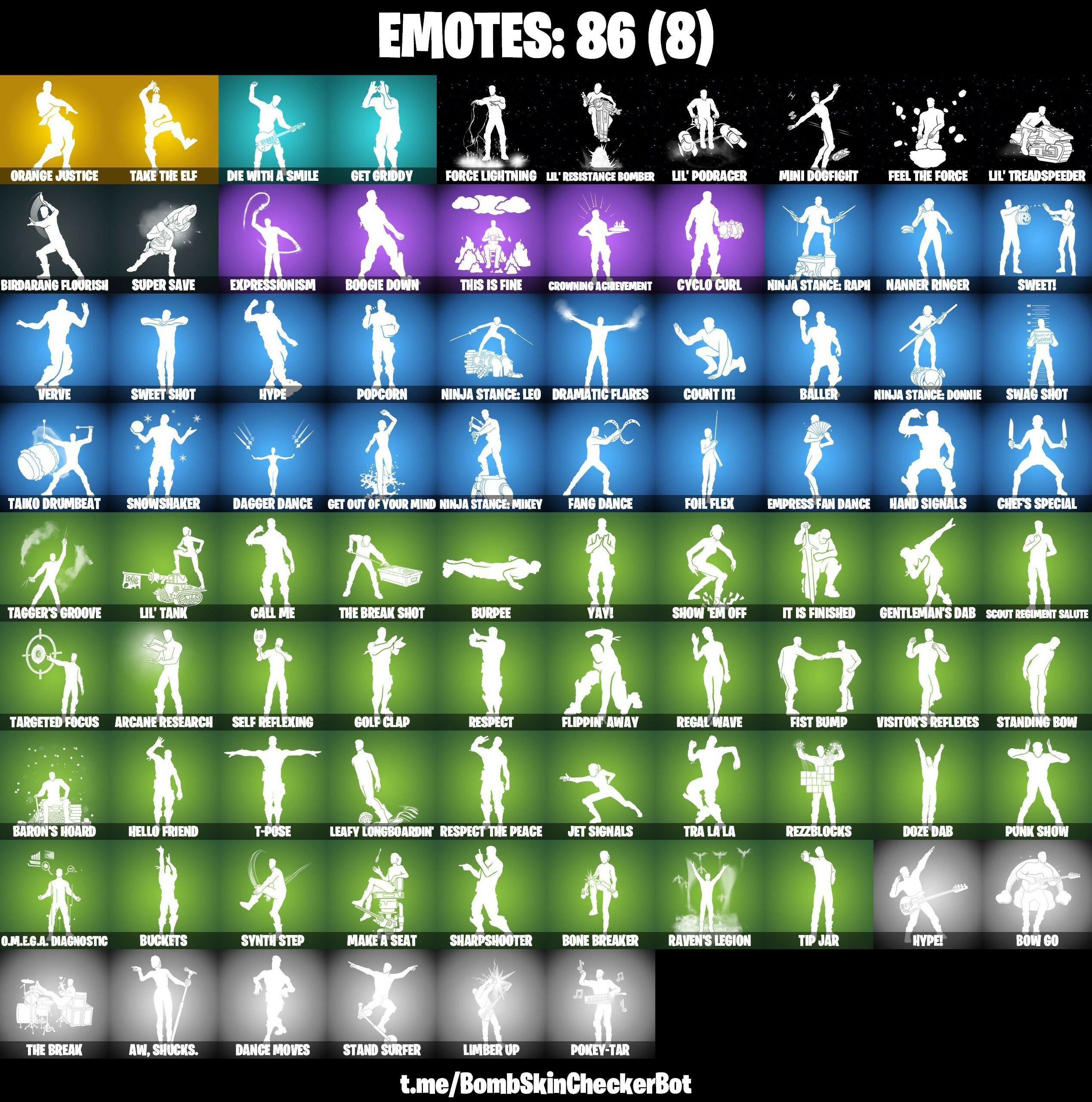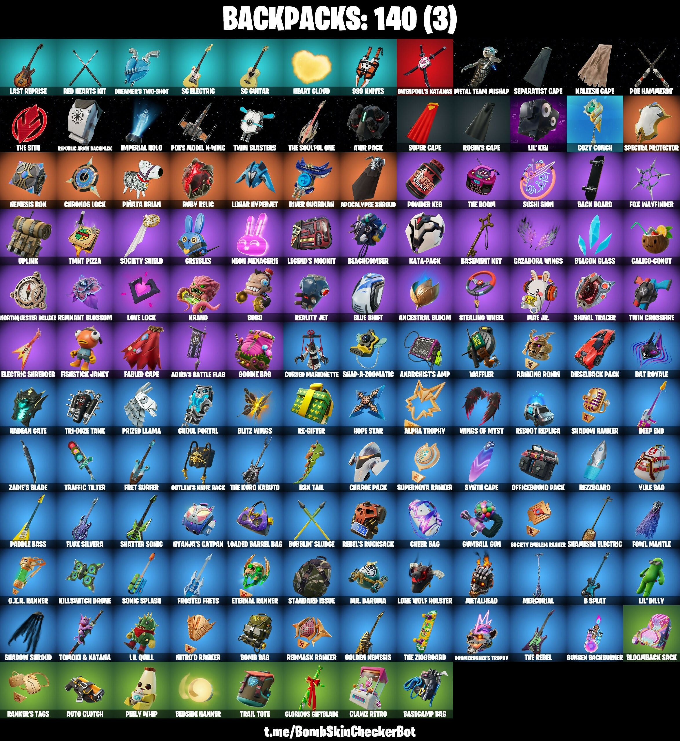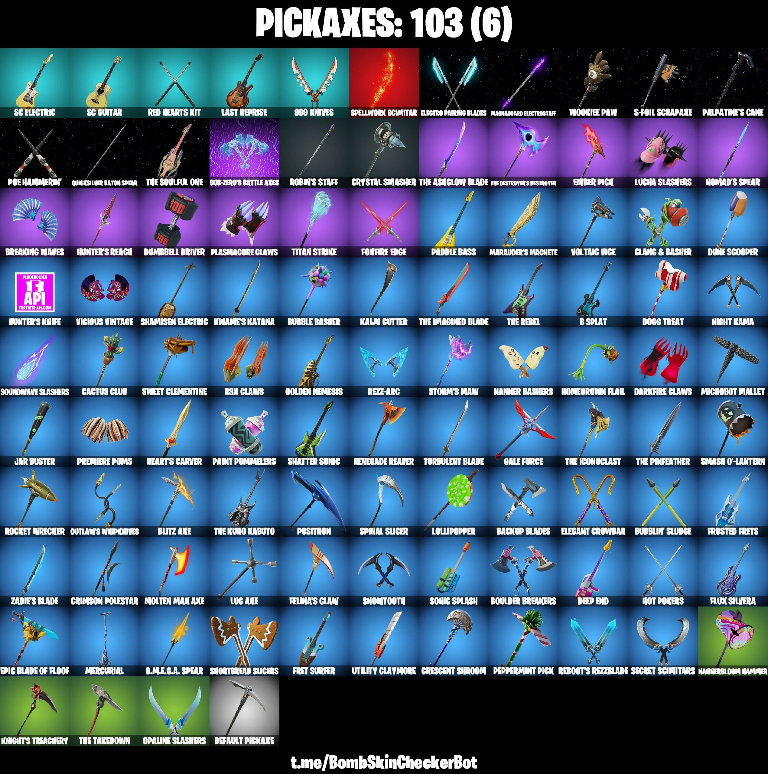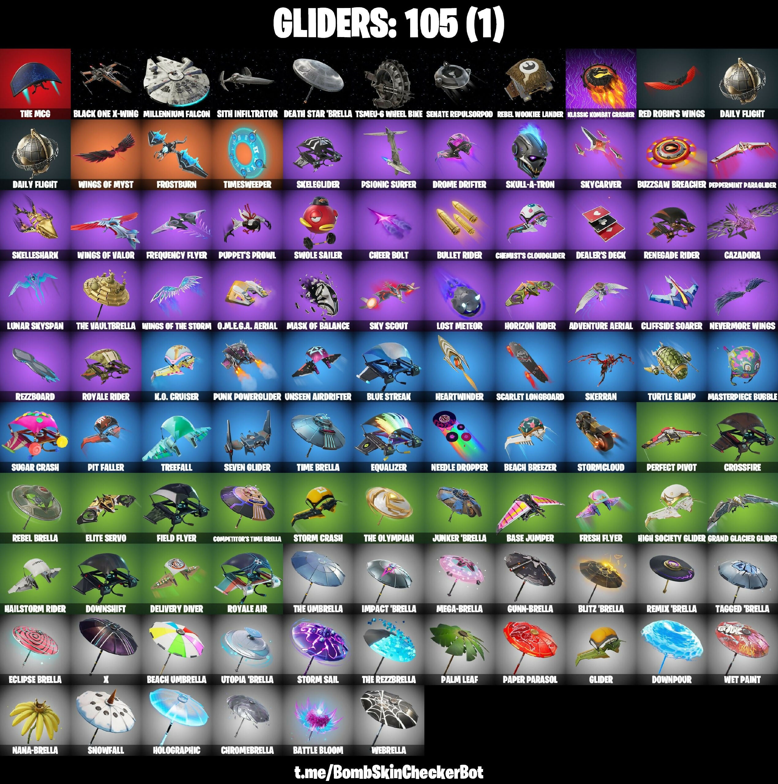 999 Knives, AWR Pack, Adira's Battle Flag, Adventure Aerial, Aerial Assault Bomber, Alpha Trophy, Anarchist's Amp, Ancestral Bloom, Apocalypse Shroud, Apprentice Evie, Arcane Research, Auto Clutch, Aw, Shucks., Ayla Winn, Azuki, B Splat, Back Board, Backup Blades, Baller, Baron's Hoard, Base Jumper, Basecamp Bag, Basement Key, Bat Royale, Battle Bloom, Battlehawk, Beach Breezer, Beach Umbrella, Beachcomber, Beacon Glass, Bedside Nanner, Birdarang Flourish, Black One X-Wing, Blitz 'Brella, Blitz Axe, Blitz Knight, Blitz Wings, Bloomback Sack, Blue Shift, Blue Streak, Blue Striker, Blue Team Leader, Bobo, Bomb Bag, Bone Breaker, Boogie Down, Boulder Breakers, Bow Go, Breaking Waves, Bubble Basher, Bubblin' Sludge, Buckets, Bullet Rider, Bunsen Backburner, Burpee, Buzzsaw Breacher, Cactus Club, Calico-Conut, Call Me, Caperi, Captain Phasma, Carbide, Cazadora, Cazadora Wings, Chalk Outline, Charge Pack, Cheer Bag, Cheer Bolt, Chef's Special, Chemist's Cloudglider, Chromebrella, Chronos Lock, Clang & Basher, Clawz Retro, Cliffside Soarer, Clone Trooper, Competitor's Time Brella, Count It!, Cozy Congi, Crescent Shroom, Crimson Polestar, Crossfire, Crowning Achievement, Crystal Smasher, Cursed Marionette, Cyclo Curl, Dagger Dance, Daily Flight, Dance Moves, Darkfire Claws, Dealer's Deck, Death Star 'Brella, Deep End, Default Pickaxe, Delivery Diver, Die With A Smile, Die With A Smile Bruno, Dieselback Pack, Dogg Treat, Downpour, Downshift, Doze Dab, Dramatic Flares, Dreamer's Two-Shot, Drome Drifter, Dromerunner's Trophy, Dumbbell Driver, Dune Scooper, Eclipse Brella, Electric Shredder, Electro Pairing Blades, Elegant Crowbar, Elite Servo, Ember Pick, Emperor Palpatine, Empress Fan Dance, Epic Blade of Floof, Equalizer, Era, Eren Jaeger, Eternal Ranker, Explorer Emilie, Expressionism, Fabled Cape, Fang Dance, Feel The Force, Felina, Felina's Claw, Field Flyer, Fishtick Janky, Fist Bump, Flightalis, Flippin' Away, Flux Silvera, Foil Flex, Force Lightning, Fowl Mantle, Fox Wayfinder, Foxfire Edge, Frequency Flyer, Fresh Flyer, Fret Surfer, Frostburn, Frosted Frets, Gale Force, General Grievous, Gentleman's Dab, Get Griddy, Get Out Of Your Mind, Gg Smiley, Ghoul Portal, Glider, Glorious Giftblade, Golden Nemesis, Golf Clap, Goodie Bag, Grand Glacier Glider, Greebles, Gumball Gun, Gunn-Brella, Gwenpool's Katanas, Hadean Gate, Hailstorm Rider, Hand Signals, Haylee Skye, Heart Cloud, Hearts Carver, Heartwinder, Hello Friend, High Society Glider, Highwire, Holiday Boxy, Holographic, Homegrown Flail, Hope Star, Horizon Rider, Hot Pokers, Hunter's Knife, Hunter's Reach, Hype, Hype!, Imani, Impact 'Brella, Imperial Holo, It Is Finished, Jackie, Jake The Dog, Jar Buster, Jet Signals, Junker 'Brella, K.O. Cruiser, Kaiju Cutter, Kaleesh Cape, Kata-Pack, Killswitch, Killswitch Drone, Klassic Kombat Crasher, Knight's Treachery, KonaMe, Krang, Kwame's Katana, Last Reprise, Leafy Longboardin', Legend's Modkit, Lightrider, Lil Quill, Lil' Dilly, Lil' Kev, Lil' Podracer, Lil' Resistance Bomber, Lil' Tank, Lil' Treadspeeder, Limber Up, Loaded Barrel Bag, Lollipopper, Lone Wolf Holster, Lorenzo, Lost Meteor, Love Lock, Lt. Evergreen, Lucha Slashers, Lug Axe, Lunar Hyperjet, Lunar Skyspan, Mae Jr., MagnaGuard Electrostaff, Make A Seat, Marauder's Machete, Mariposa, Mask Of Balance, Masterpiece Bubble, Mecha R3n, Mega-Brella, Mercurial, Metal Team Mishap, Metalhead, Microbot Mallet, Midas' Shadow, Millennium Falcon, Mini Dogfight, Molten Max Axe, Morgan Myst, Mr. Dappermint, Mr. Daruma, Mystica, Nana-Brella, Nanner Bashers, Nanner Ringer, Nannerbloom Hammer, Needle Dropper, Nemesis Box, Neon Menagerie, Nevermore Wings, Night Kama, Ninja Stance: Donnie, Ninja Stance: Leo, Ninja Stance: Mikey, Ninja Stance: Raph, Nitro'd Ranker, Nomad's Spear, Northquester Deluxe, Nyanja's Catpak, O.M.E.G.A. Aerial, O.M.E.G.A. Diagnostic, O.M.E.G.A. Spear, O.M.E.G.A. Suit Alpha, O.X.R. Ranker, Officebound Pack, Opaline Slashers, Orange Justice, Outlaw's Knife Rack, Outlaw's Whipknives, Paddle Bass, Paint Pummellers, Palm Leaf, Palpatine's Cane, Paper Parasol, Paradise Meowscles, Peely Whip, Peppermint Paraglider, Peppermint Pick, Perfect Pivot, Pit Faller, Piñata Brian, Plasmacore Claws, Poe Dameron, Poe Hammerin', Poe's Model X-Wing, Pokey-Tar, Popcorn, Positron, Powder Keg, Power Punk, Premiere Poms, Prized Llama, Psionic Surfer, Punk Powerglider, Punk Show, Puppet's Prowl, Quicksilver Baton Spear, R3X Claws, R3X Tail, Ranker's Tags, Ranking Ronin, Raven's Legion, Re-Gifter, Reality Jet, Rebel Brella, Rebel Wookiee Lander, Rebel's Rucksack, Reboot Man, Reboot Replica, Reboot's Rezzblade, Red Hearts Kit, Red Robin's Wings, Redmask Ranker, Regal Wave, Relik, Remix 'Brella, Remnant Blossom, Renegade Reaver, Renegade Rebel, Renegade Rider, Renzo The Destroyer, Republic Army Backpack, Respect, Respect The Peace, Rezz-Arc, Rezzblocks, Rezzboard, Rian, River Guardian, Robin, Robin's Cape, Robin's Staff, Rocket Wrecker, Royale Air, Royale Rider, Ruby Relic, Runway Racer, S-Foil Scrapeaxe, SC Electric, SG Guitar, Sabrina Carpenter, Santa Dogg, Sc Guitar, Scarlet Longboard, Scout Regiment Salute, Secret Scimitars, Self Reflexing, Senate Repulsorpod, Separatist Cape, Seven Glider, Shadow Ranker, Shadow Shroud, Shamisen Electric, Sharpshooter, Shatter Sonic, Shortbread Slicers, Show 'Em Off, Signal Tracer, Sir Raven, Sith Infiltrator, Skeleglider, Skelleshark, Skerran, Skull Commander, Skull-A-Tron, Sky Scout, Skycarver, Slayer Juice Wrld, Smash O'-Lantern, Snap-A-Zoomatic, Snowfall, Snowshaker, Snowtooth, Society Emblem Ranker, Society Shield, Sonia, Sonic Splash, Soundwave Slashers, Spectra Protector, Spellwork Scimitar, Spinal Slicer, Stand Surfer, Standard Issue, Standing Bow, Stealing Wheel, Storm Crash, Storm Sail, Storm's Maw, Stormcloud, Stray, Street Wave Teknique, Sub-Zero's Battle Axes, Sugar Crash, Super Cape, Super Save, Superman, Supernova Ranker, Sushi Sign, Swag Shot, Sweet Clementine, Sweet Shot, Sweet!, Swole Sailer, Synth Cap