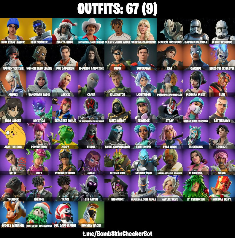 Blue Team Leader, Blue Striker, Santa Dogg, Die With A Smile Bruno, Slayer Juice WRLD, Sabrina Carpenter, General Grievous, Captain Phasma, Clone Trooper, Apprentice Evie, Wookiee Team Leader, Poe Dameron, Emperor Palpatine, Robin, Superman, Era, Carbide, Renzo the Destroyer, Mizuki, Vanguard Zadie, Jackie, Caper, Killswitch, Lightrider, Purradise Meowscles, Morgan Myst, Rian, Eren Jaeger, Mystica, Explorer Emilie, The Visitor (Reality Unknown), Blitz Knight, Teknique, Stray, Street Wave Teknique, Battlehawk, Jake the Dog, Power Punk, Ziggy, Felina, Skull Commander, Synthwave, Ayla Winn, Flightalis, Lorenzo, Relik, Zoey, Renegade Rebel, Imani, Mecha R3X, Reboot Man, Aerial Assault Bomber, Mariposa, Sonia, Thunder, Kwame, Trace, Sir Raven, Highwire, O.M.E.G.A. Suit Alpha, Haylee Skye, Lt. Evergreen, Holiday Boxy, Wooly Warrior, Winterfest Bushranger, Mr. Dappermint, Runway Racer.