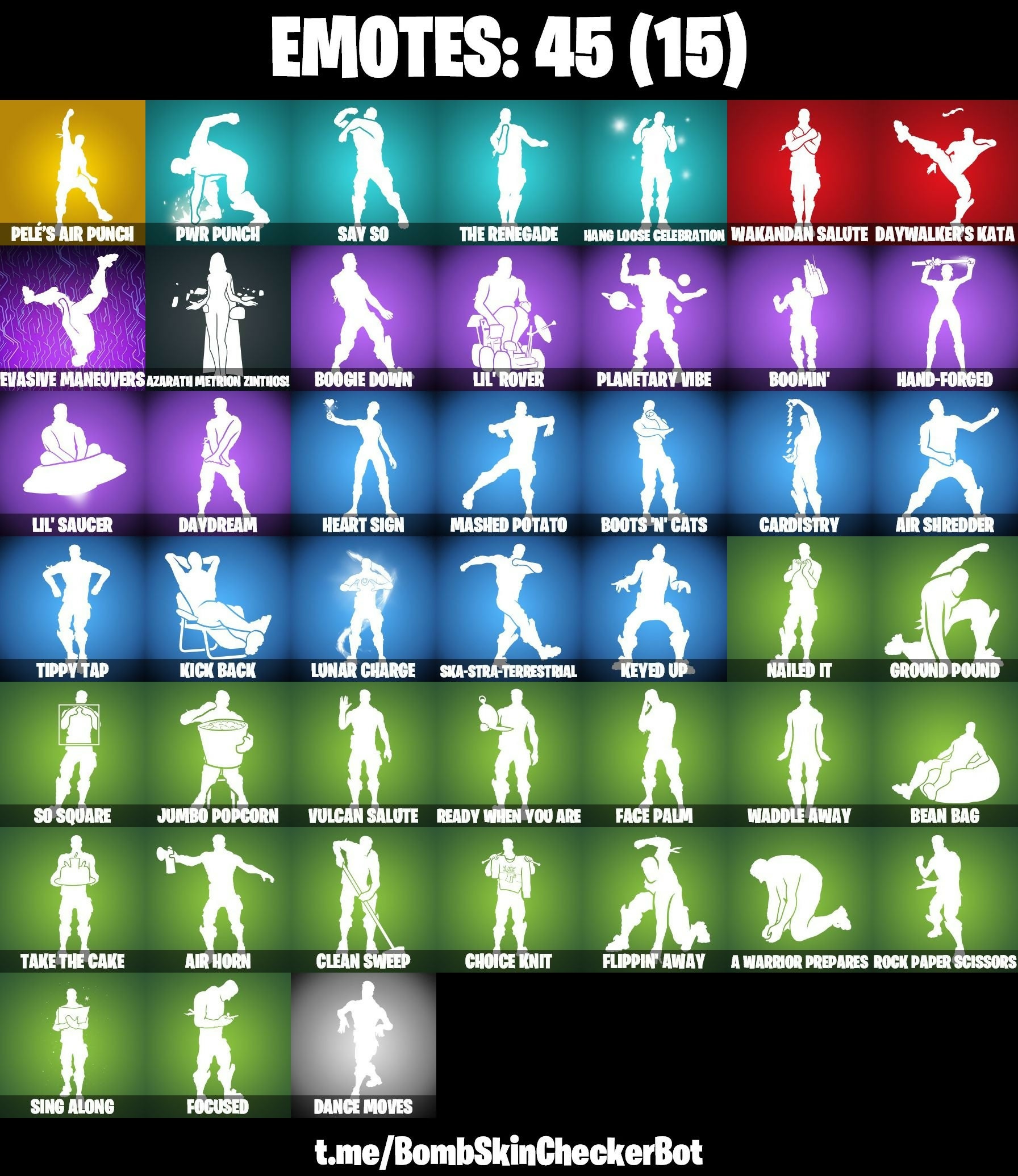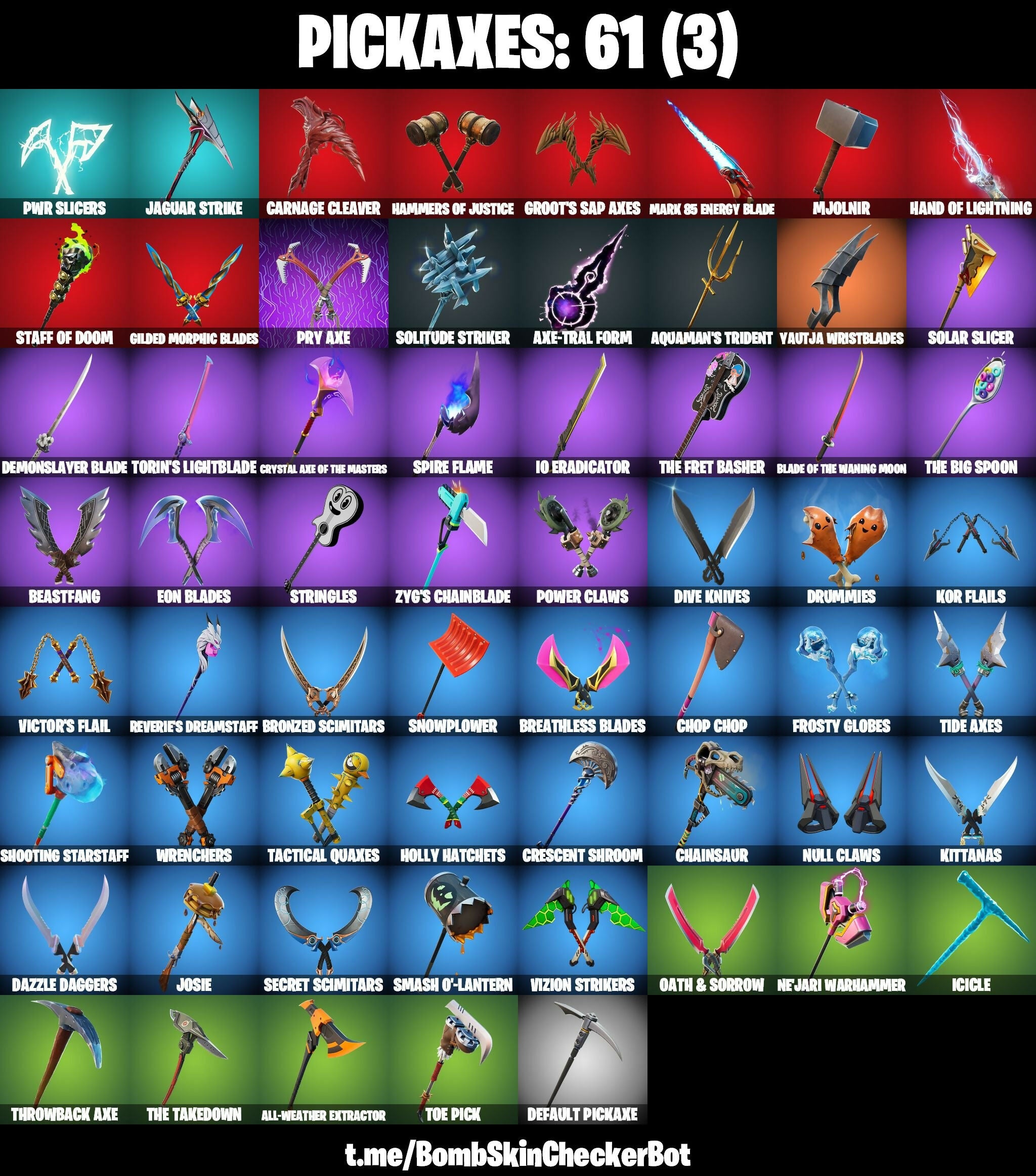 A Warrior Prepares, Agent Jones, Air Horn, Air Shredder, All-Weather Extractor, Aquaman's Trident, Axe-Tral Form, Azarath Metrion Zinthos!, Bean Bag, Beastfang, Blade Of The Waning Moon, Boogie Down, Boomin', Boots 'N' Cats, Breathless Blades, Bronzed Scimitars, Cardistry, Carnage, Carnage Cleaver, Chainsaur, Charlotte, Choice Knit, Chop Chop, Clark Kent, Clean Sweep, Cluck, Crescent Shroom, Crystal Axe Of The Masters, Dance Moves, Daydream, Daywalker's Kata, Dazzle Daggers, Default Pickaxe, Demonslayer Blade, Dive Knives, Doctor Doom, Doctor Slone, Drummies, Eon Blades, Evasive Maneuvers, Fabio Sparklemane, Face Palm, Fade, Flippin' Away, Focused, Frost Squad, Frosty Globes, Gilded Morphic Blades, Groot, Groot's Sap Axes, Ground Pound, Guggimon, Hammers Of Justice, Hand Of Lightning, Hand-Forged, Hang Loose Celebration, Heart Sign, Holly Hatchets, Icicle, Io Eradicator, J.B. Chimpanski, Jaguar Strike, Jennifer Walters, Joey, Josie, Jules, Jumbo Popcorn, Keyed Up, Kick Back, Kit, Kittanas, Kondor, Kor, Kor Flails, Krisabelle, Kymera, Lachlan, Lara Croft, Lexa, Lil' Rover, Lil' Saucer, Lunar Charge, Mancake, Mandalorian, Mark 85 Energy Blade, Mashed Potato, Mave, Menace, Mjolnir, Mystique, Nailed It, Ne'Jari Warhammer, Neymar Jr, Null Claws, Oath & Sorrow, Ocean, Pele's Air Punch, Planetary Vibe, Polar Peely, Power Claws, Predator, Pry Axe, Pwr Punch, Pwr Slicers, Raz, Ready When You Are, Rebirth Raven, Reese, Reverie, Reverie's Dreamstaff, Rock Paper Scissors, Rogue Spider Knight, Ronin, Ruby, Say So, Scuba Jonesy, Secret Scimitars, Shanta, Shooting Starstaff, Sing Along, Siona, Ska-Stra-Terrestrial, Smash O'-Lantern, Snowmando, Snowplower, So Square, Solar Slicer, Solitude Striker, Spire Assassin, Spire Flame, Staff Of Doom, Storm, Stringles, Sunny, Tactical Quaxes, Take The Cake, Tarana, The Big Spoon, The Fret Basher, The Renegade, The Takedown, Thor, Throwback Axe, Tide Axes, Tippy Tap, Toe Pick, Tony Stark, Toona Fish, Torin, Torin's Lightblade, Victor's Flail, Vizion Strikers, Vulcan Salute, Waddle Away, Wakandan Salute, Wolverine, Wrenchers, Yautja Wristblades, Zyg, Zyg's Chainblade