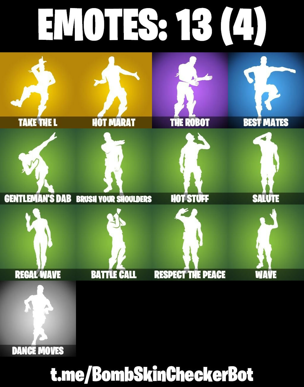 Battle Call, Best Mates, Brush Your Shoulders, Dance Moves, Dark Voyager, Default Pickaxe, Elite Agent, Eva, Gentleman's Dab, Guiding Glow, Hot Marat, Hot Stuff, Lug Axe, Mission Specialist, Moonwalker, Regal Wave, Respect The Peace, Rust Lord, Salute, Sawtooth, Take The L, The Reaper, The Robot, Trusty No. 2, Wave