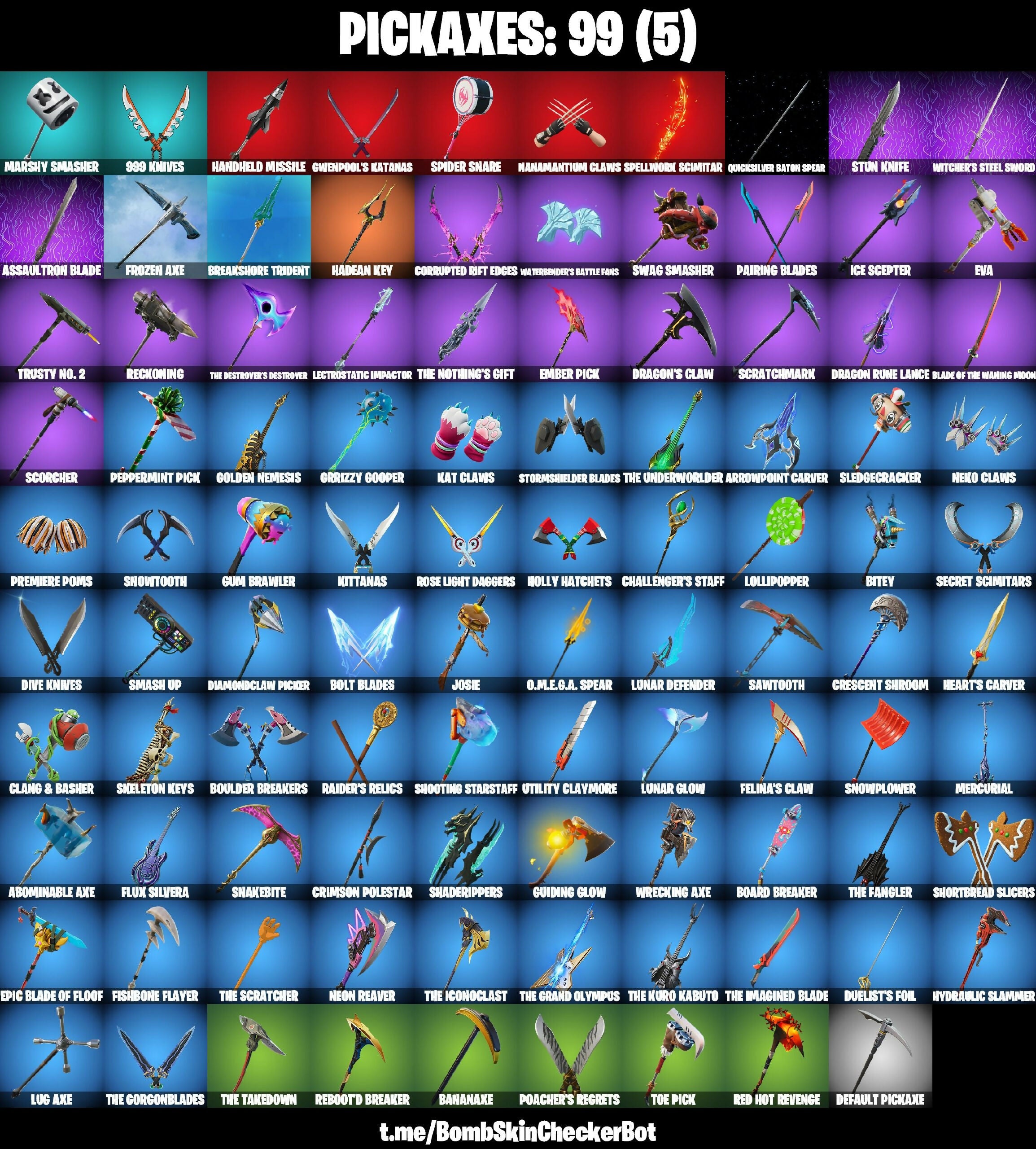 (SNIKT!), 999 Knives, A.I.M., Abominable Axe, Adira, Aphrodite, Arachrobatics, Arctic Adeline, Arrowpoint Carver, Artemis, Assaultron Blade, Avatar's Flourish, Bananaxe, Beep Beep, Best Mates, Bitey, Blackheart, Blade of the Waning Moon, Blizzard Bomber, Blowin' Up, Blue Striker, Blue Team Leader, Board Breaker, Bolt Blades, Boulder Breakers, Breaking Point, Breakshore Trident, Bring It Around, Brite Moves, Brite Raider, Bytes, C'Mere, Calamity, Calculated, Call Me, Card Drop, Cat Flip, Cerberus, Challenger's Staff, Choice Knit, Chrome Punk, Clang & Basher, Clean Sweep, Cloud Striker, Codsworth's Cleanup, Conch Call, Conga, Copines, Corrupted Rift Edges, Crackdown, Crescent Shroom, Crimson Polestar, Crowning Achievement, Curling Iron, Cyclo Curl, DJ Yonder, Dagger Dance, Dance Moves, Dark Voyager, Default Pickaxe, Diamond Throne, Diamondclaw Picker, Dirtbike Challenge, Dive Knives, Dragon Rune Lance, Dragon Stance, Dragon's Claw, Driftwalker, Duelist's Foil, Dusk, Electro Shuffle, Elite Agent, Ember Pick, Epic Blade of Floof, Eva, Evie, Extraterrestrial, Fable, Face Palm, Felina, Felina's Claw, Fire Show, Fishbone Flayer, Flamenco, Flippin' Away, Flux Silvera, Foil Flex, Free Flow, Frozen Axe, Gentleman's Dab, Geralt Of Rivia, Get Funky, Giddy-Up, Glitter, Golden Nemesis, Golf Clap, Grizzly Gooper, Grriz, Guiding Glow, Gum Brawler, Gwen-Step, Gwenpool, Gwenpool's Katanas, Hadean Key, Hades, Handheld Missle, Have A Seat, Heart Sign, Heart's Carver, Hello Friend, Holiday Boxy, Holly Hatchets, Hope, Hot Marat, Hybrid, Hydraulic Slammer, I Declare!, I'm A Mystery, Ice Scepter, Igni Sign, It Is Finished, It's A Vibe, It's Go Time!, It's... You?, Josie, Jubi Slide, Jubilation, Jumbo Popcorn, Katalina, Keep It Mello, Kittanas, Klat Claws, Knife Sharpener, Korra, Krisabelle, Laser Focused, Lectrostatic Impactor, Lennox Rose, Lil' Prancer, Lollipopper, Love It!, Lt. Evergreen, Lug Axe, Lunar Defender, Lunar Glow, Lunar Party, Lynx, Make A Seat, Marshy Smasher, Medusa, Meow Skulls, Mercurial, Mic Drop, Mission Specialist, Montague, Moonlit Mystery, Moonwalker, Nanomantium Claws, Neko Claws, Neon Reaver, Nightshade, Ninja Stance: Donnie, Ninja Stance: Leo, Ninja Stance: Mikey, Ninja Stance: Raph, Ninja Style, Nisha, Nyanja, O.M.E.G.A. Spear, OMG I Love It, Onesie, Orange Justice, Oscar, Pairing Blades, Paradigm (Reality-559), Party Hips, Pea Part Harmony, Peabody, Peace Out, Peel Out, Peelverine, Peely, Peppermint Pick, Peter Griffin, Poacher's Regrets, Point It Out, Polar Peely, Poof, Popular Vibe, Poseidon, Powder, Premiere Poms, Quicksilver Baton Spear, Raider's Relics, Reboot'd Breaker, Reckoning, Red Hot Revenge, Regal Wave, Respect, Respect The Peace, Ringmaster Scarr, Rogue Agent, Rose Light Daggers, Rox, Running Man, Runway Racer, Rust, Rust Lord, Salute, Sawtooth, Scorcher, Scratchmark, Secret Scimitars, Selene, Sentinel, Serpentine Summoning, Sgt. Winter, Shadebox, Shaderippers, Shaolin Sip, Sharpshooter, Shimmer, Shooting Starstaff, Shortbread Slicers, Sidewinder, Sing Along, Skeleton Keys, Slayer Juice Wrld, Sled Ready Guff, Sledgecracker, Slitherin', Smash Up, Snakebite, Snap, Snoozefest, Snowplower, Snowshaker, Snowtooth, So Square, Solid Snake, Spellwork Scimitar, Spider Snare, Spider-Gwen, Stand Surfer, Stormfarer, Stormsheilder Blades, Stun Knife, Surfin' Bird, Swag Smasher, Sweet Swing, T-60 Power Armor, T-Pose, Take A 'Bow, Take The Elf, Take The L, Tempest Flight, The Break Shot, The Destroyer's Destroyer, The Dip, The Fangler, The Gorgonblades, The Grand Olympus, The Ice King, The Iconoclast, The Imagined Blade, The Kuro Kabuto, The Machinist, The Nothing's Gift, The Prisoner, The Reaper, The Robot, The Scratcher, The Takedown, The Underworlder, Toe Pick, Tra La La, Trog, Trusty No. 2, Twyn, Utility Claymore, Valeria, Vengeance Jones, Verve, Wakandan Salute, War Machine, Wasteland Rock, Waterbender's Battle Fans, Wave, Winterfest Bushranger, Witcher's Steel Sword, Wooly Warrior, Wrecking Axe, Yarn Ball, Zenith, Zeus