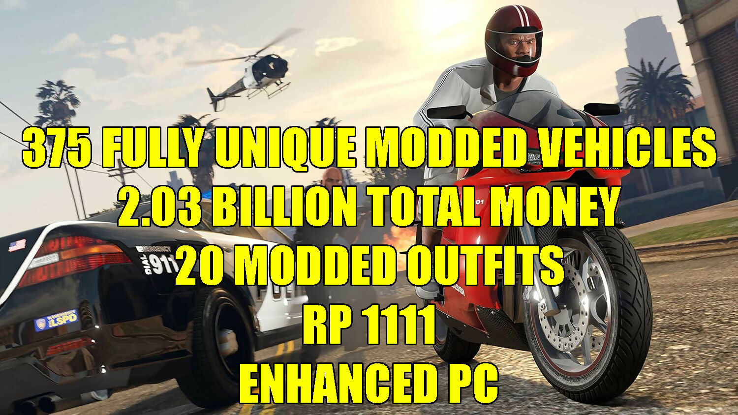 ๐ฎ ENHANCED | PC | ๐ฐ 2.03B TOTAL MONEY + ๐ 375 MODDED VEHICLES + ๐ 20 MODDED OUTFITS + ๐ DUNCE CAP + โก FAST RUN + ๐ ALL UNLOCKS | ๐ GAME PURCHASED | ๐ RP 1111 | โ๏ธ 2B FROZEN KD